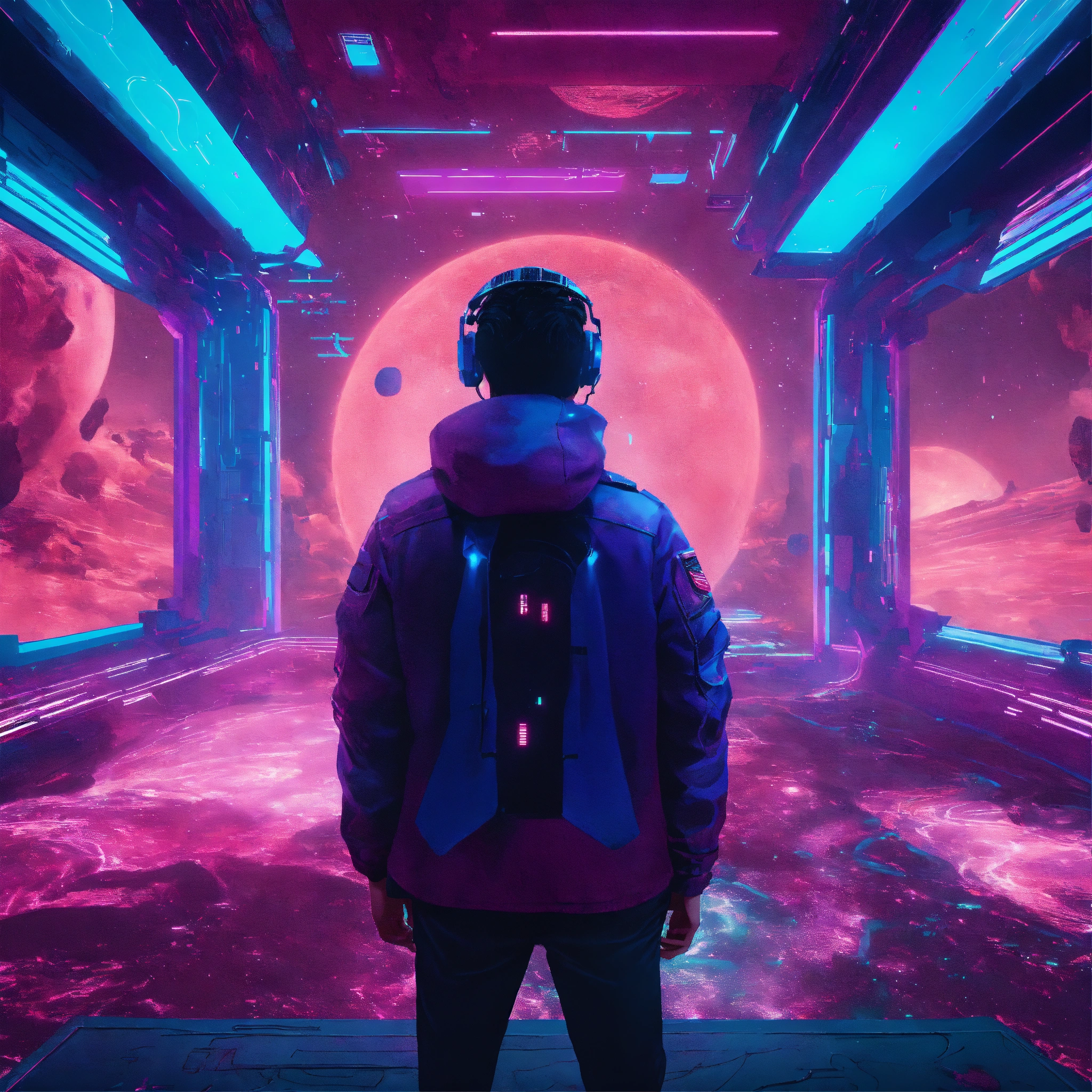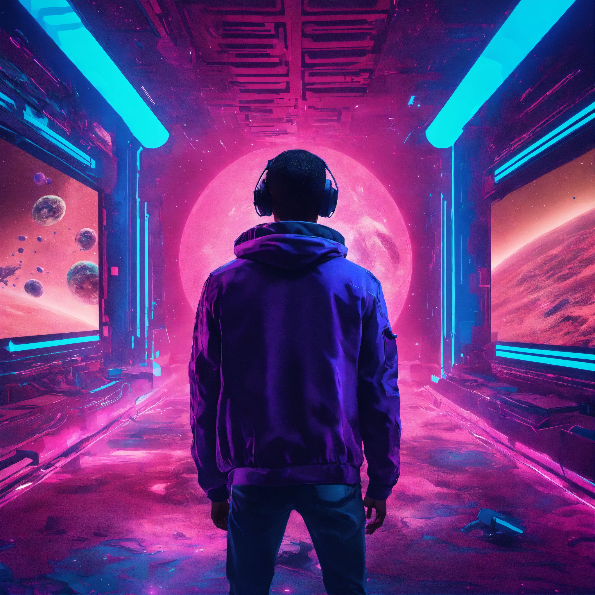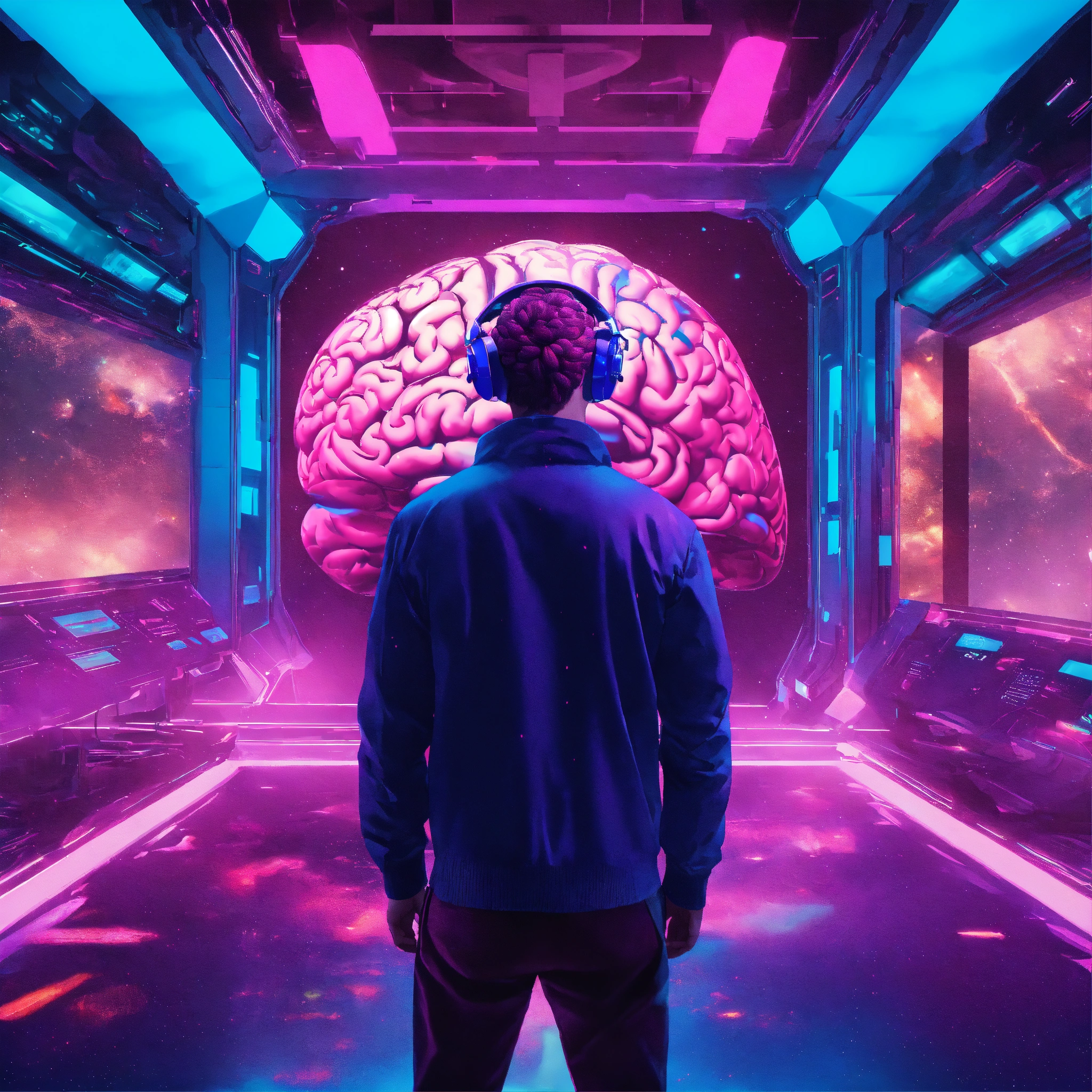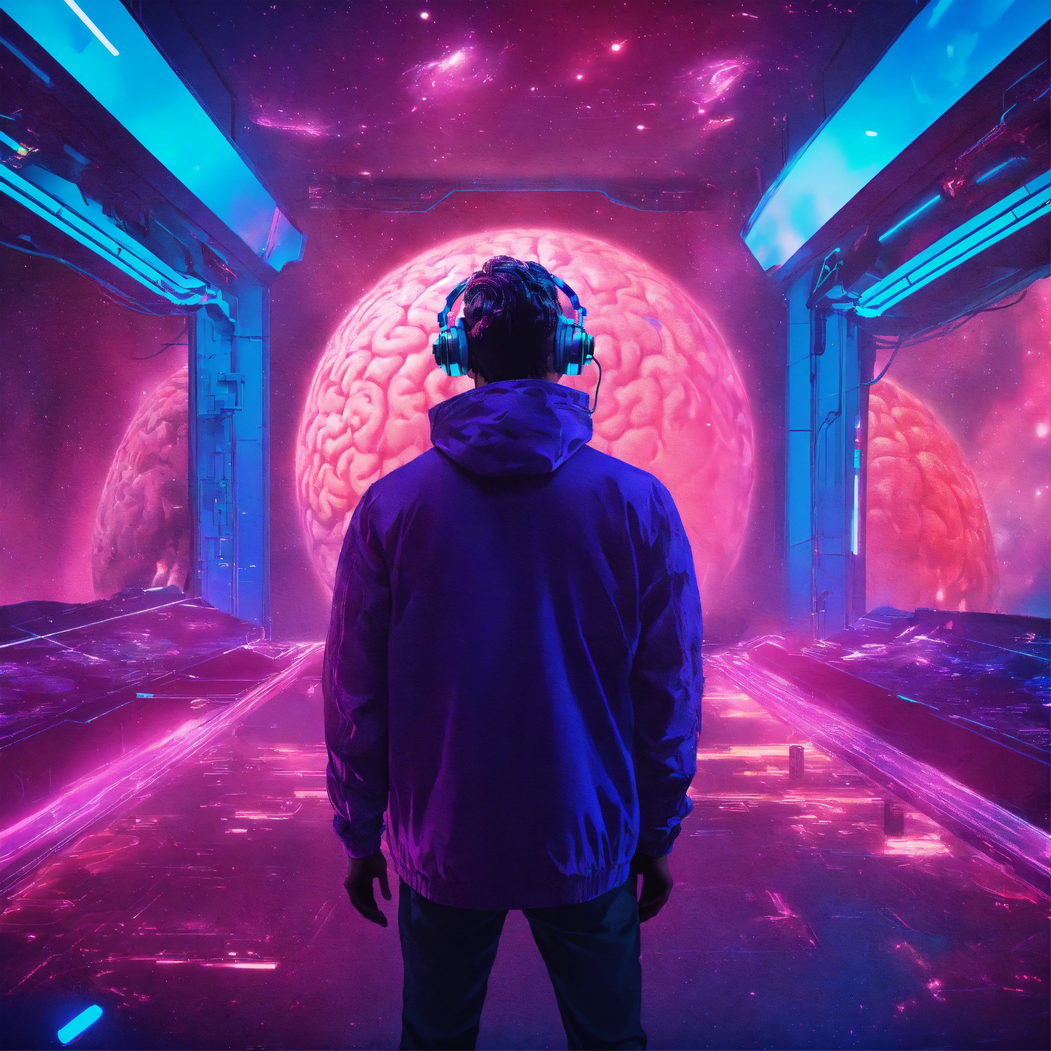 A man from behind with his brain messing around. a futuristic image that looks like a video game but is very realistic. purple, blue and pink colors. a glitch effect, like saturation above his brain. a fairly galactic universe.