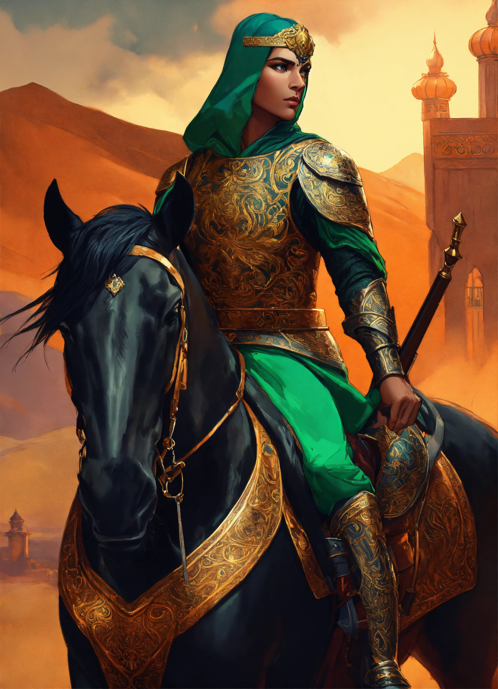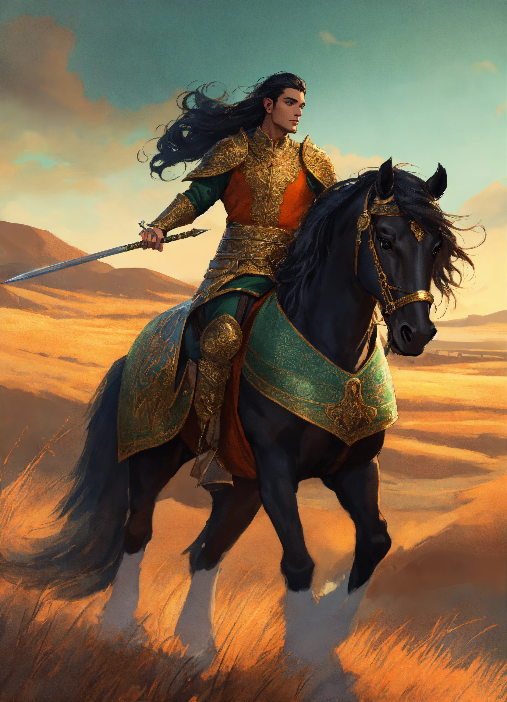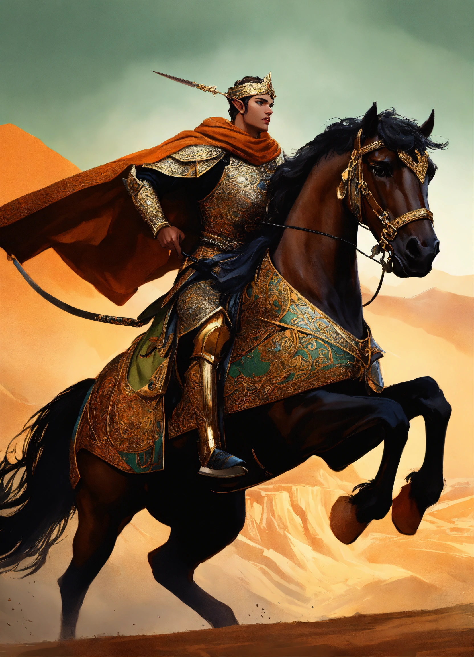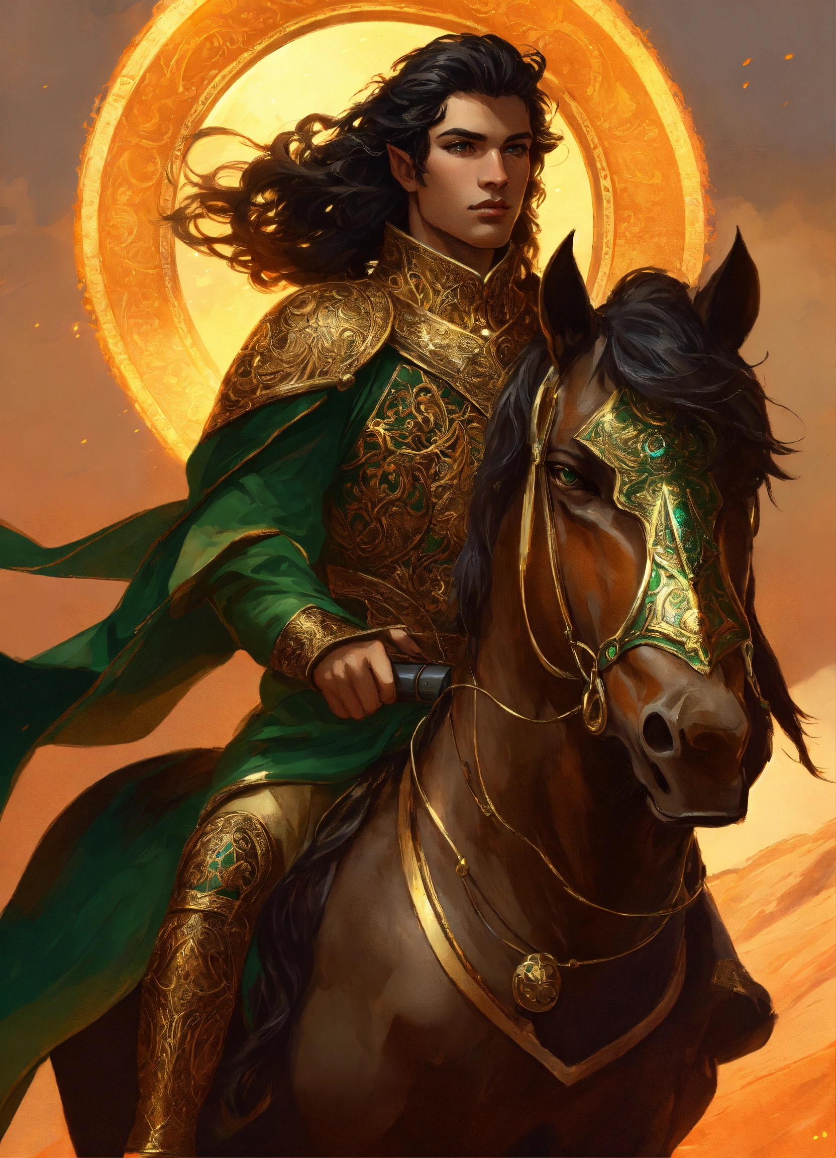 A persian elf male cataphract riding large heavily armored black horse, high cheekbones, glowing dark tan skin, intricate emerald and gold jewelry, persian heavy cataphract armor, long highlighted dark brown hair, hazel green eyes, background mongolian plains, exotic, pretty face, intricate, elegant, highly detailed, digital painting, artstation, concept art, smooth, sharp focus, illustration, art by artgerm and greg rutkowski and alphonse mucha, erte, art deco, filigree and scroll, 8 k, orange clothes