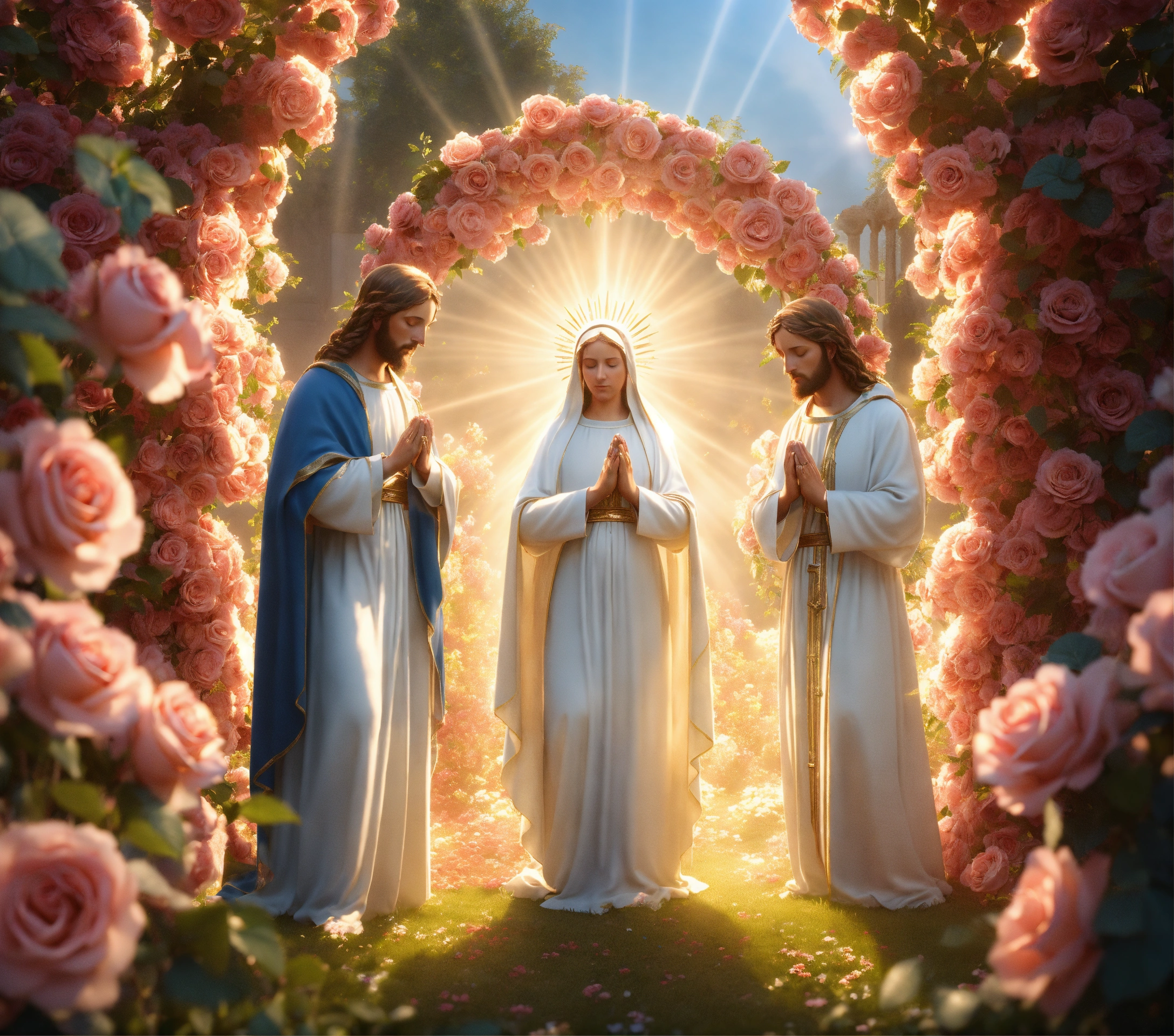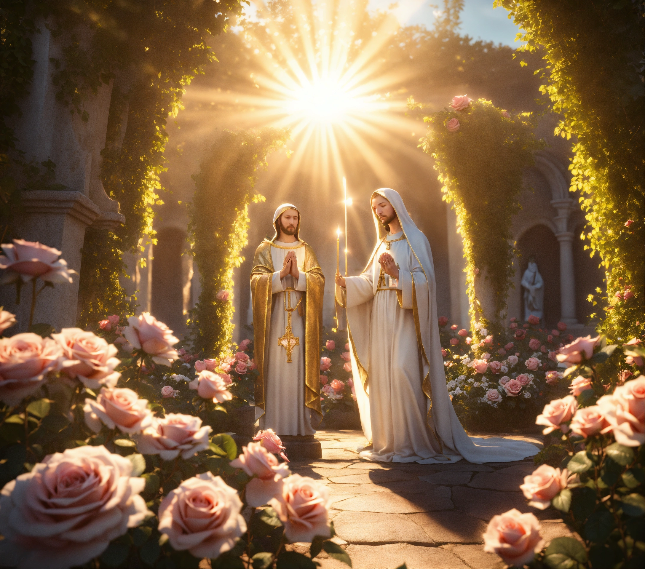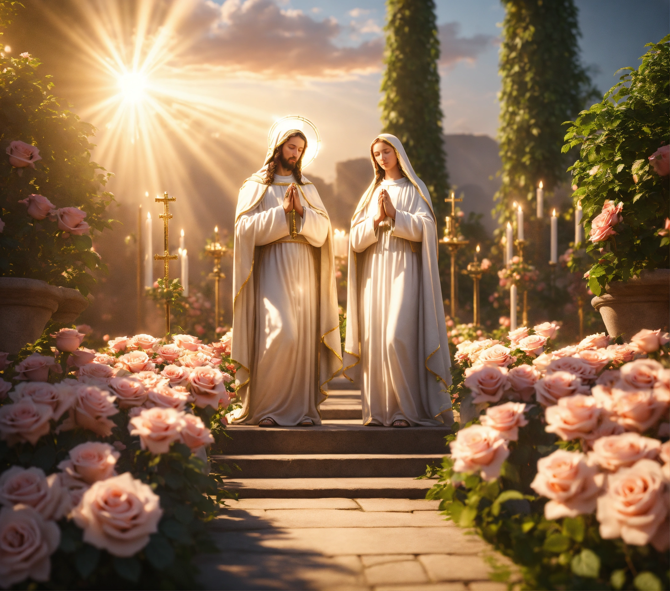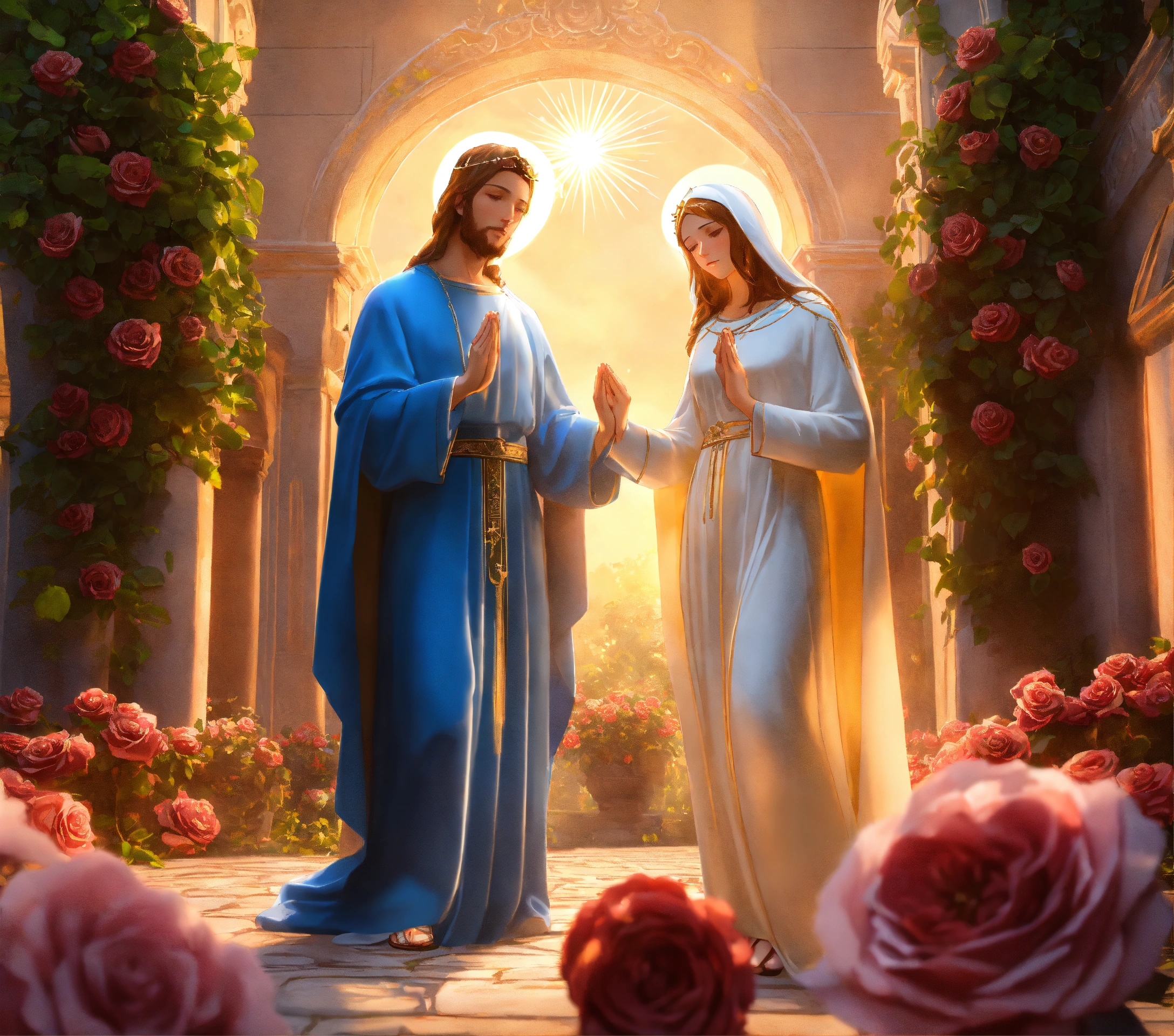 Unreal engine 8k catholic portrait of the virgin mary and jesus christ beside each other in a heavenly rose garden and eminent rays shining through them and halo behind their heads with perfect hands praying