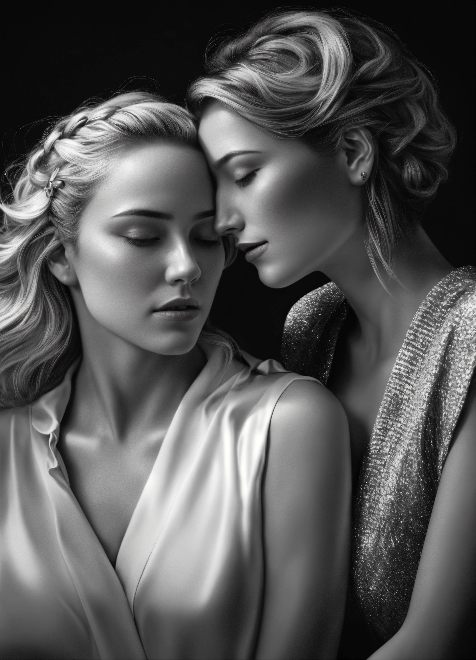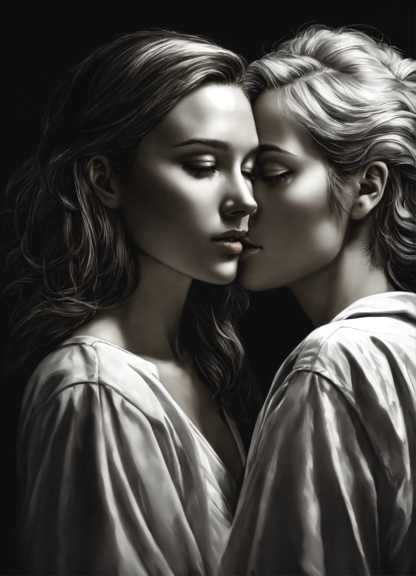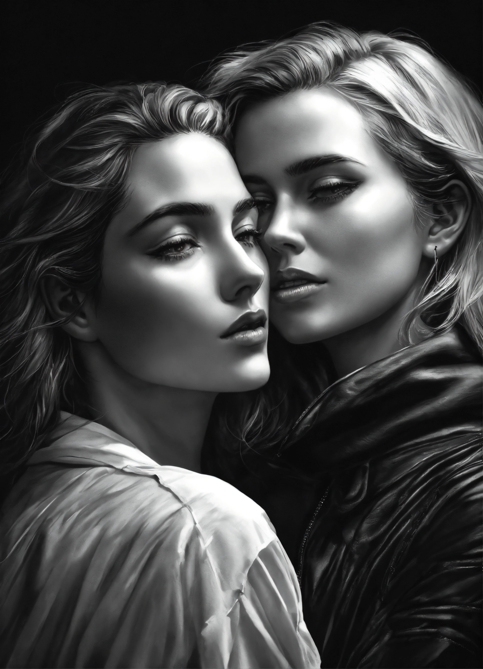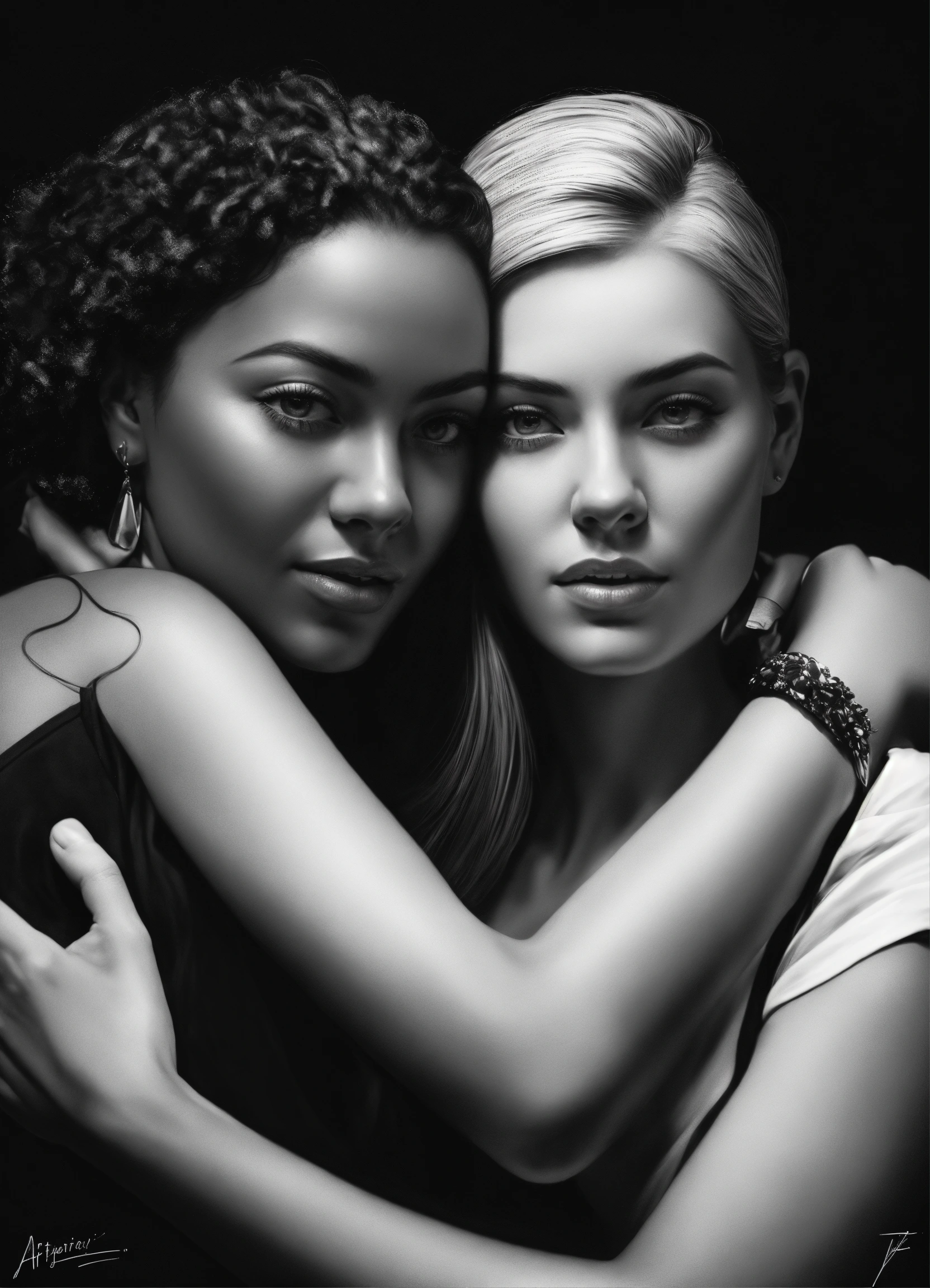 Pop art, hyperrealist portrait of white woman and woman embracing, black and white painting, fantasy art, photo realistic, dynamic lighting, artstation, poster, volumetric lighting, very detailed faces, 4 k, award winning