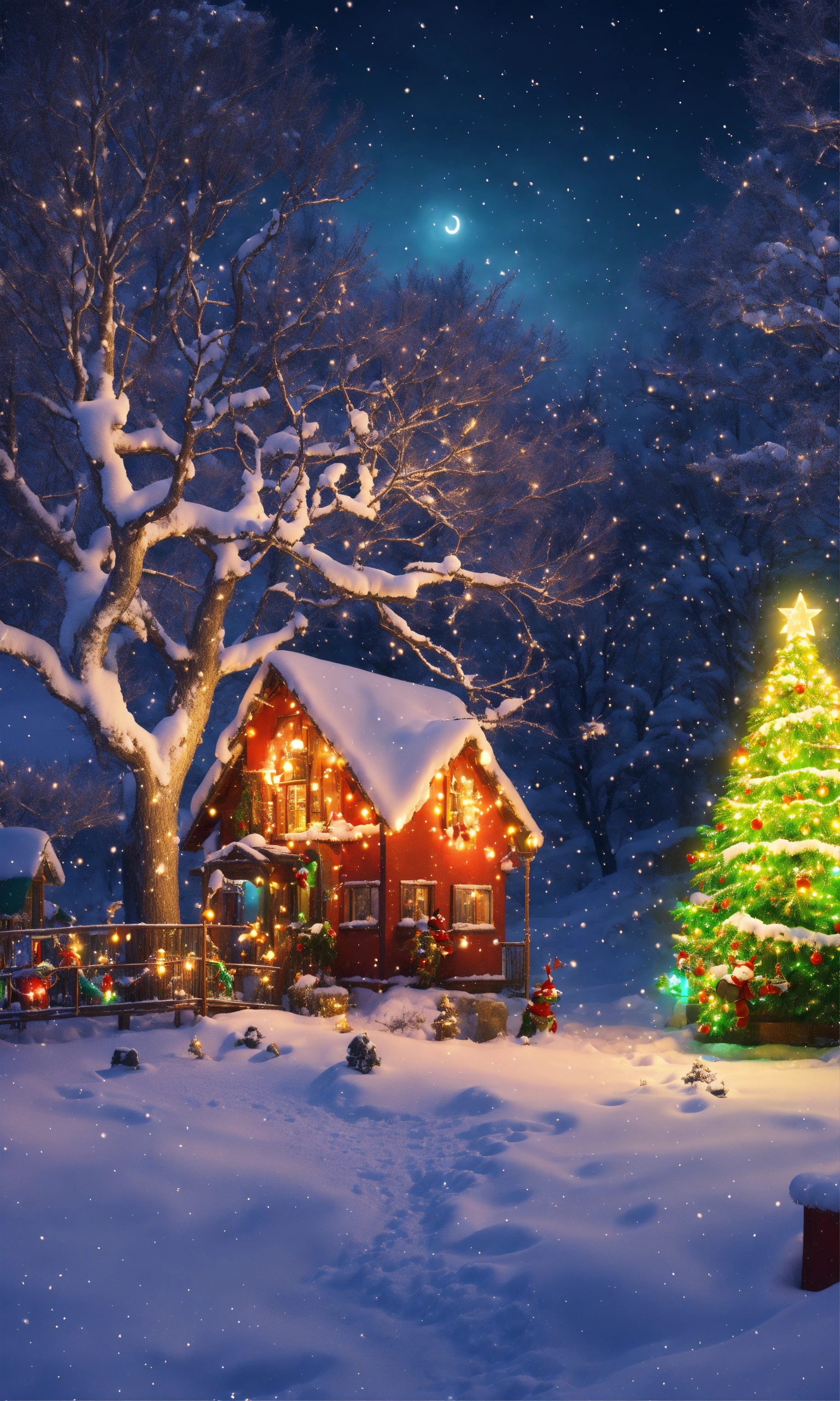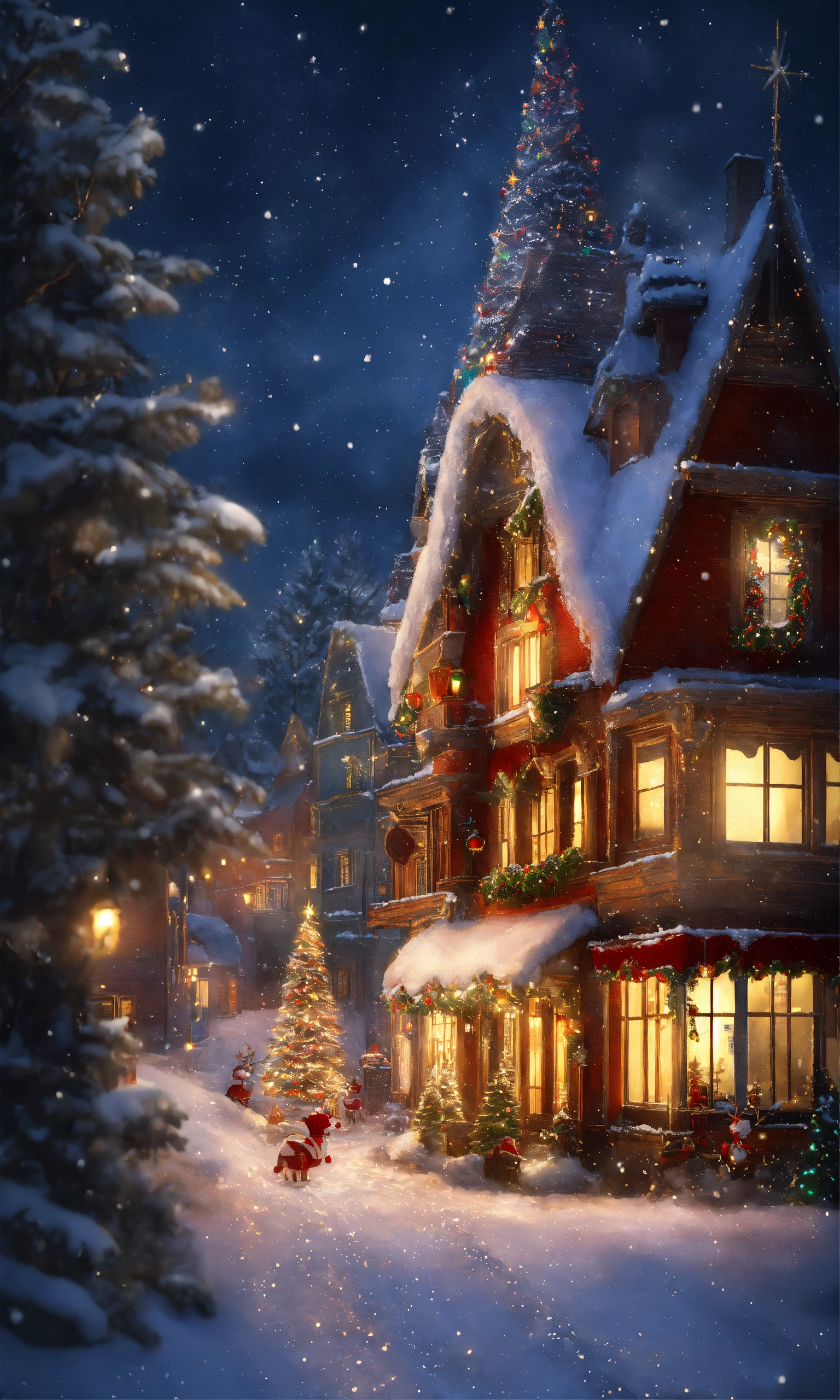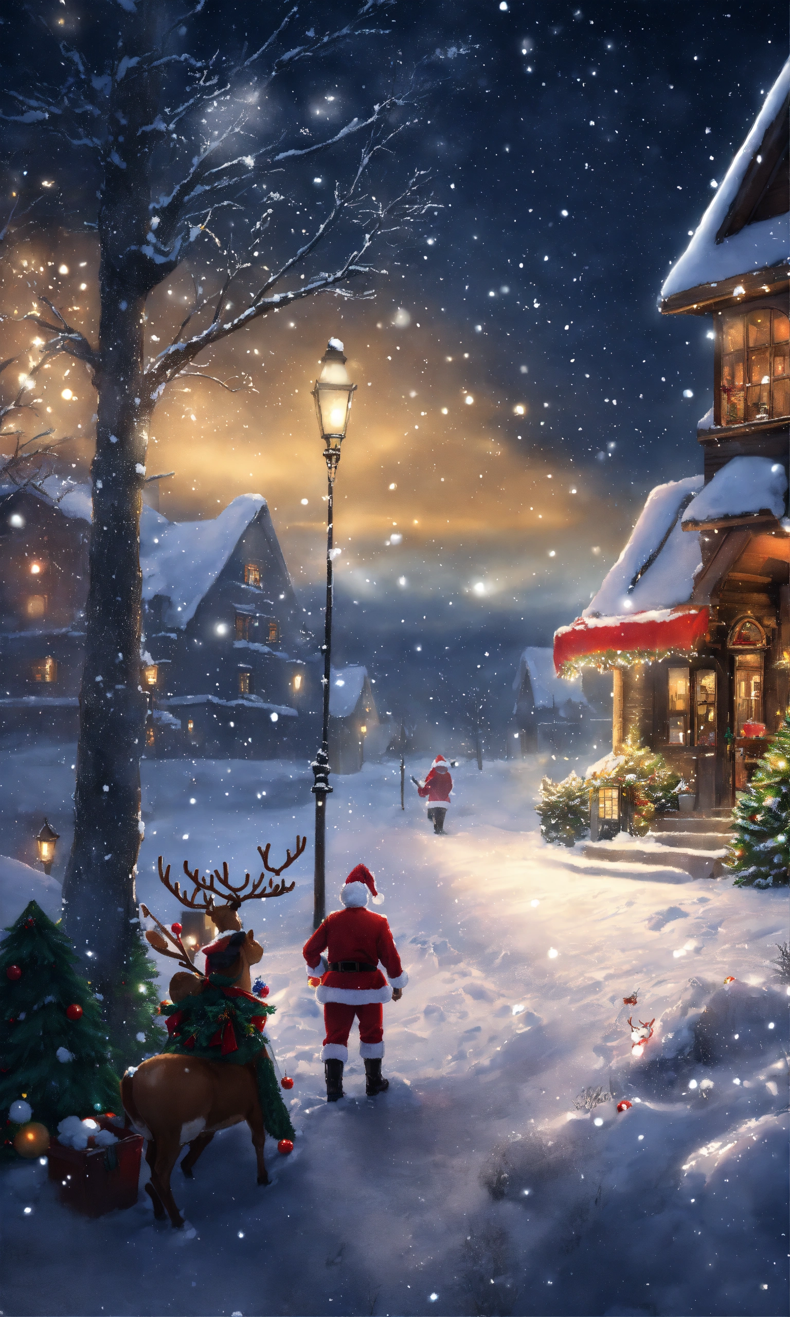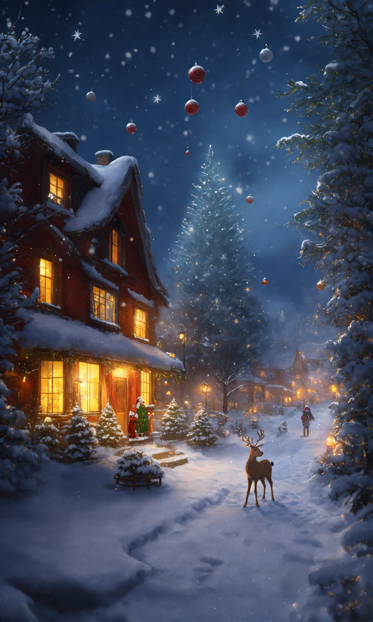 Christmass time, snowy day, highly detailed, ultra trealestic, night time stars, santaclouse raindeer, --chaos 60