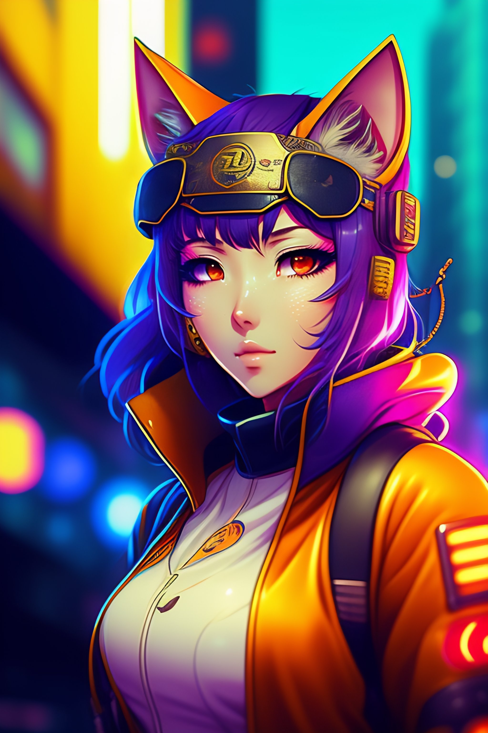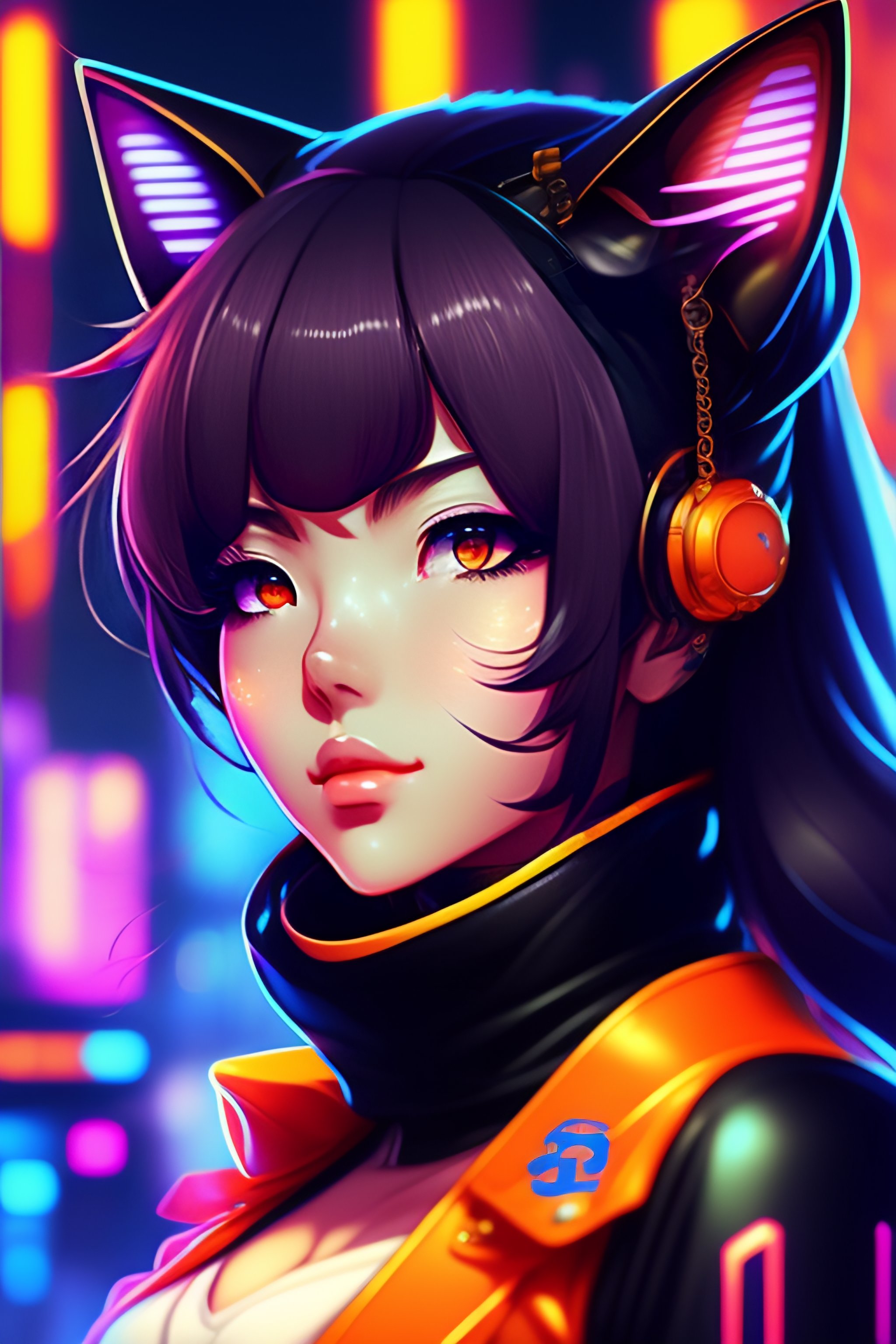 Portrait of a cute anime cyber ninja cat girl in a retro future cyberpunk city at night, rui araizumi, vintage 80's anime style, chibi, digital illustration, cinematic lighting, artstation trending