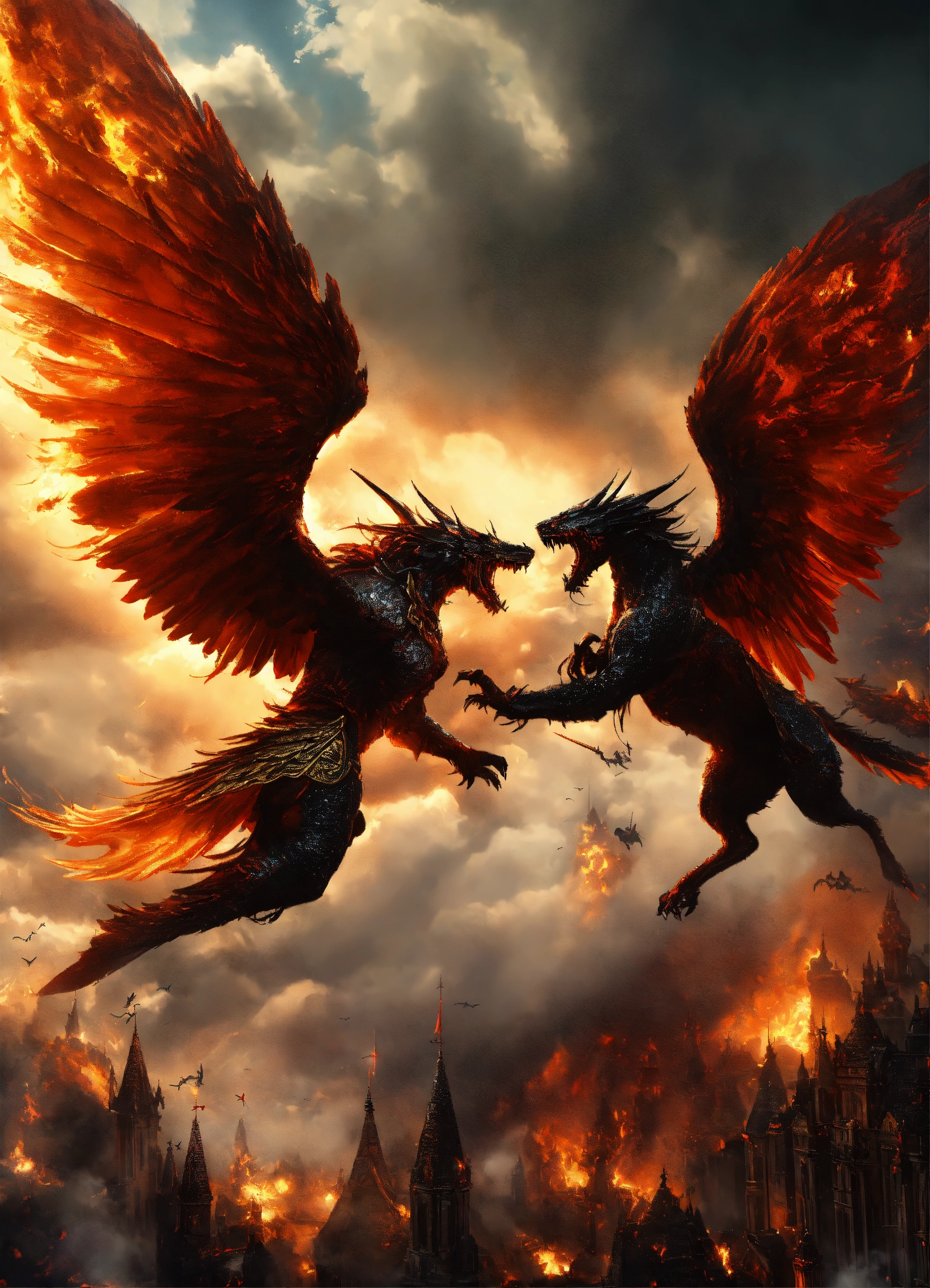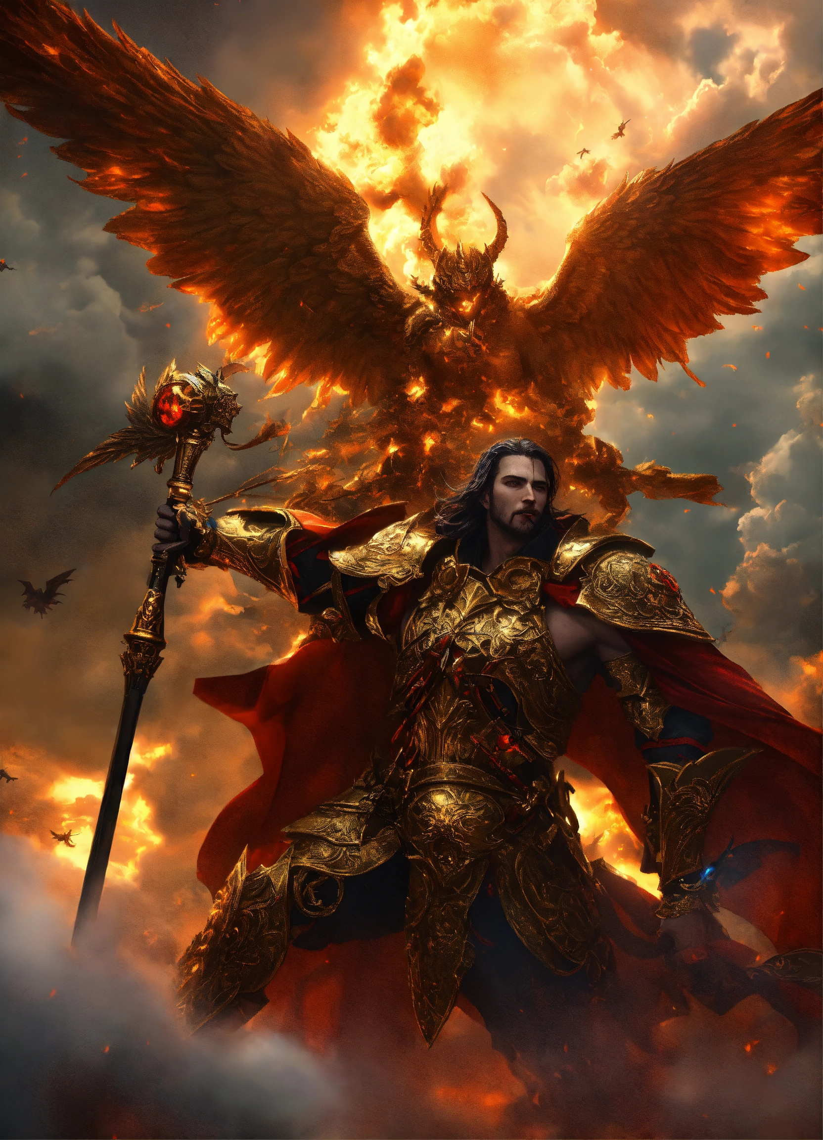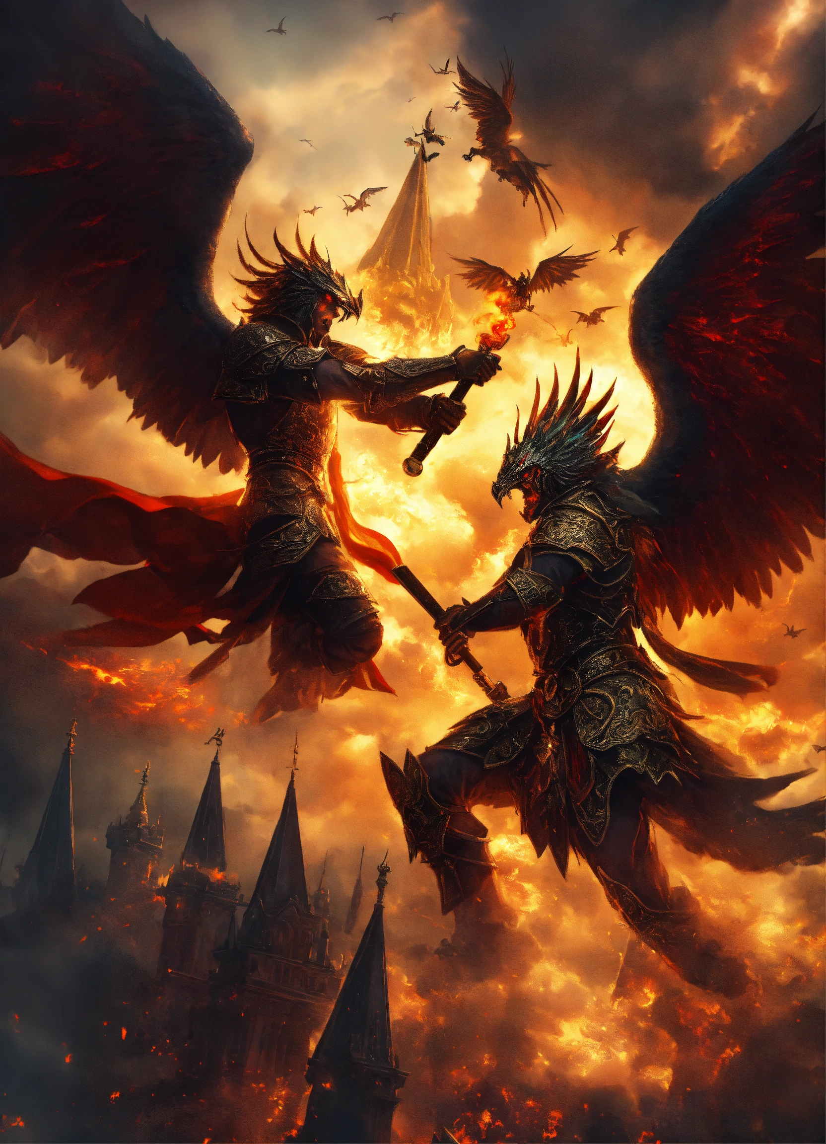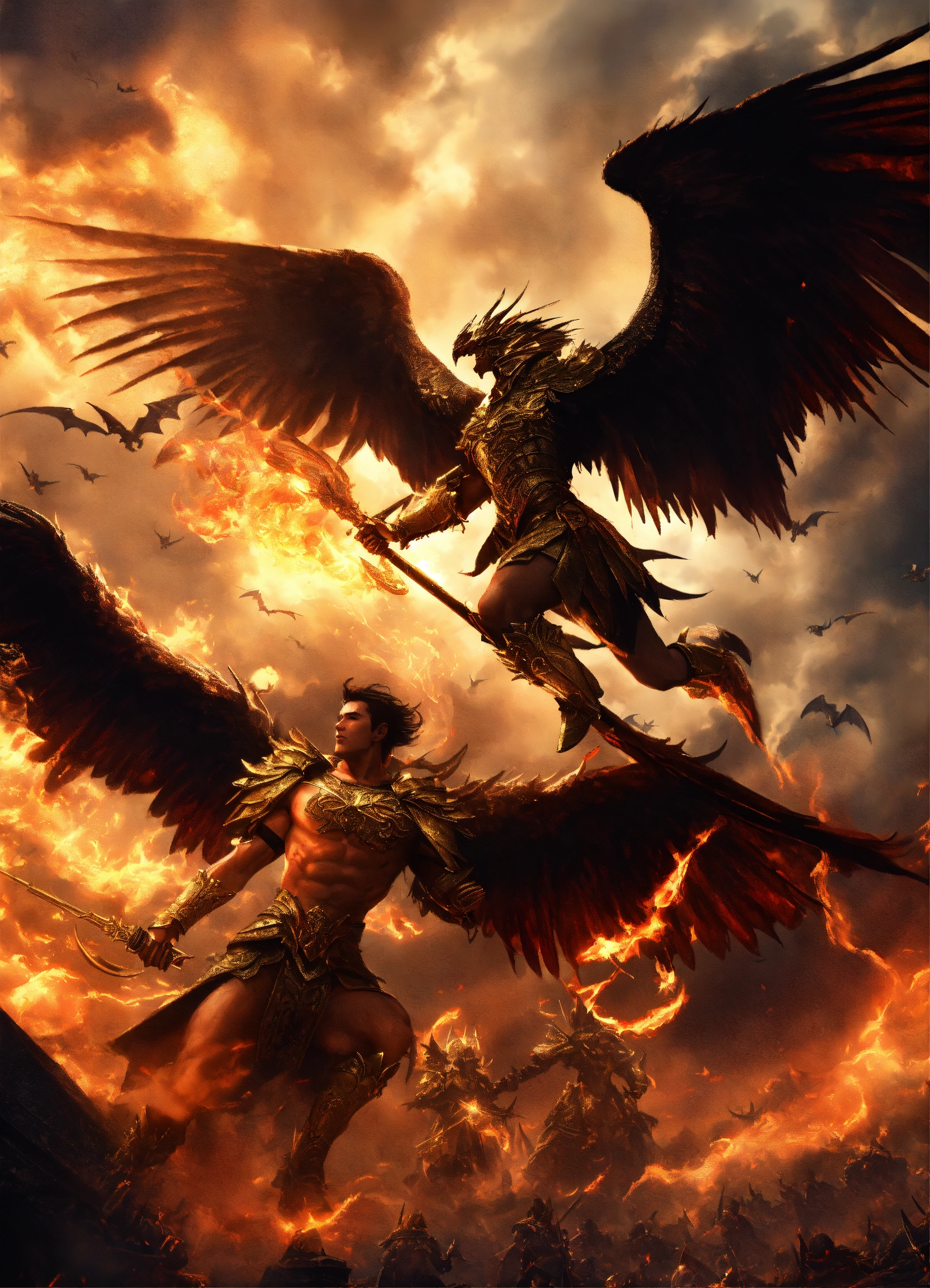Armies of angels and vampires fighting in the skytwo smoke monsters, armies of winged vampires fighting armies of golden flaming angels, embodiment of darkness and light battle in a cloudy sky, beautiful clouds behind them, fantasy, high detail, realistic photo, high detail, digital painting, cinematic, stunning, hyper-realistic, sharp focus, high resolution 8k, insanely detailed