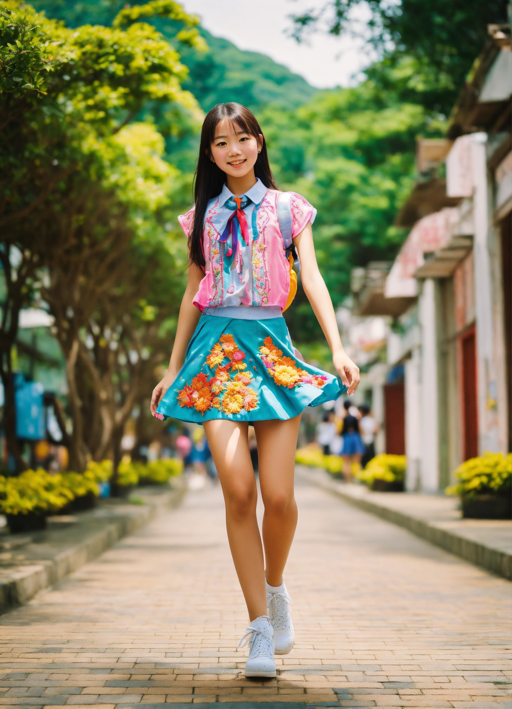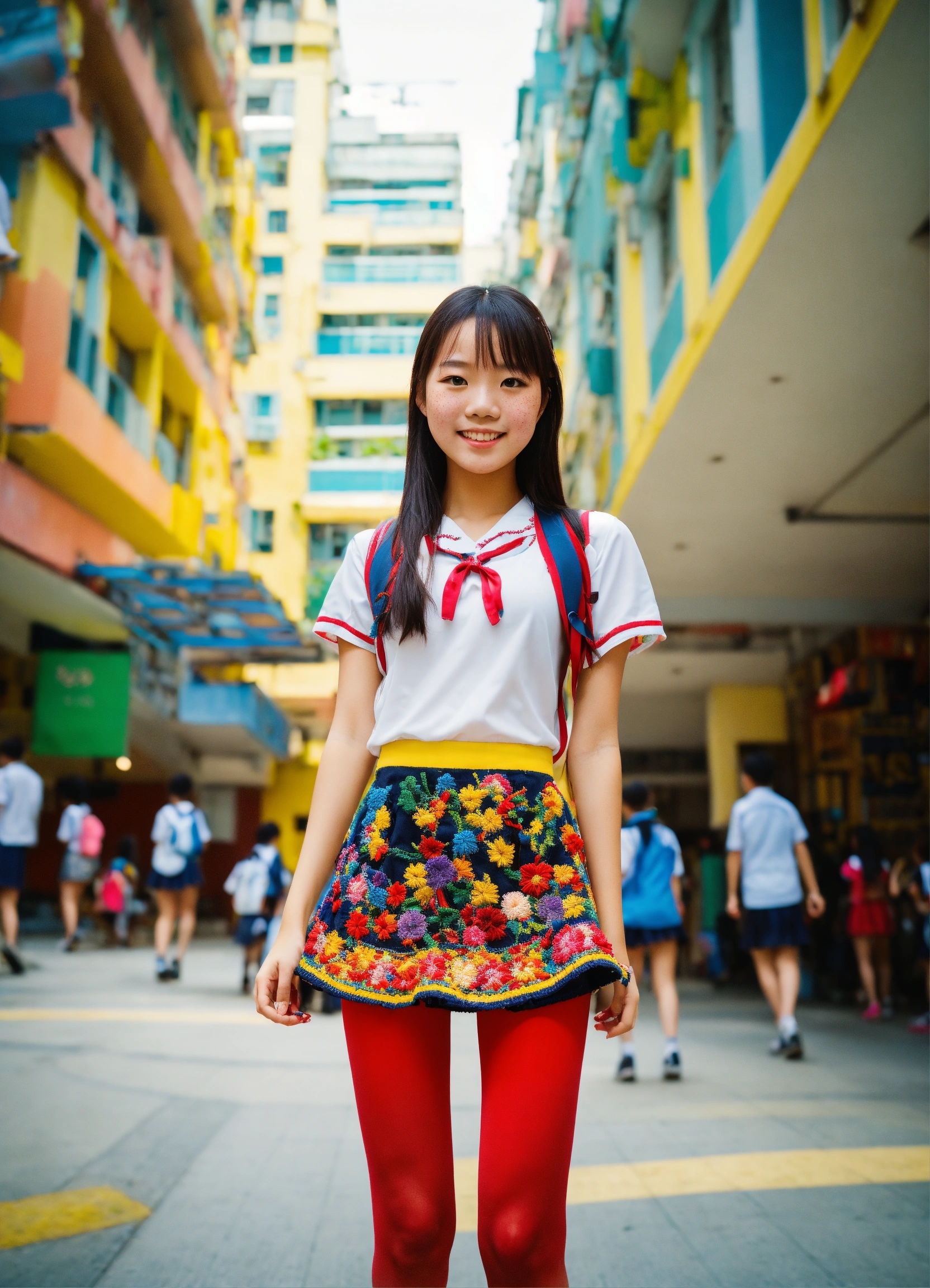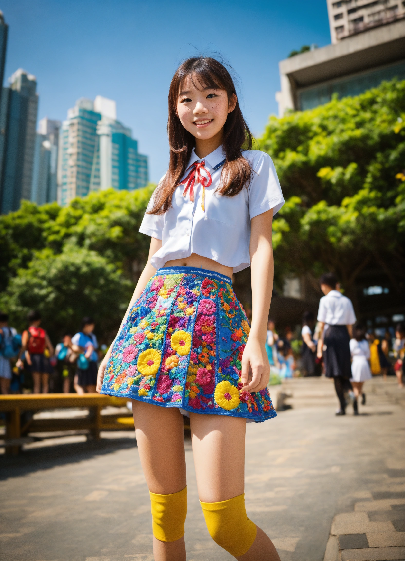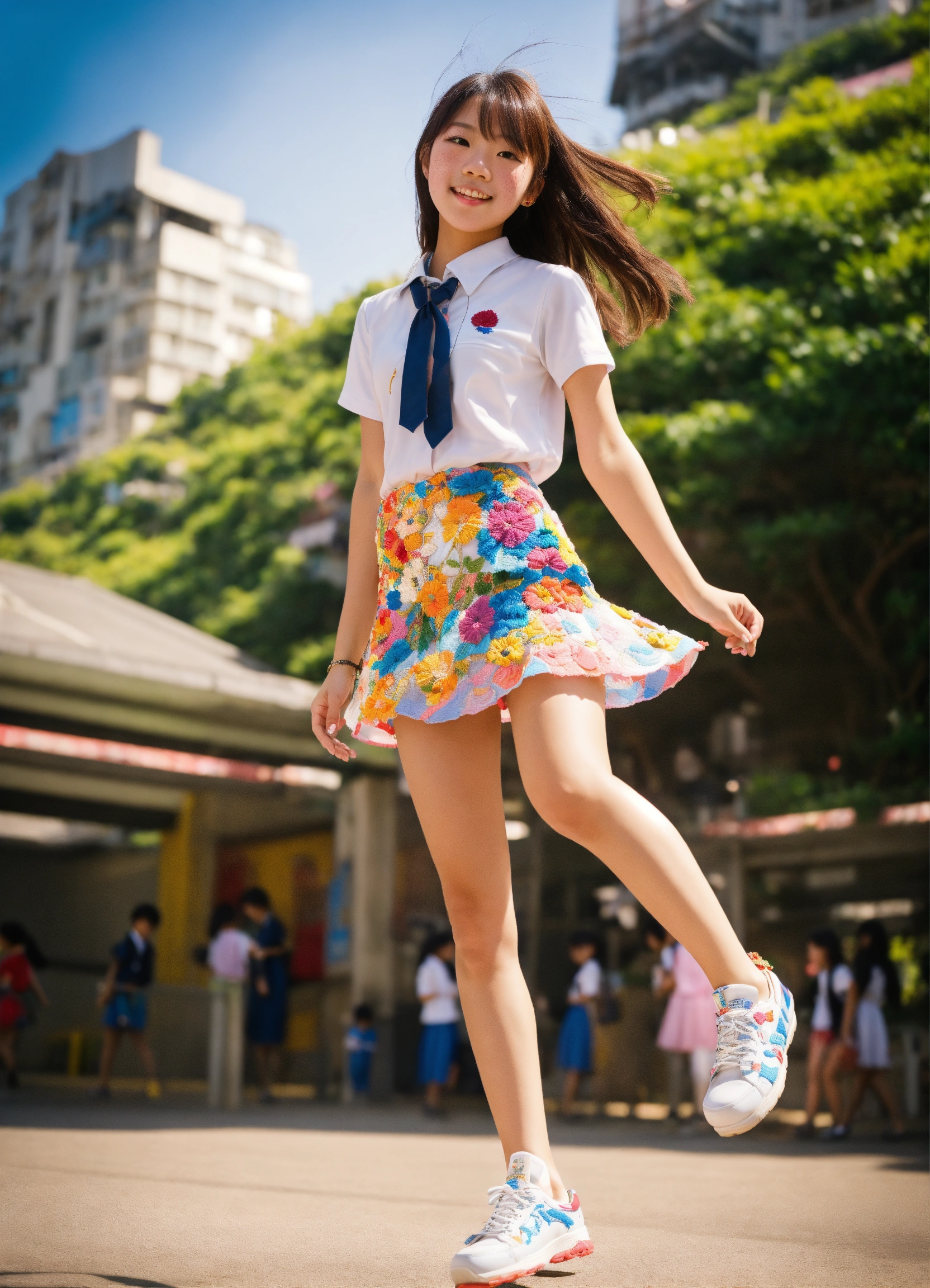 Front view, beautiful hong kong schoolgirl with freckles, pretty outlook, cutie face, shiny eyes, wearing a colorful, vibrant, detailed embroidered one piece mini skirt, jumping off the ground, wide shot, low angle, sunny day, school background