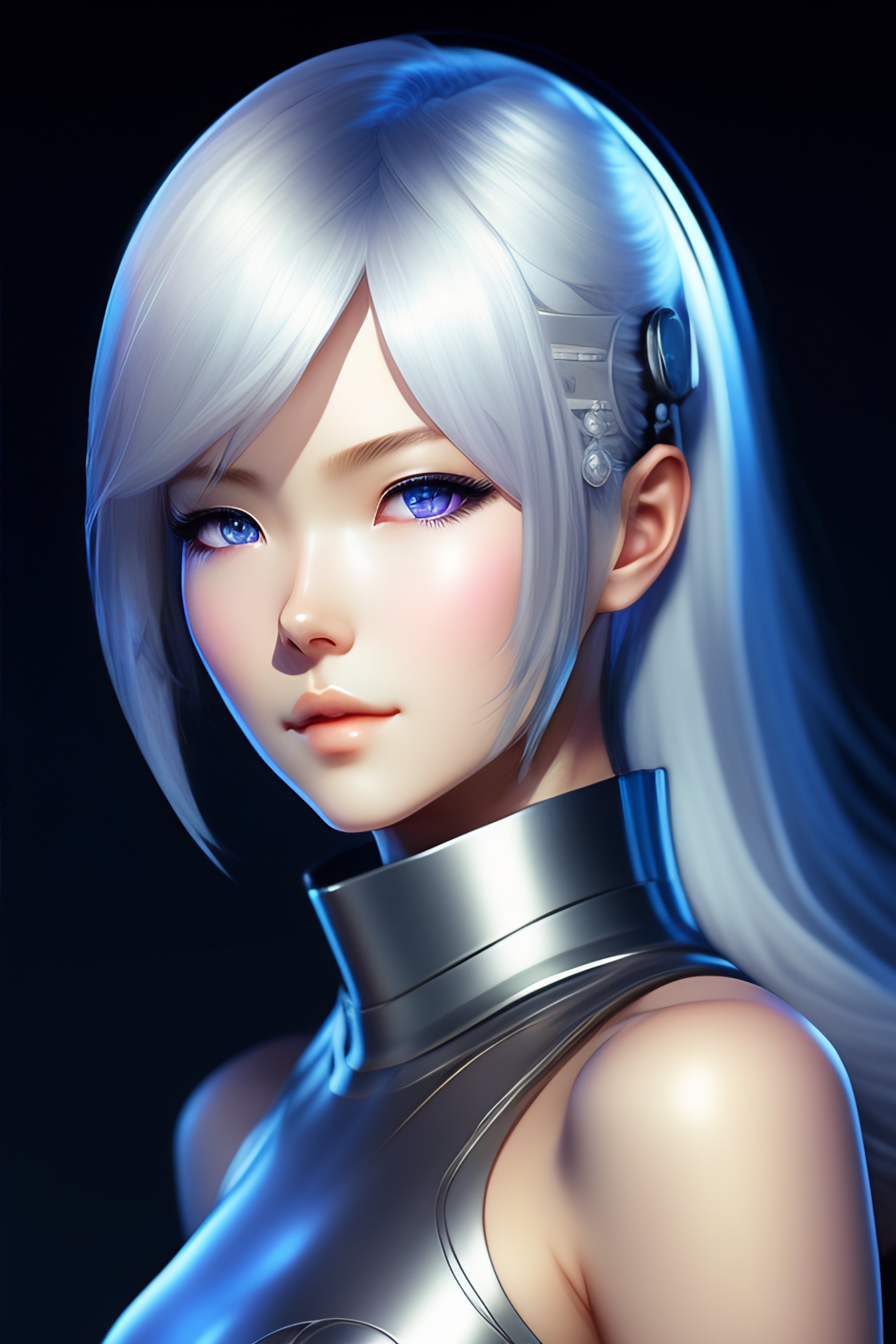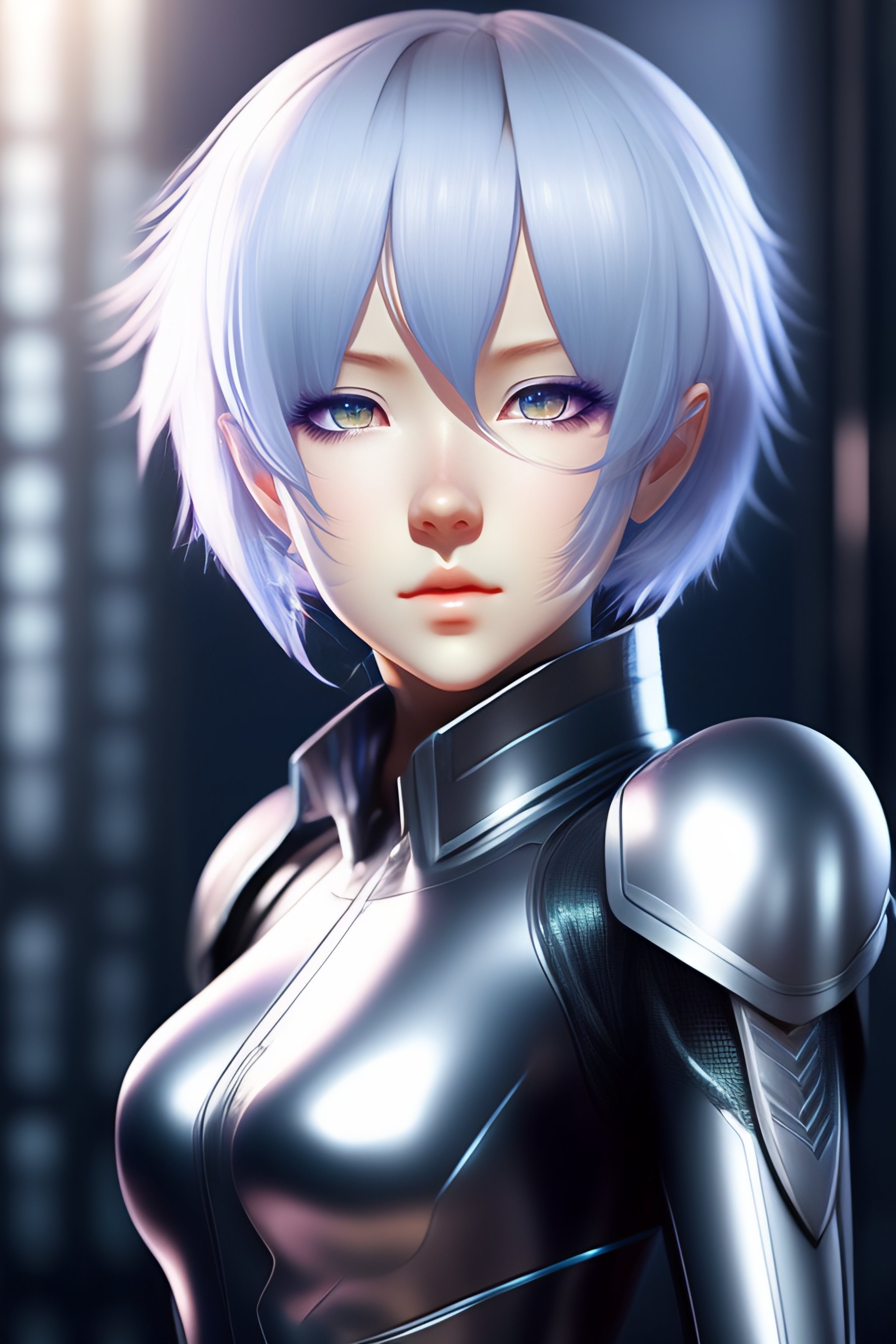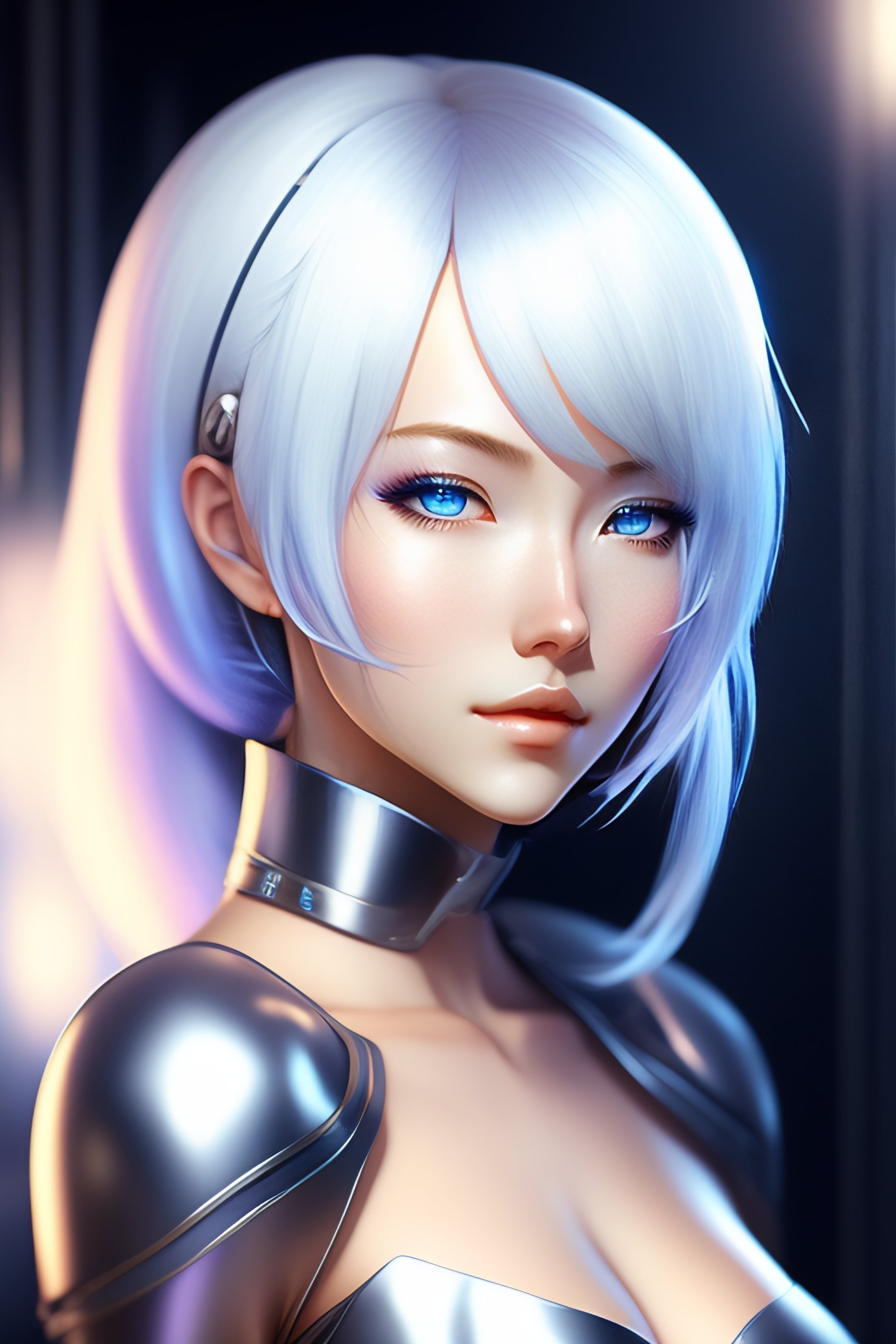 Young adult anime android girl with silver hair, blue eyes, robotic seam lines on face, mamoru oshii artsyle, realistic lighting, realistic shaded, full body portrait