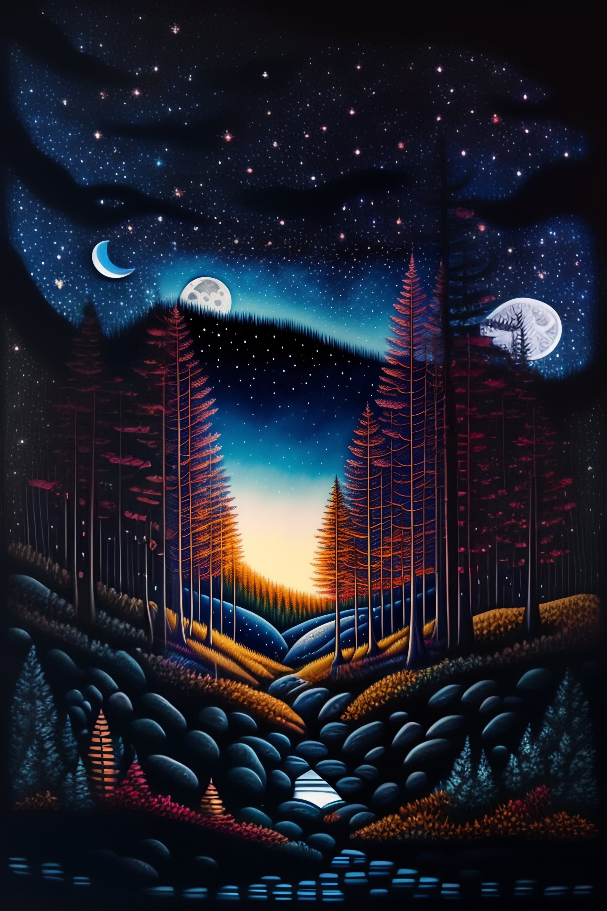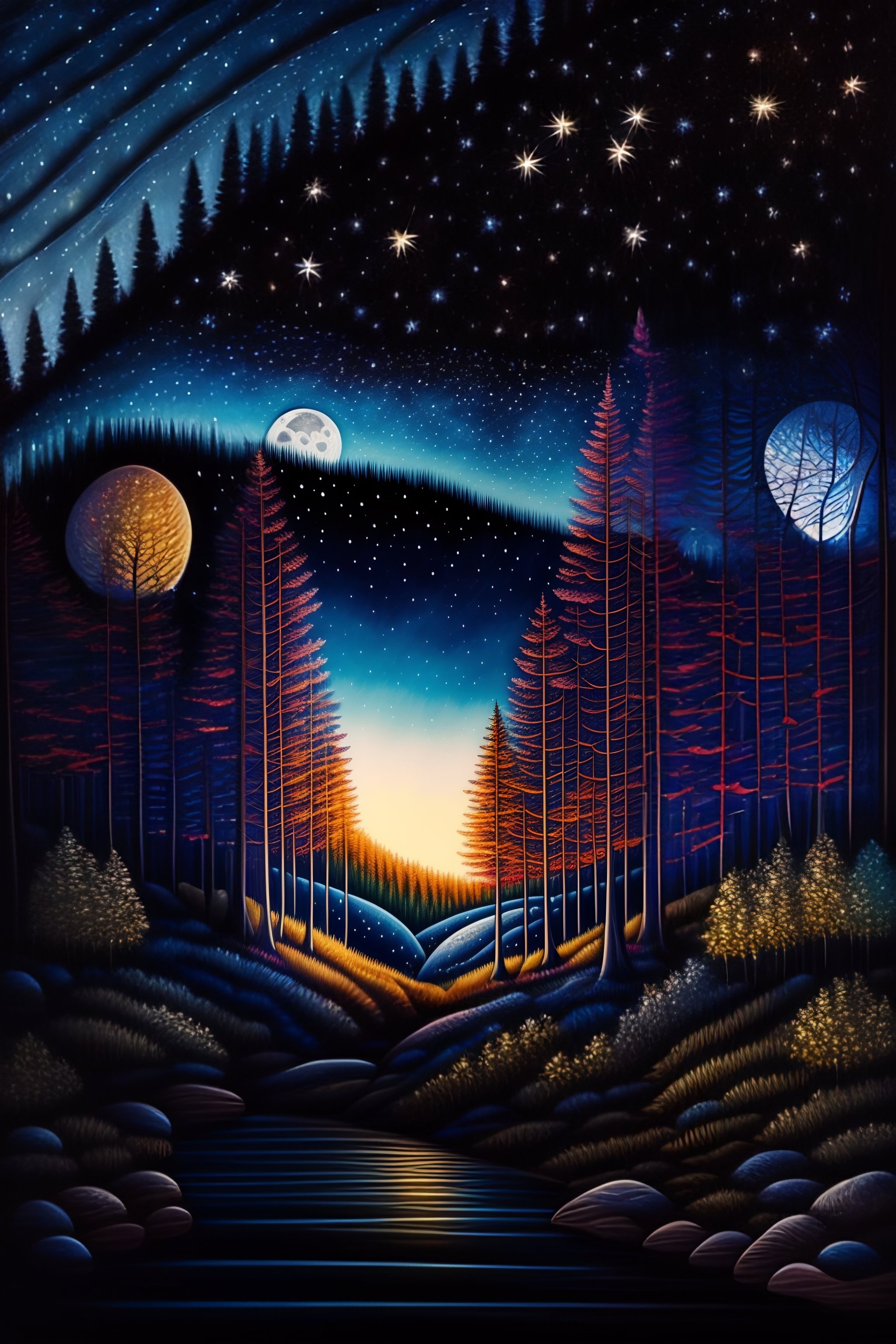 Color line drawing of a beautiful forest with the night sky with the moon and the stars, a highly realistic and detailed painting.