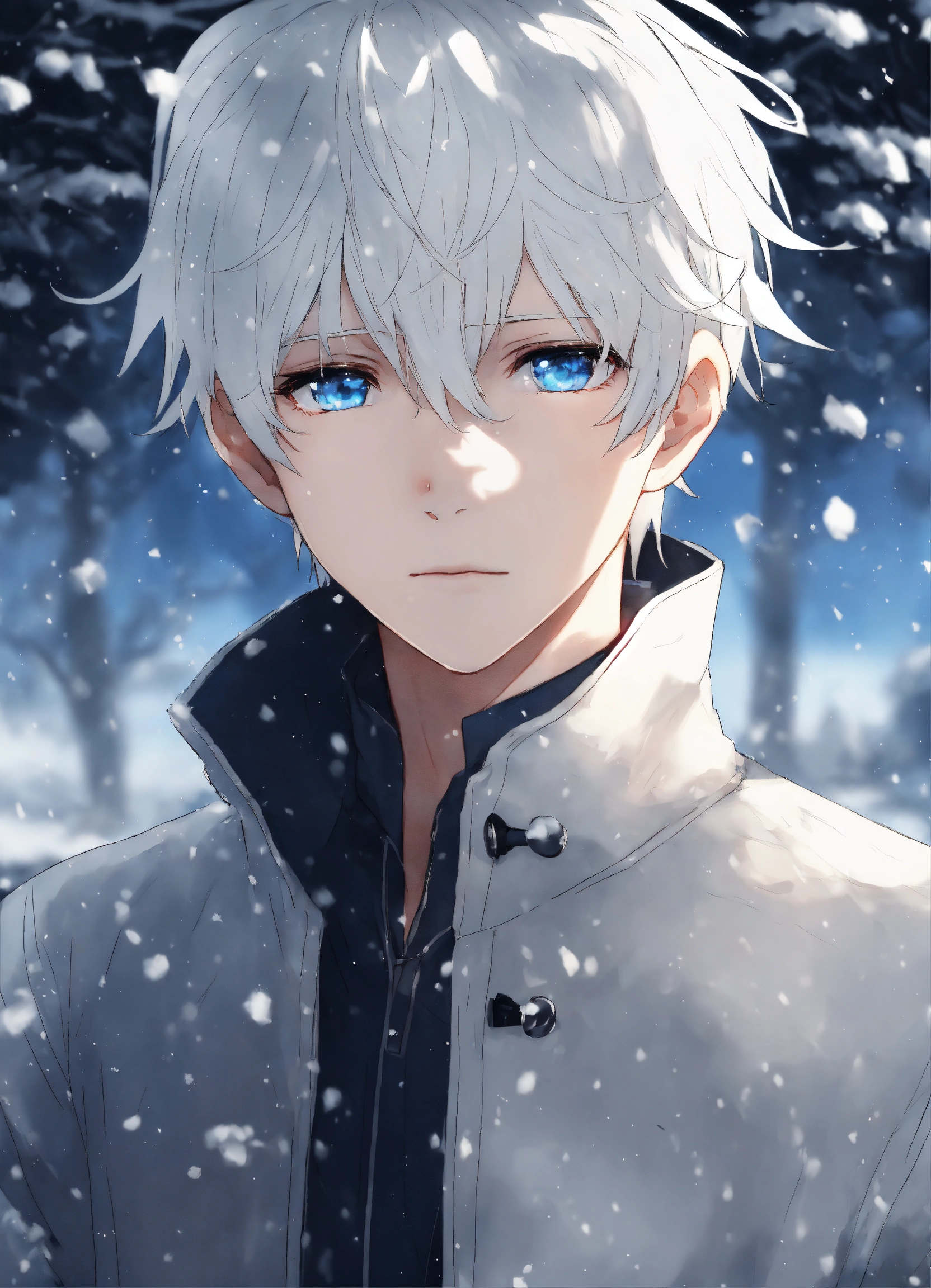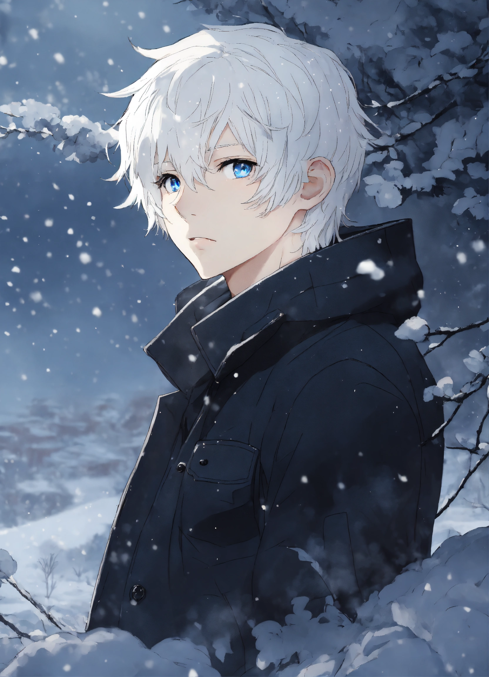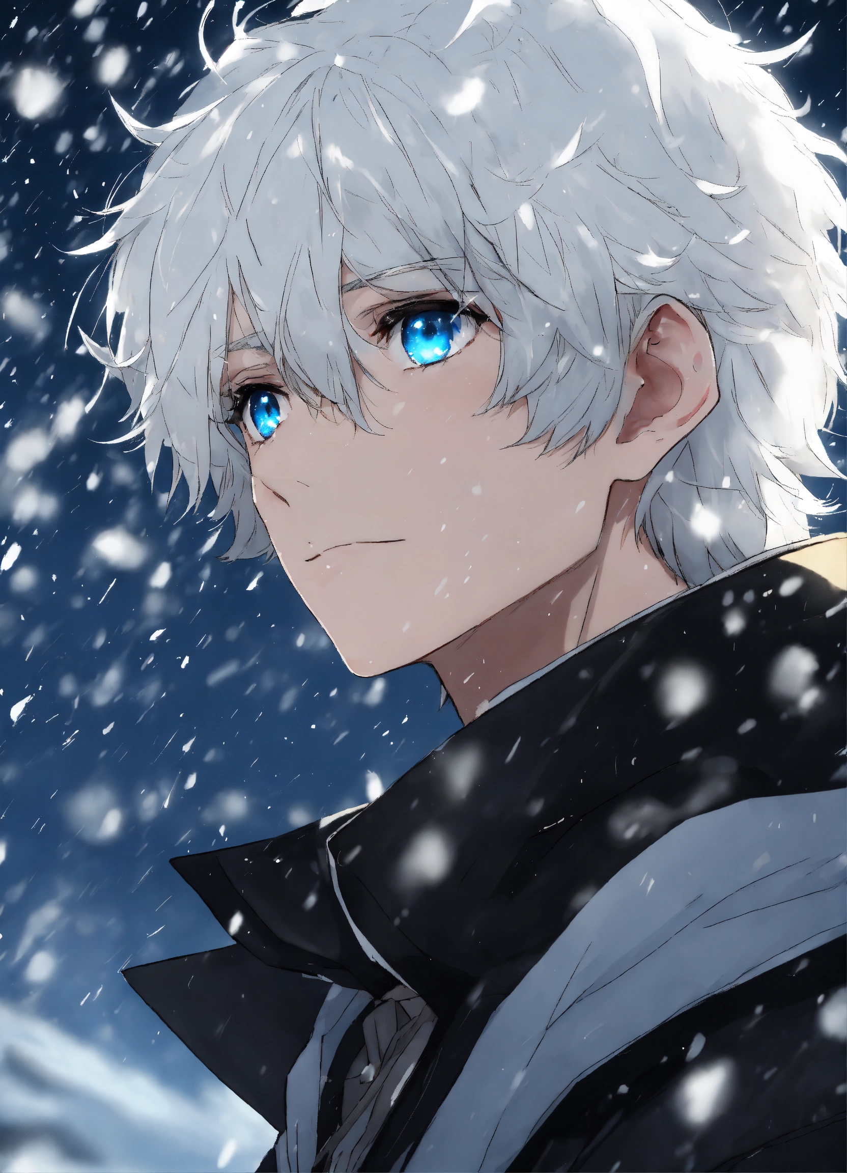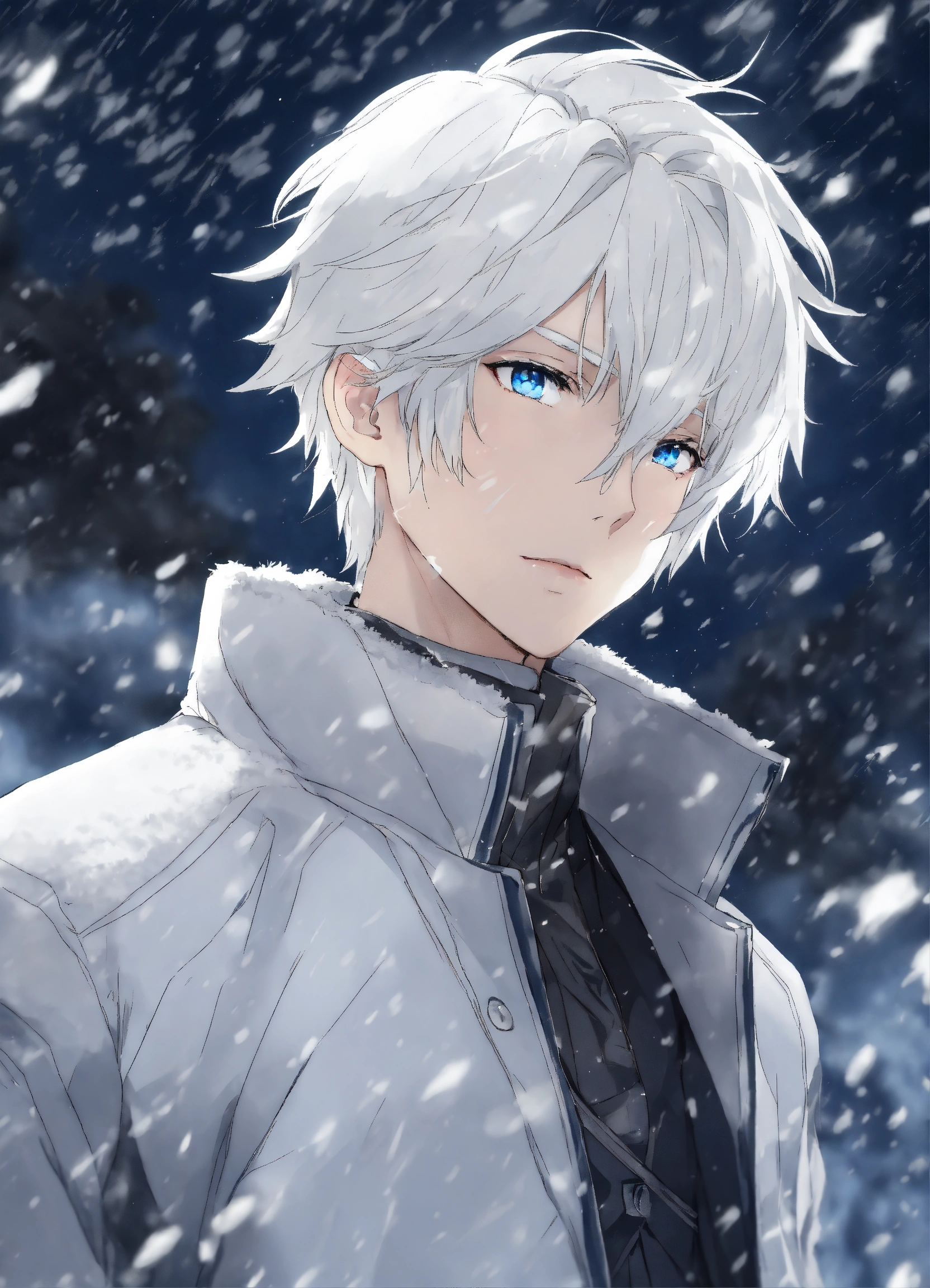White haired boy looking at the falling snow, blue eyes, white hair, pale skin, anime style, black white