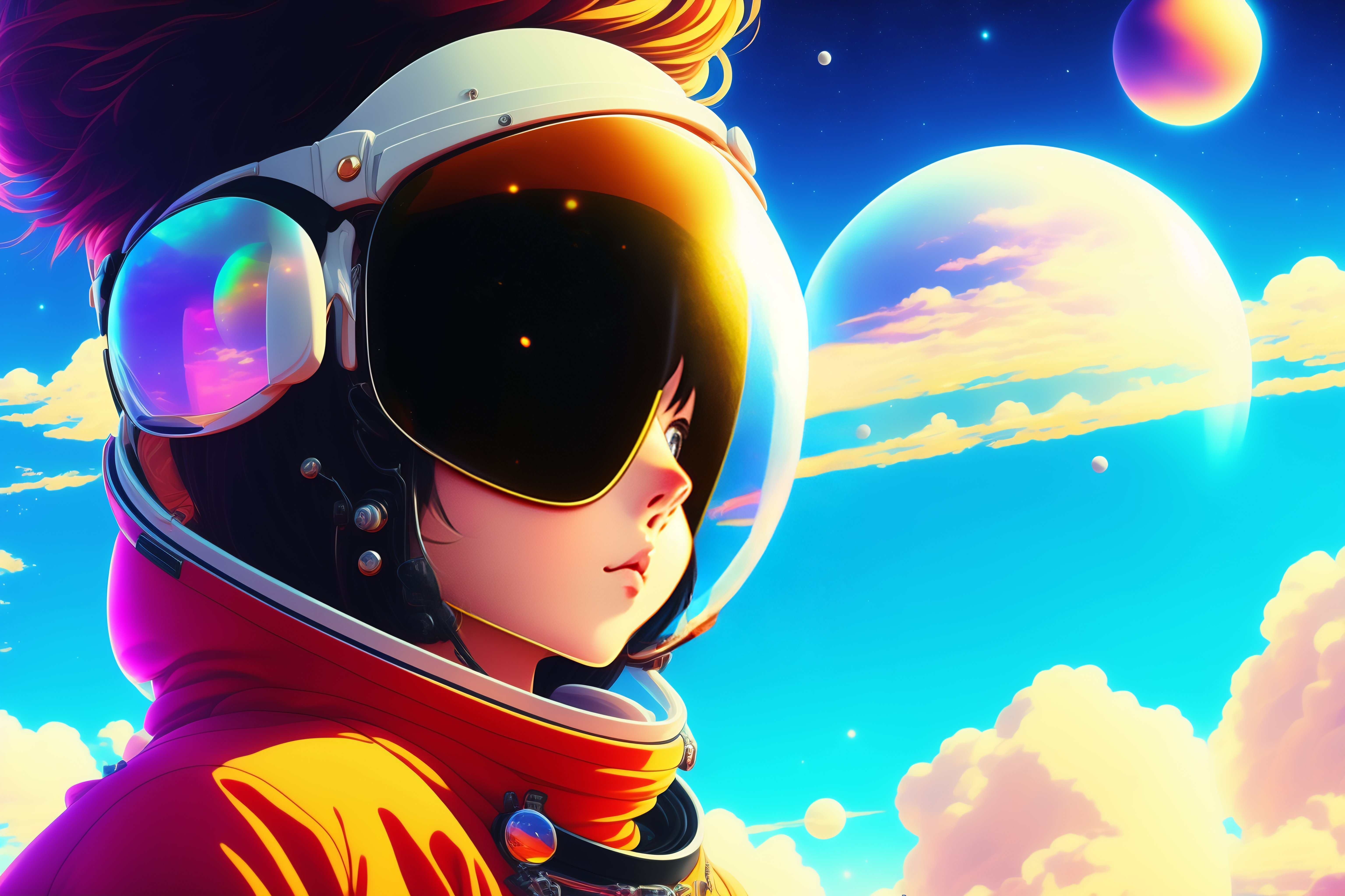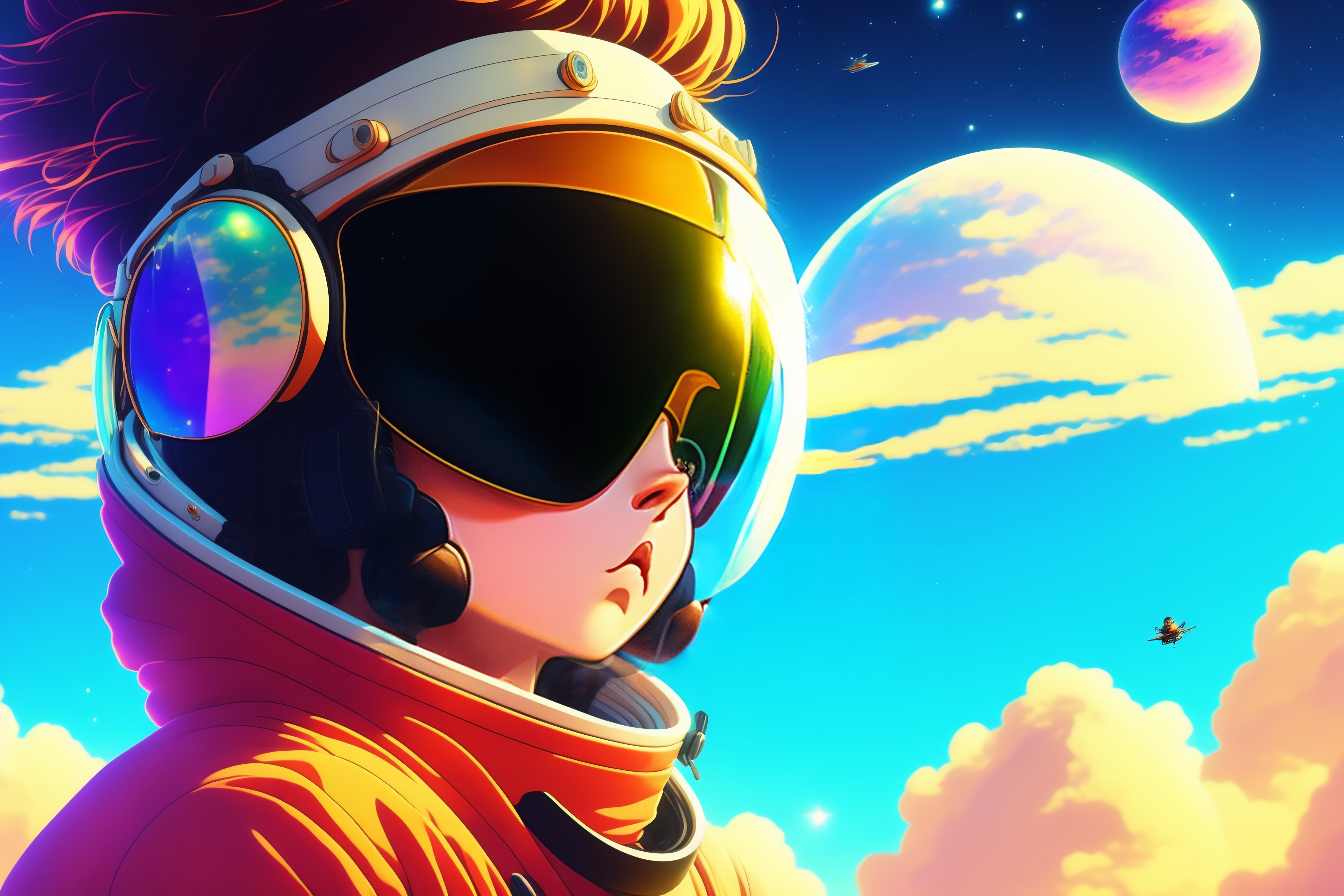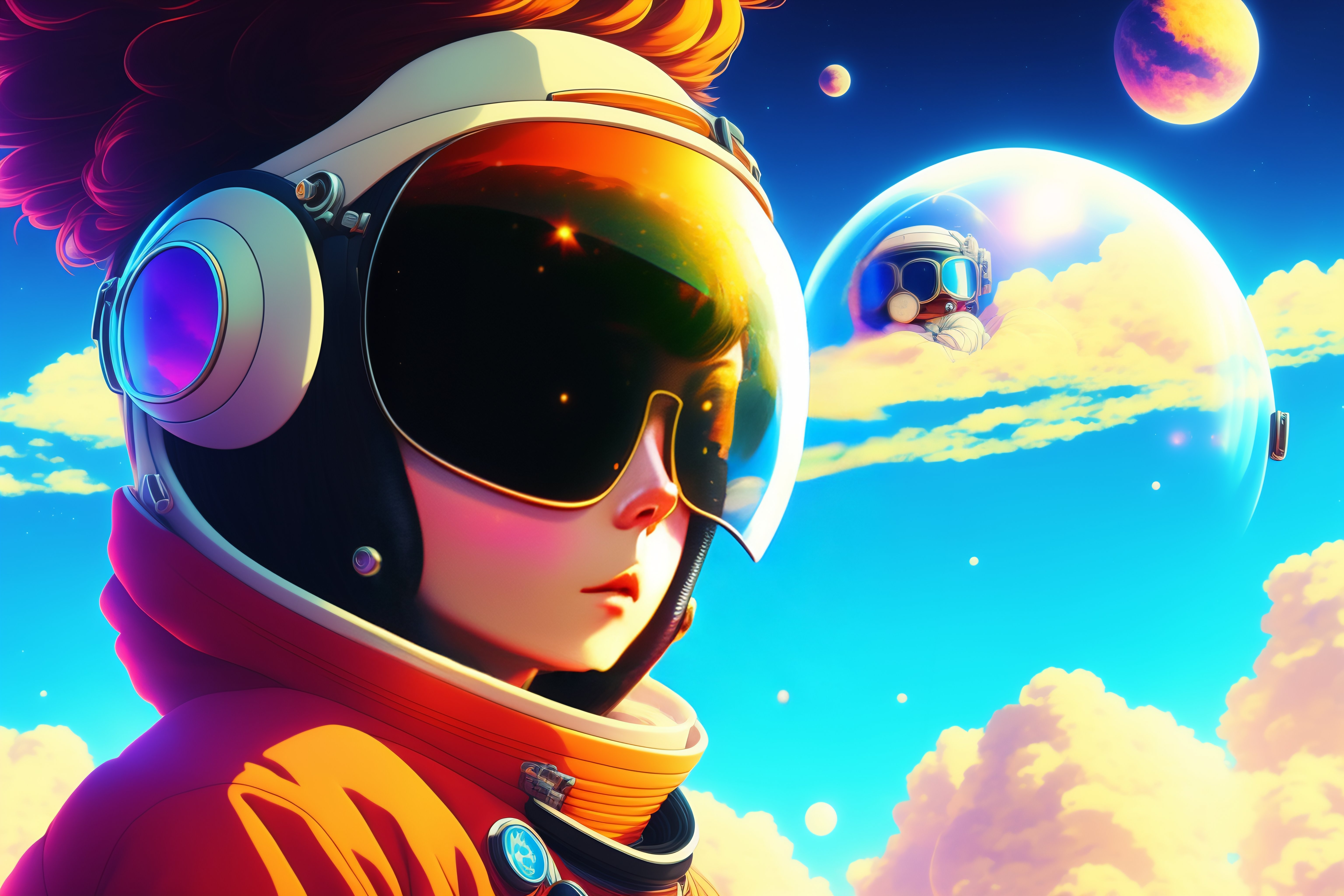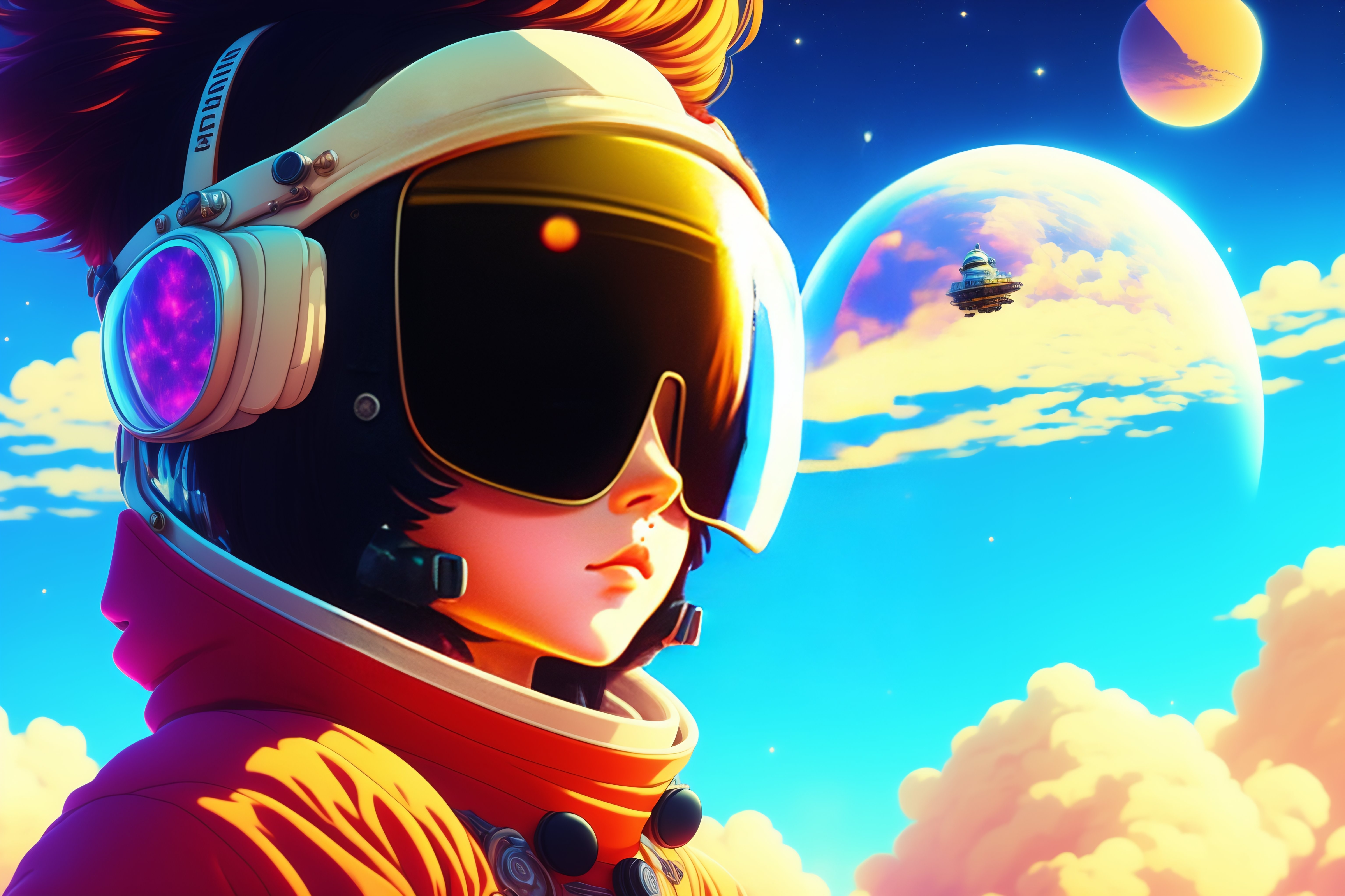 Style bored astronaut with sunglasses floating in gravity, deep bokeh, close-up, anime masterpiece by studio ghibli. 8k, sharp high quality classic anime from 1990 in style of hayao miyazaki vivid synthwave