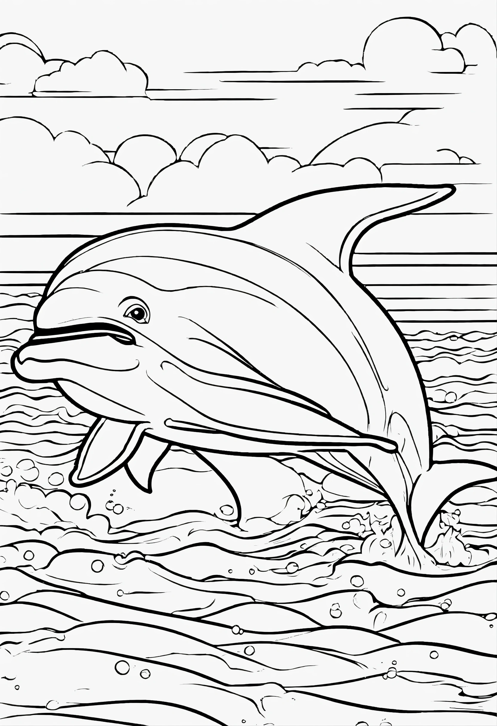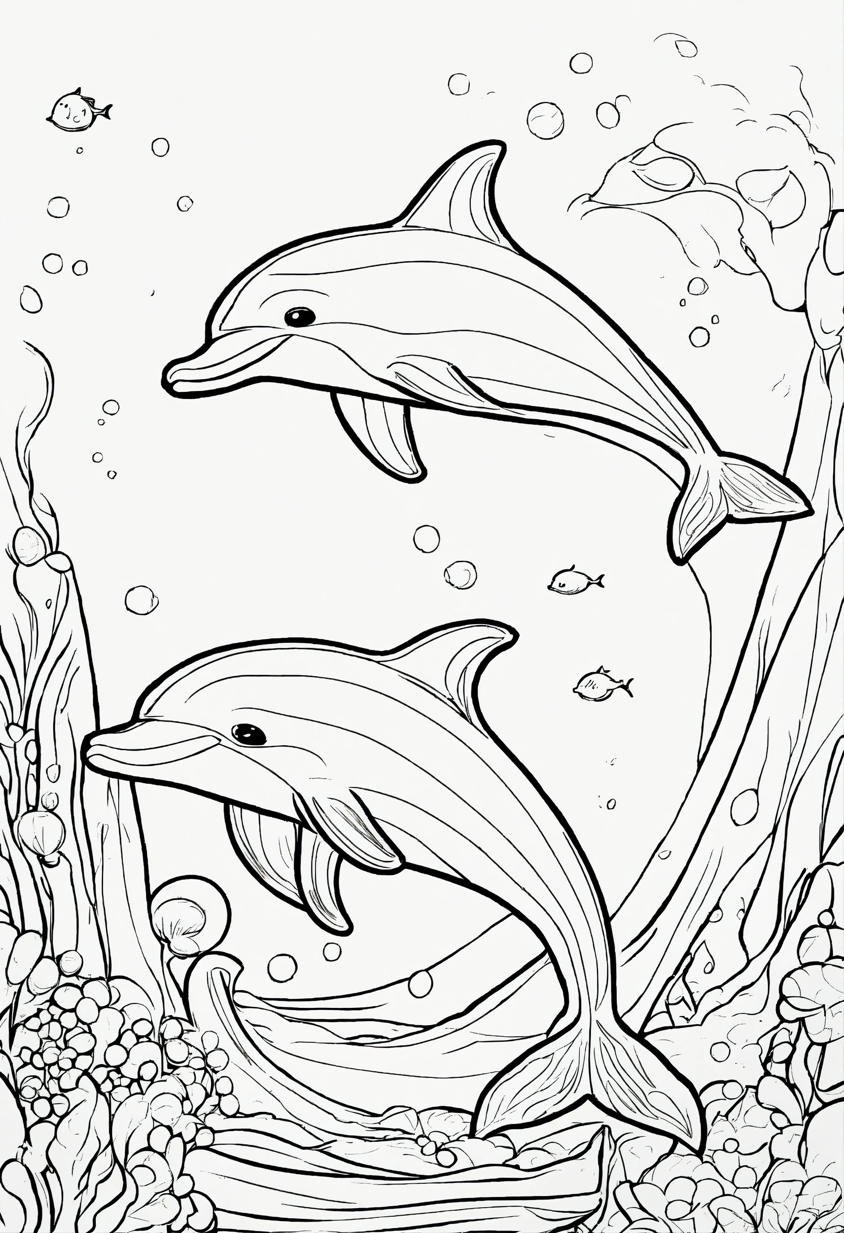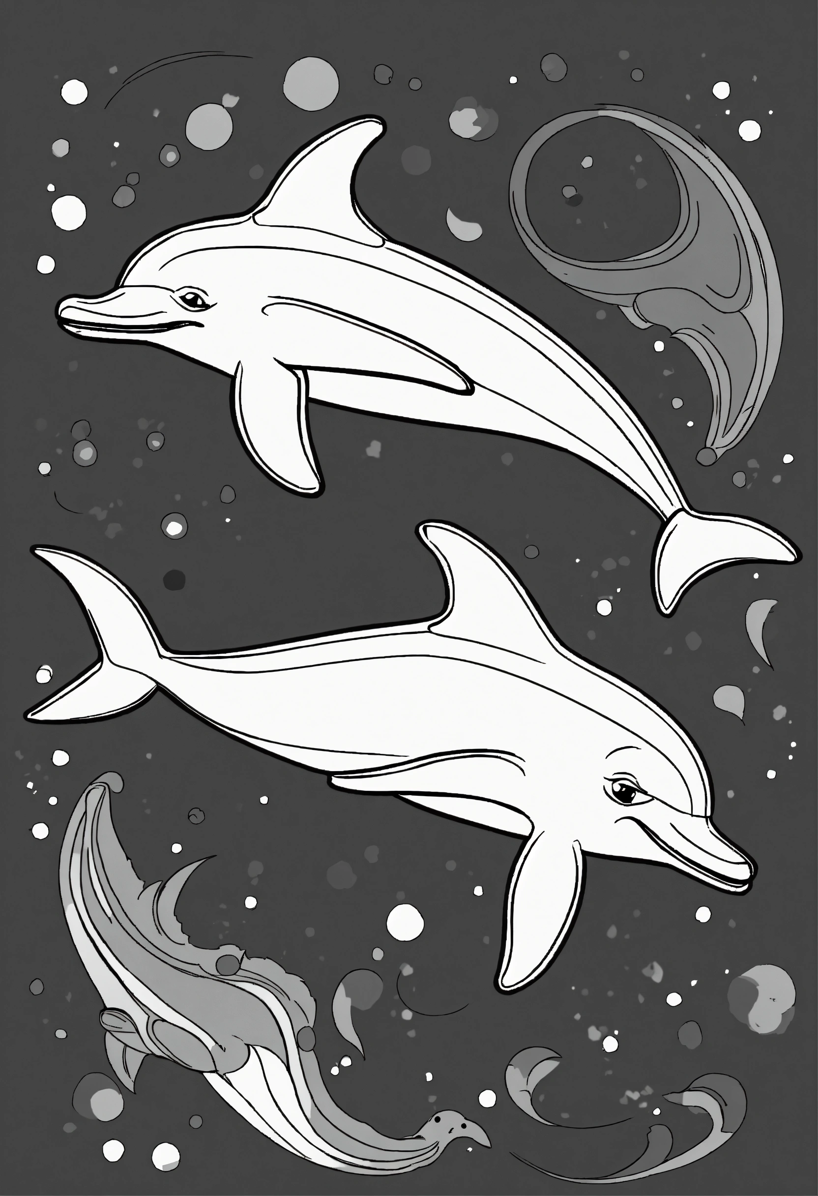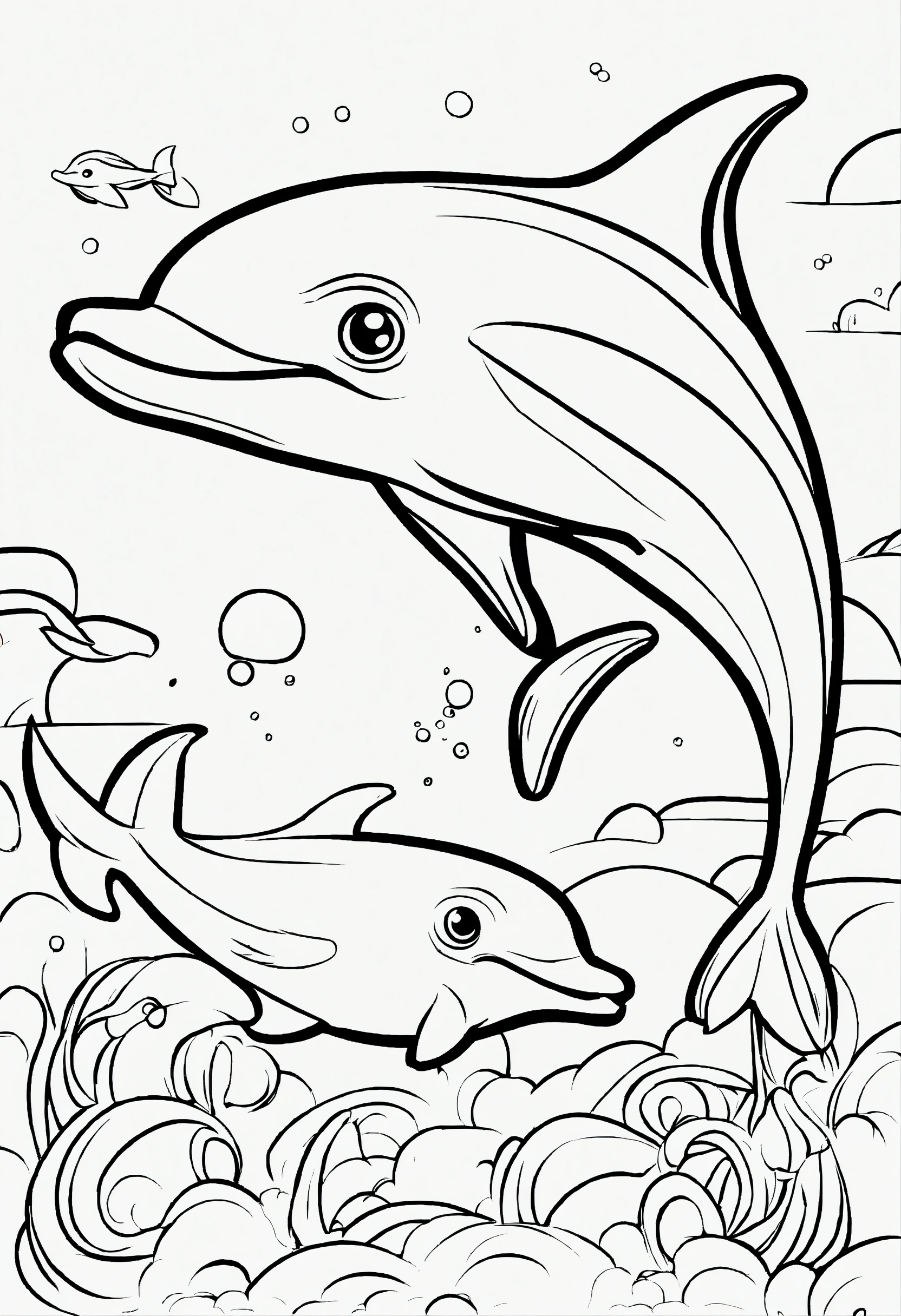 Cute dolphins, big cute eyes, pixar style, simple outline and shapes, coloring page black and white comic book flat vector, white background