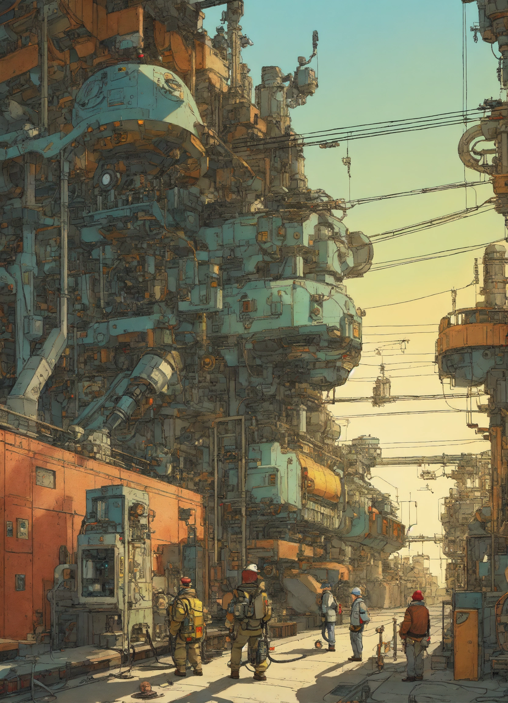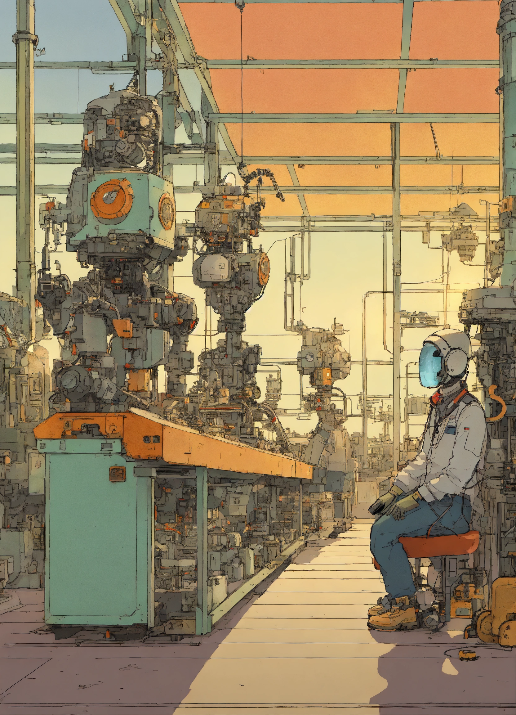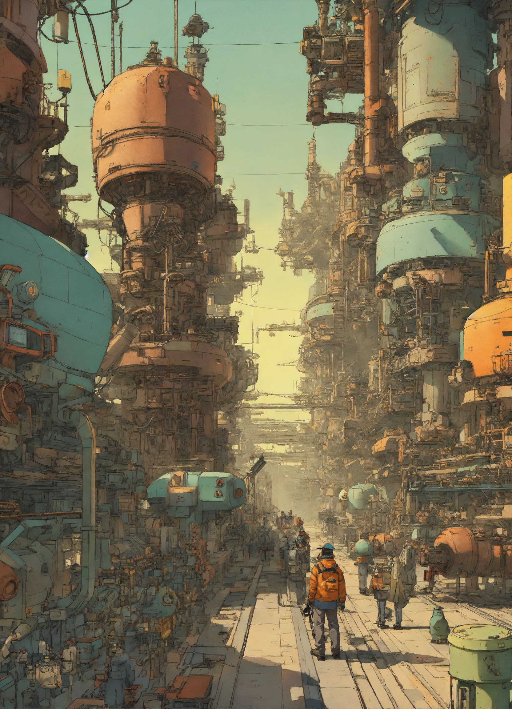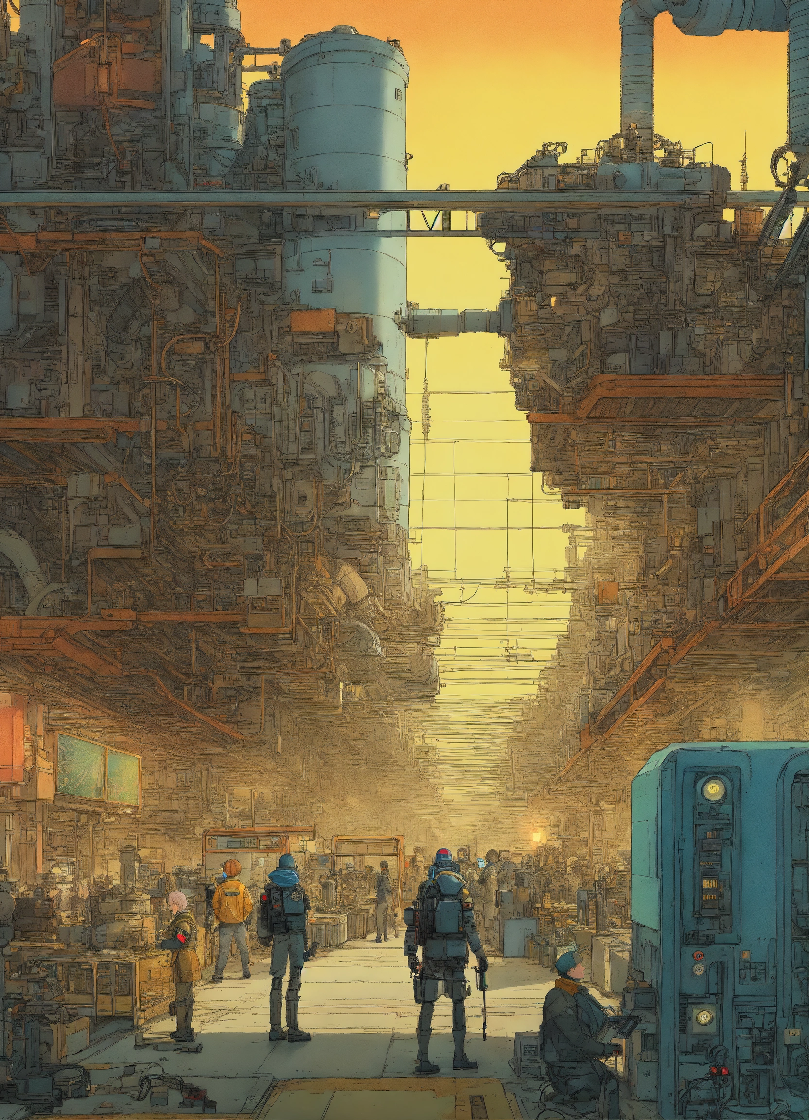 Futurepunk portraits people and robots and machines working alongside in automated factories, sunny day, colorful lighting, zoom on a main protagonist, sci-fi atmosphere, ultra-high definition (uhd), very detailed, by mattias adolfsson