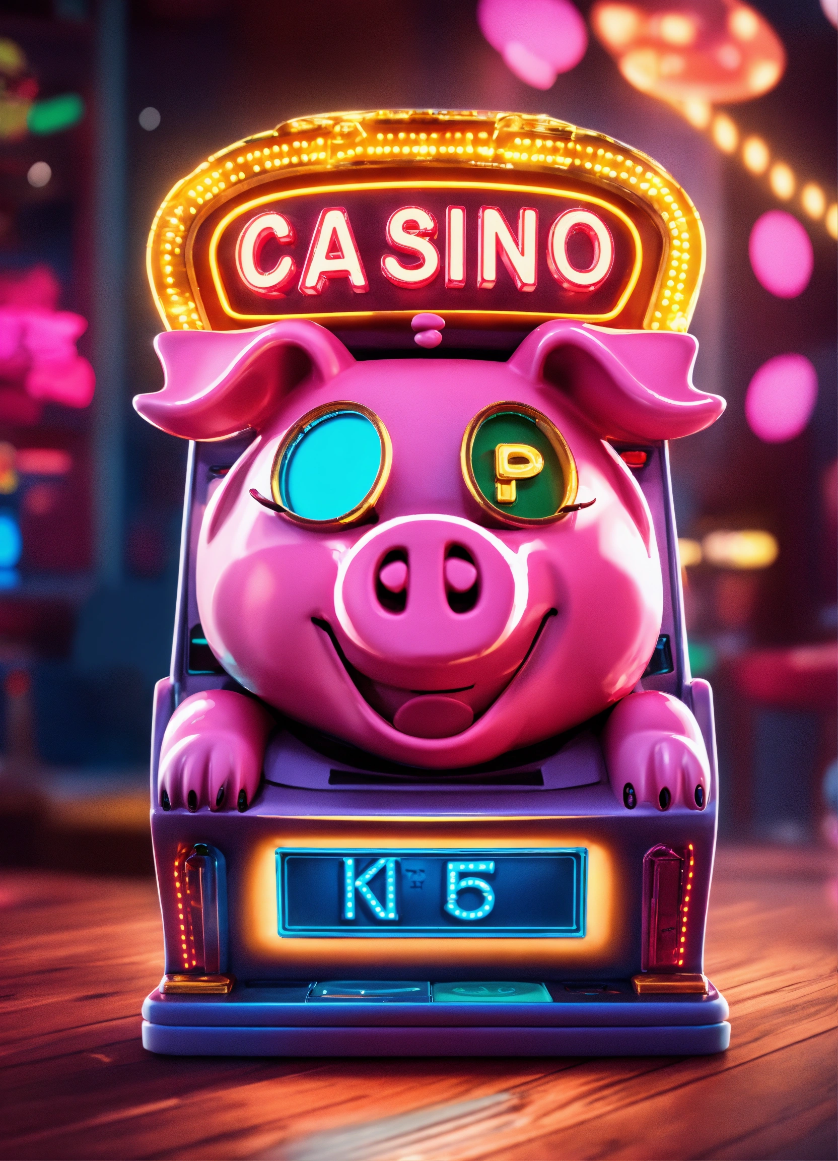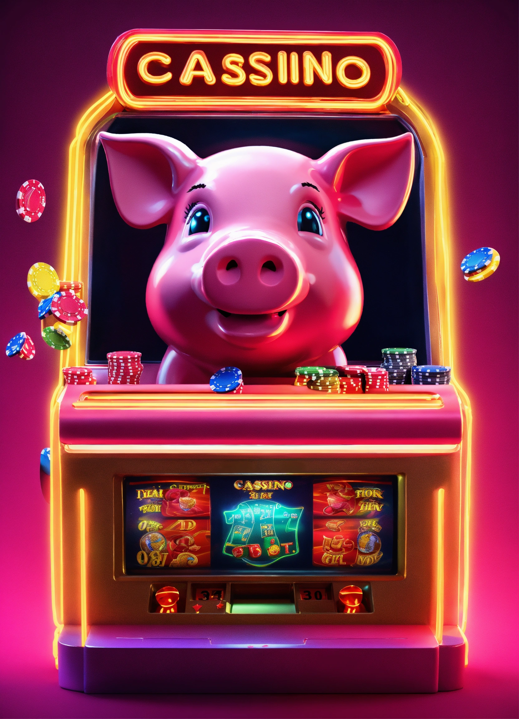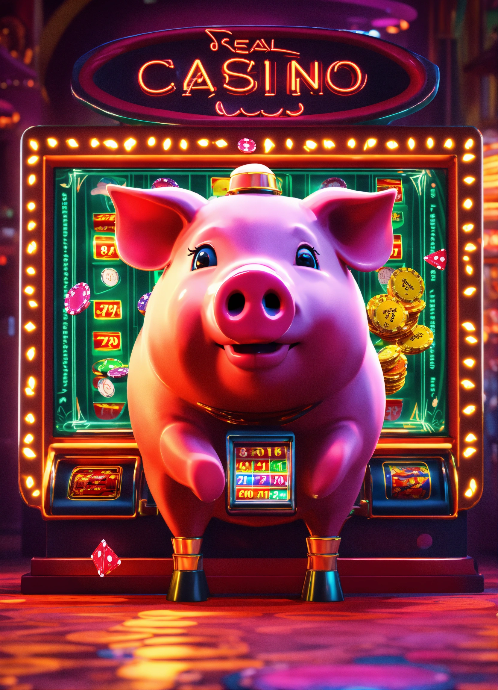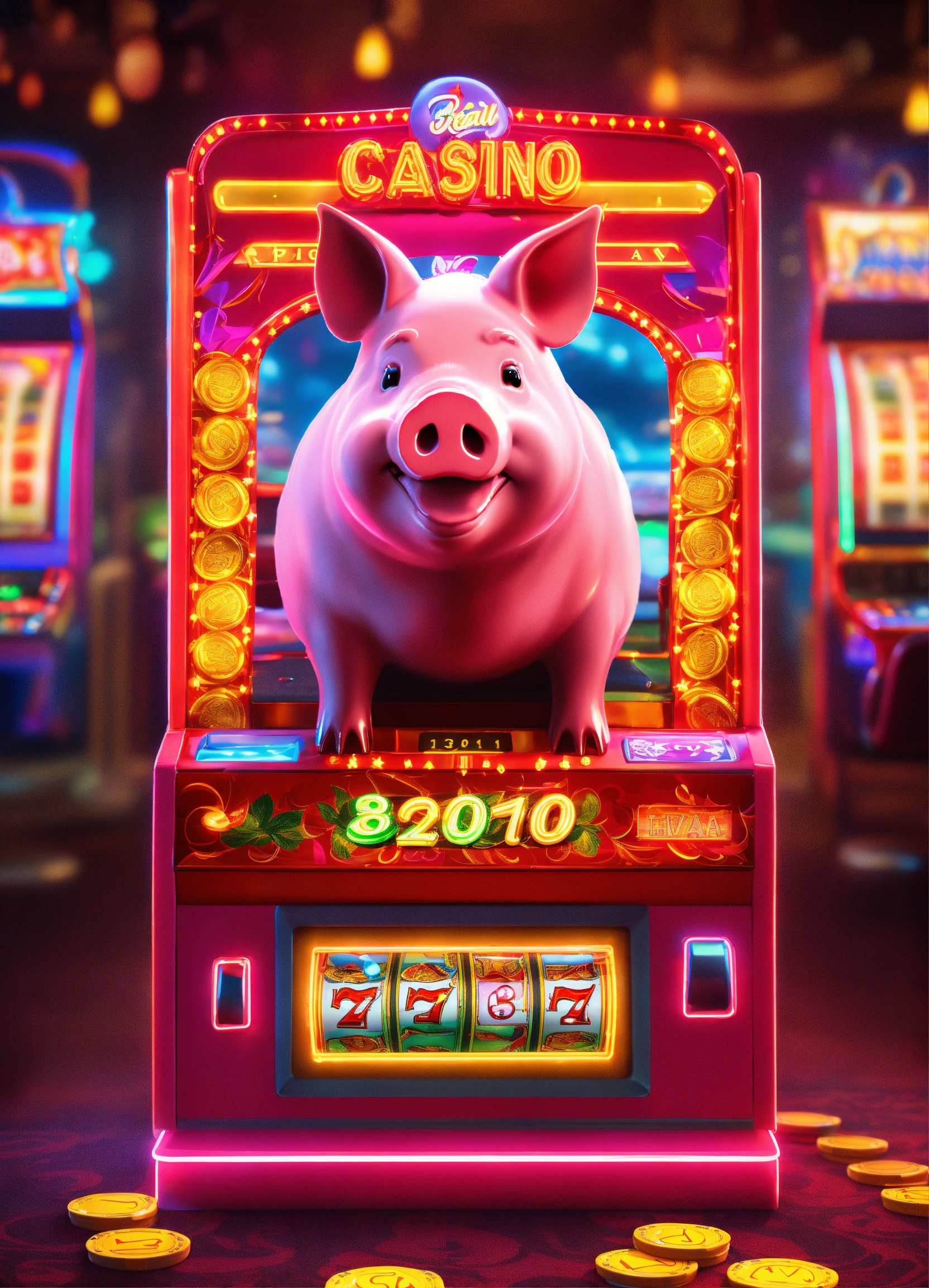 3d real cartoon pig casino slot machine in the gambling 8k neon lighting