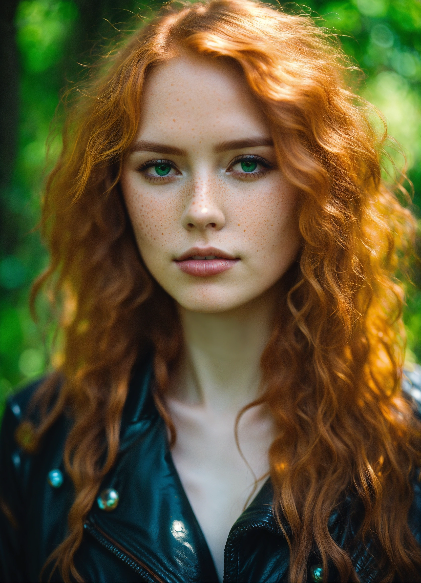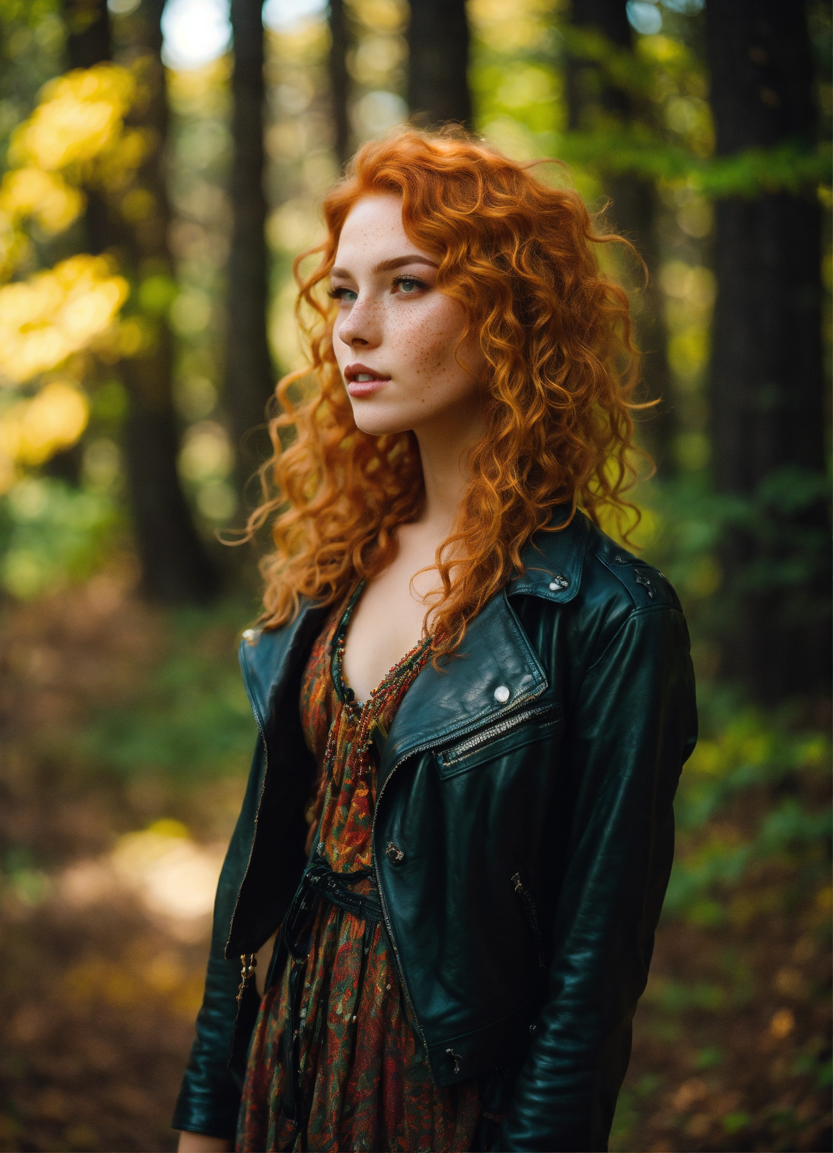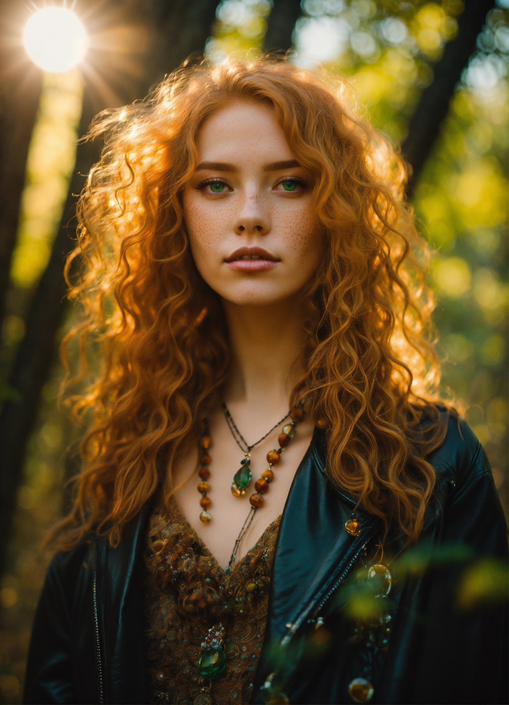Bright, strawberry blonde-haired, with freckles. 30 year old 38 inch bustline anf full lips, green eyes, wearing a black leather jacket and amber strands and beads the sun, the autumn forest, fantastic beauty. curls. wearing a boho summer dress ultra-detailed dreamlike, photography 8k resolution image, translucent and ethereal.