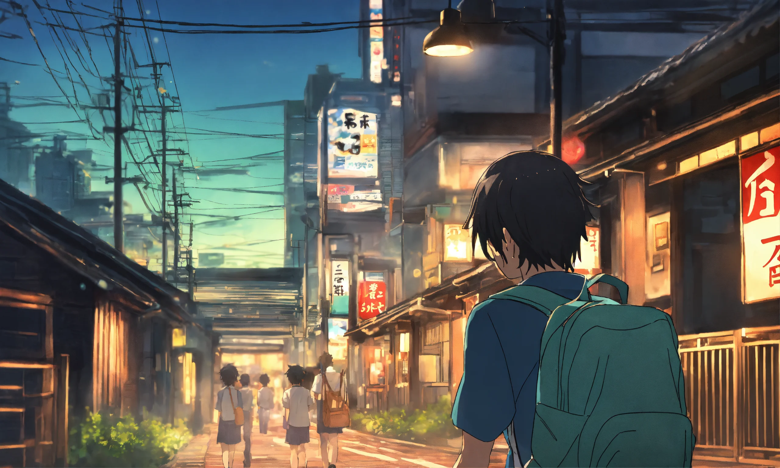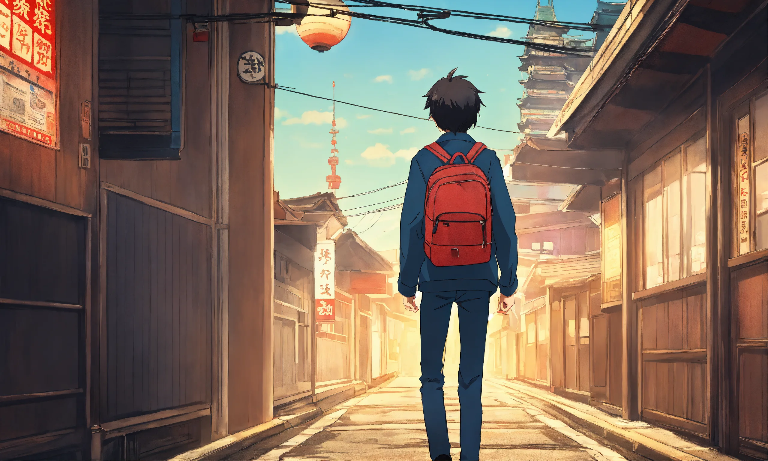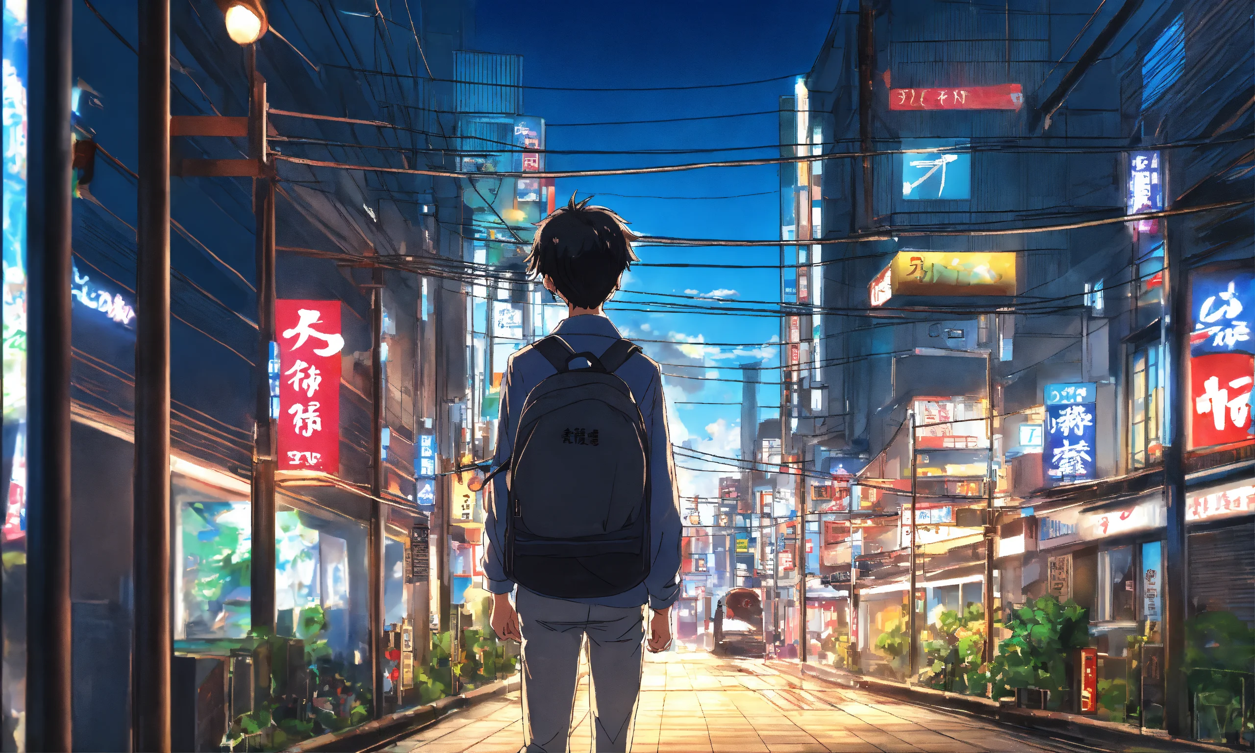 A back view of a teenager school boy discovering tokyo