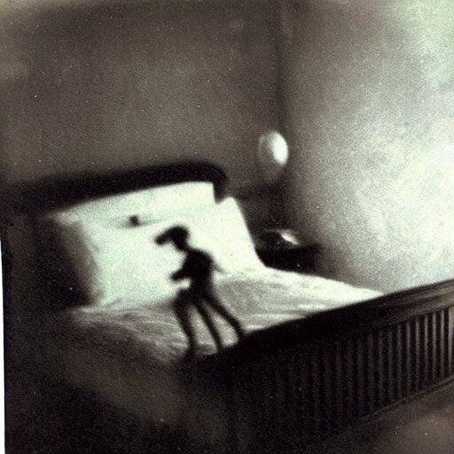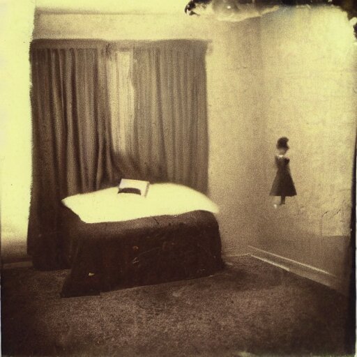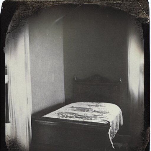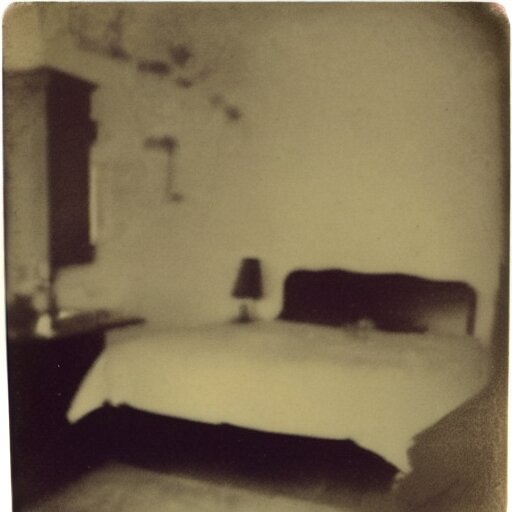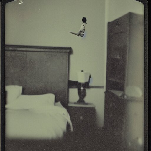Ghost flying near old bed in motel room | vintage scratched polaroid photo