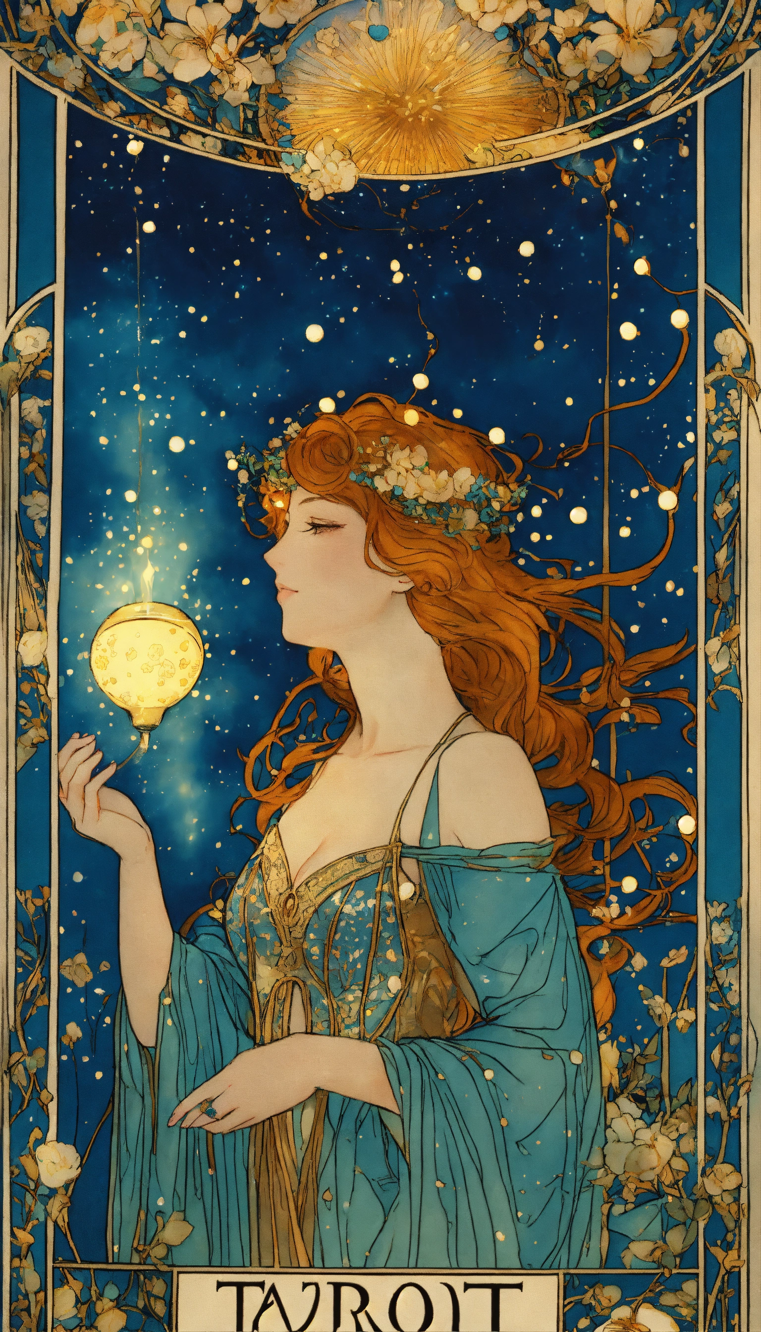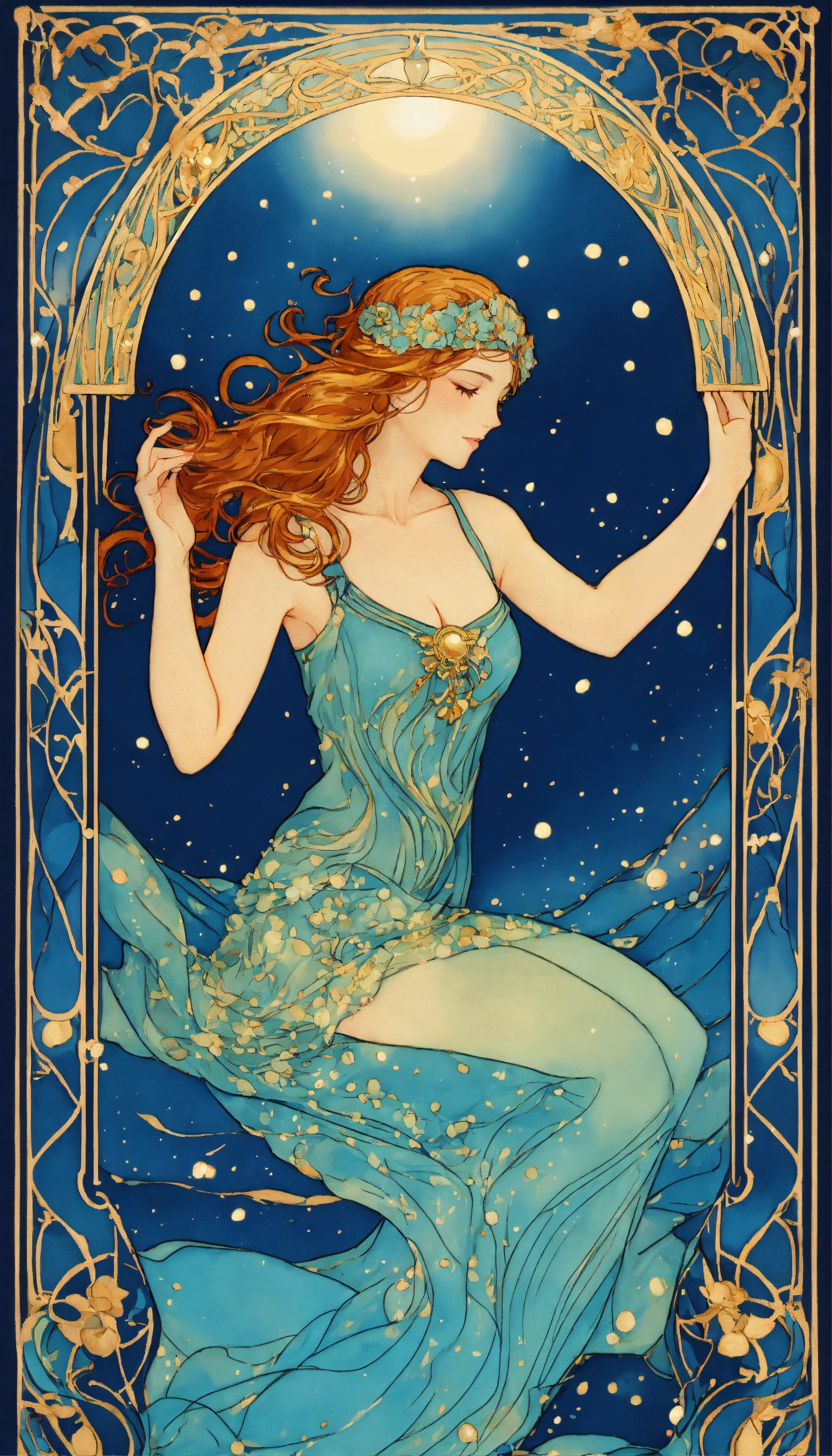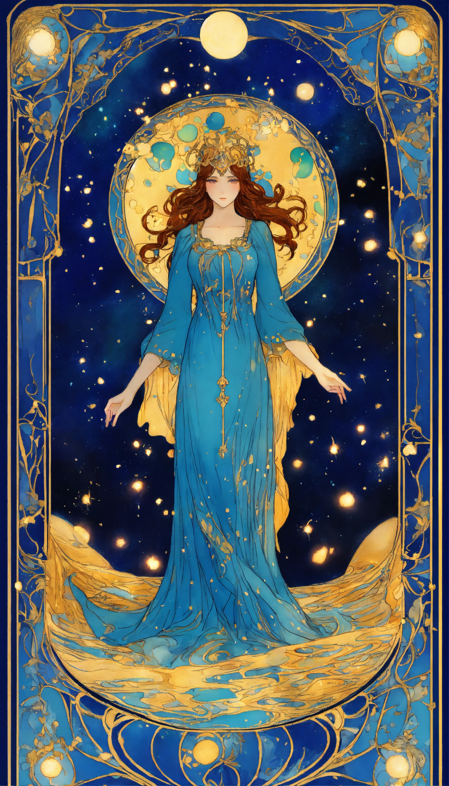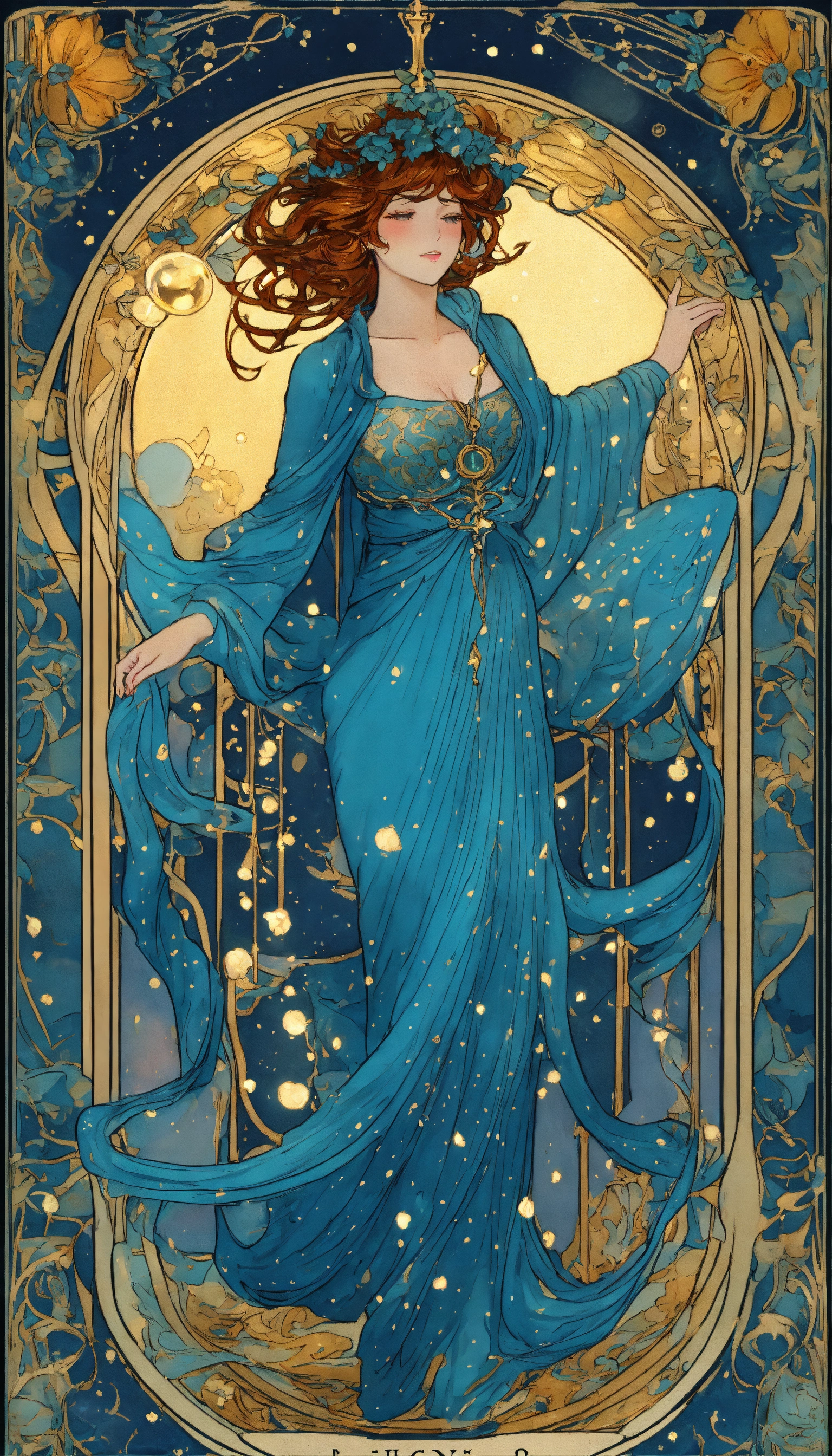 Art nouveau tarot blue glowing full cup overflowing with spakles