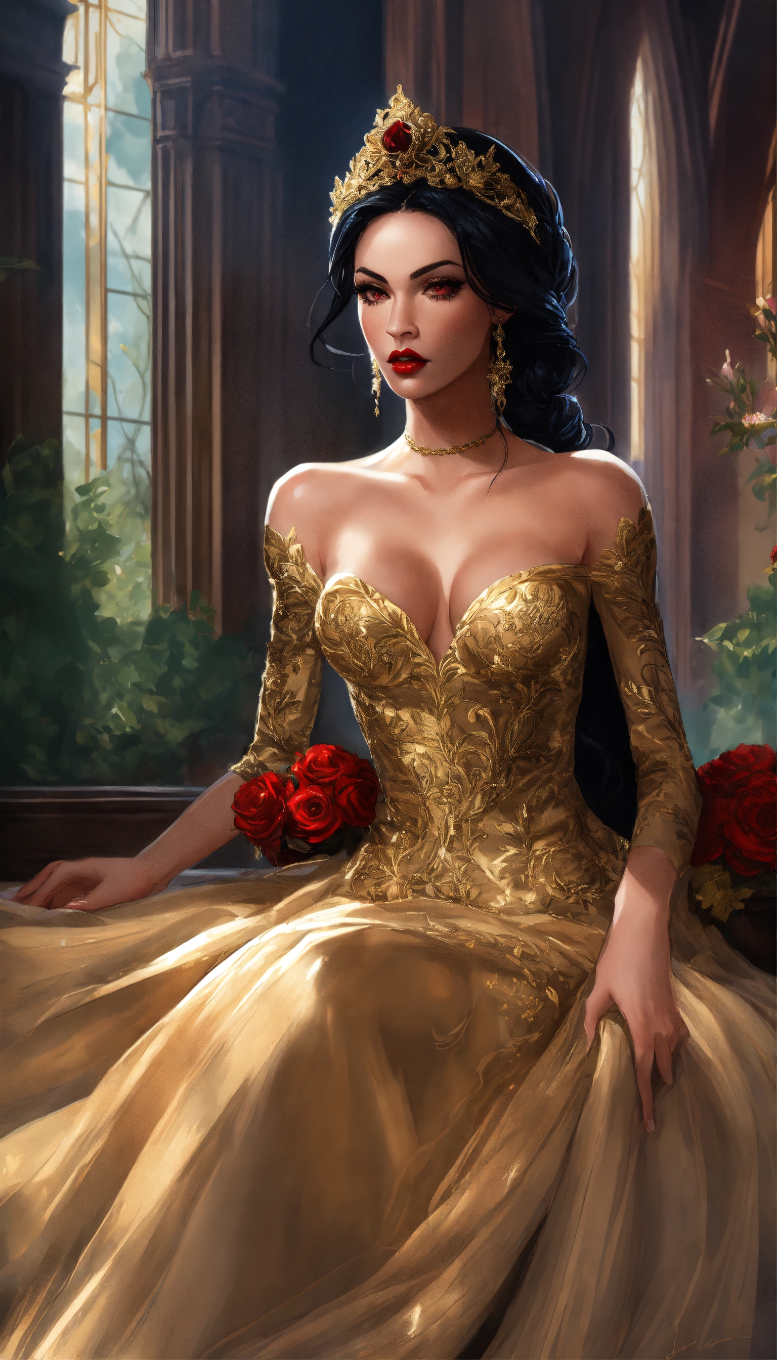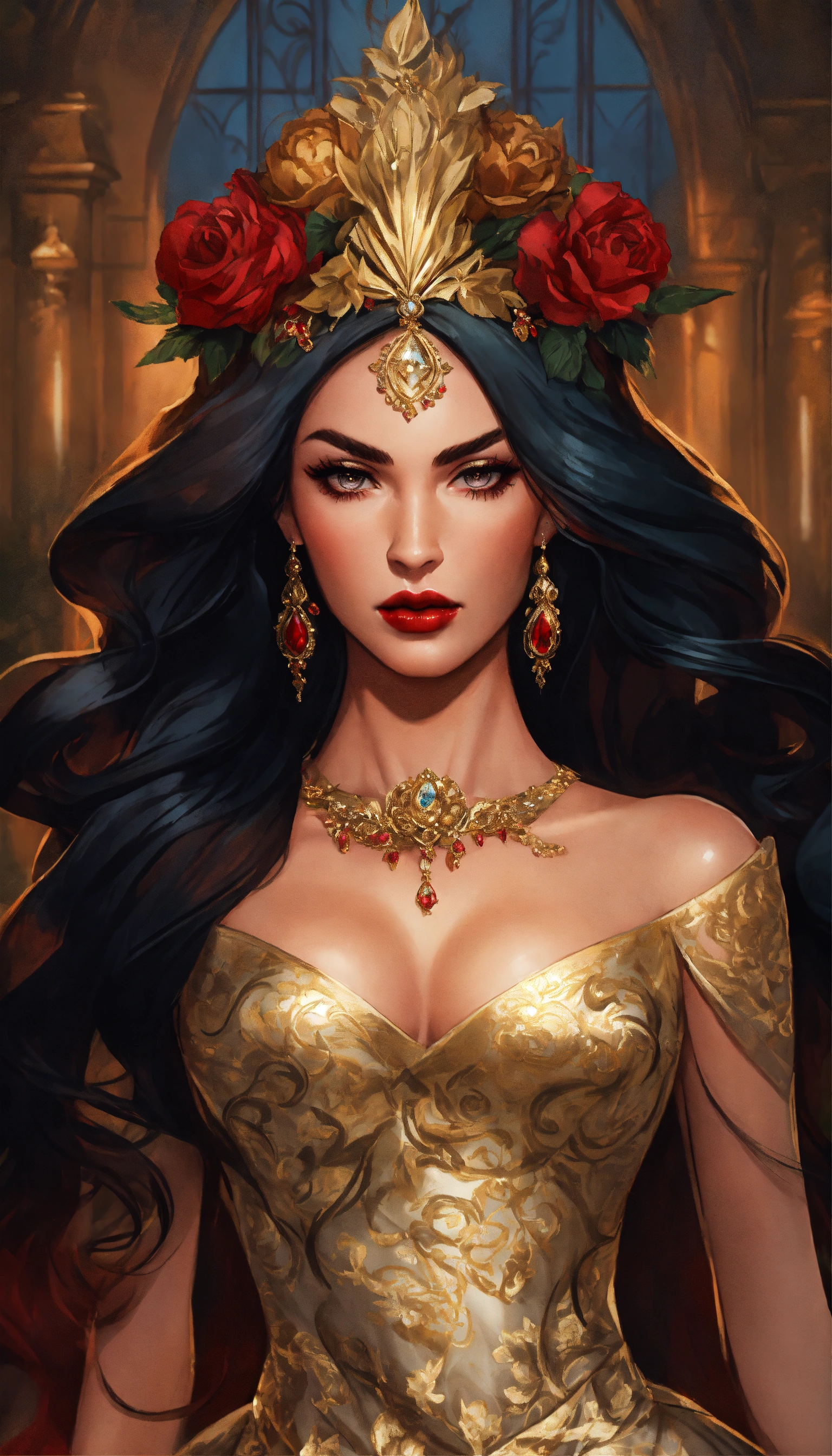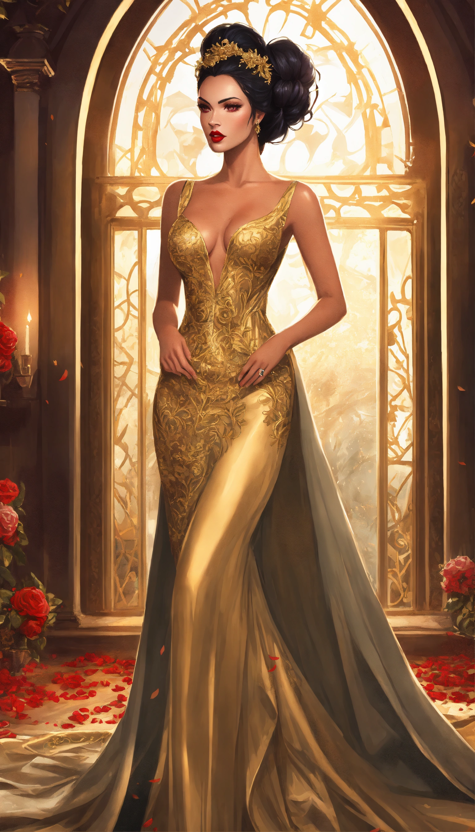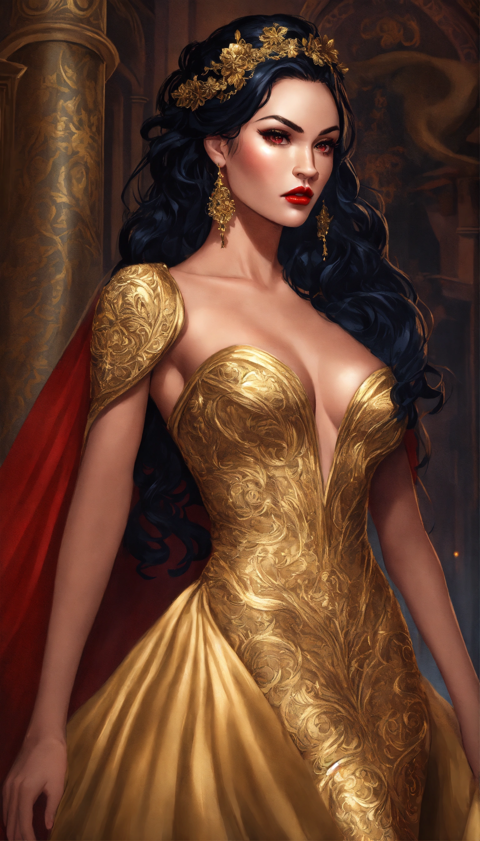 Concept art of ravenna, megan fox, glowing red eyes, curled voluminous flowing black hair in a formal wedding updo, hair in a bun, updo, bun, curled black hair tied up in a wedding bun, beautiful, tan skin, realistic, sabine rich, artgerm, j scott campbell, artgerm, perfect body, detailed, intricate, round face, slim nose, long black eyelashes, red lips, sharp jawline, perfect detailed face, realistic, gold veil, full body view, evil sorceress, dark sorceress, gloomy grey castle background, gloomy dark flowers forest castle, gold floor length tight fitted wedding dress, low cut plunging neckline, gold high heels, voluminous curled long hair, gold long veil, golden wedding gown, very long transparent golden veil and hair tied up, golden fitted bridal gown, big voluminous long train full skirt gown, forest, yennefer, zuhair murad bridal, zuhair murad bridal ball gown, all gold patterned textured shimmer fabric embroidered dress, haute couture gold long train wedding dress, train, sleeves