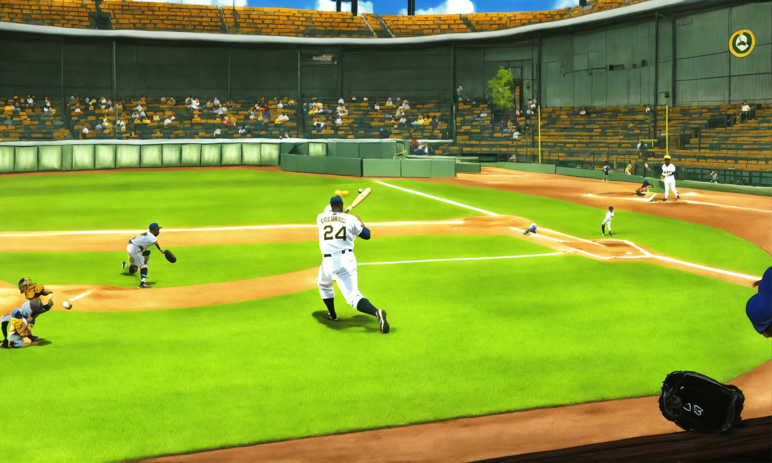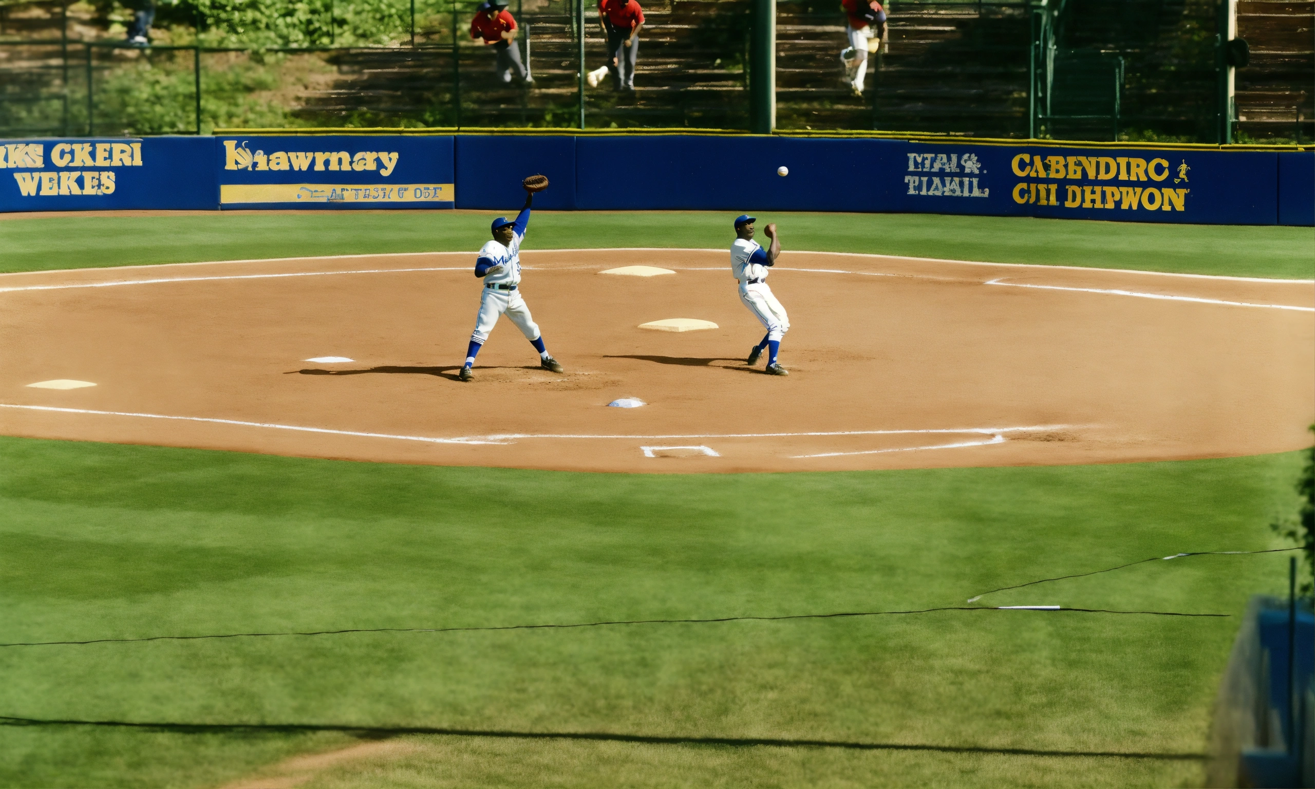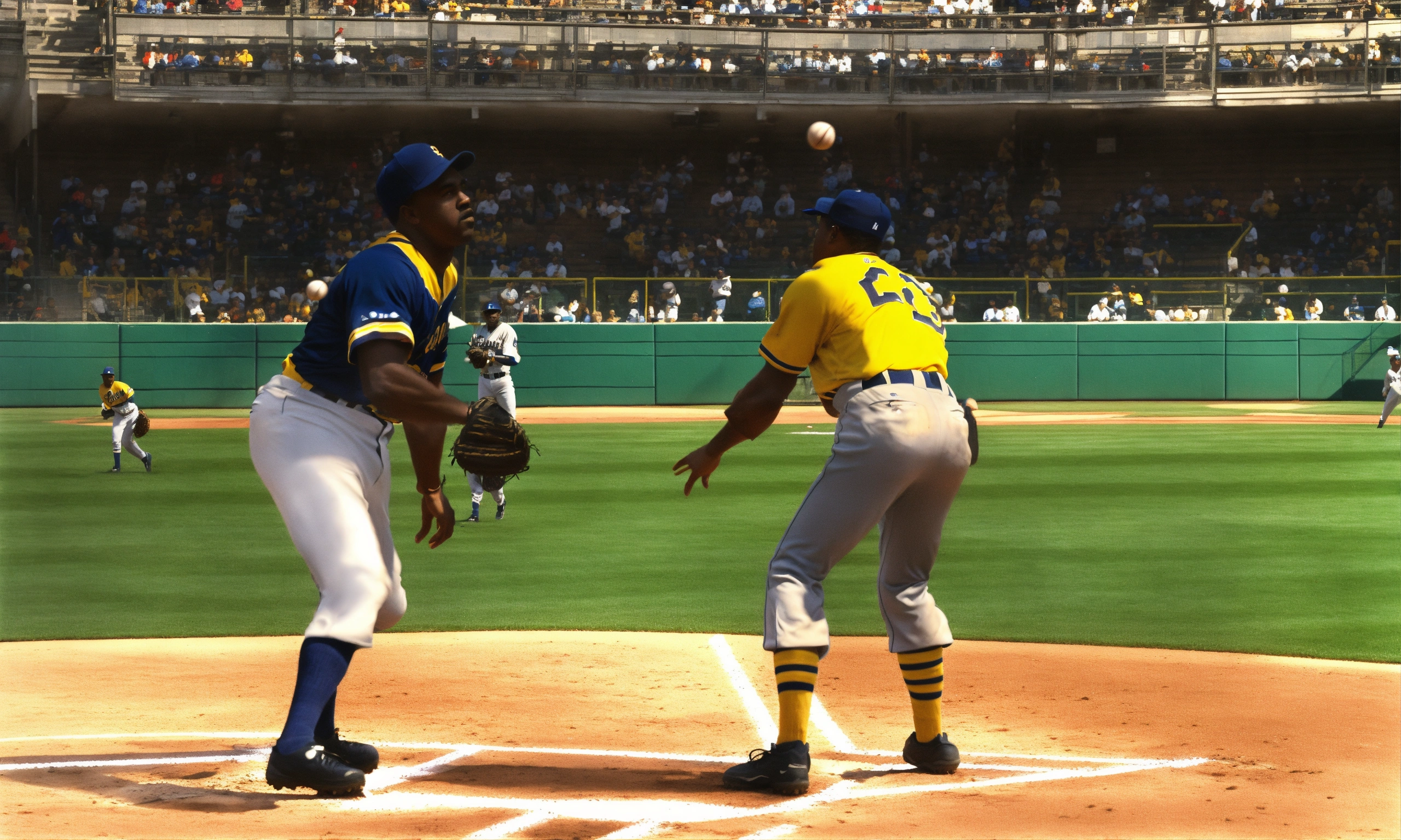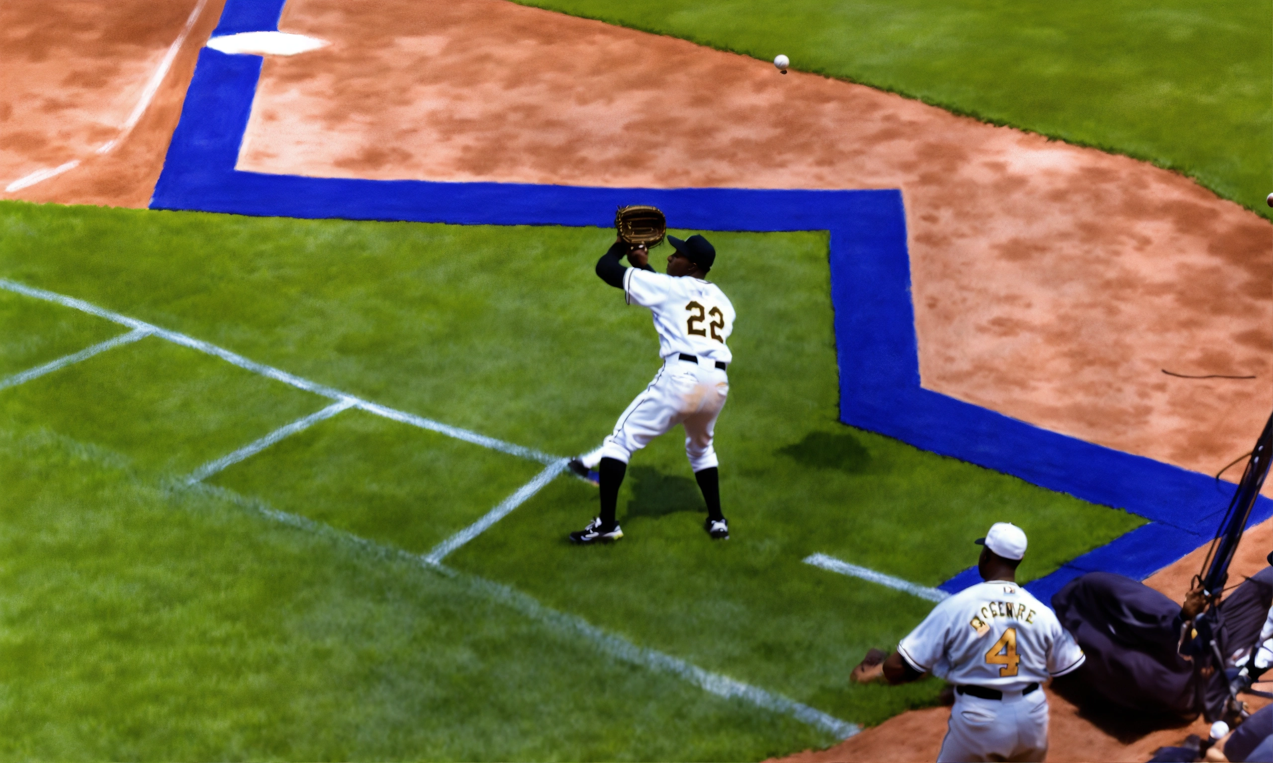 Art drawing of jackie robinson and roberto clemente having a catch on a baseball field