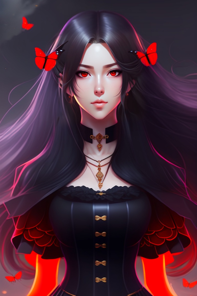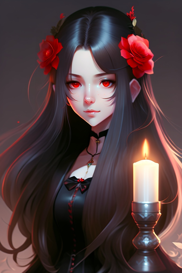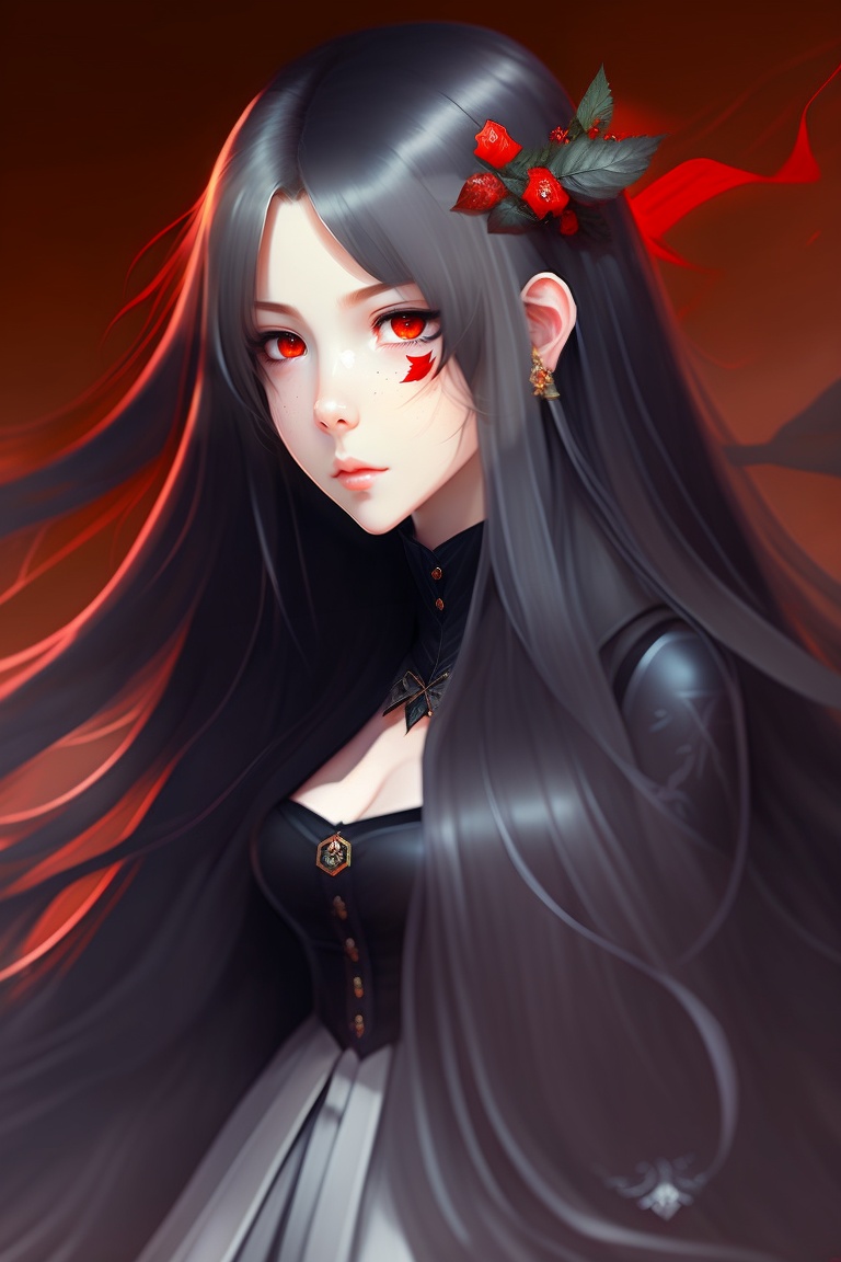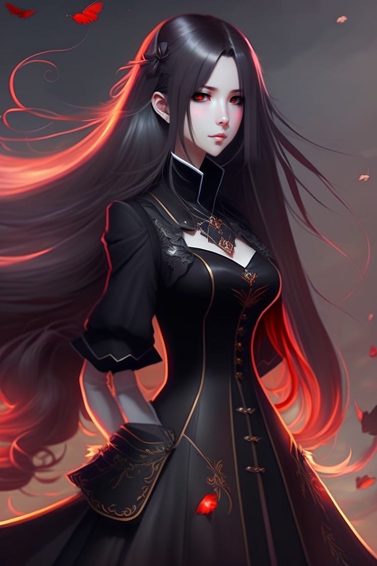 Anime girl, gothic, vampire, red eyes, long hair, black hair, black dress, sad, eyebags, pale, skull, white veil.