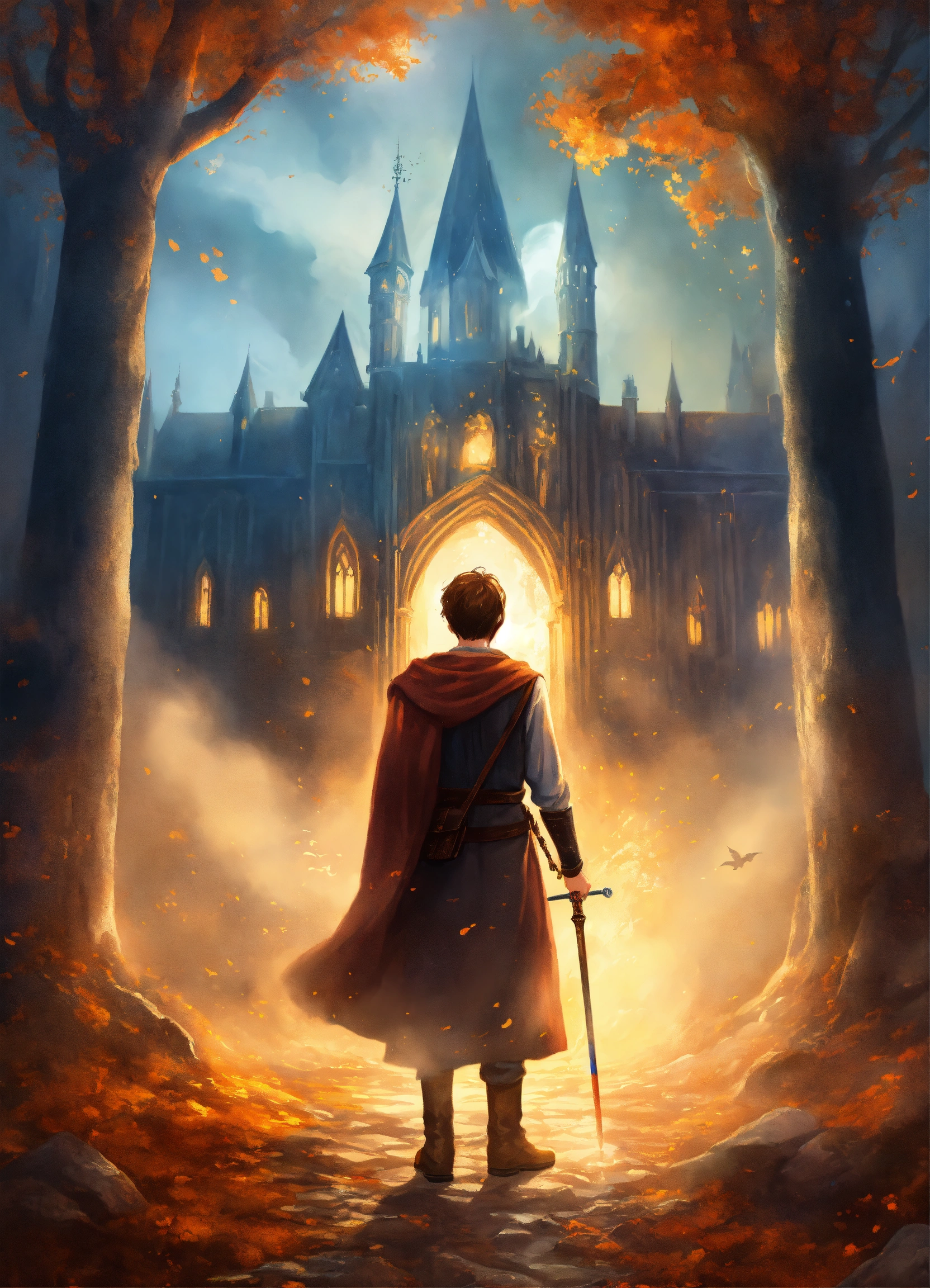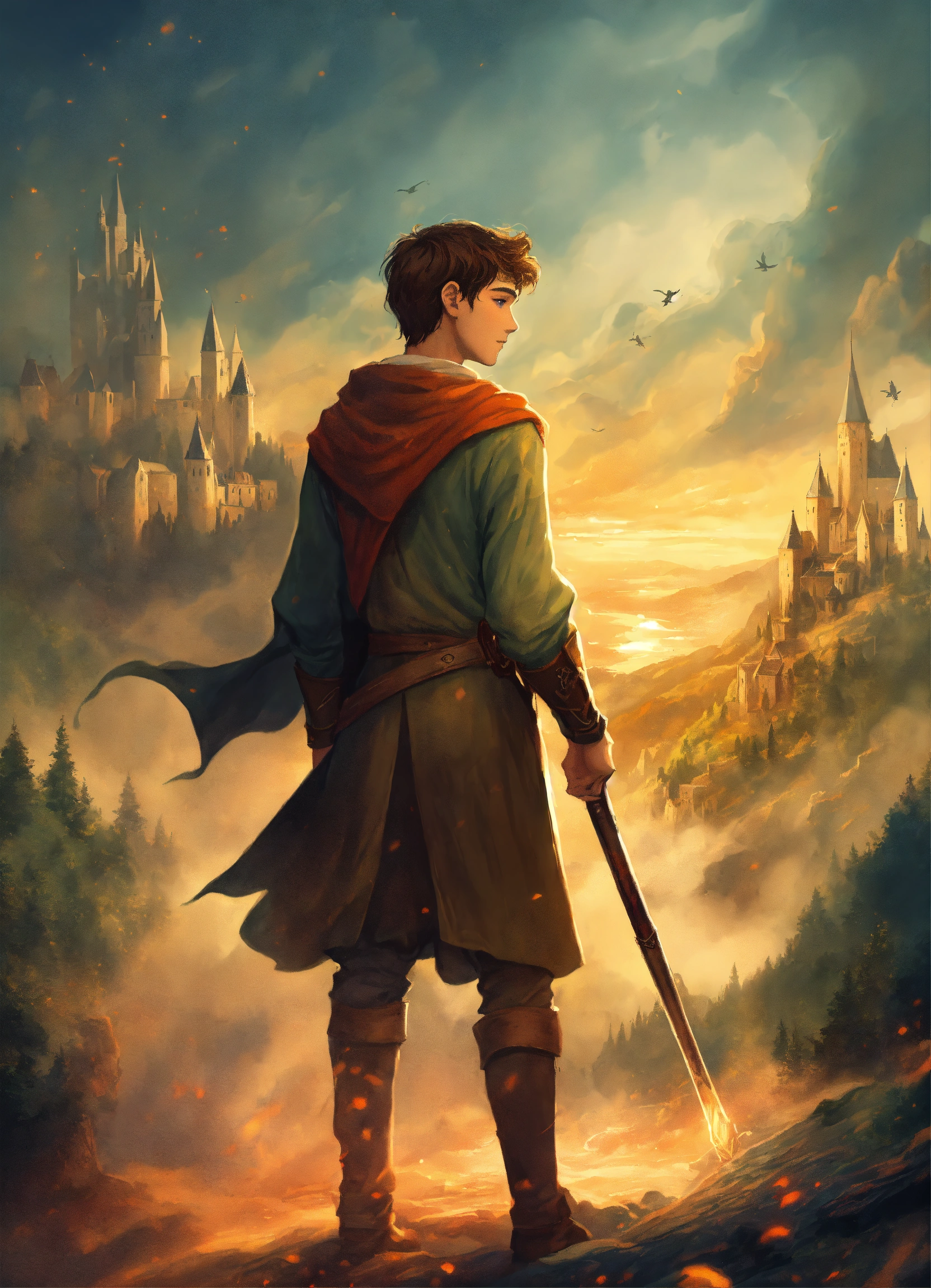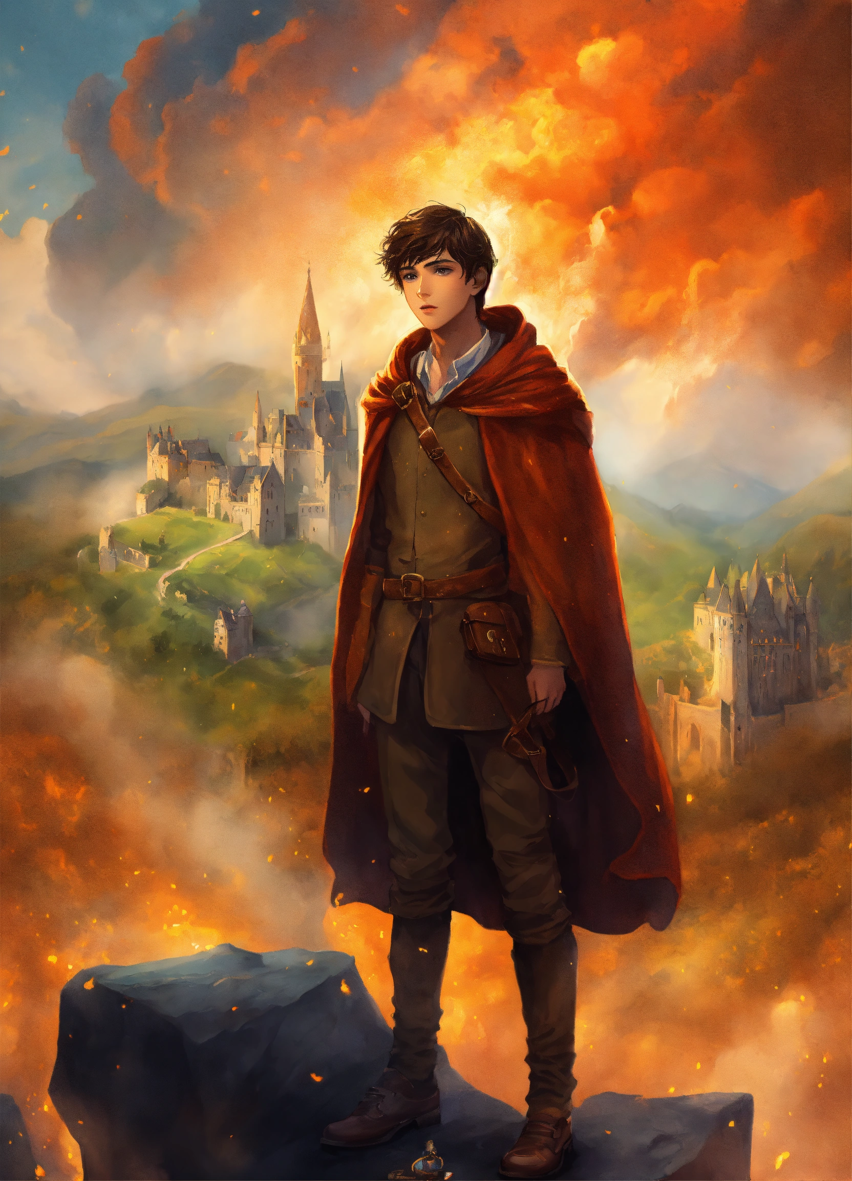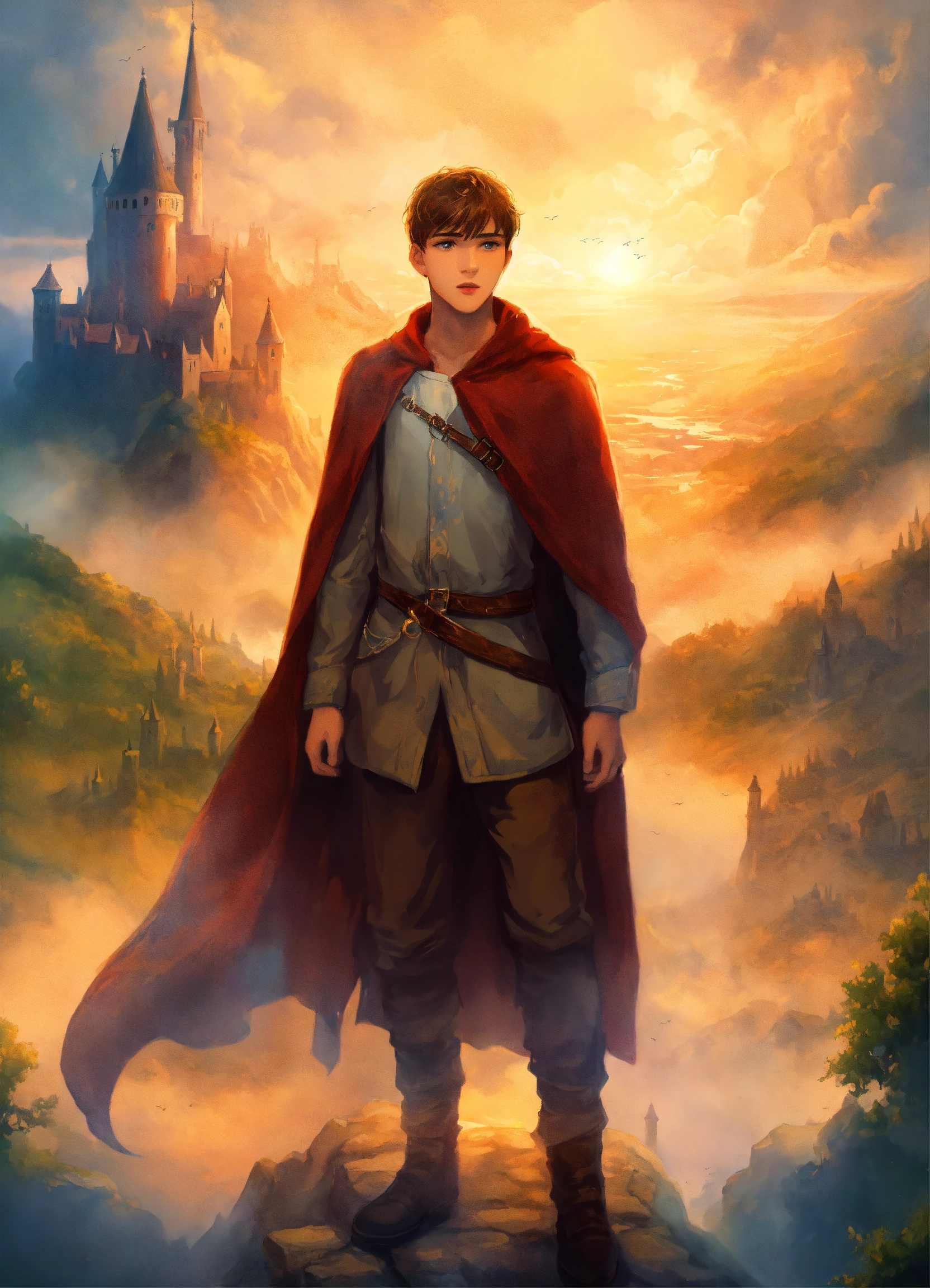 Create a beautiful cover illustrated paint, drawing paint art inspired by the cover art of jk rowling books a 15 years old young man standing surrounded by fogs, epic adventure, fantasy background design with effects, illustrated paint art, paint art, cartoon illustration, daylight, medieval, epic fantasy, surrounded by fogs, medieval, facing front, detailed face
