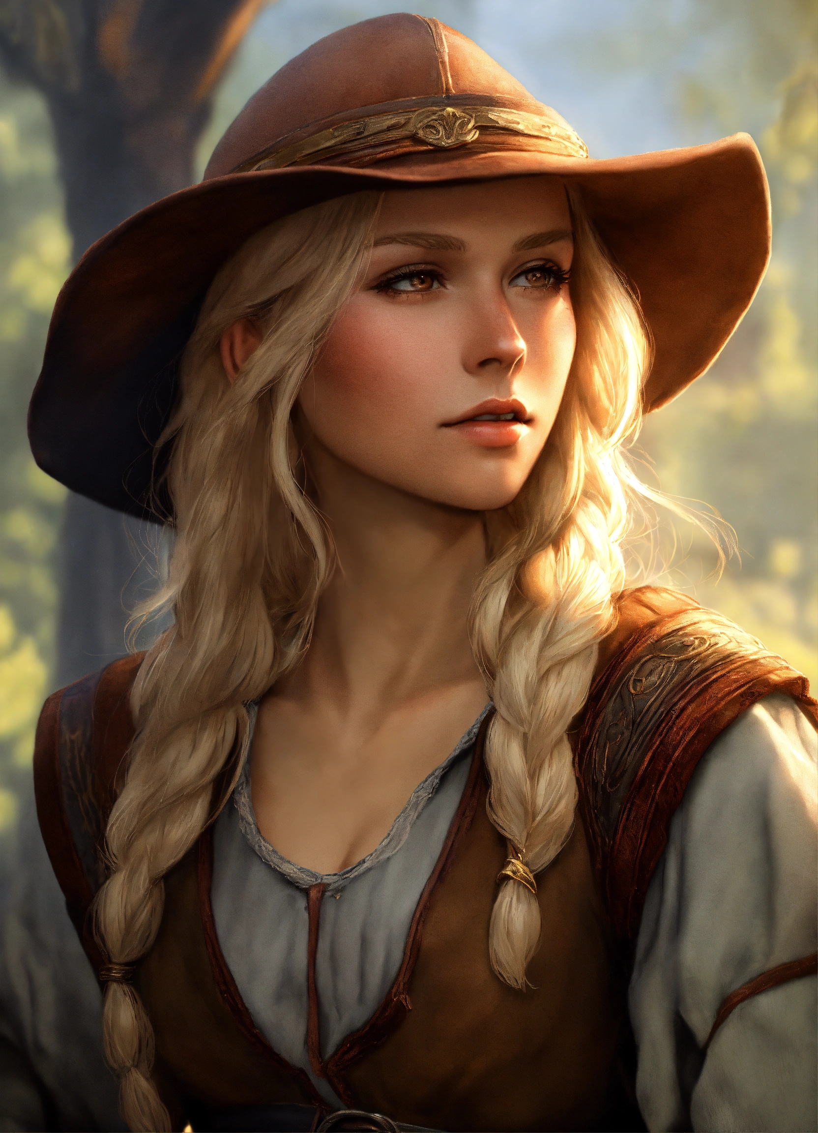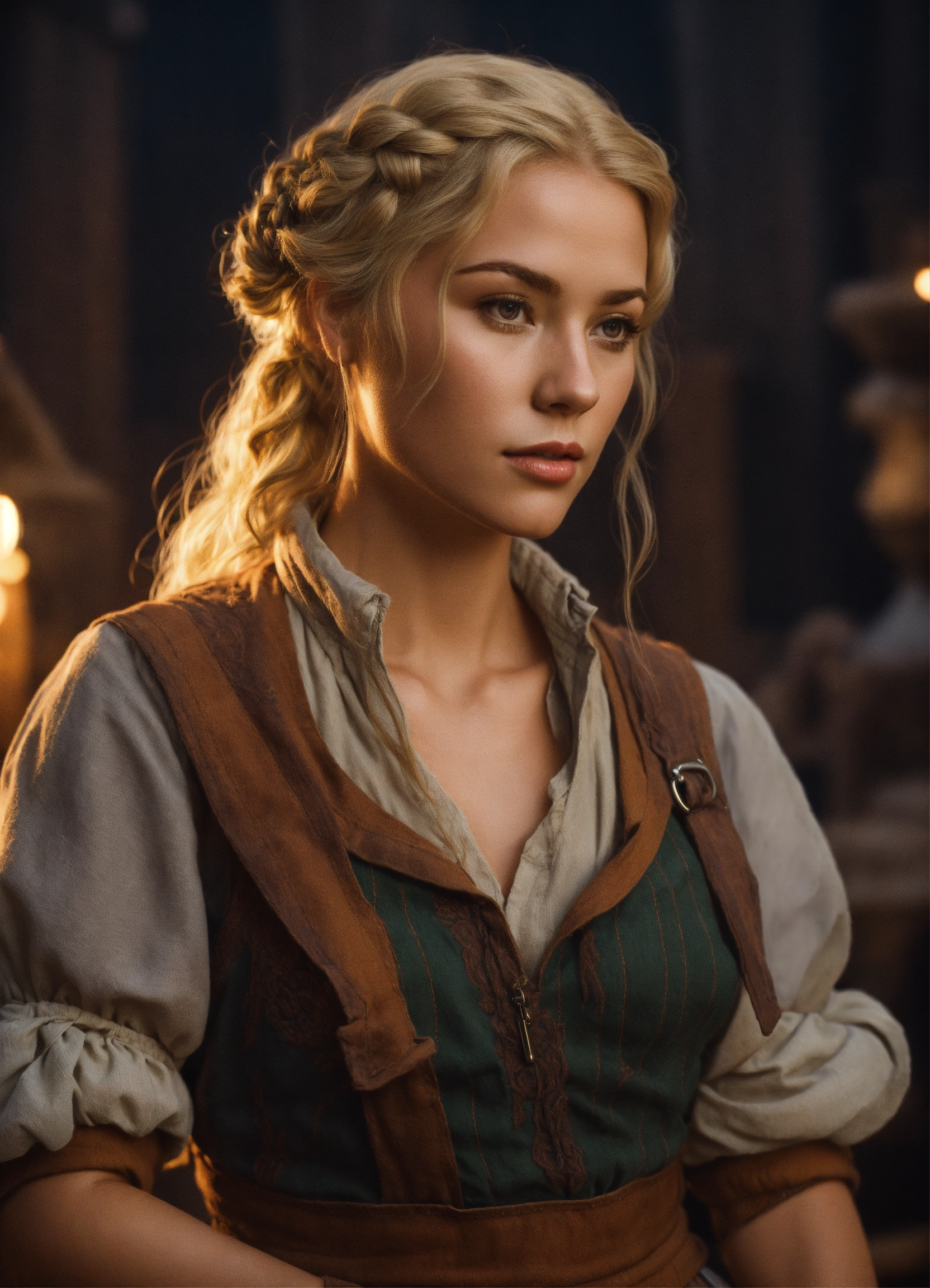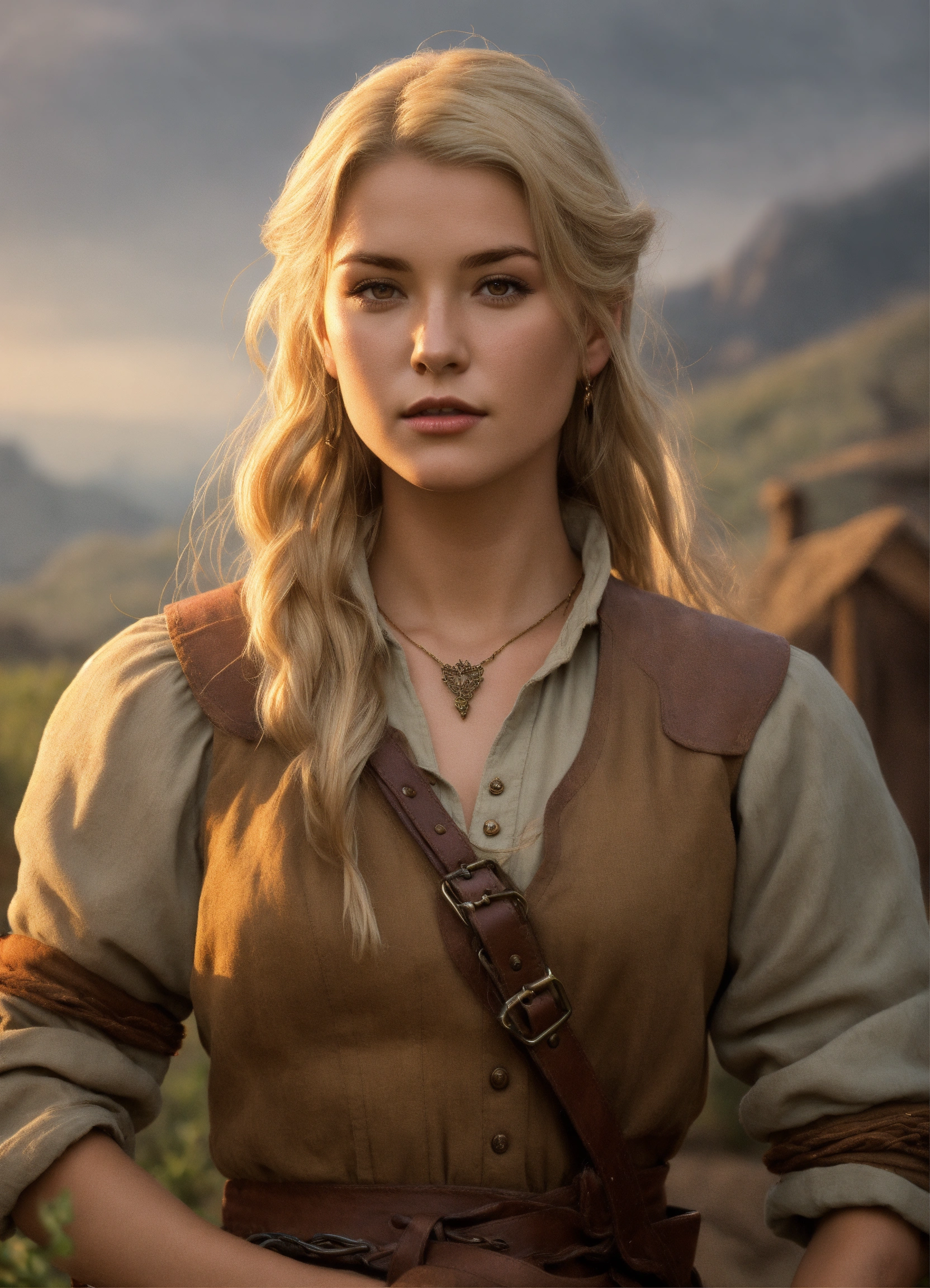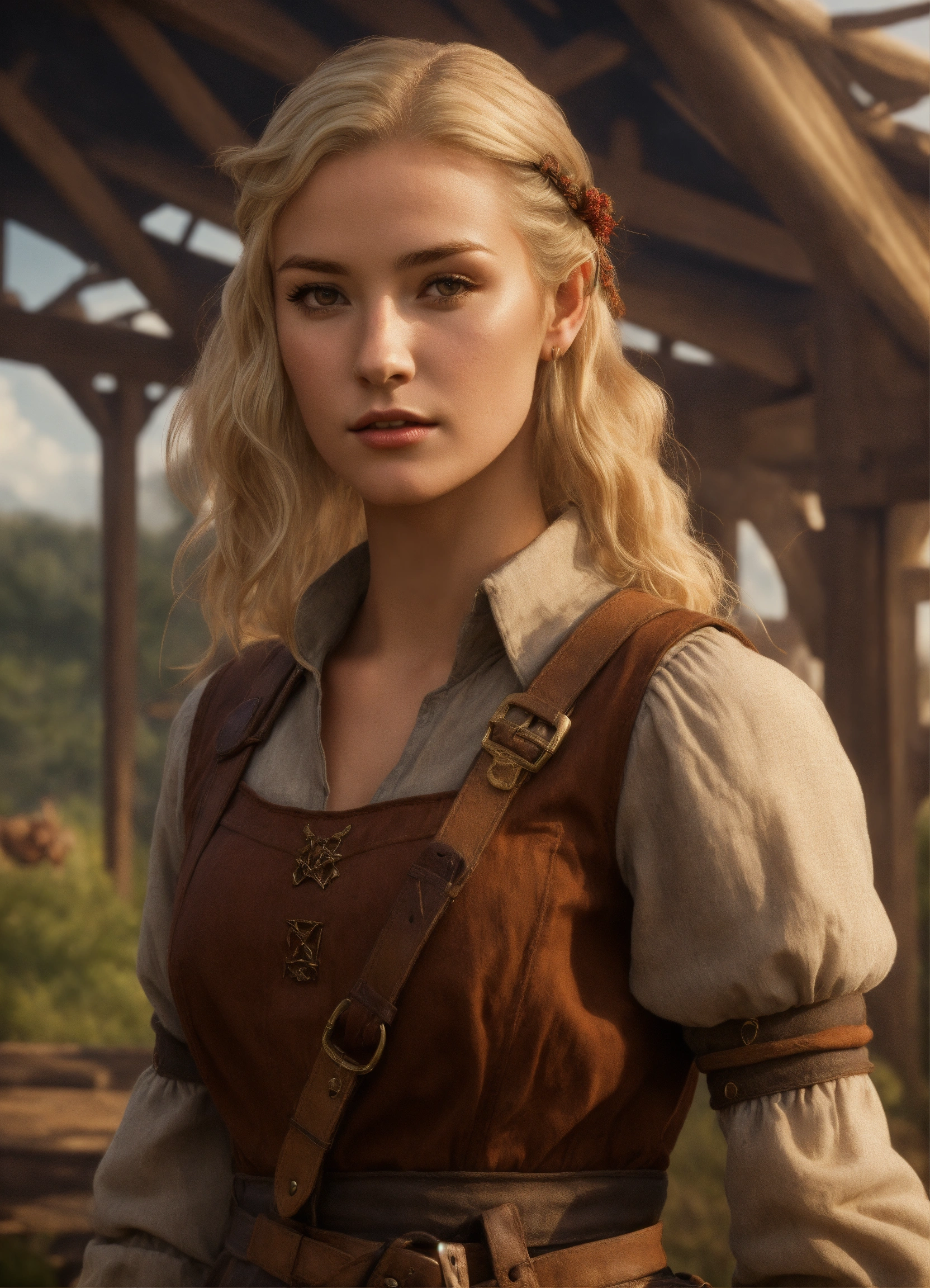 D&d, fantasy, cinematic. 40s human female with thin longer blonde hair and brown eyes. she wears farmer's clothes from the 15th century