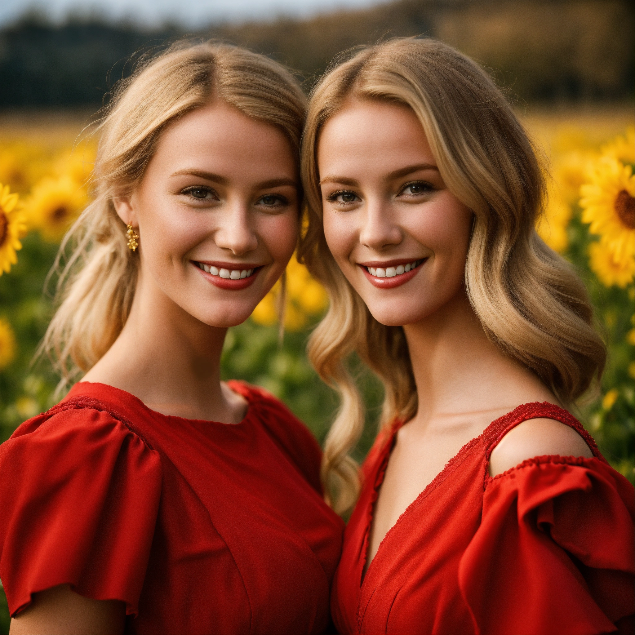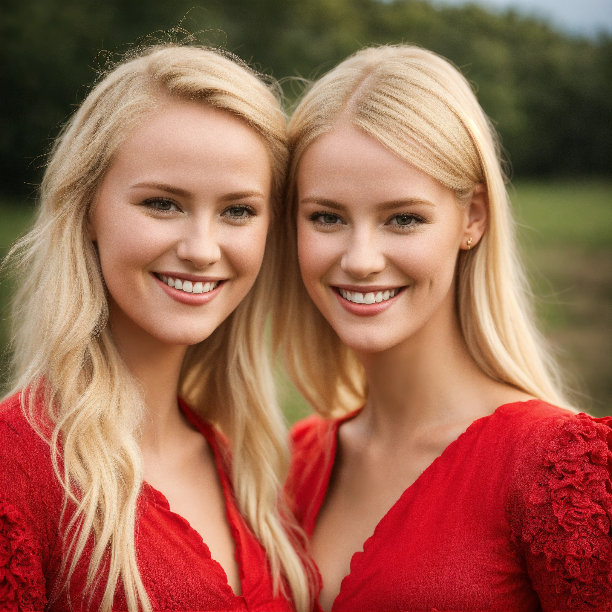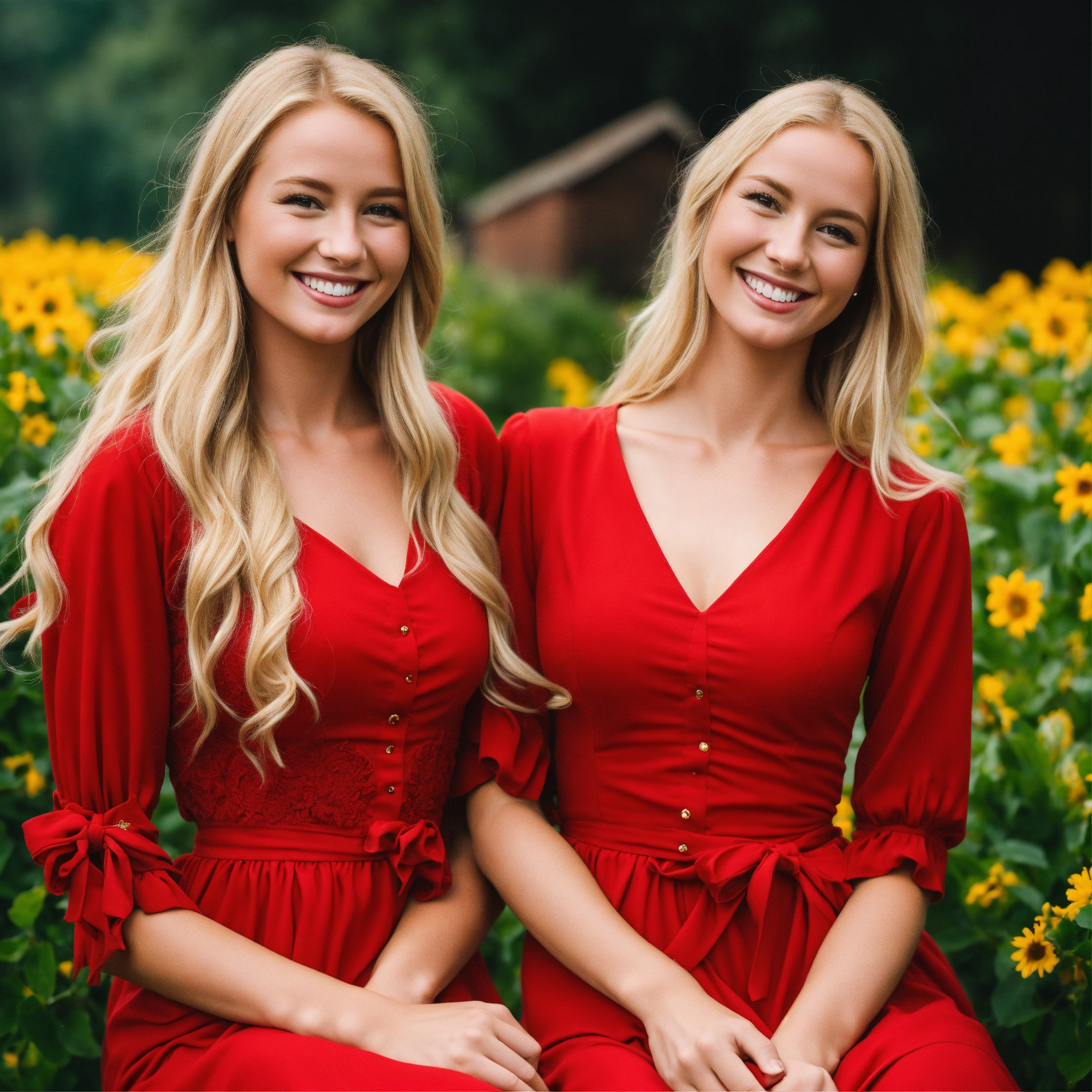 Two tall blonde beautiful belgian farm girls smiling wearing red dresses closeup