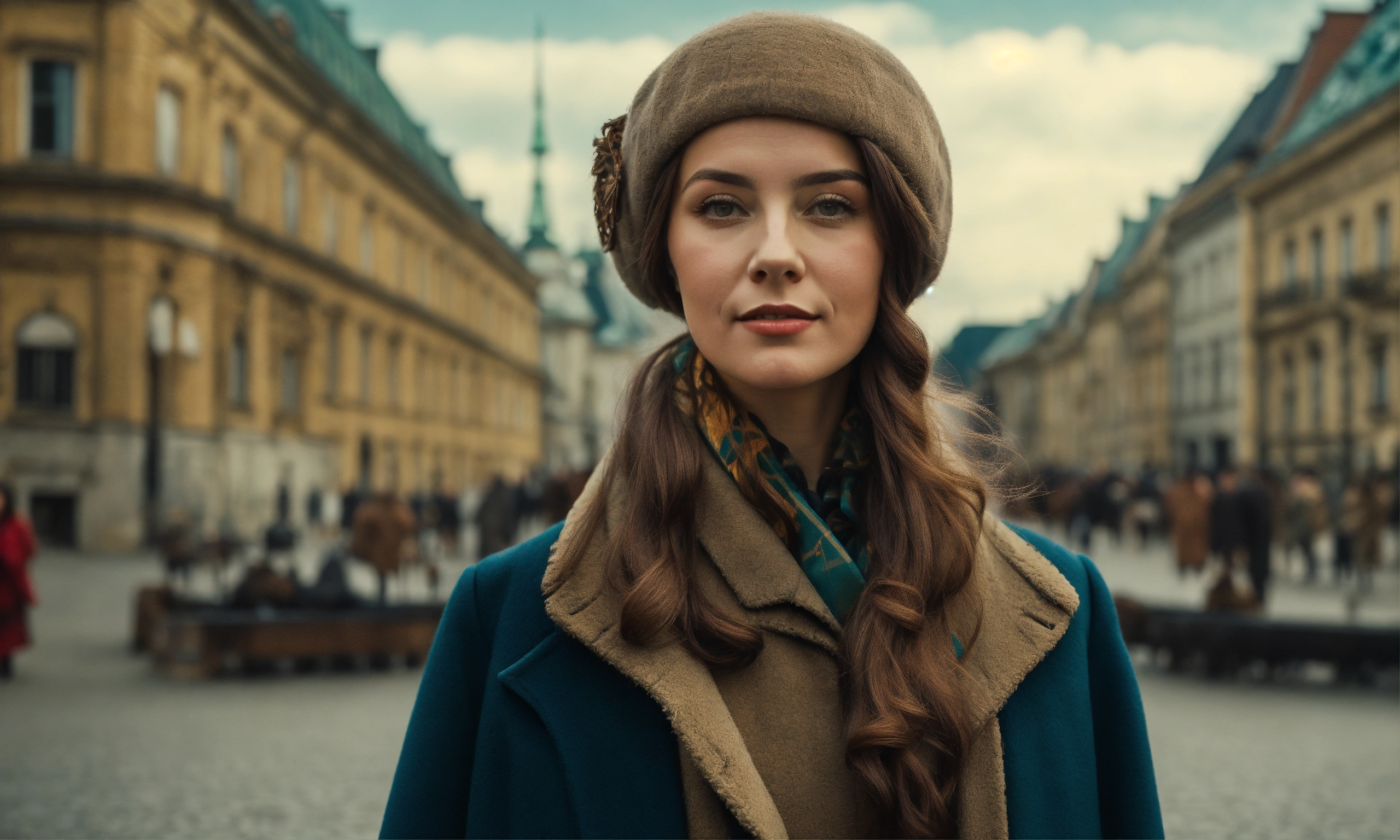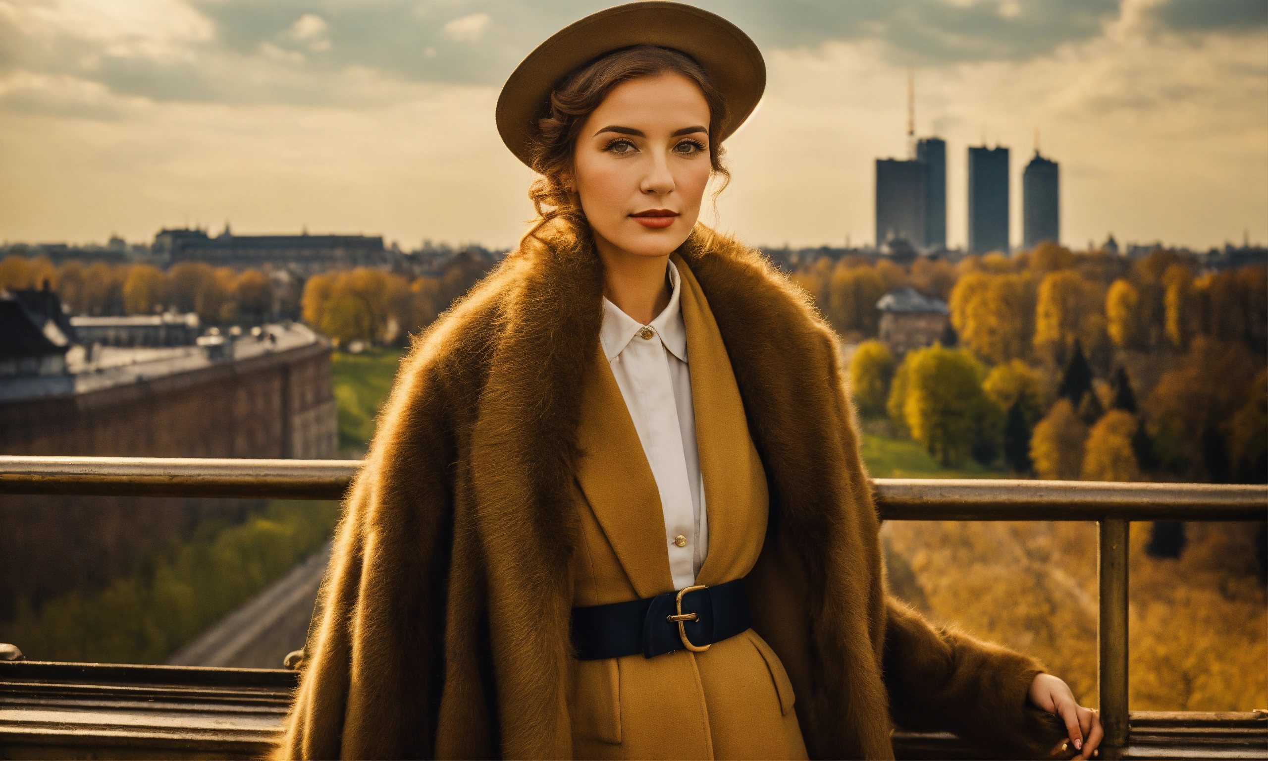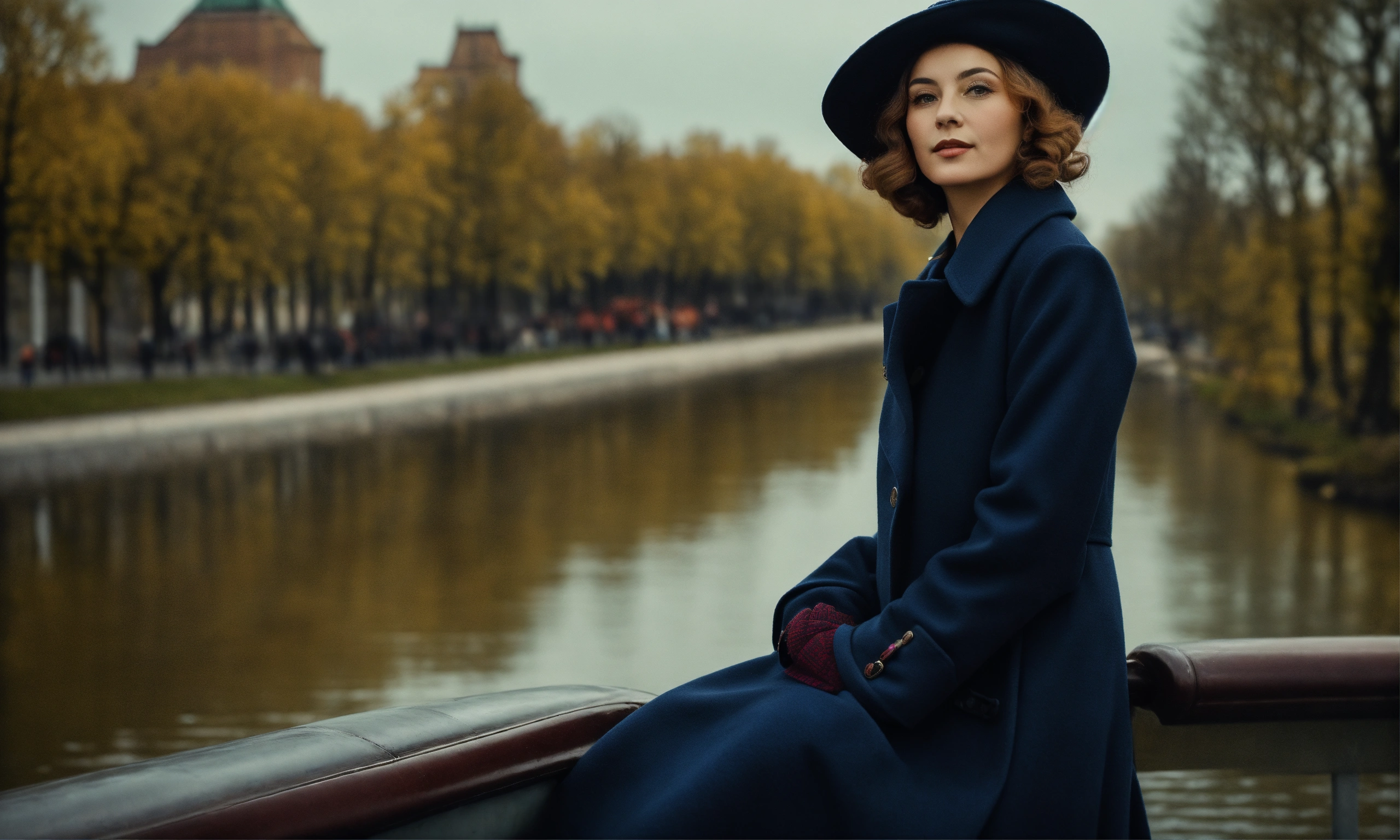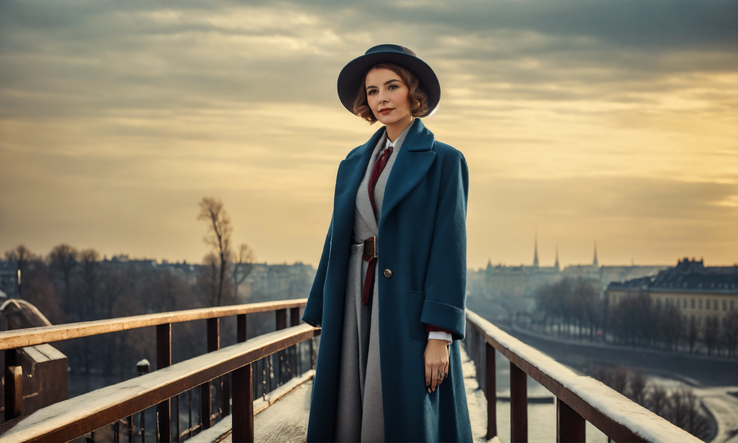 Retro warszawa 1920-1930, сute europian woman, on top of a rievier, looks at the camera at half height, retro style clothing long coat, the woman exudes kindness, calmness and ambition. she has a beard.