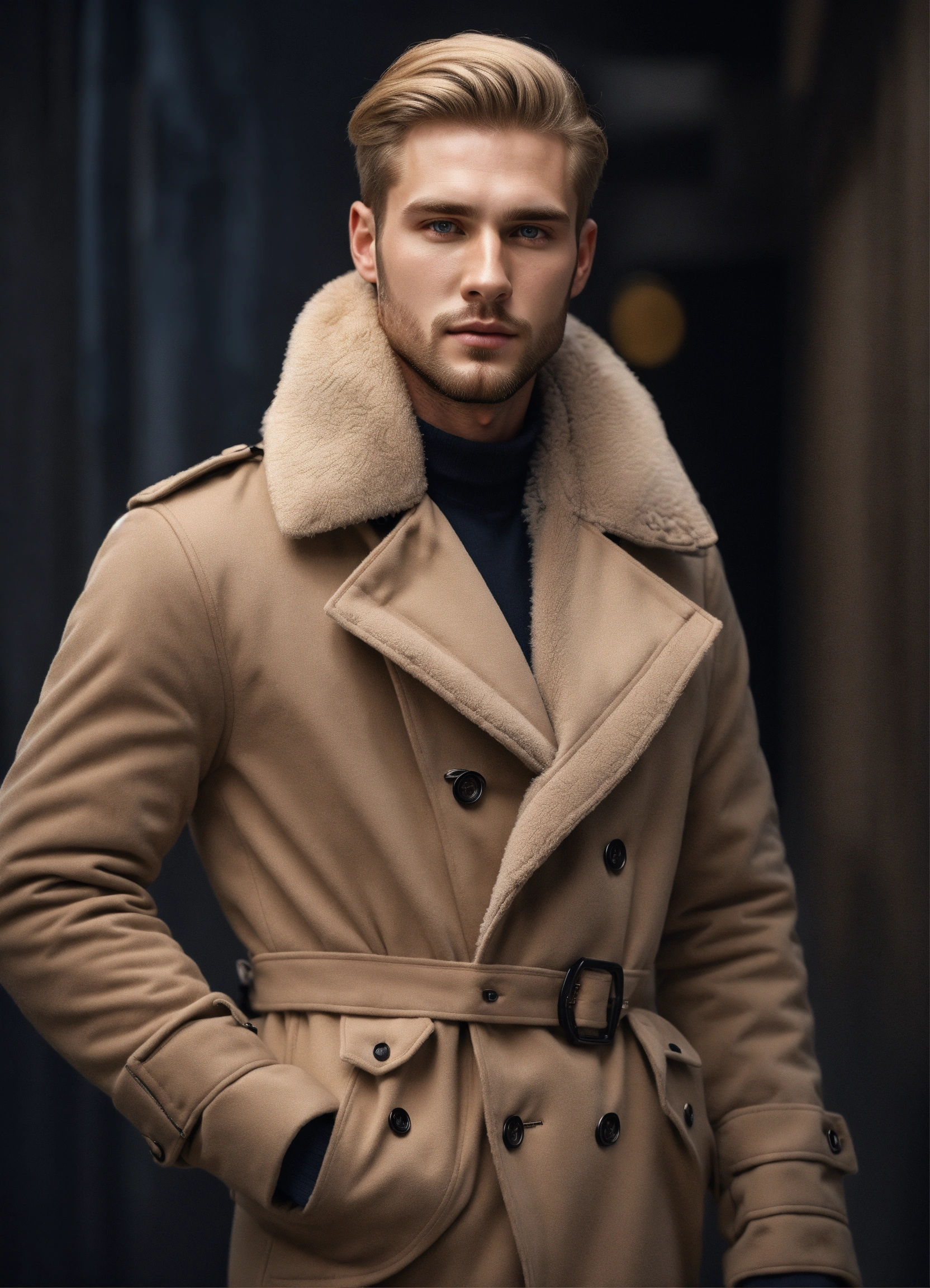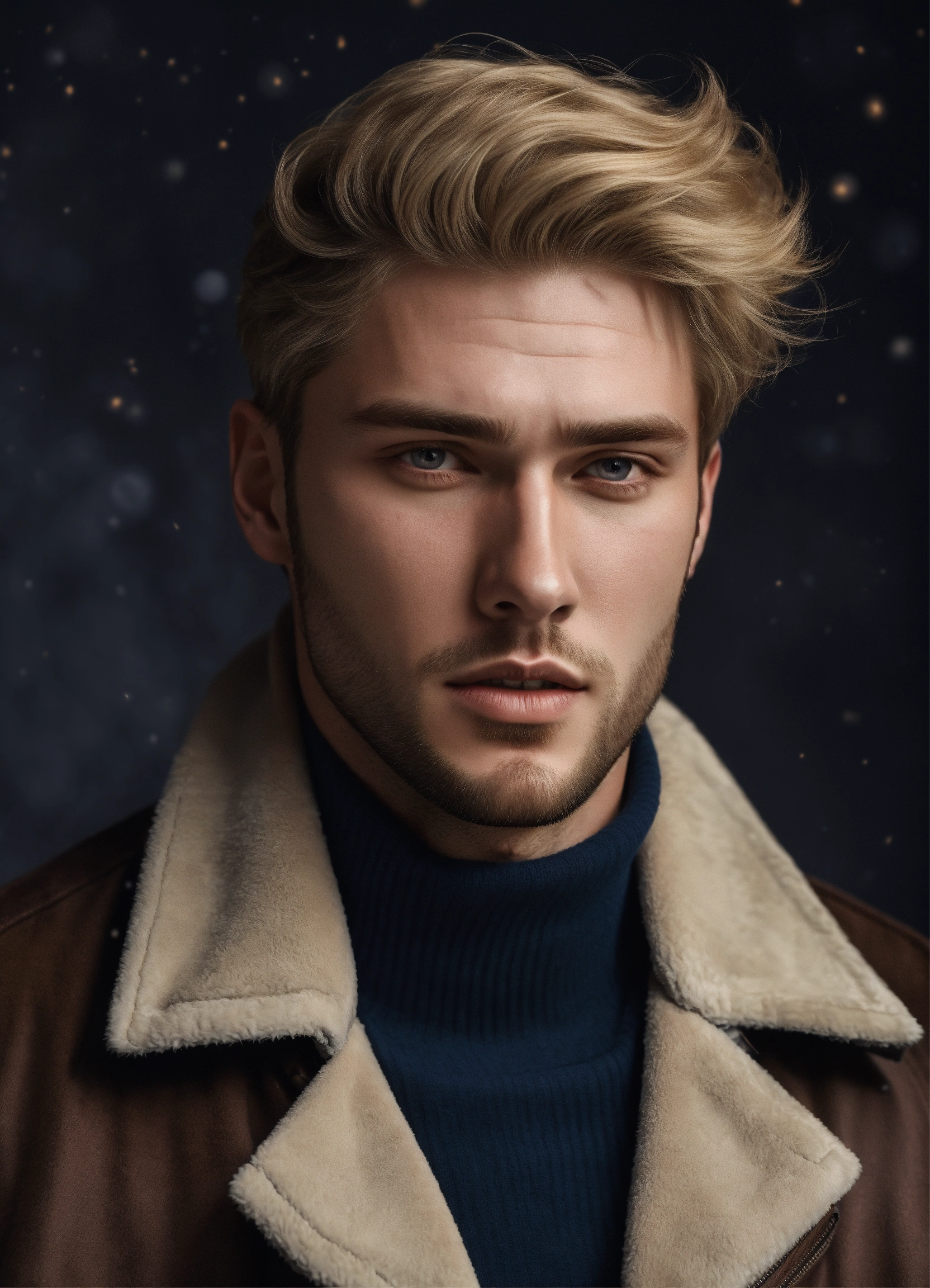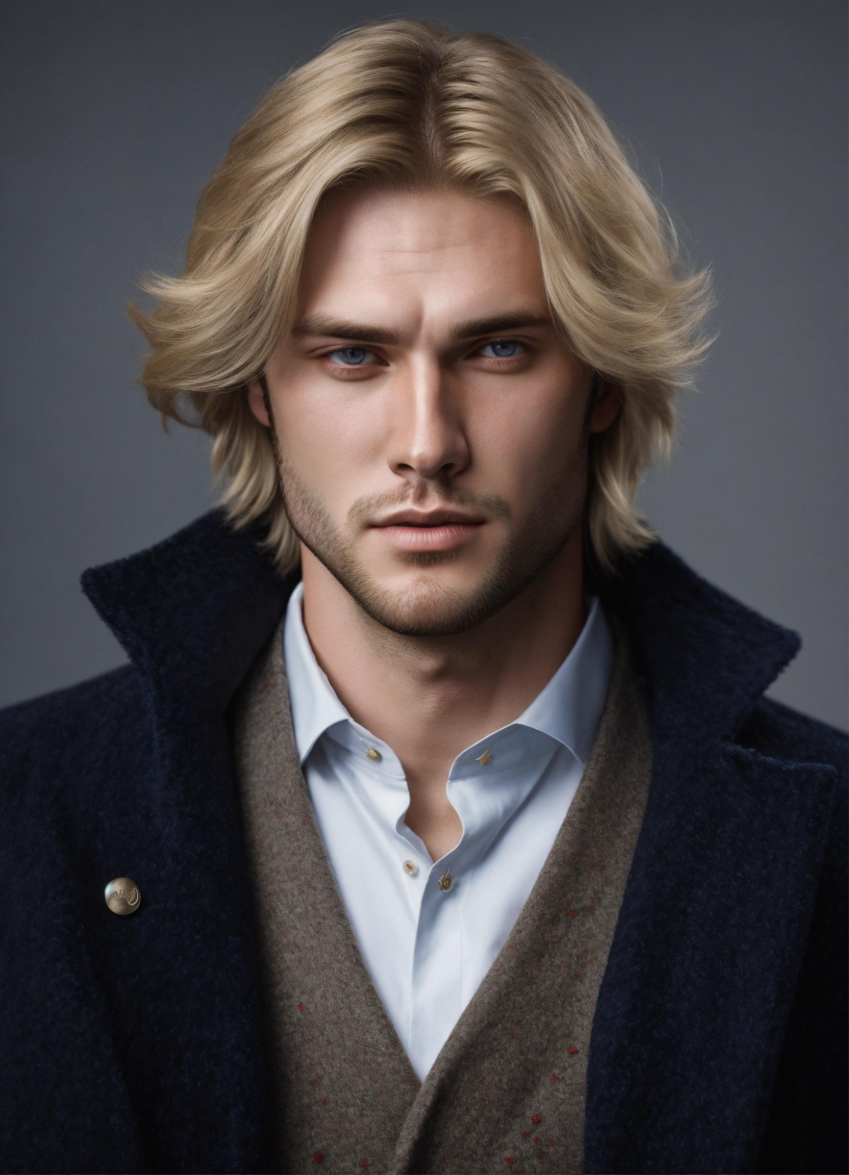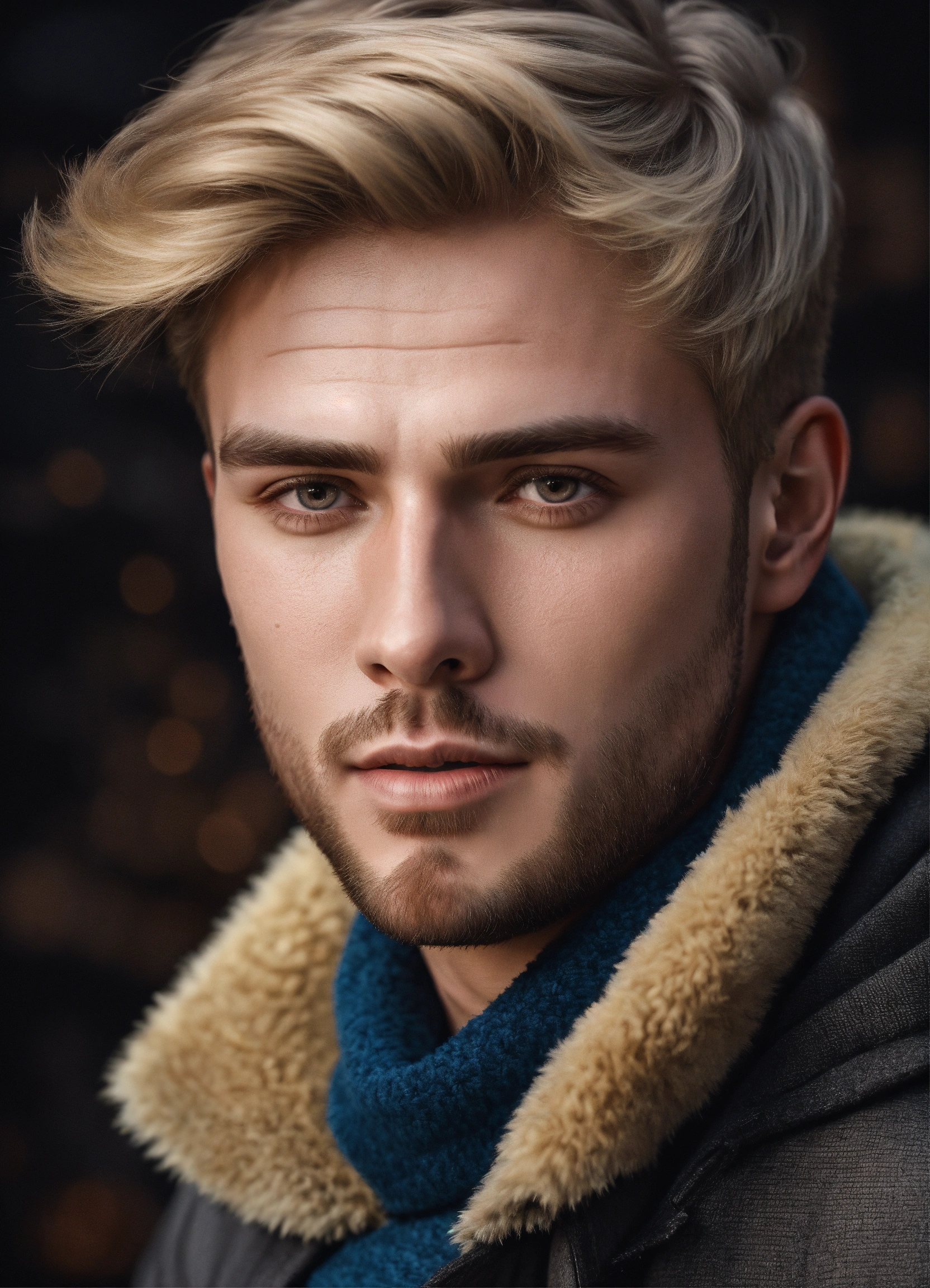 Ultra-realistic handsome 30-year-old man with blond straight hair, model with light gray eyes of russian origin, fashionable luxury winter clothes, dark background, photorealistic.