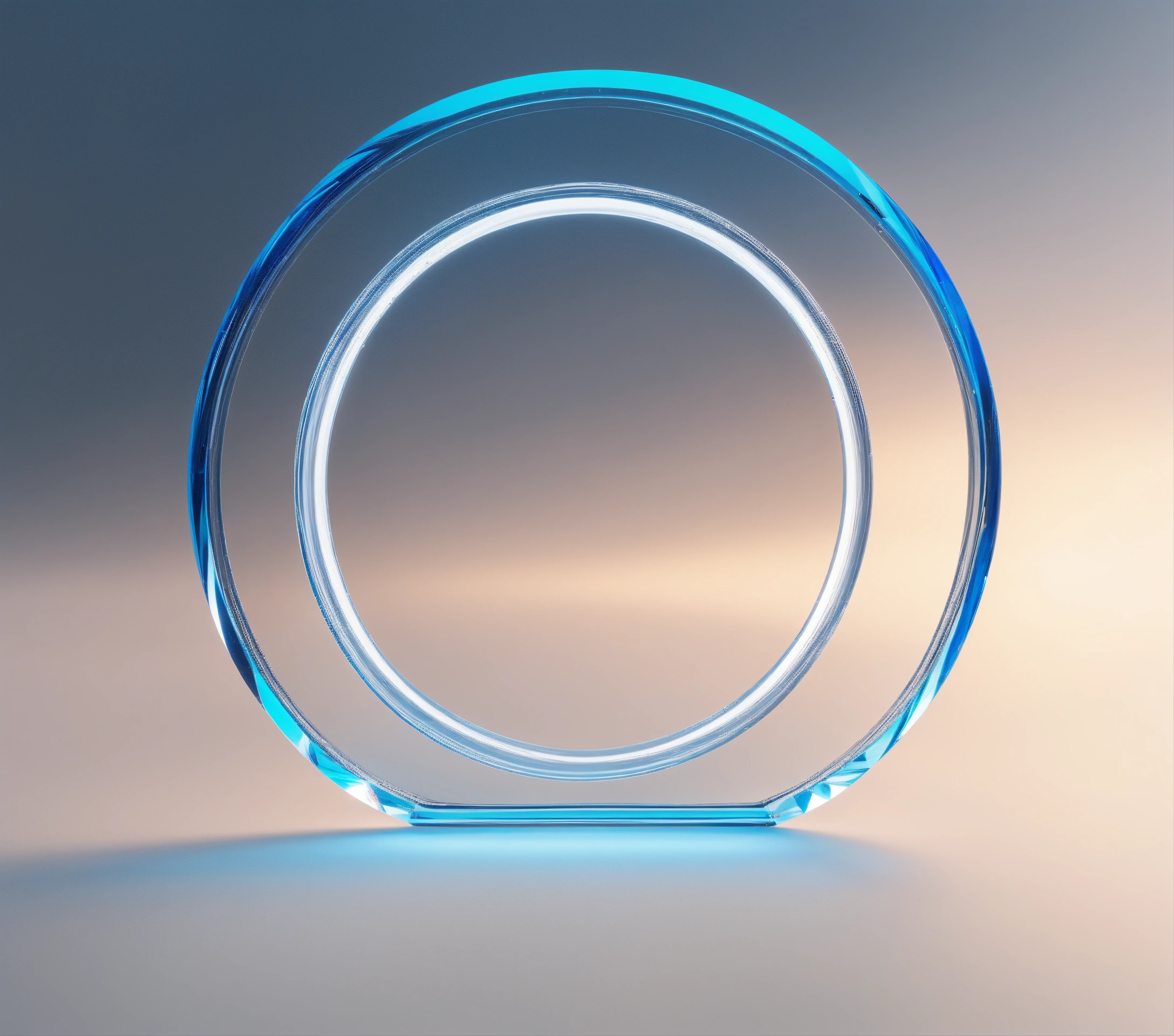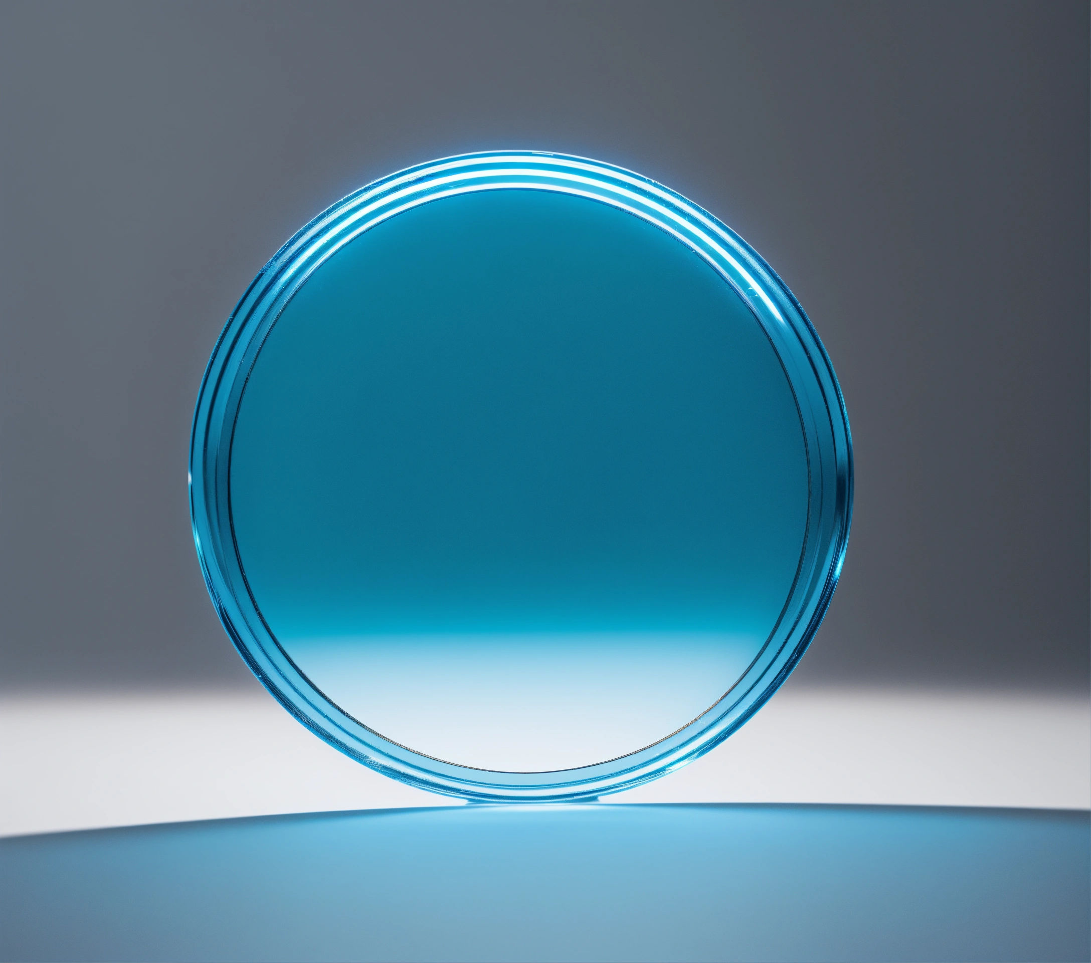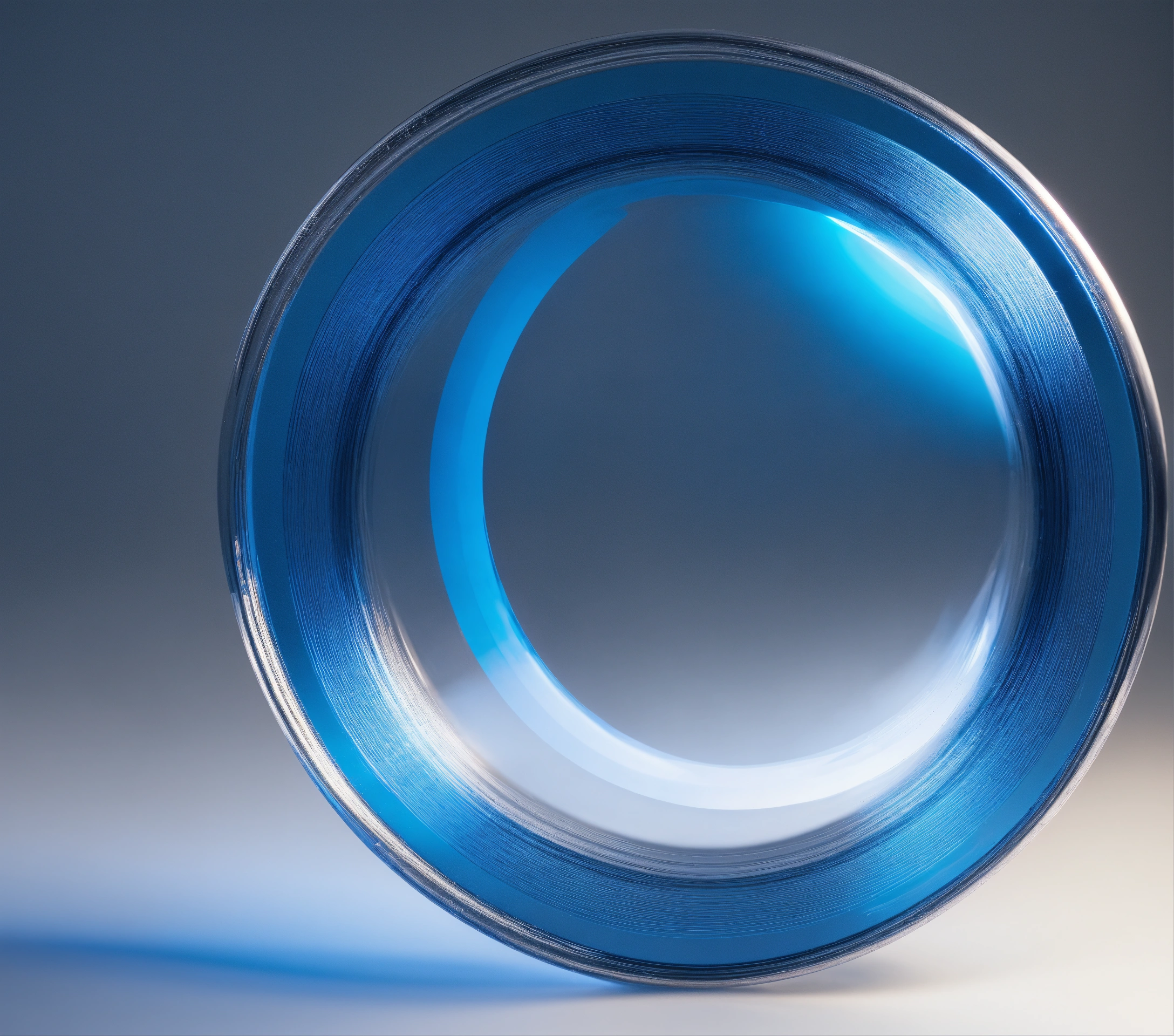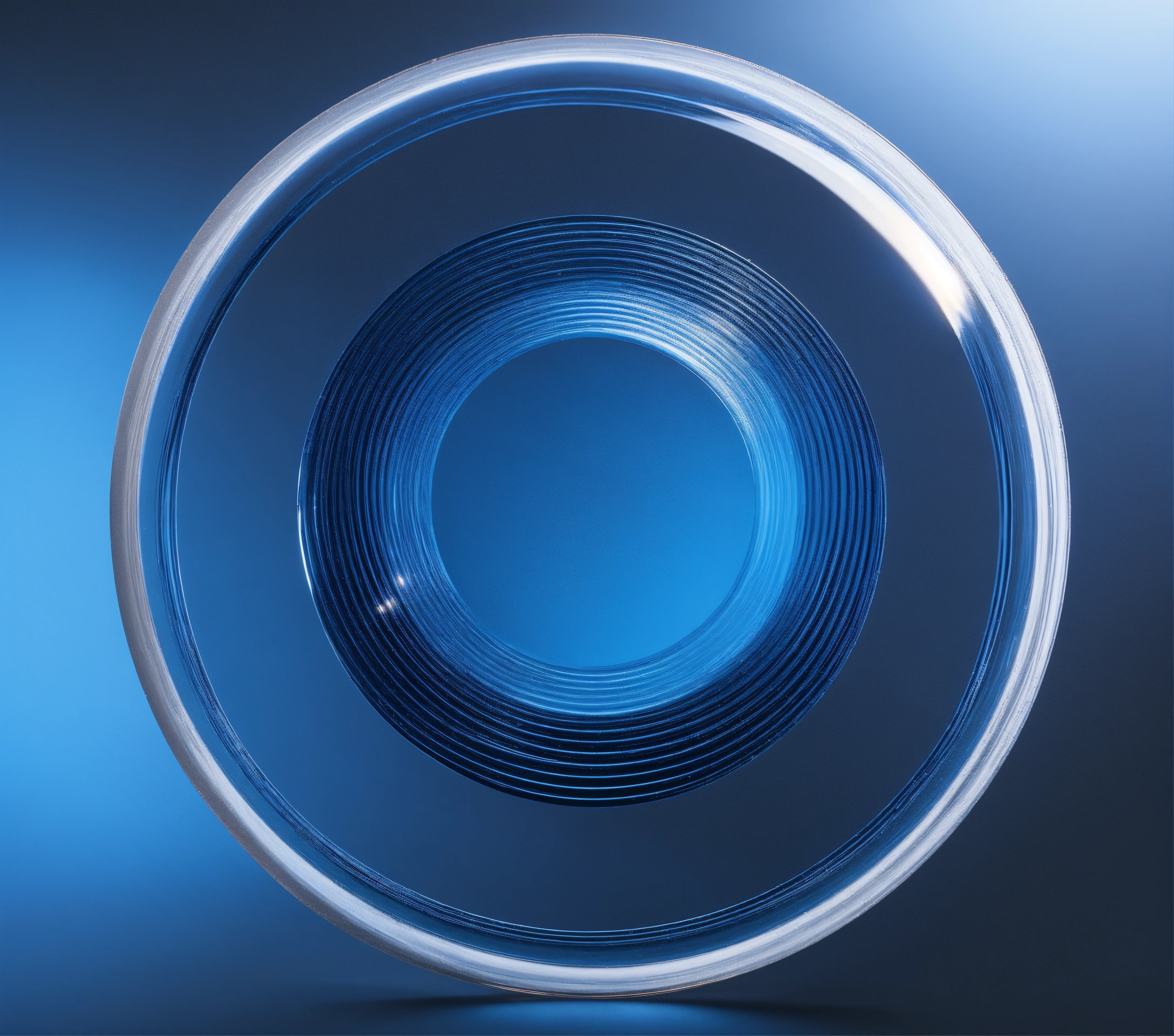 Optics glass thin circle shown from the side, illuminated blue, flay, transparent, clear, white background, minimals style, 8k