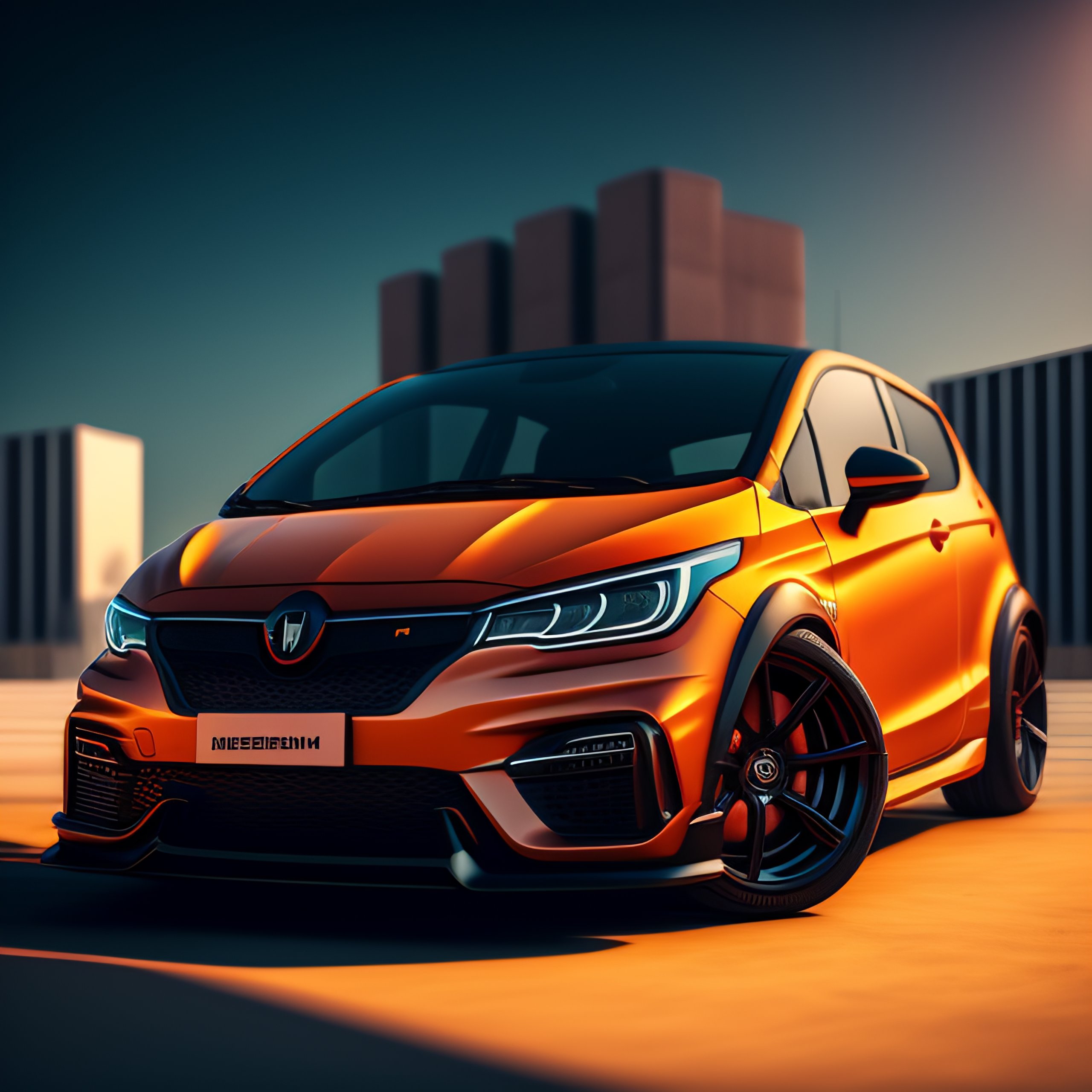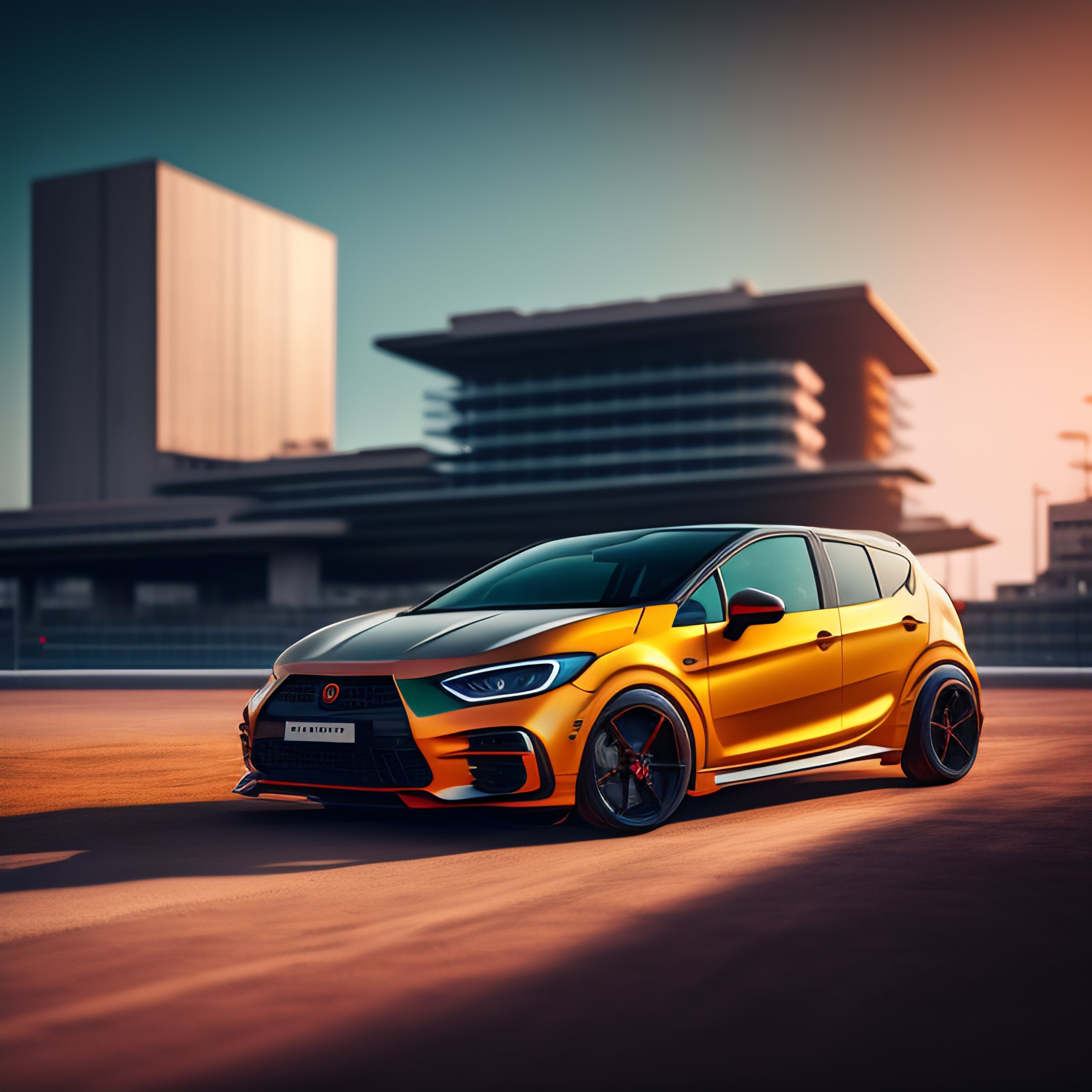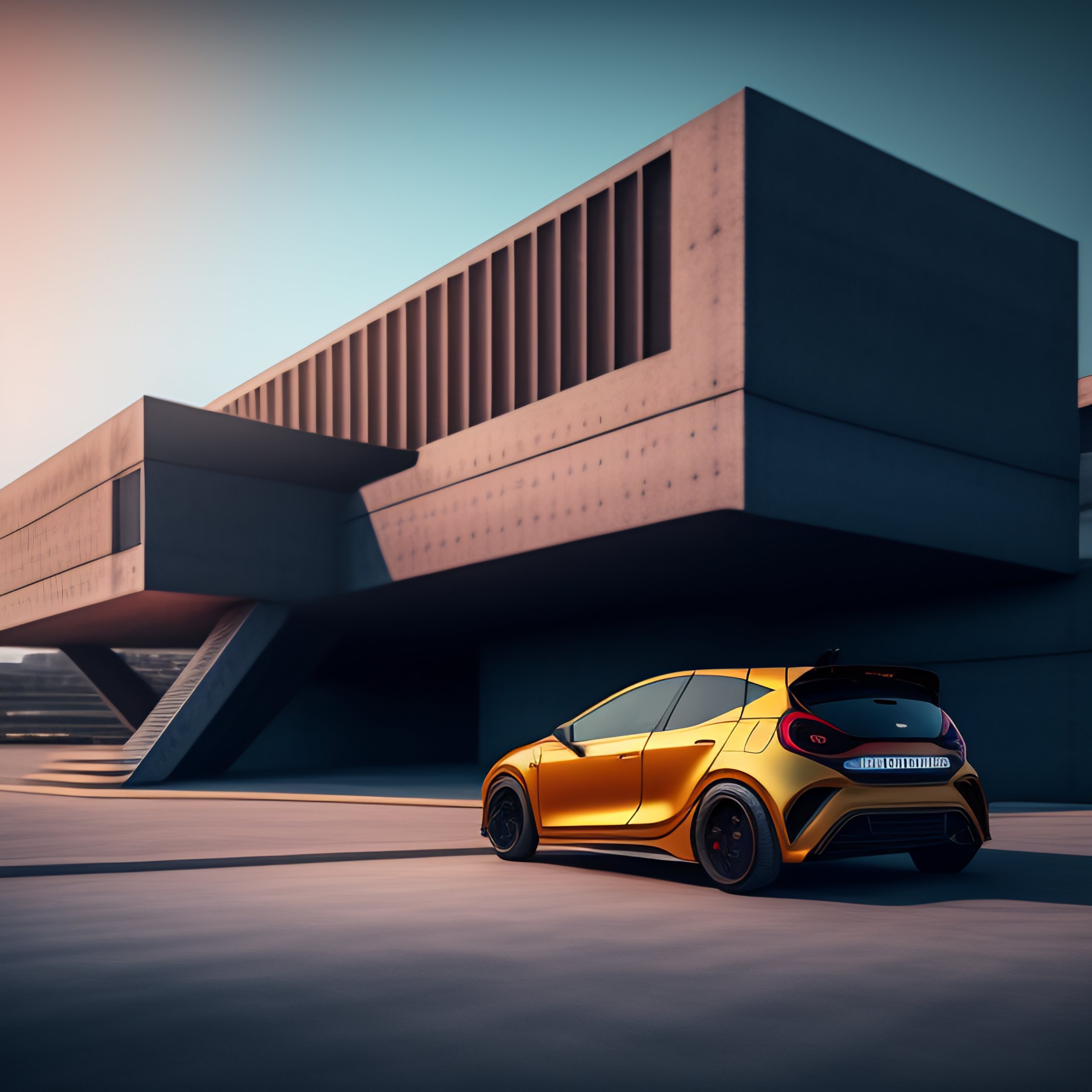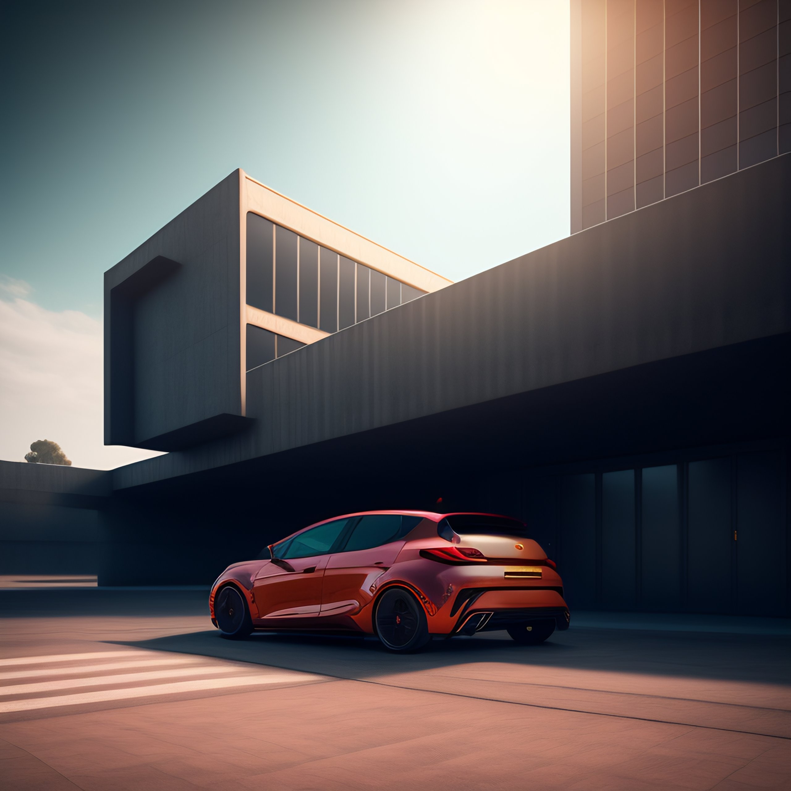Hot hatch car, brutalist building in background, by neil blevins, cinematic lighting, raytracing, 8 k, octane render