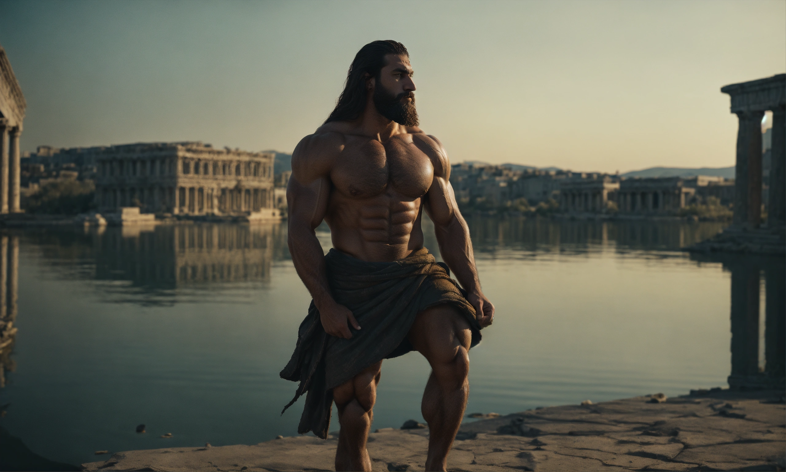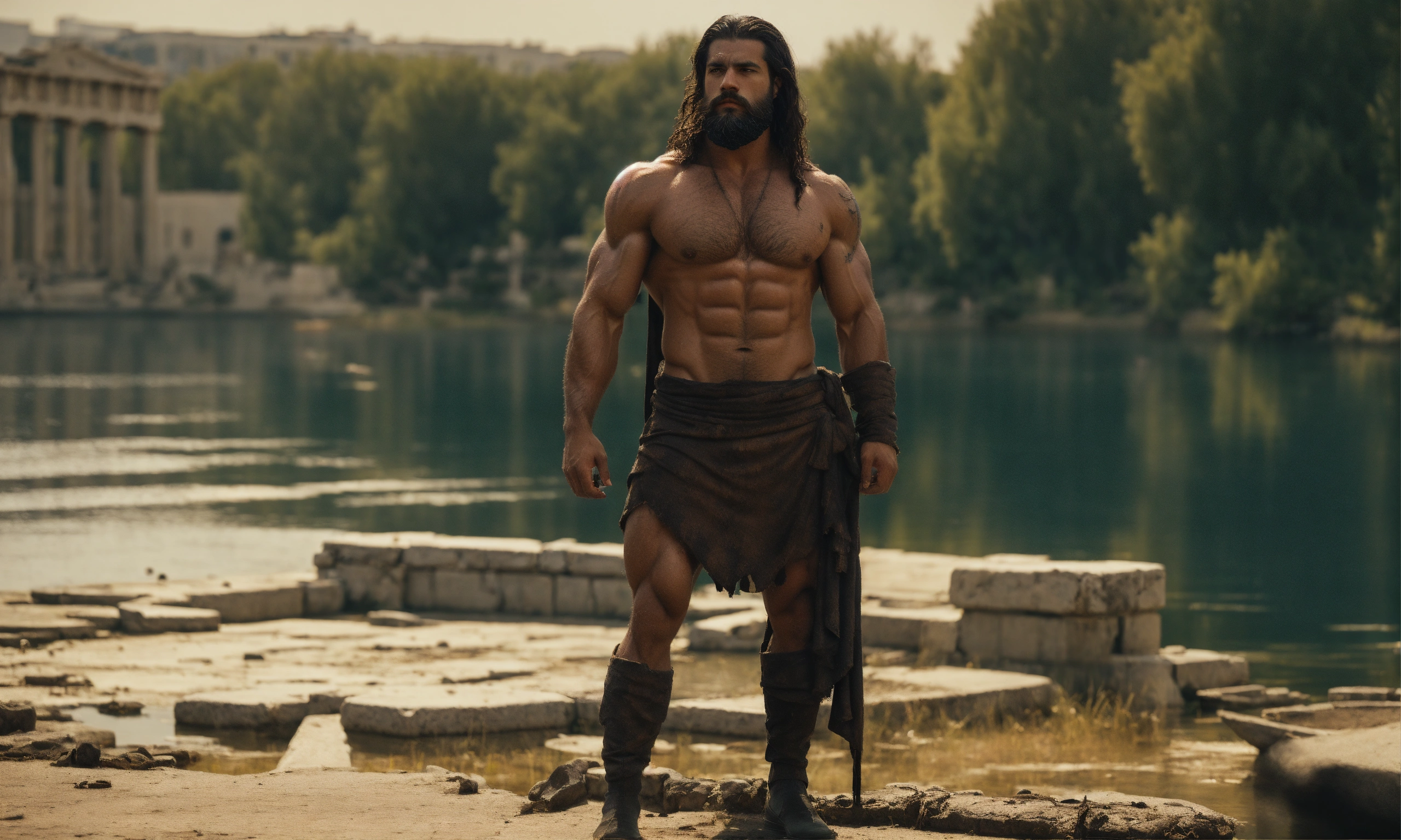 A muscular statue of a strong greek man with a beard and scars, long hair, abandoned city, black details, soul becomes a tranquil lake that reflects inner strength." abandoned city setting and surrounded by people 8k engine, medium shot, cinematography --ar 916
