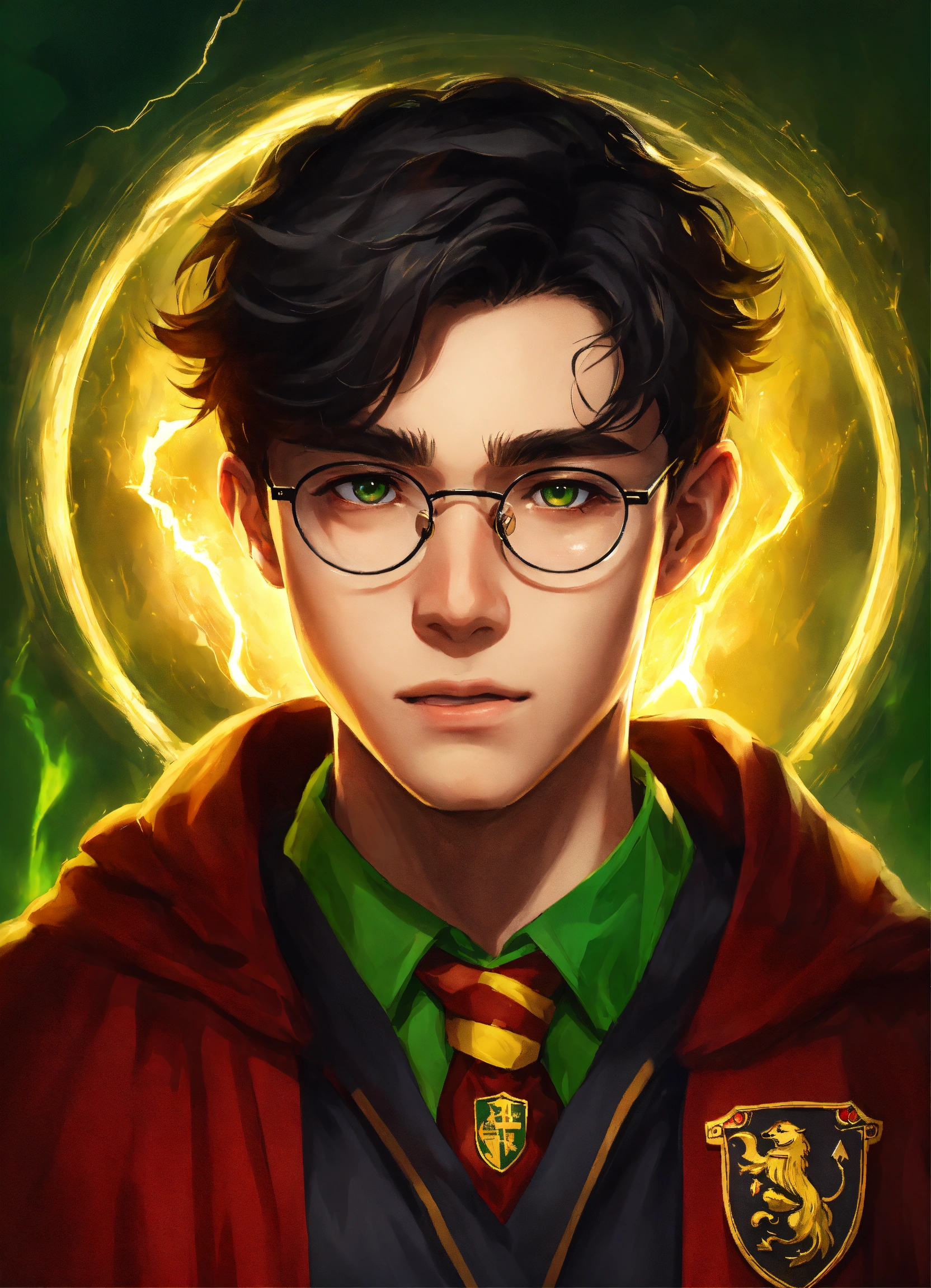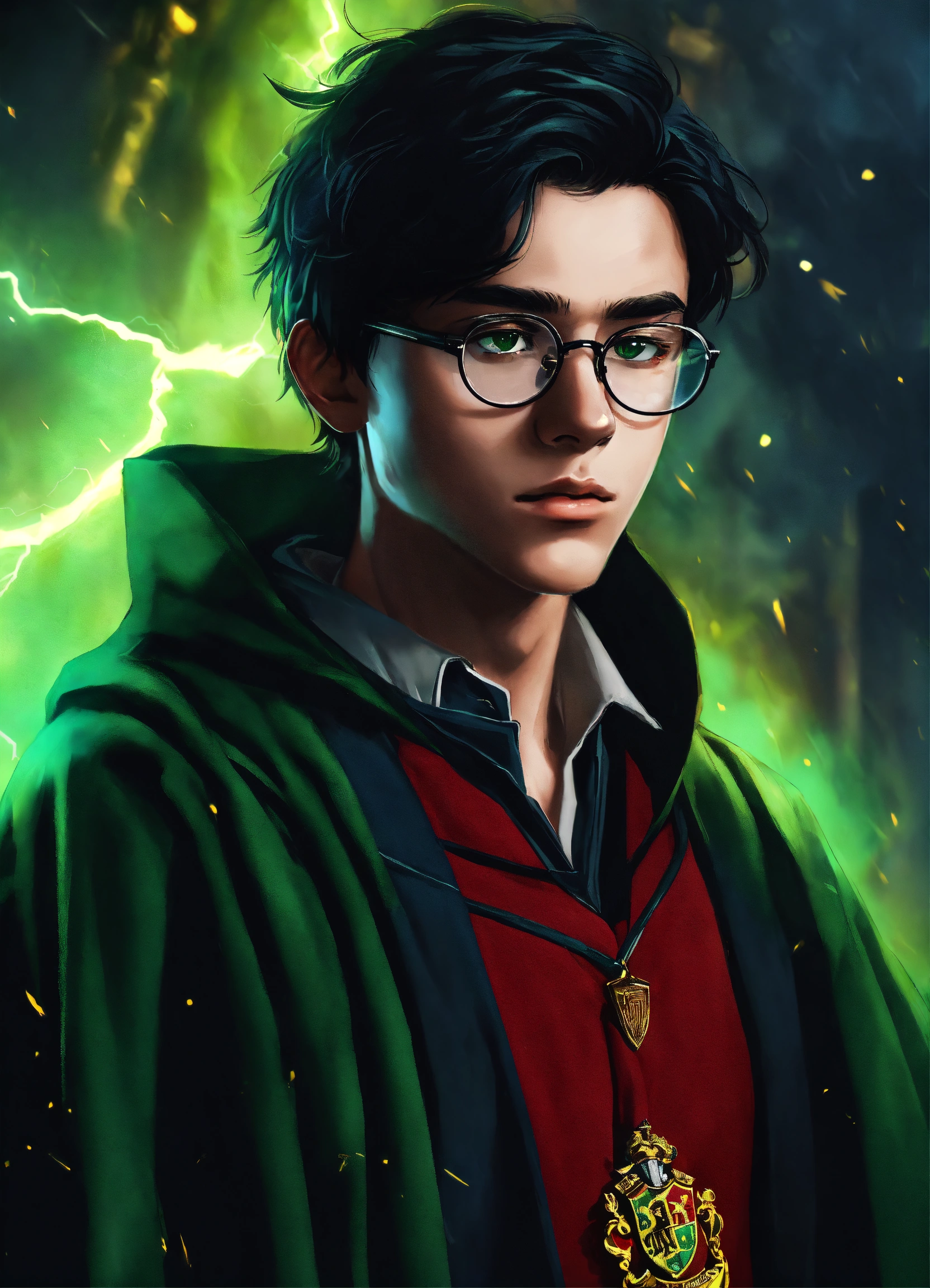 17-year-old male, untidy black hair, bright green eyes, thin face, round rimmed glasses, lightning scar on his forehead, gryffindor robes