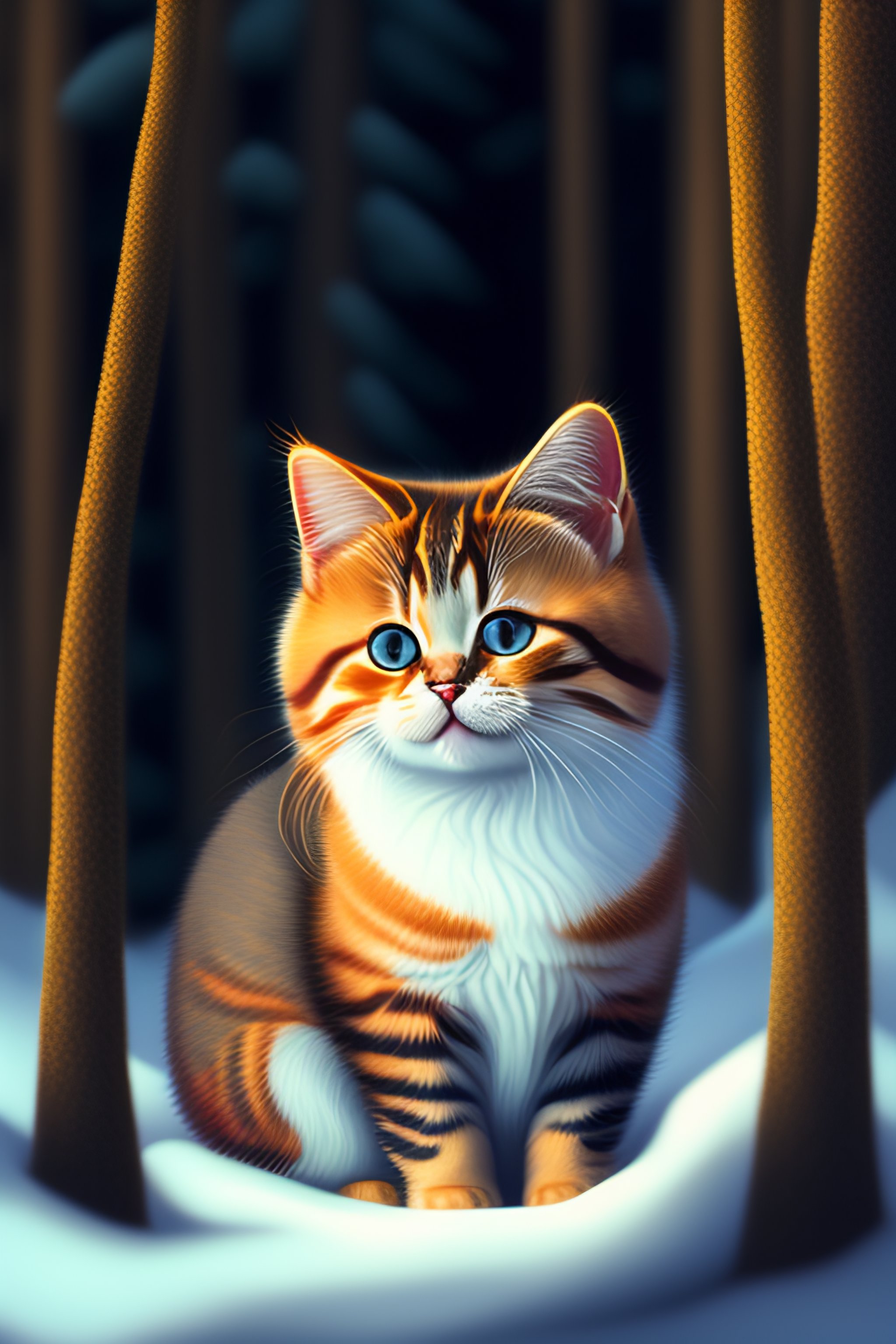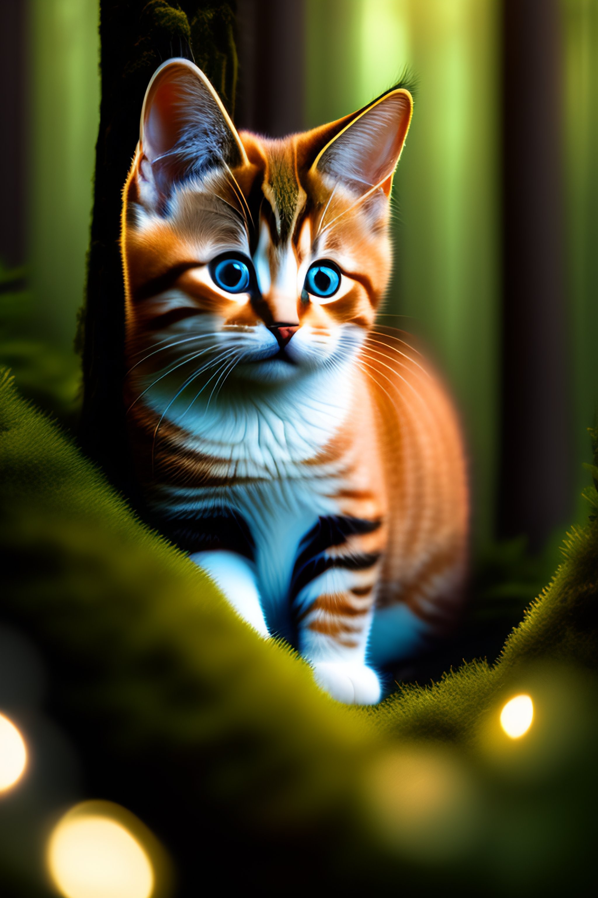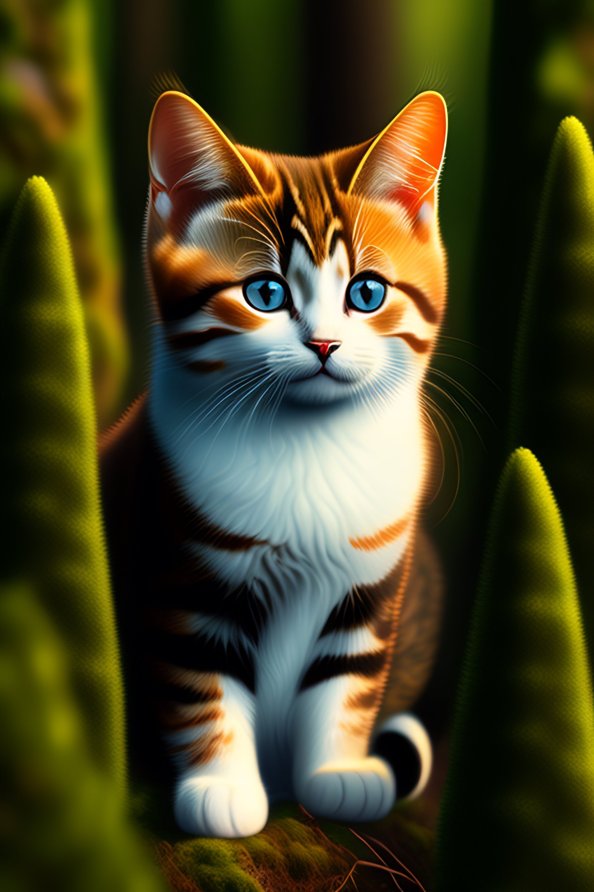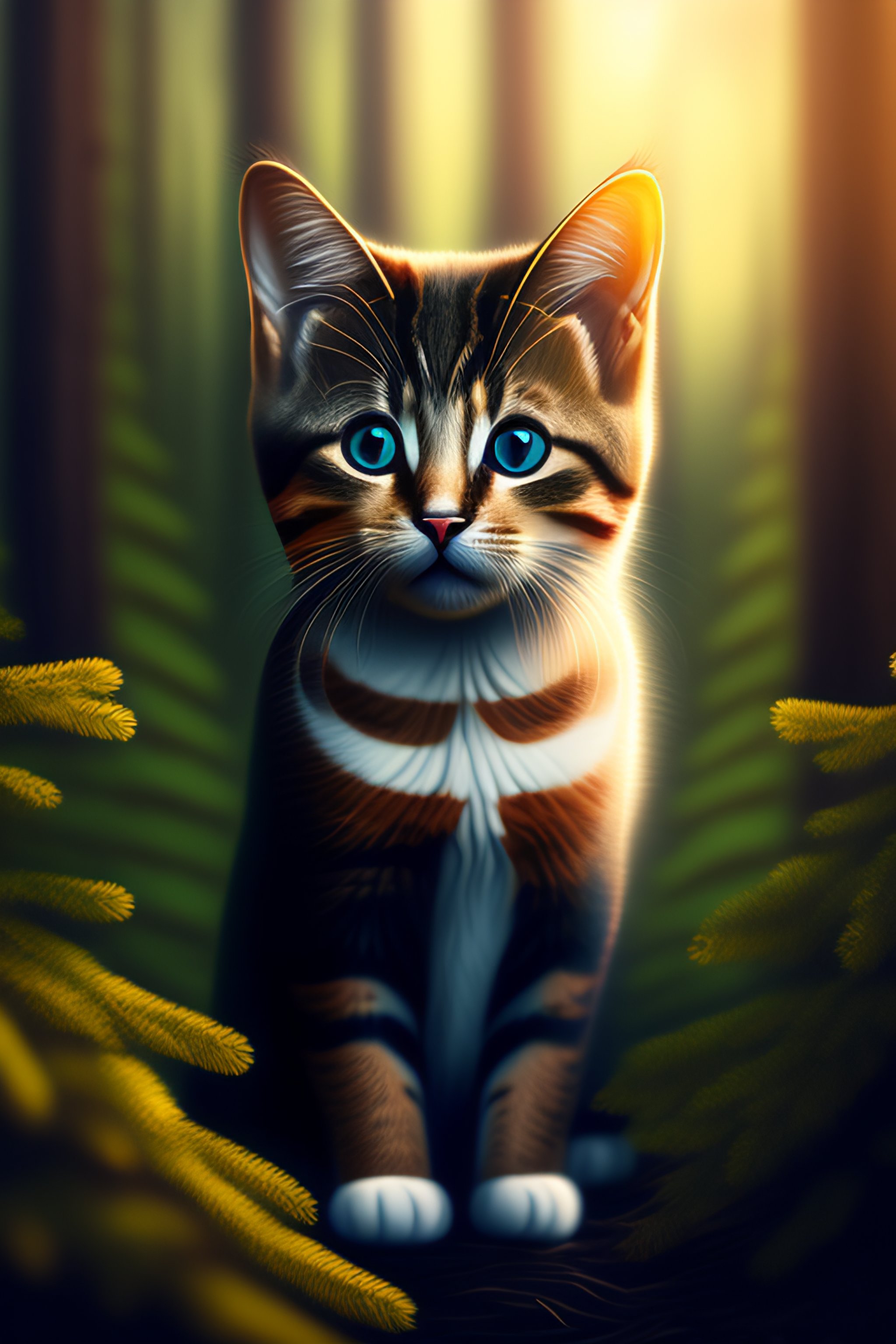 Small cute cat with big sad eyes in a spruce forest in the evening