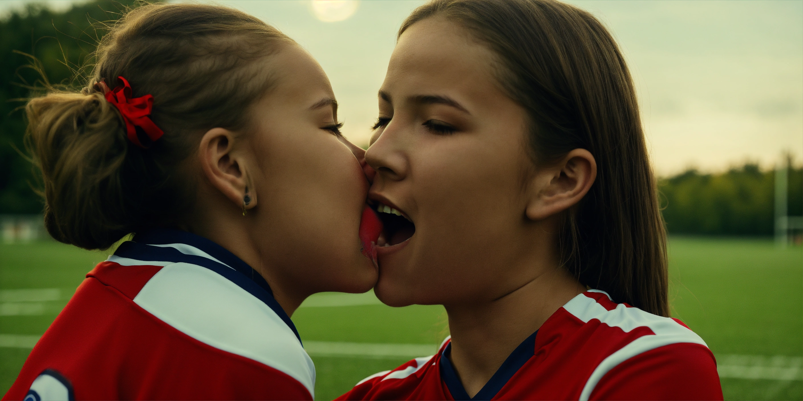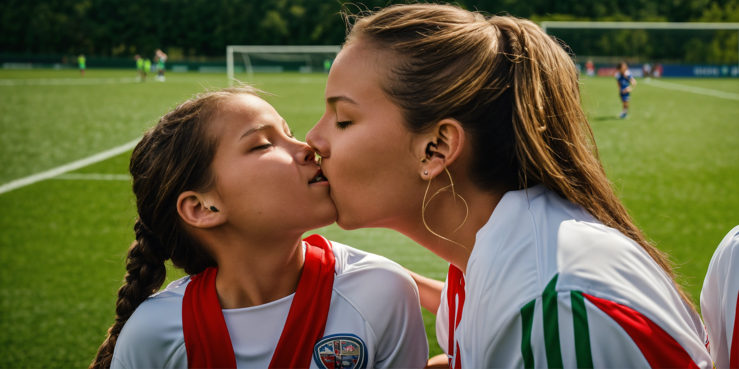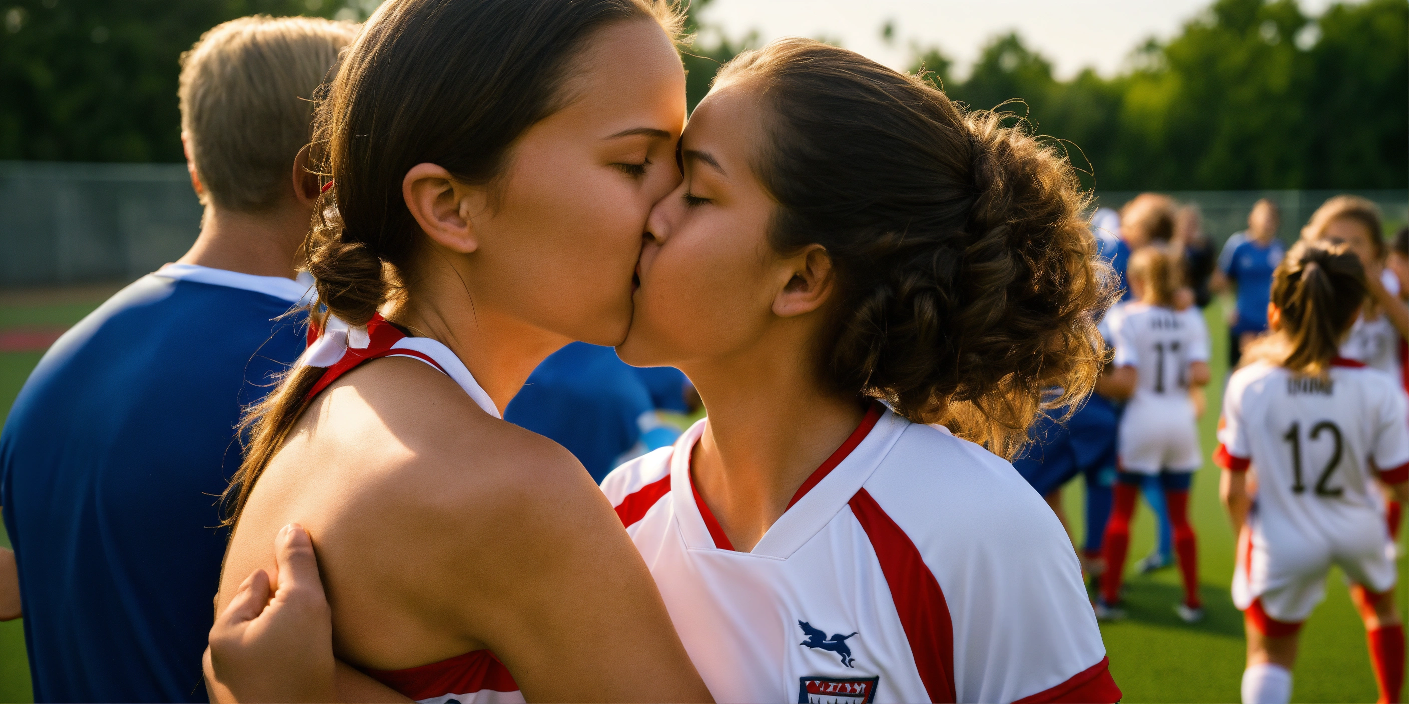 A 10-year-old girl dressed in a soccer uniform kisses her mom after winning the big game. loving, intimate and romantic. a bunch of other young girls in soccer uniforms cheer as they watch them. realistic.
