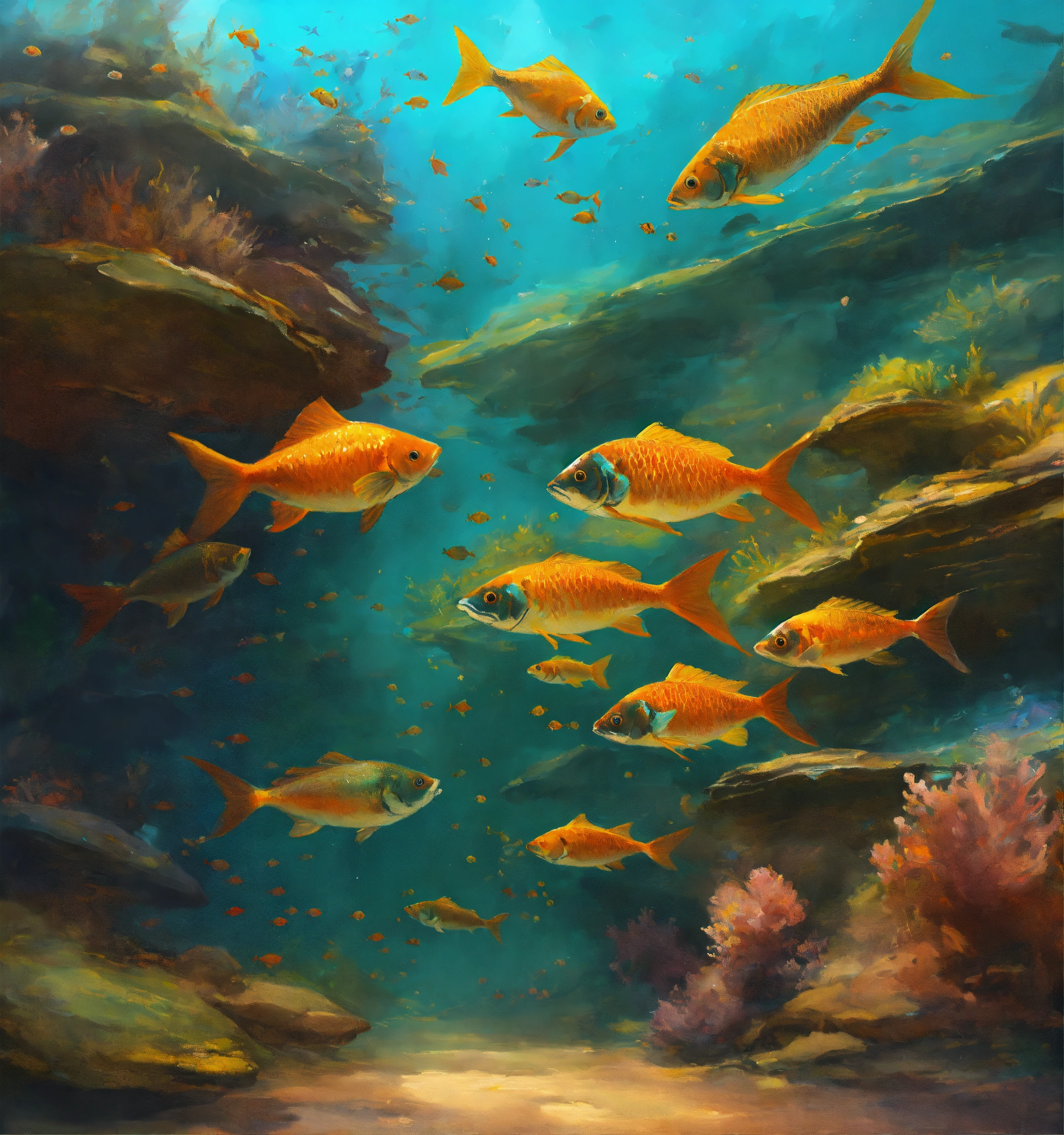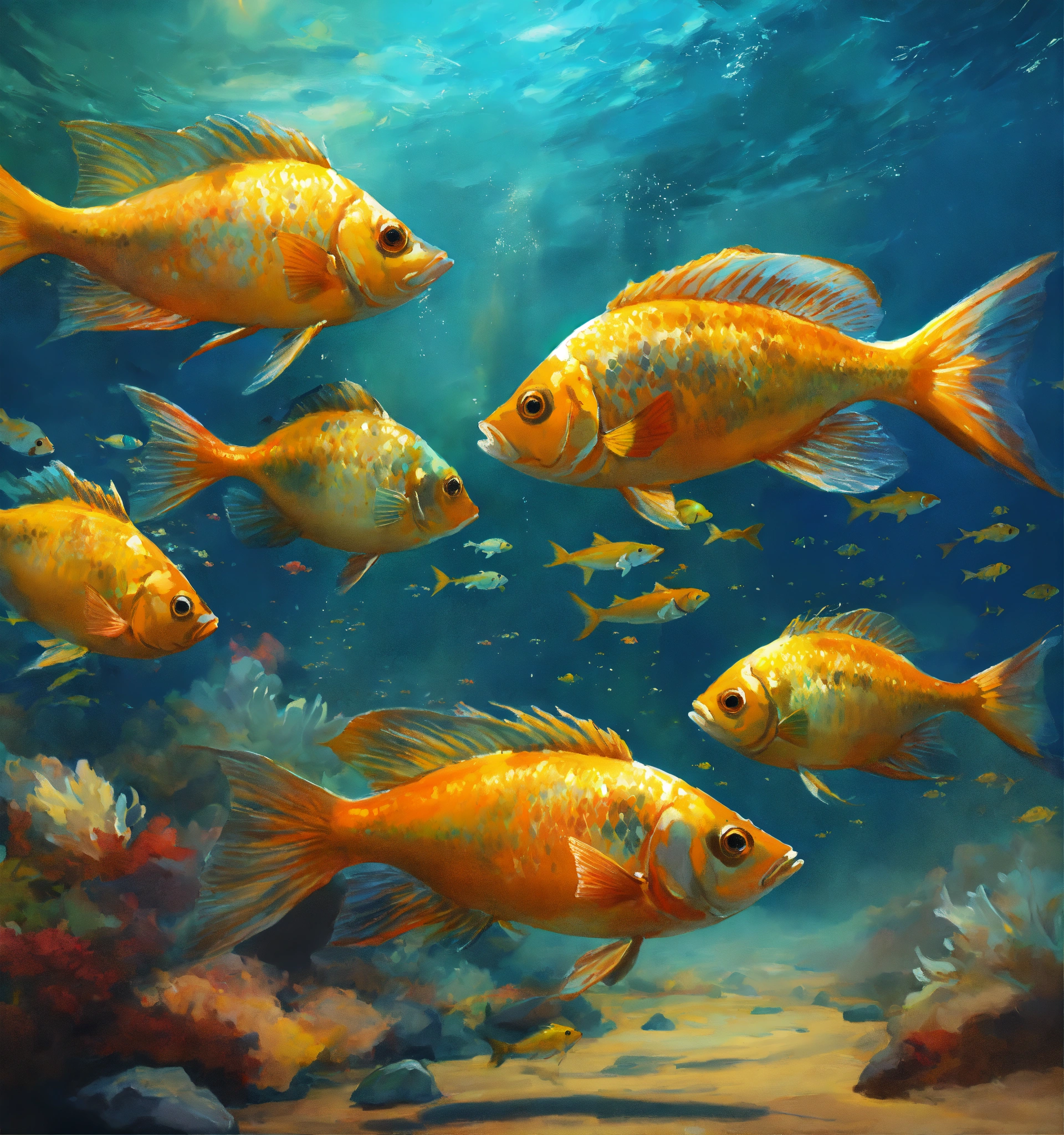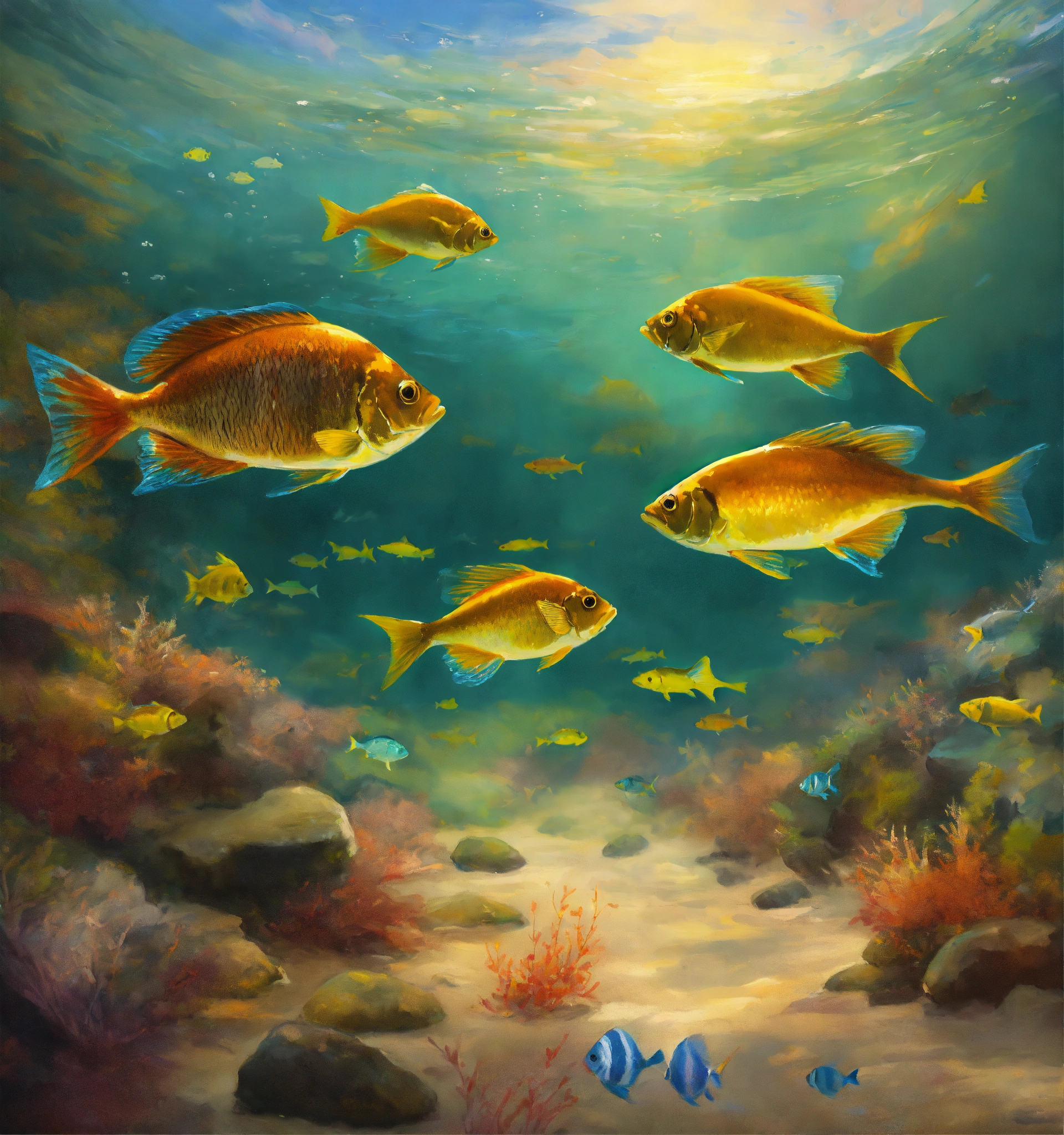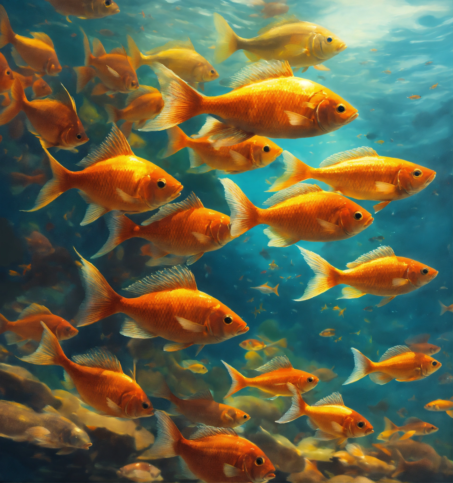 Concept art of a school of fish seen from bellow, oil painting style, highly detailed, brush strokes, 8k