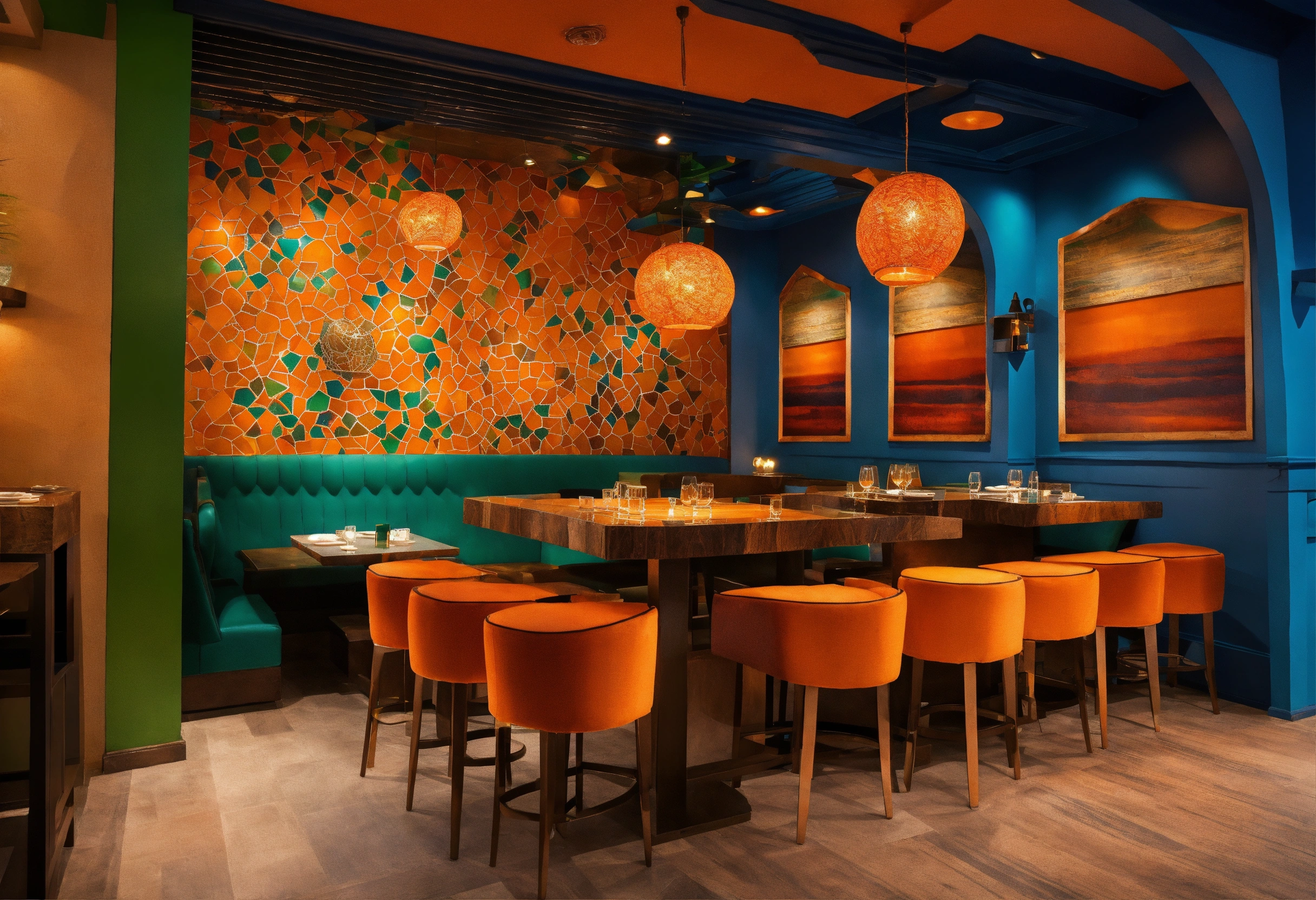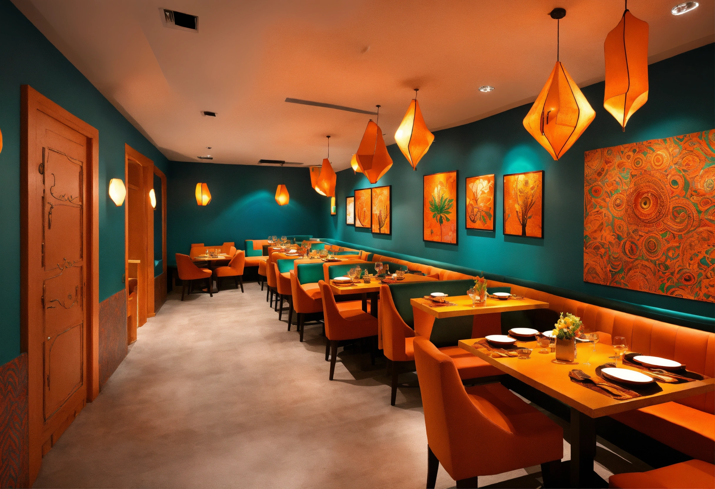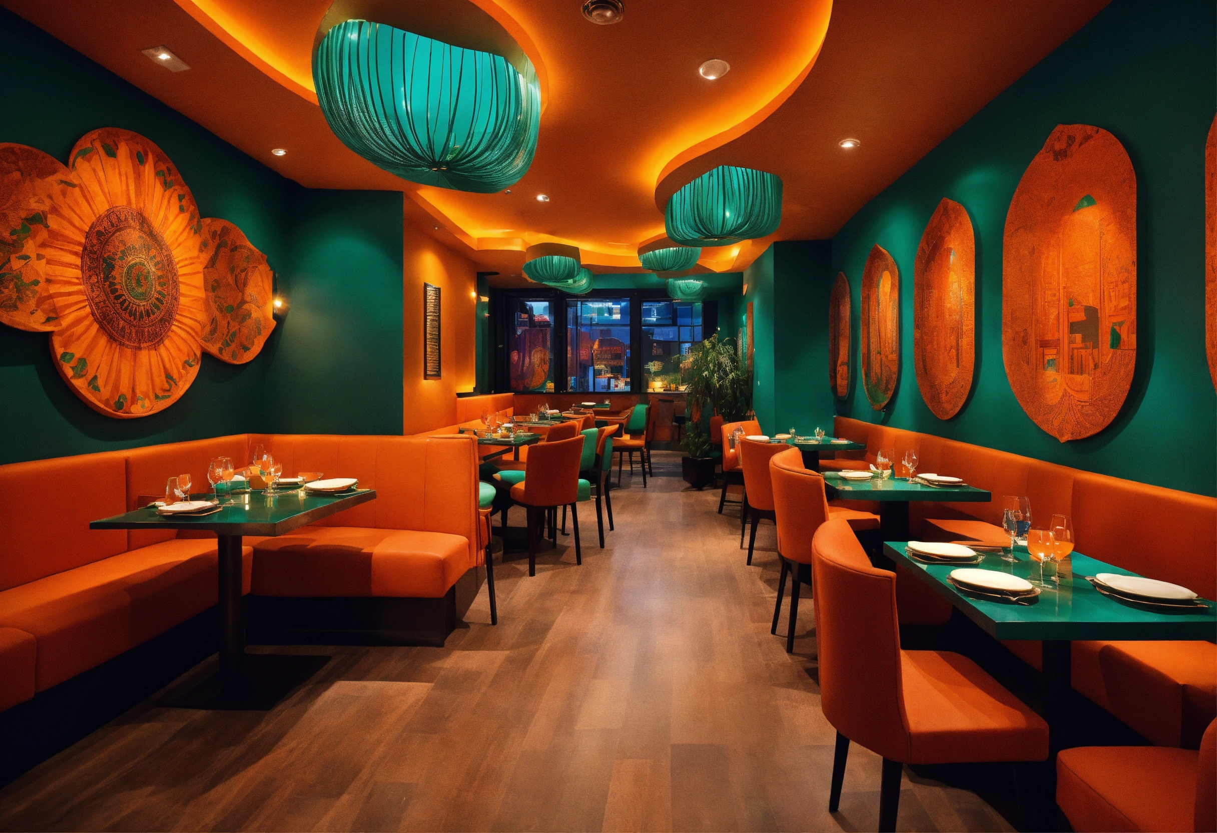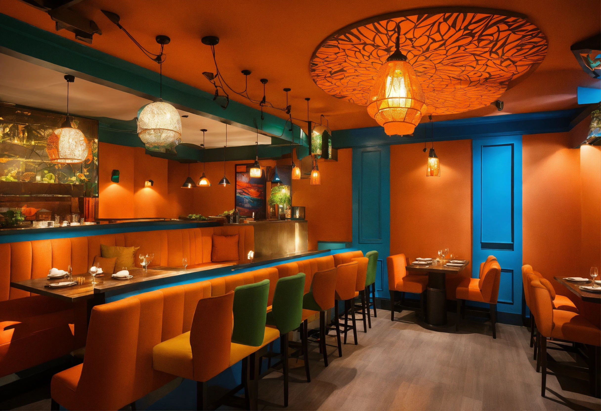 Design a front prospective of a vibrant indian restaurant interior with a modern and trendy ambiance. the restaurant features eye-catching decor inspired by mandela shapes, illuminated by soft backlights that add depth and warmth to the space. the color palette includes bold shades of orange, green, and blue, creating a lively and inviting atmosphere that complements the rich flavors of indian cuisine