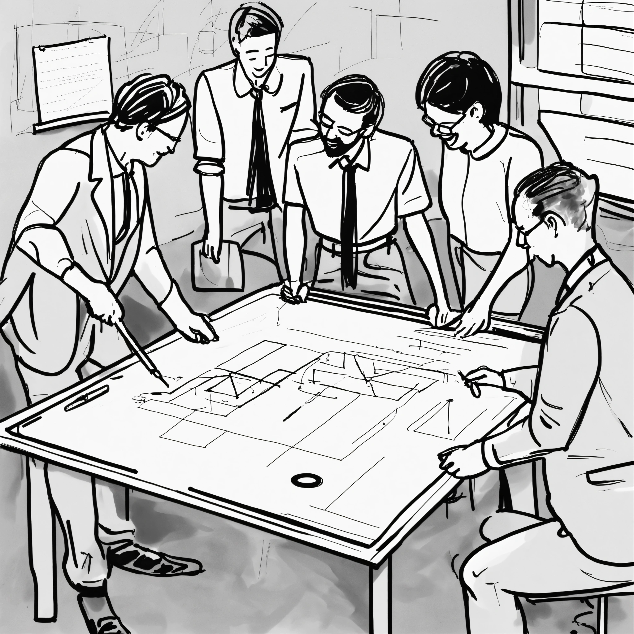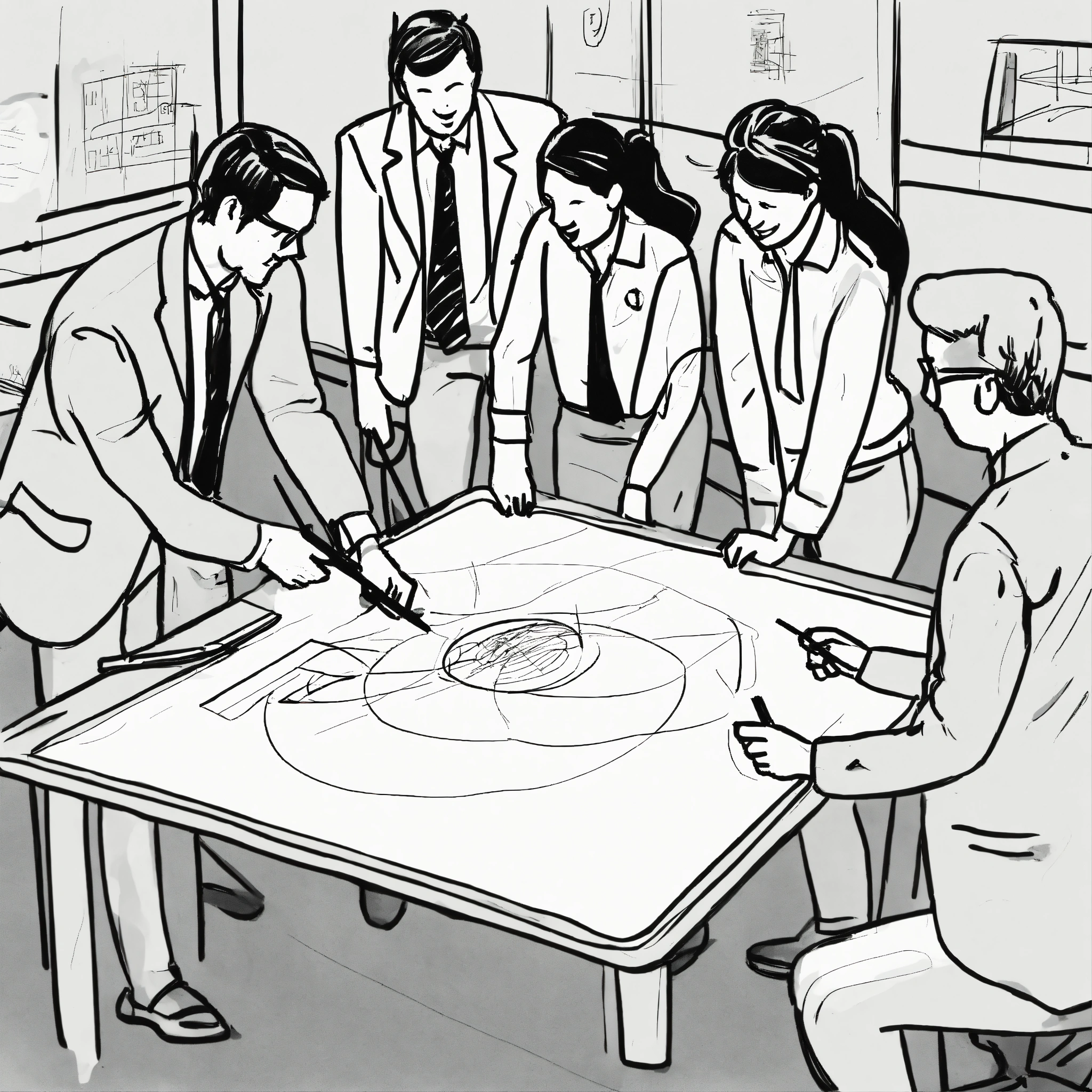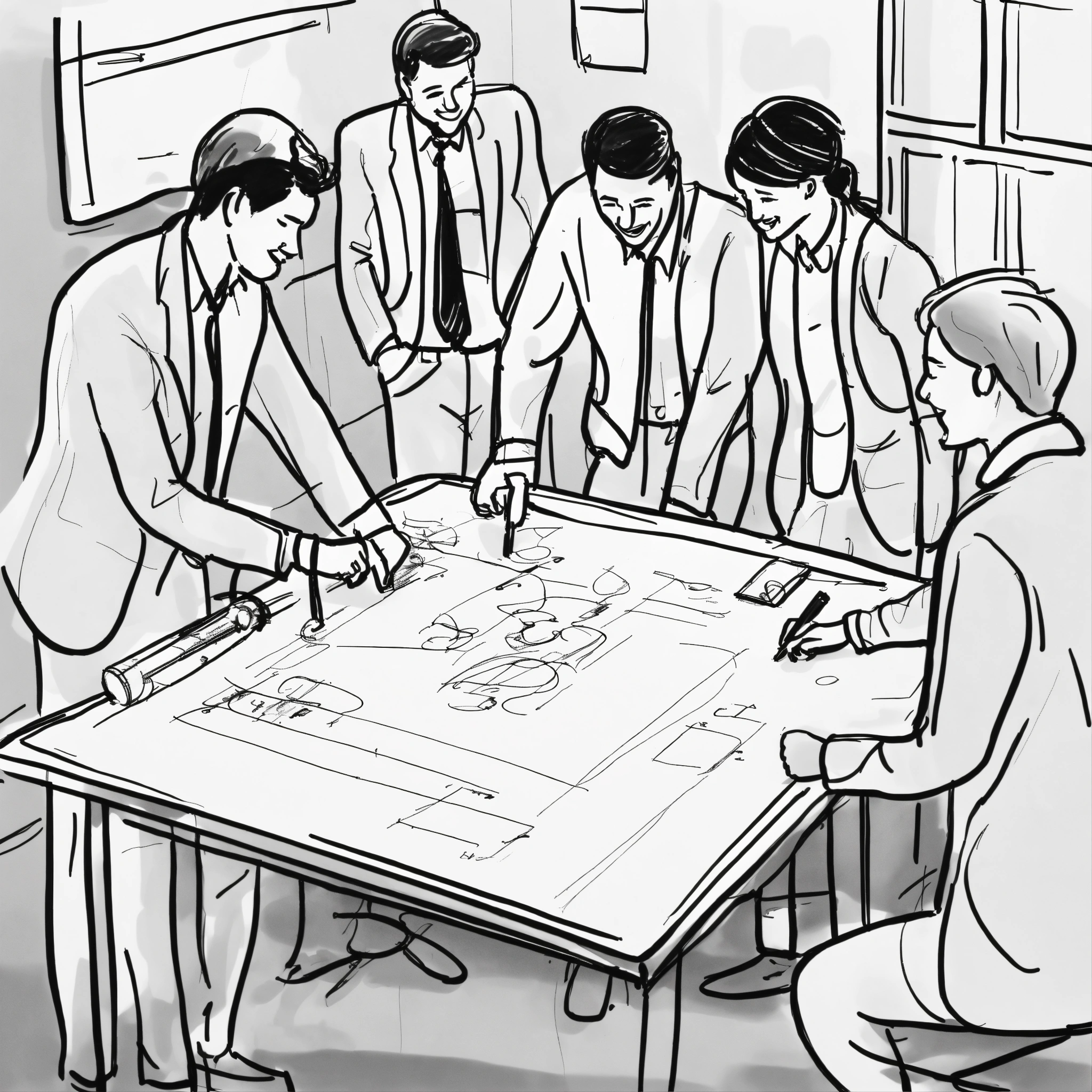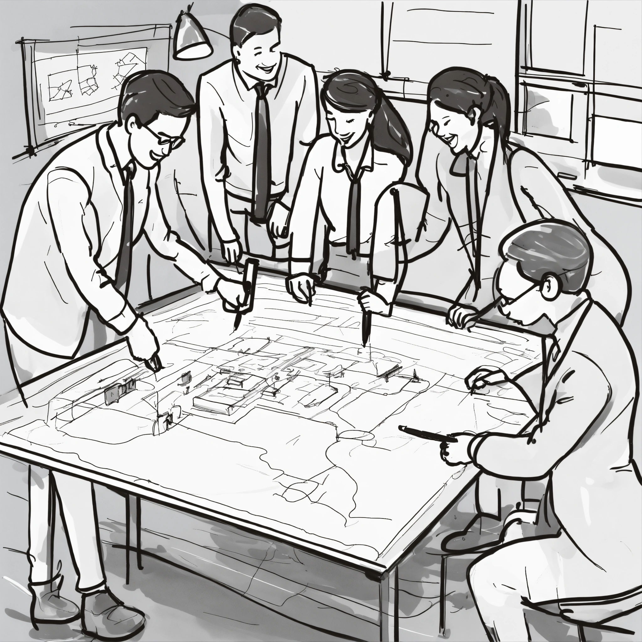 Very simple drawing of a cheerful team creating a design on a whiteboard