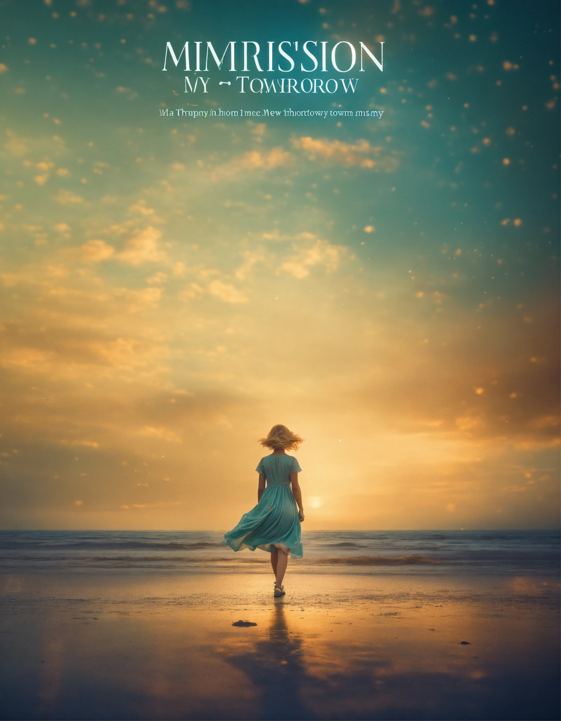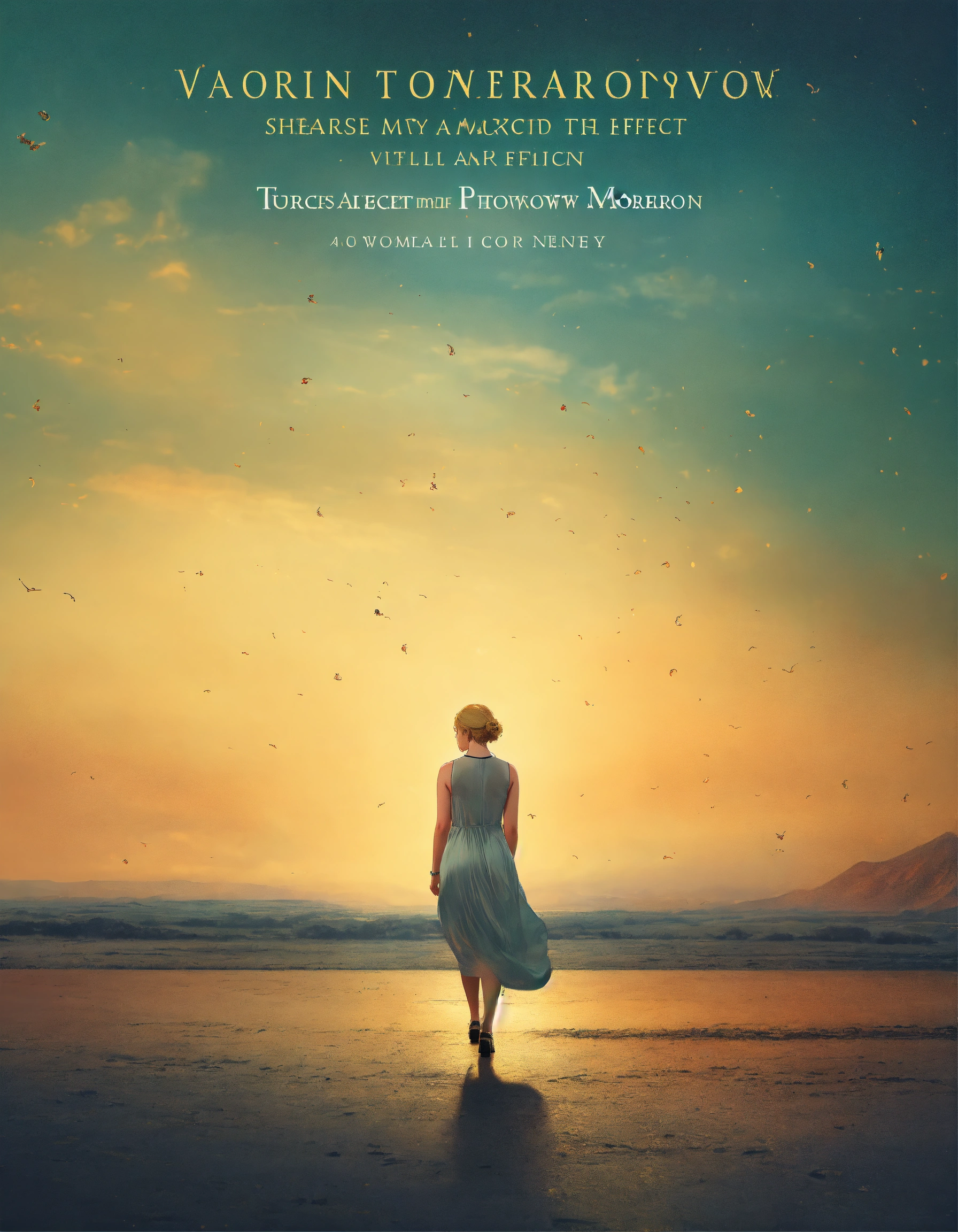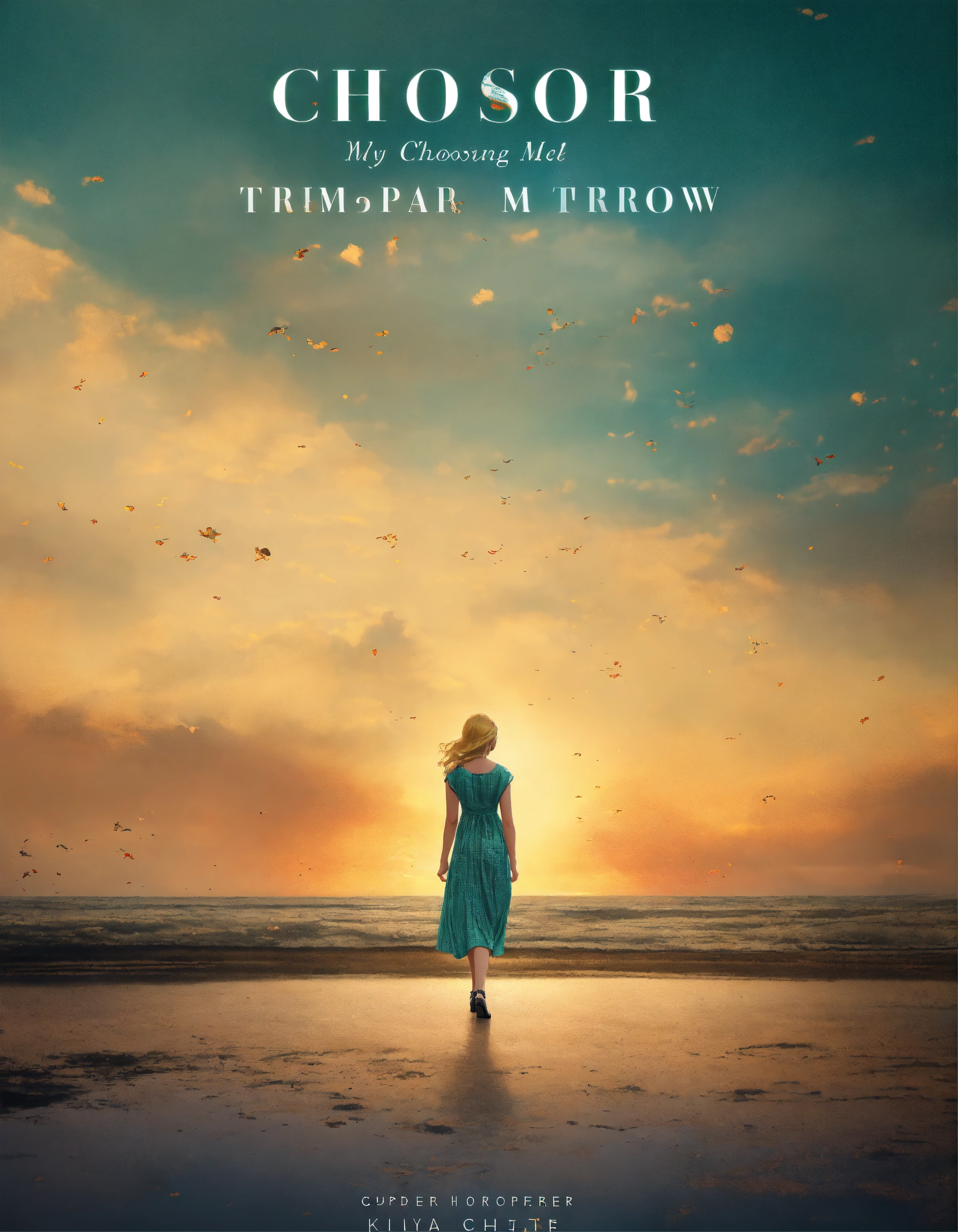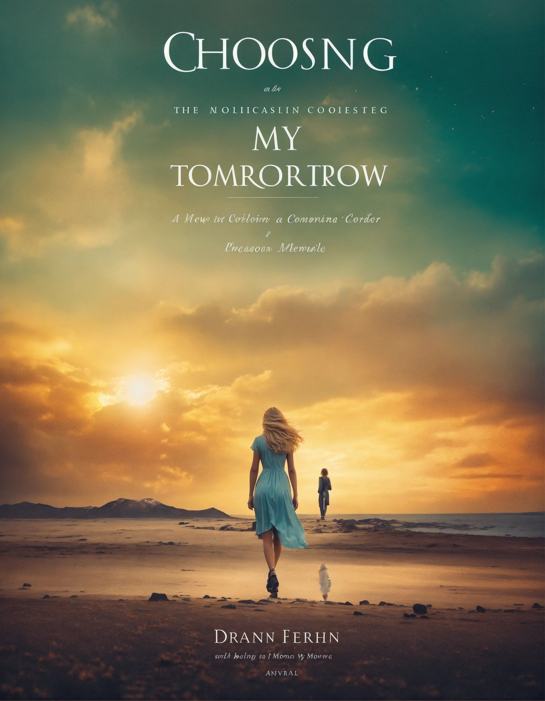 Create a captivating memoir book cover that conveys the theme of hope, courage, new approaches, triumph, community, and lessons from grief, with the title "choosing my tomorrow", dispersion effect, with photo, my tomorrow, minimalist cover, a woman picture, vintage style color, dispersion effect, vintage color, a woman walking towards the mountain with sunset, super detailed, woman with blond hair wearing a dress, photoreal