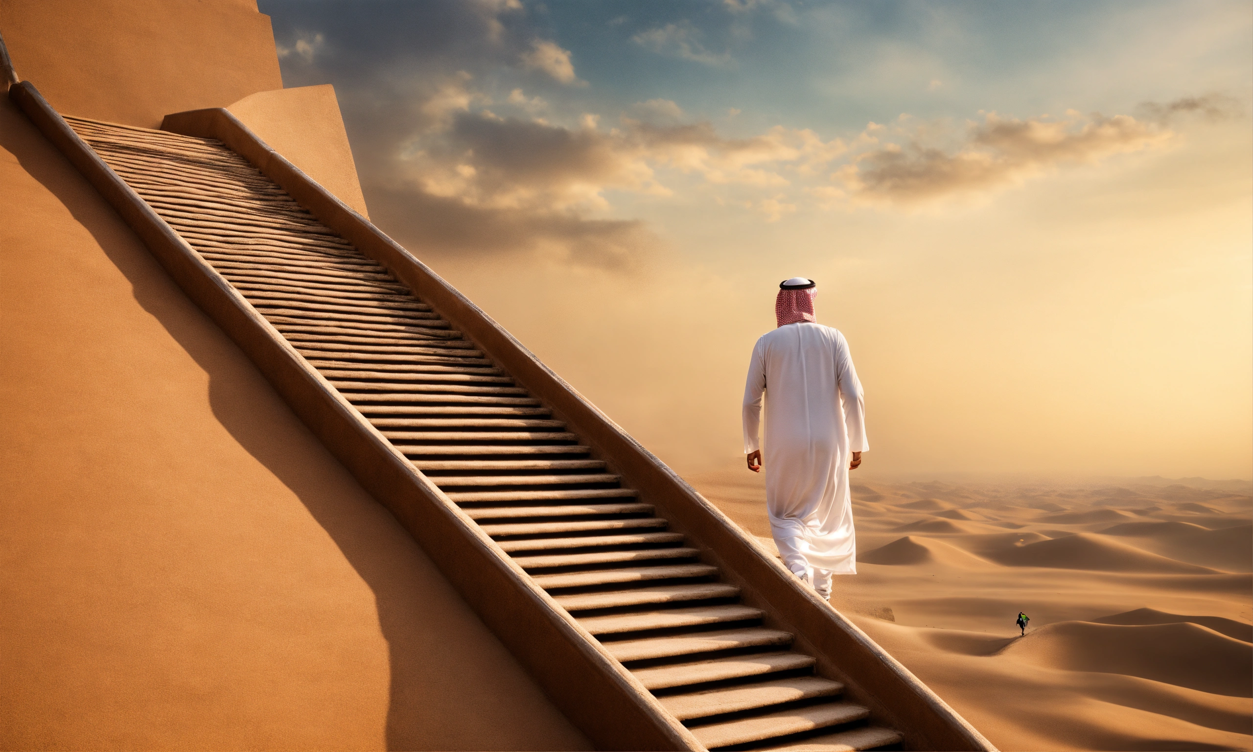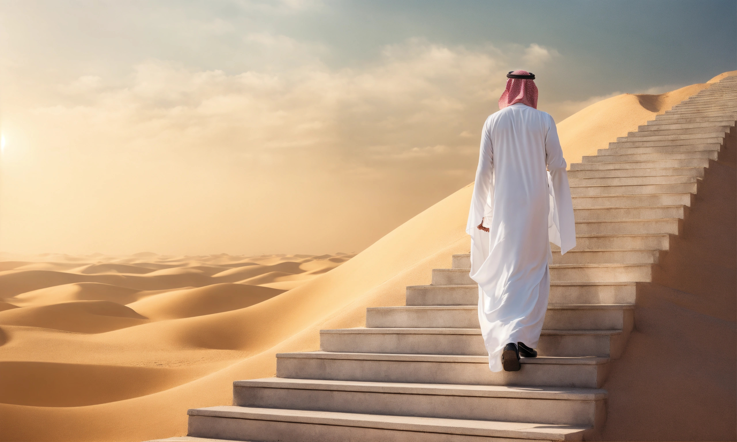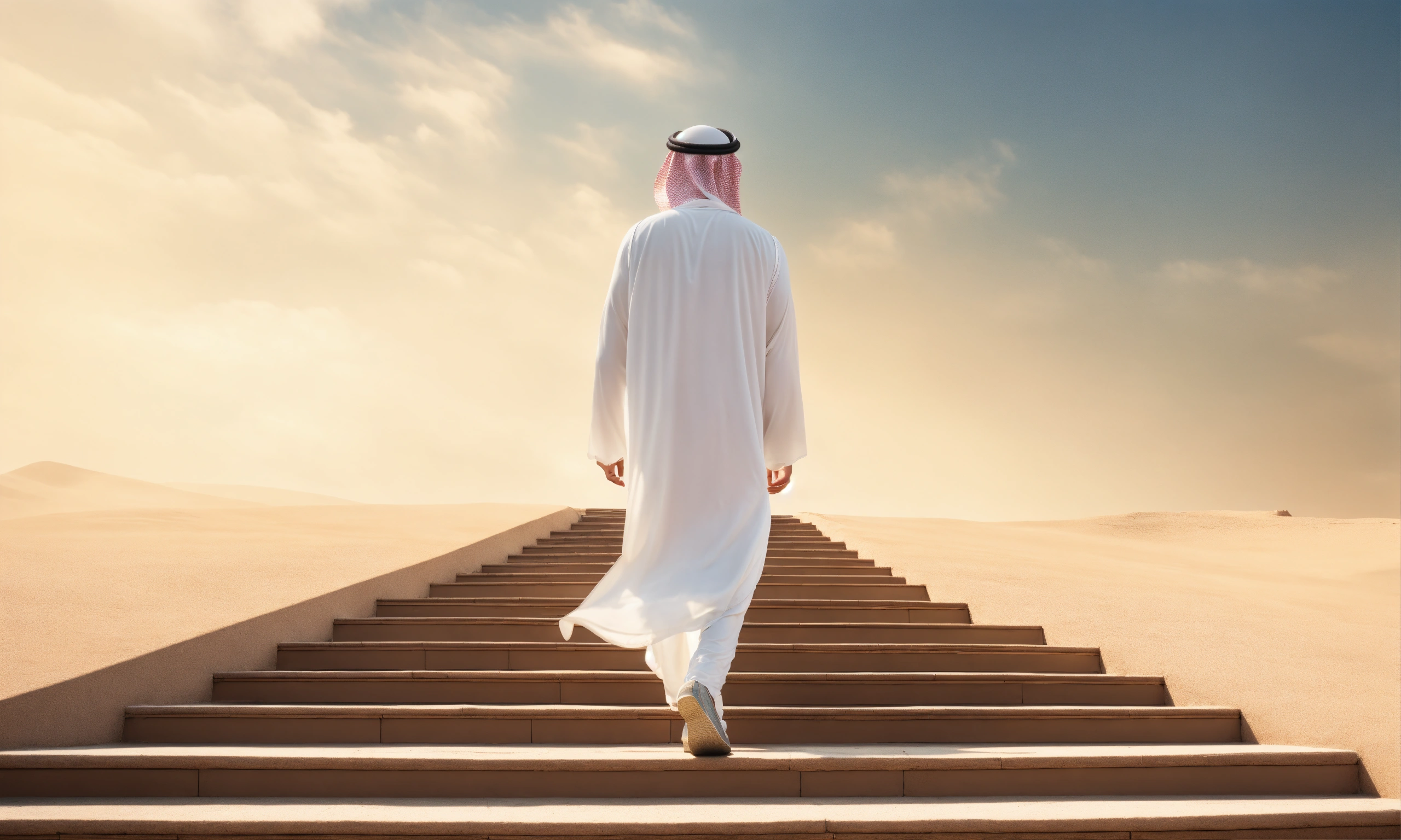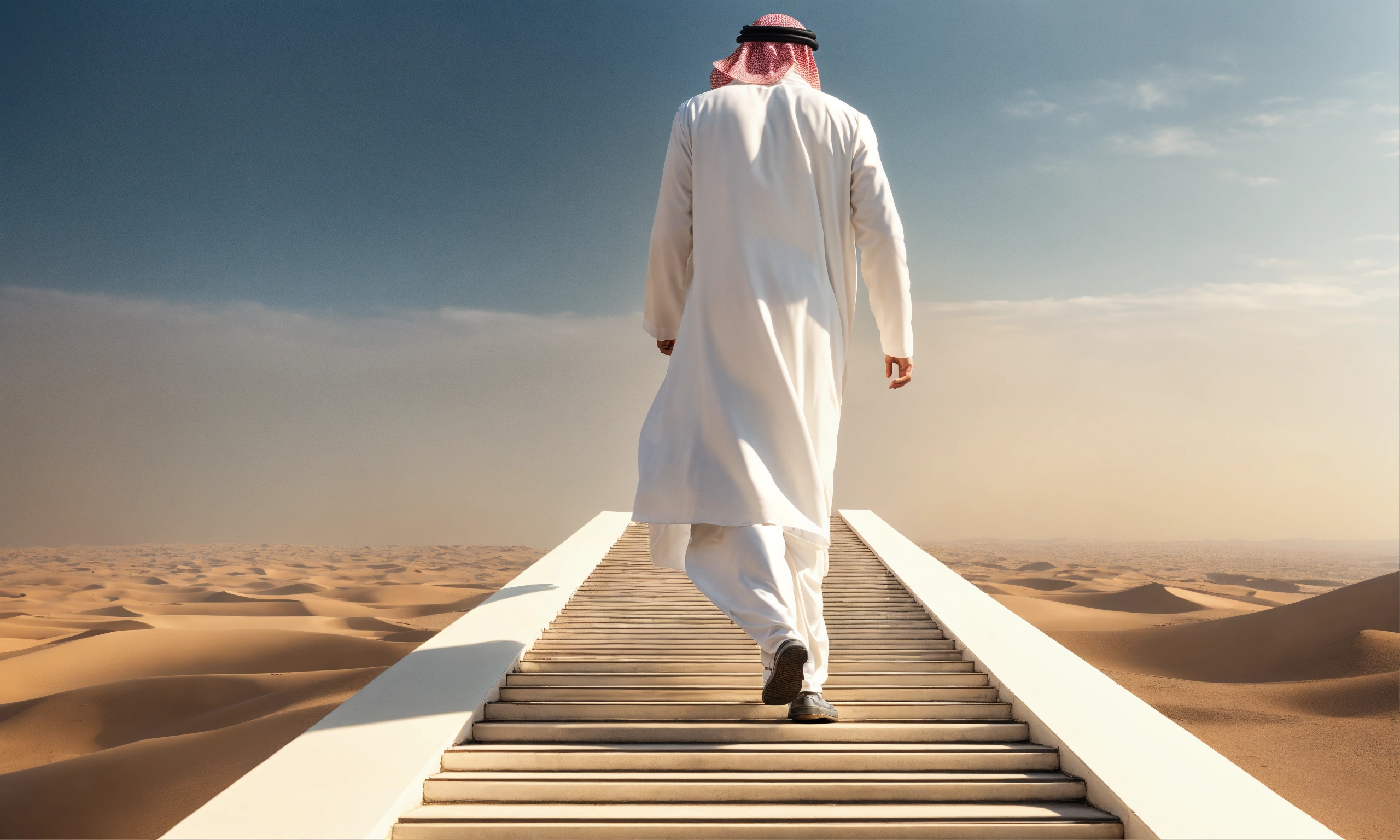 Saudi man climbing up six steps only, white costume, saudi head cover, walking upward, right side, side-way, close up, glass, abstract, modern, sky, horizon, natural light, warm, photo-realistic, 8k, high definition