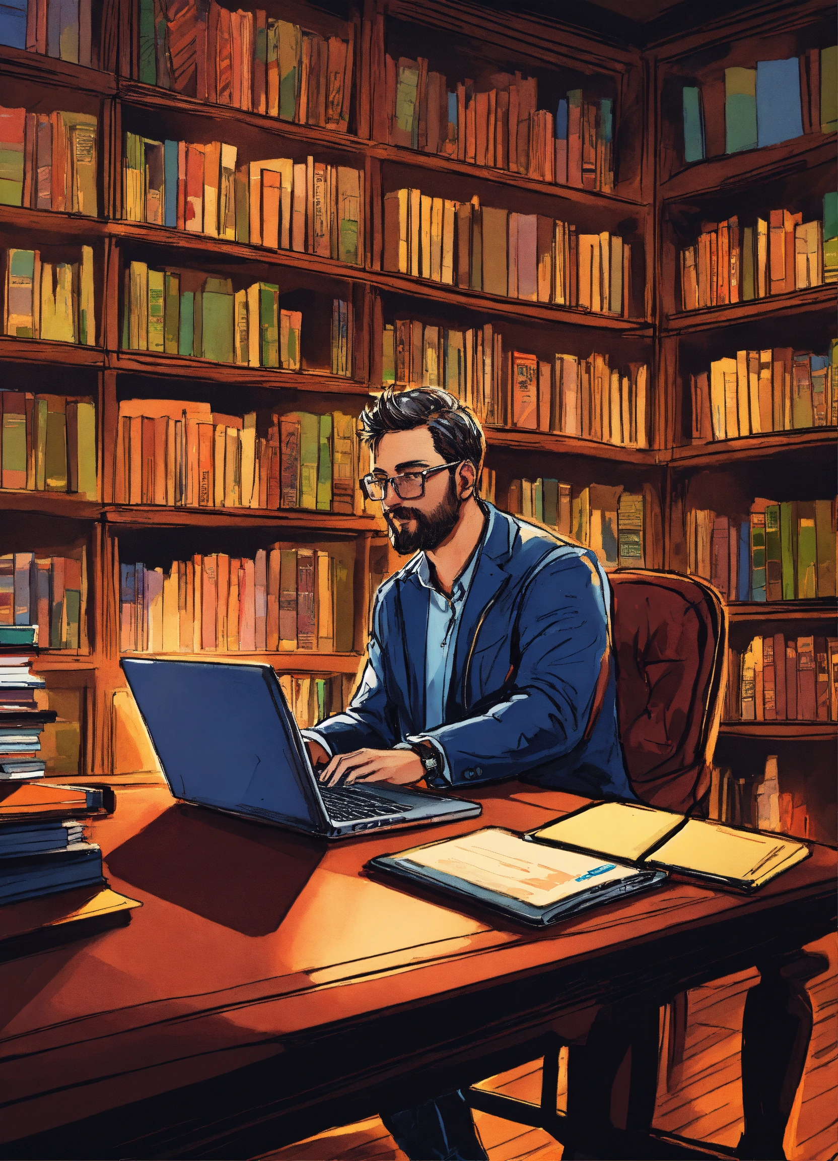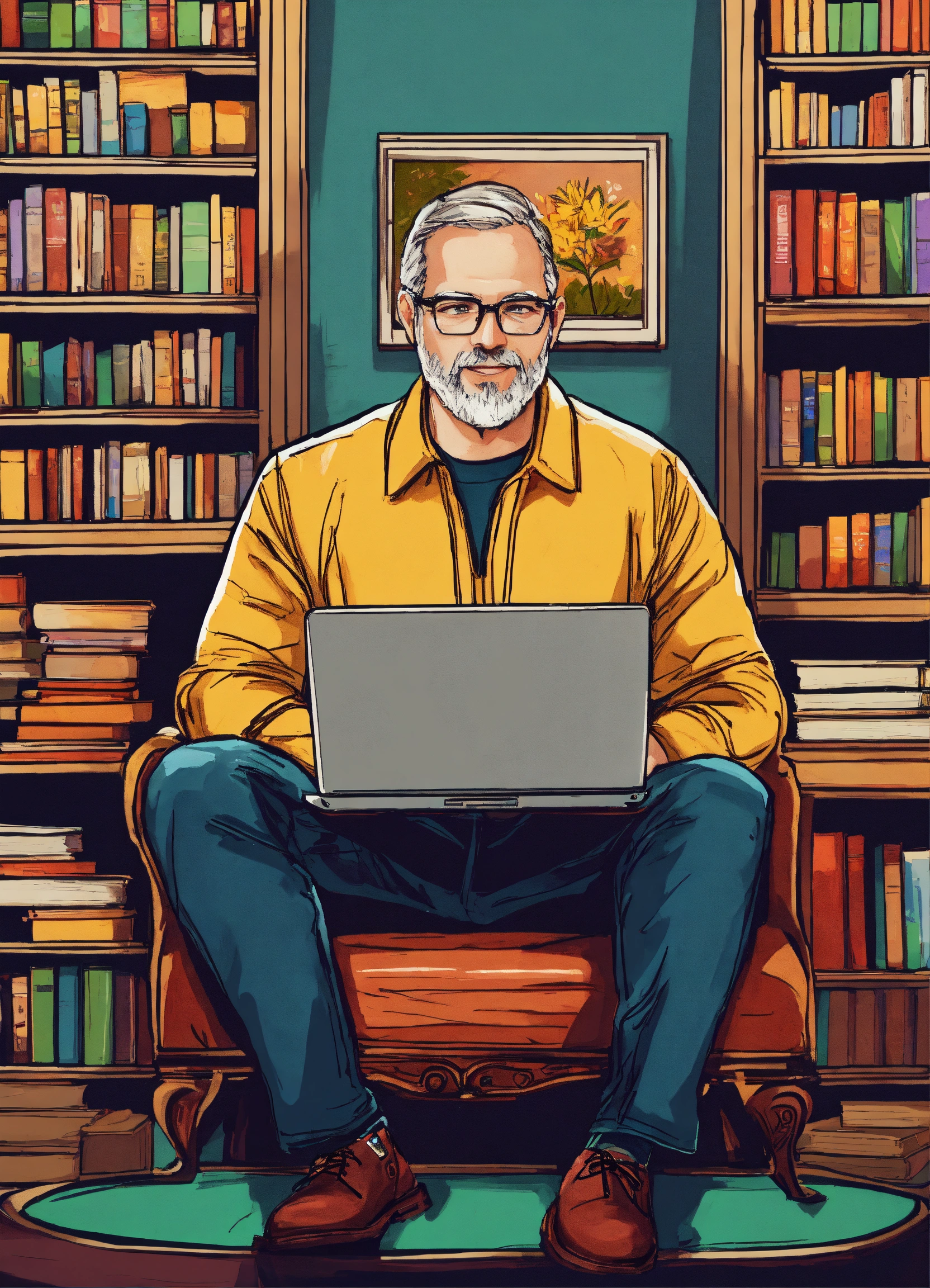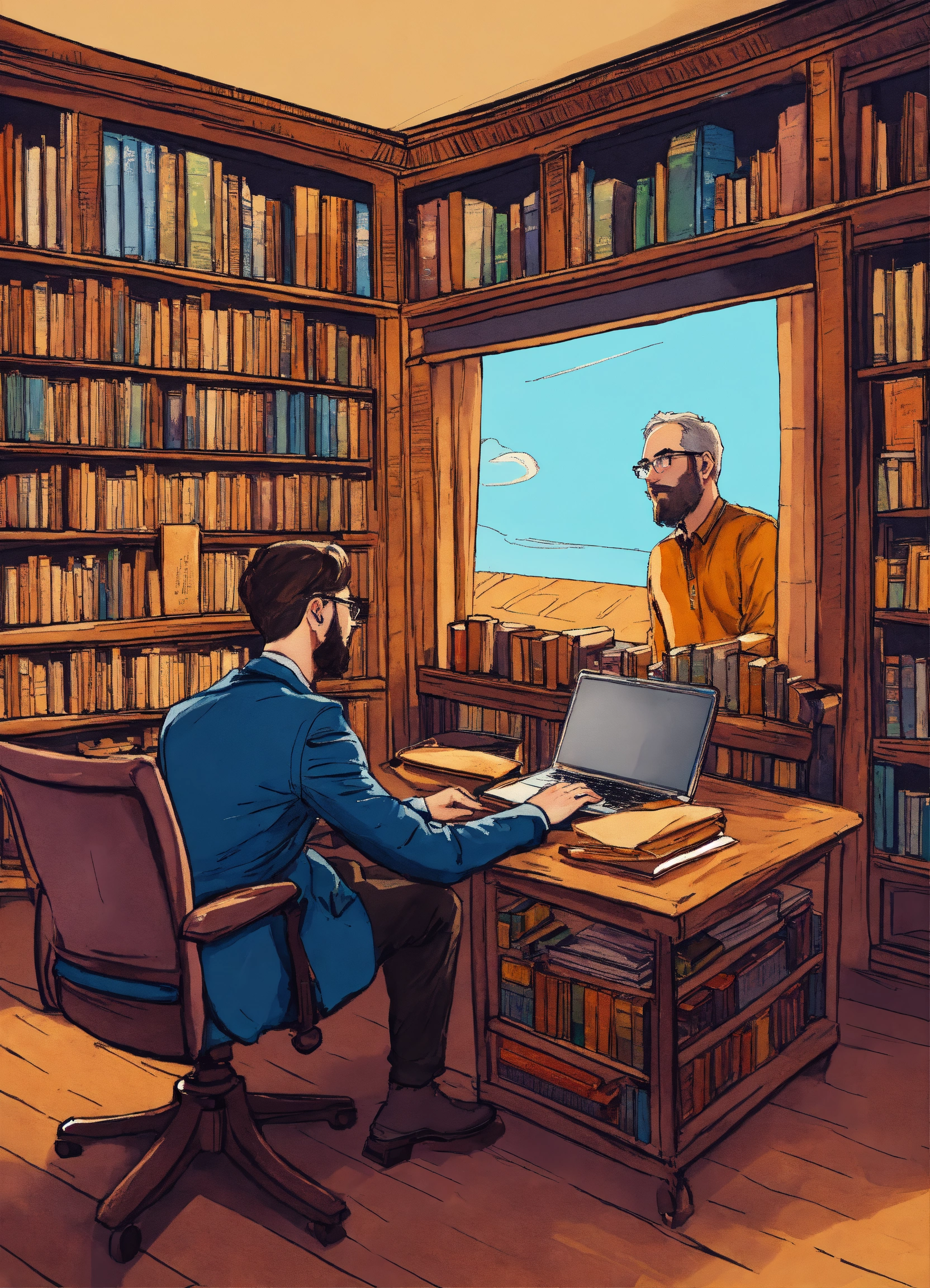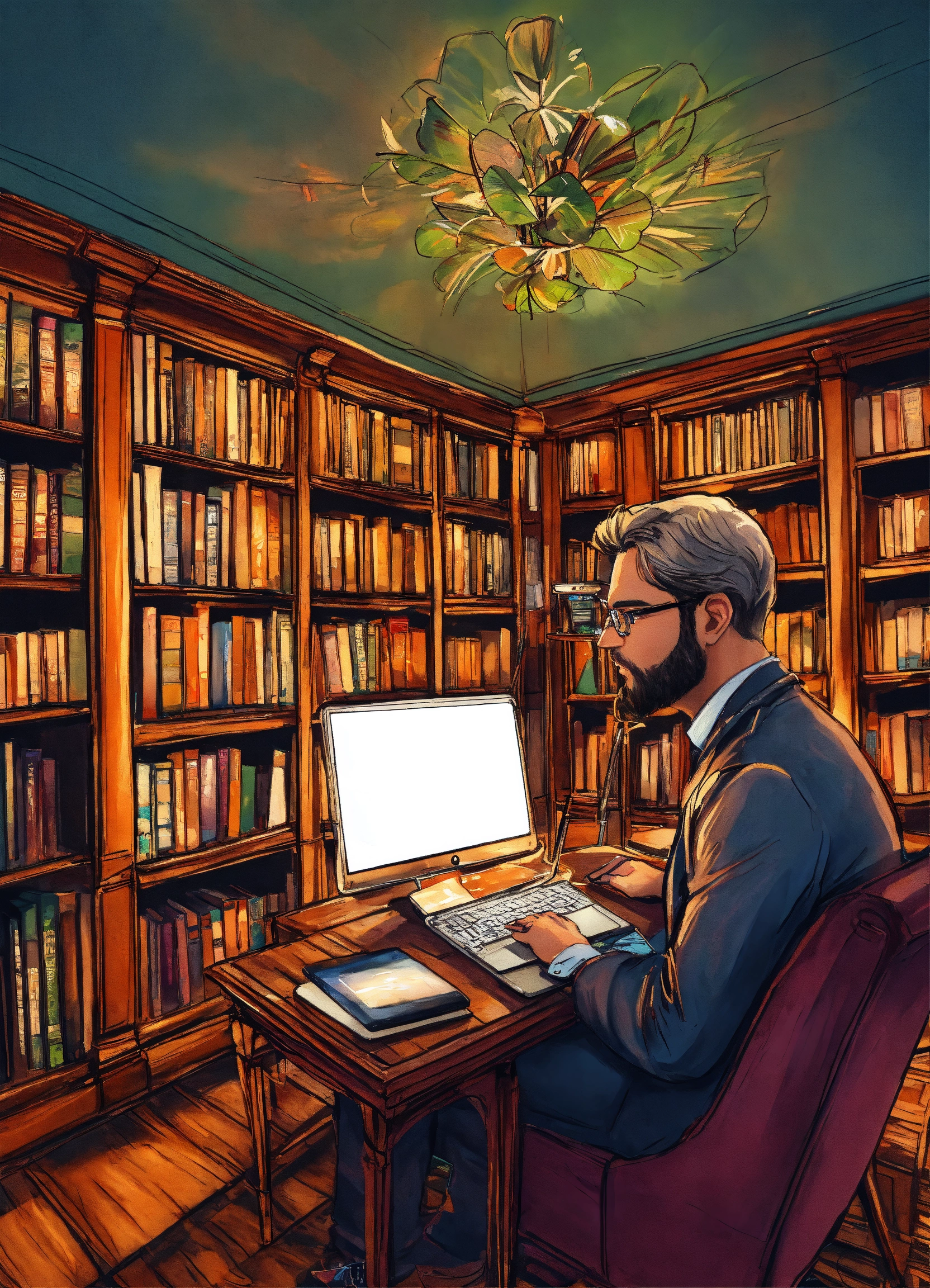 A hand drawn painting of a life coach conducting a webinar on his laptop. he is sitting in his big english library. highly detailed crisp photo in 4k, wide-angle, sharp, vibrant, vivid.
