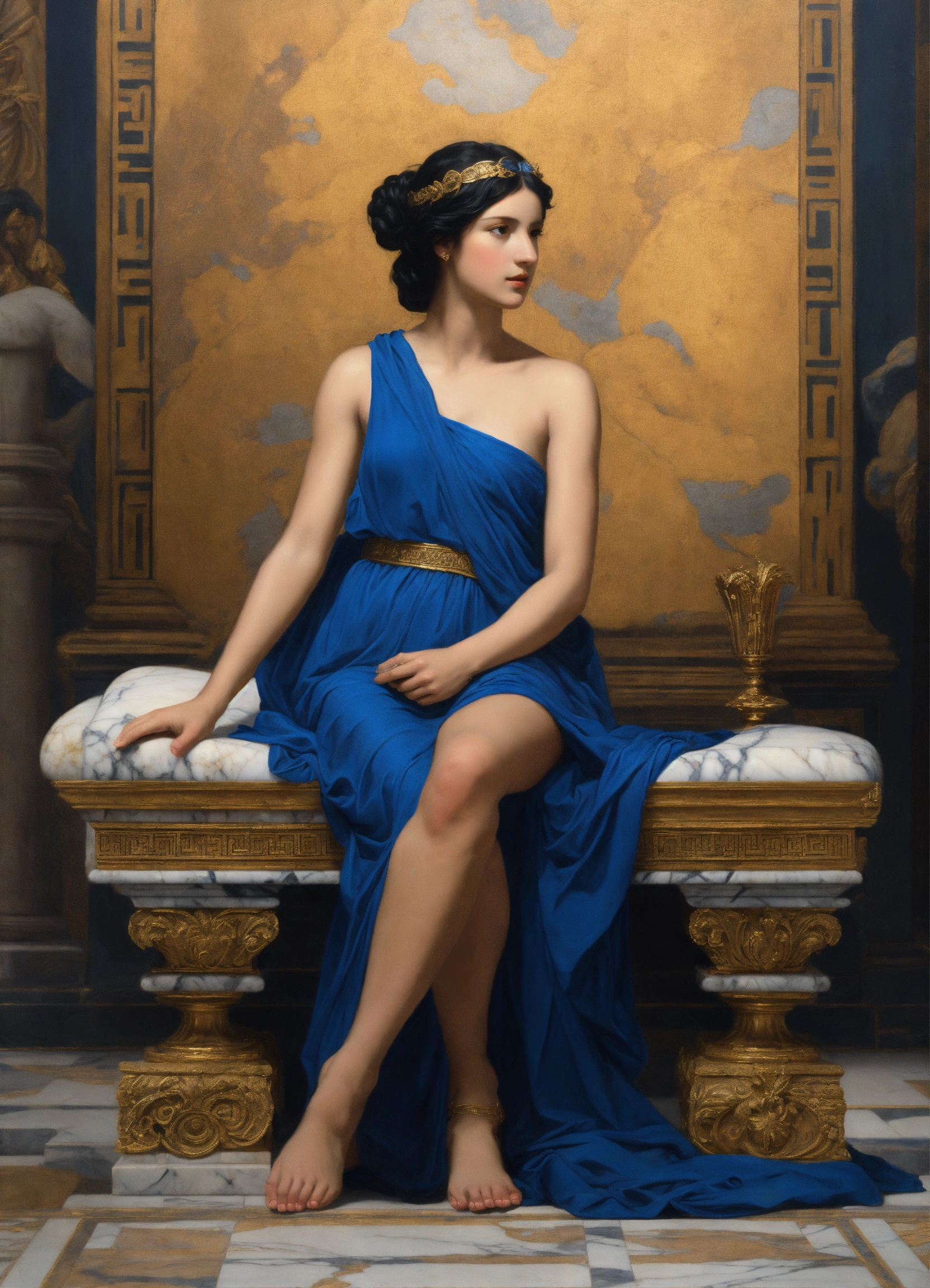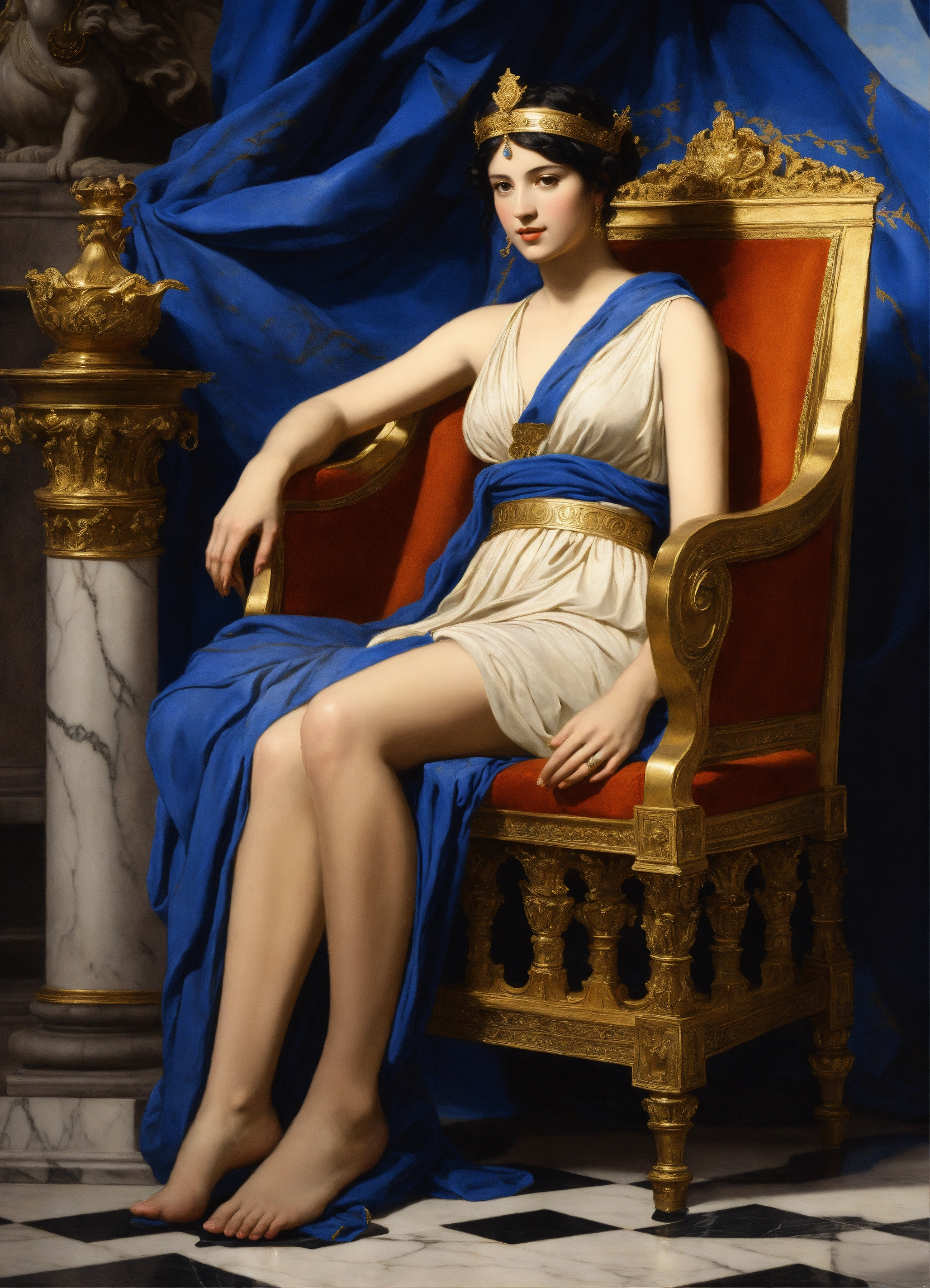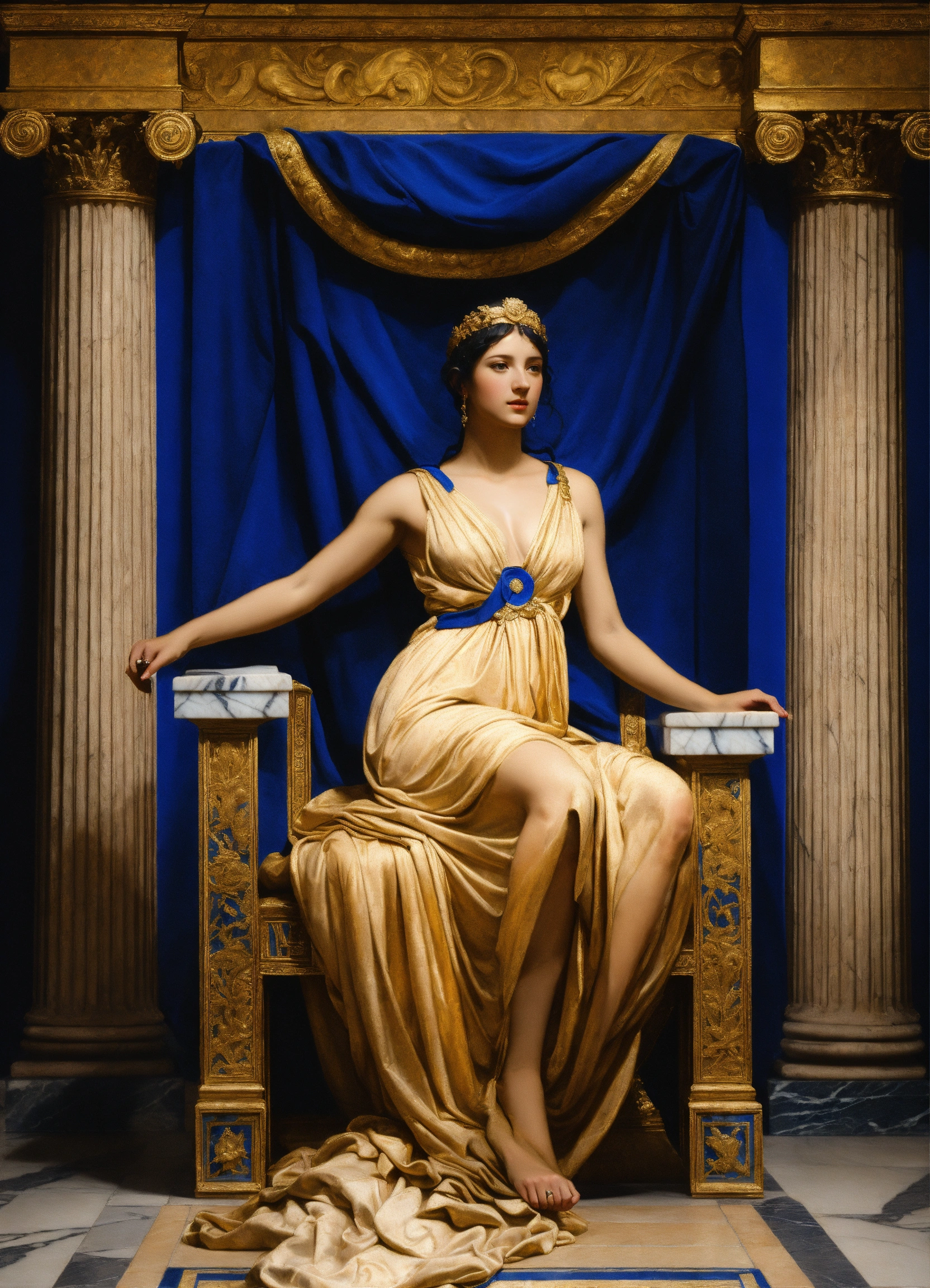 Neoclassical art, neoclassical painting, full body, hera, greek goddess, black hair, royal blue toga, marble throne