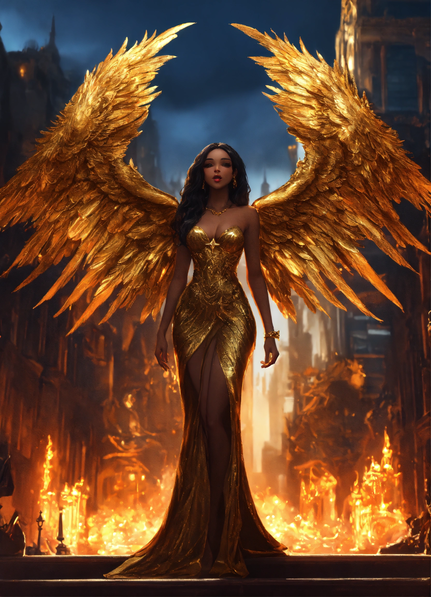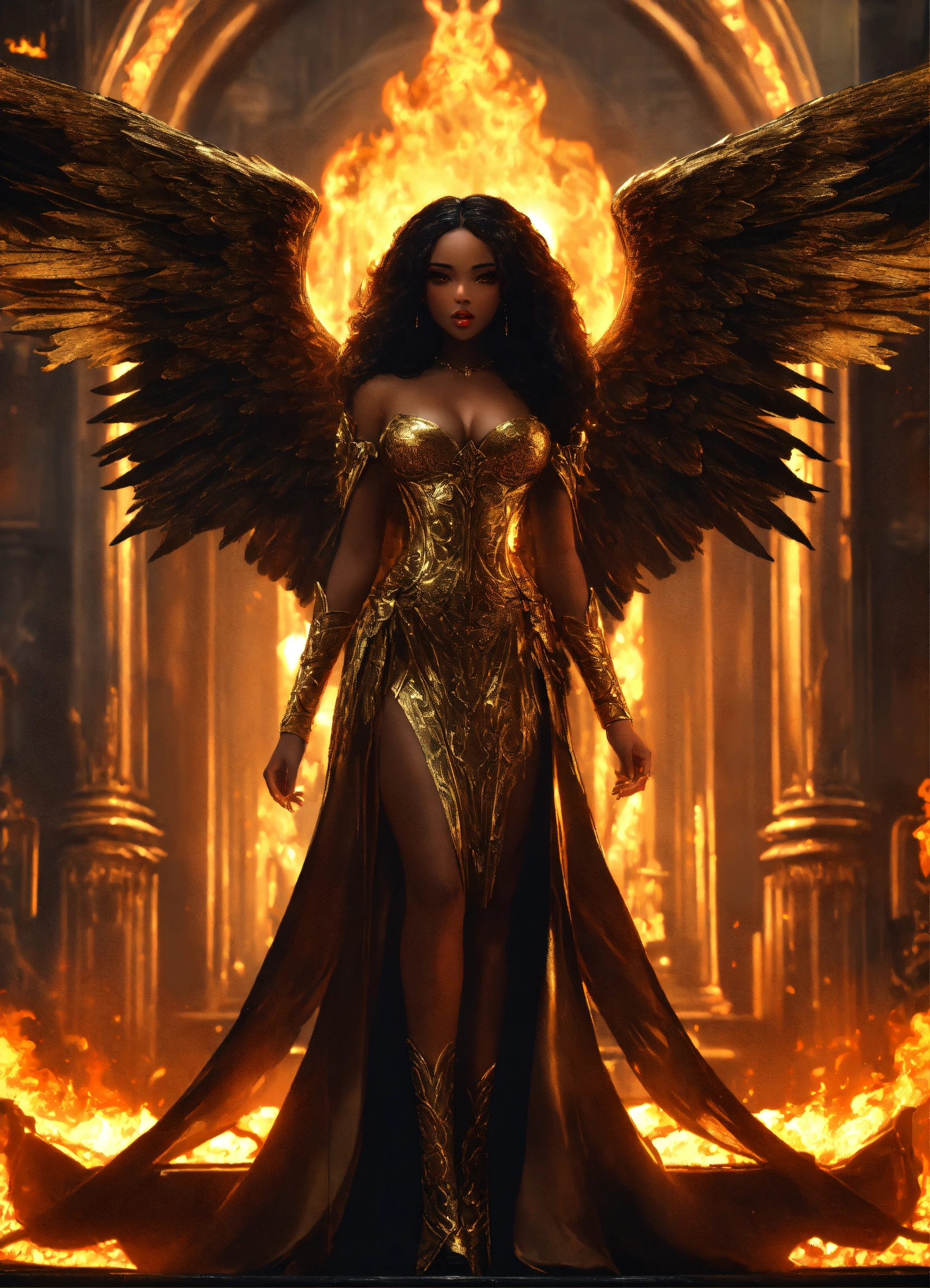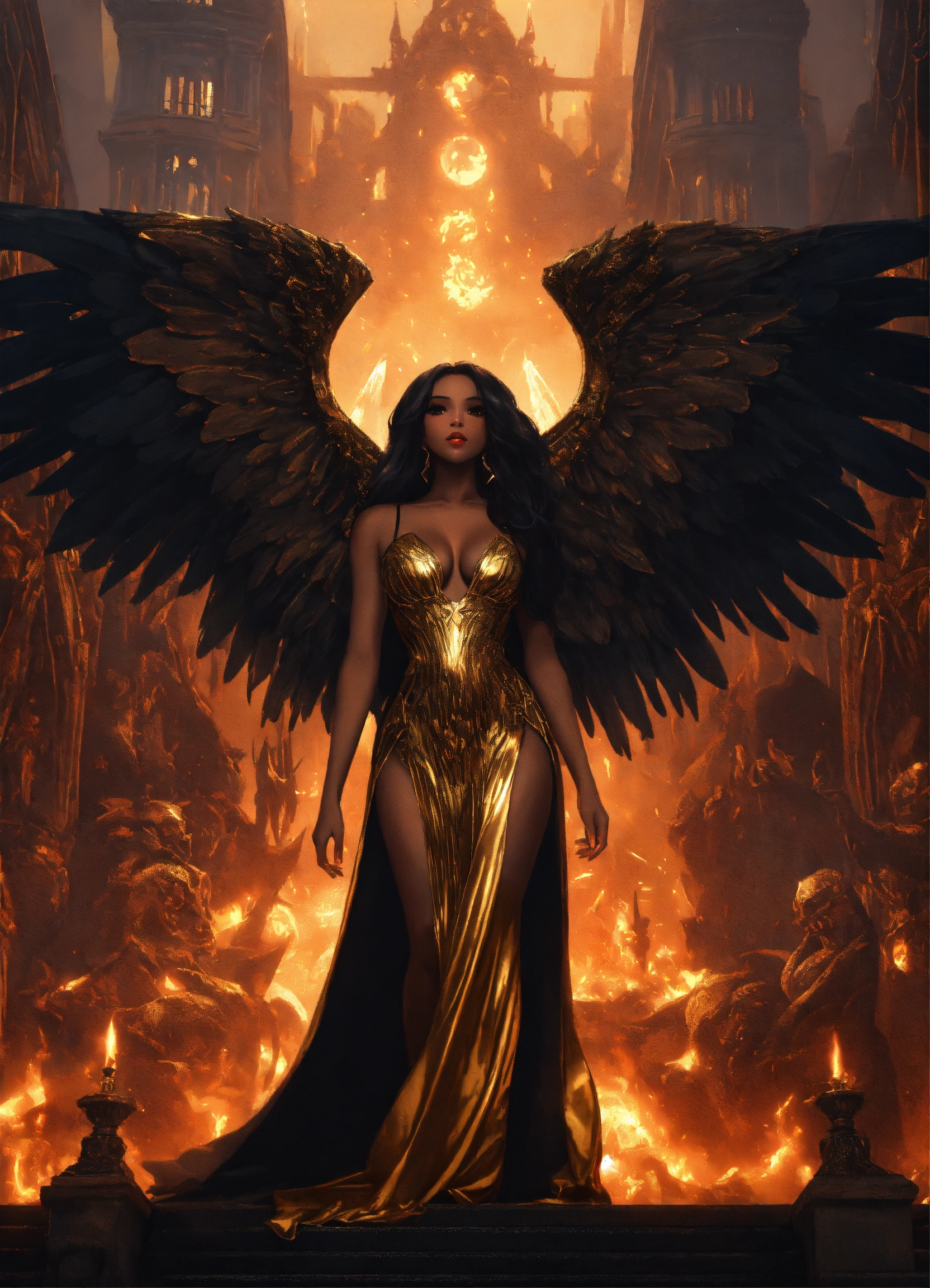 A beautiful black girl angel goddess, with long dark hair hour-glass figure angel wings wearing a gold dress, defiantly standing before. a twisted hellish throne in fiery hellish ballroom in a evil city with demons and evil monsters in the background, resolution 8k, insanely detailed