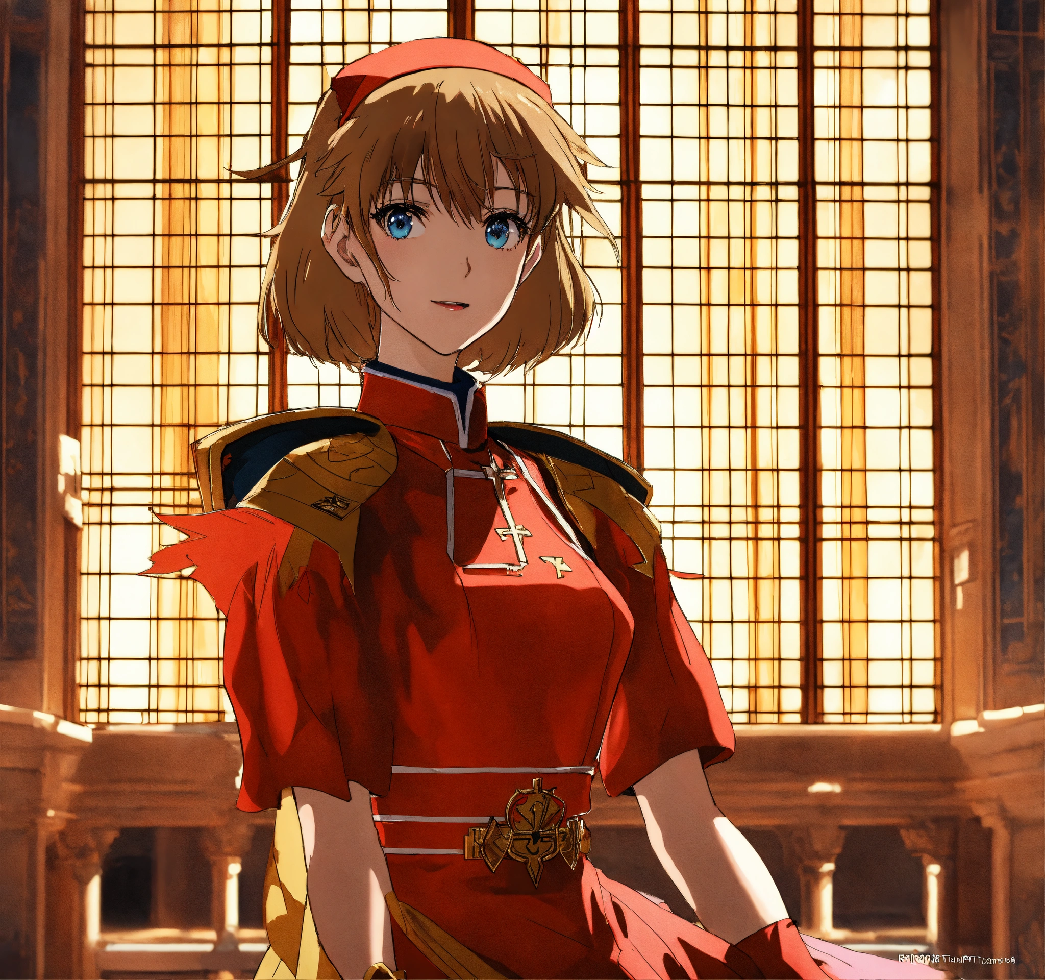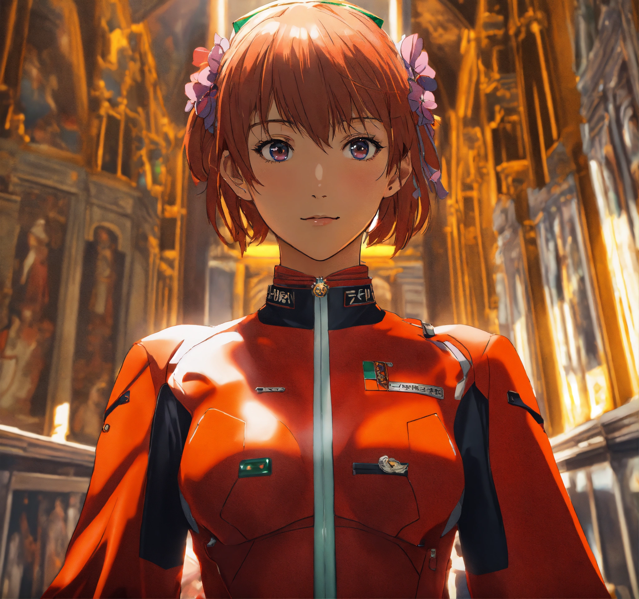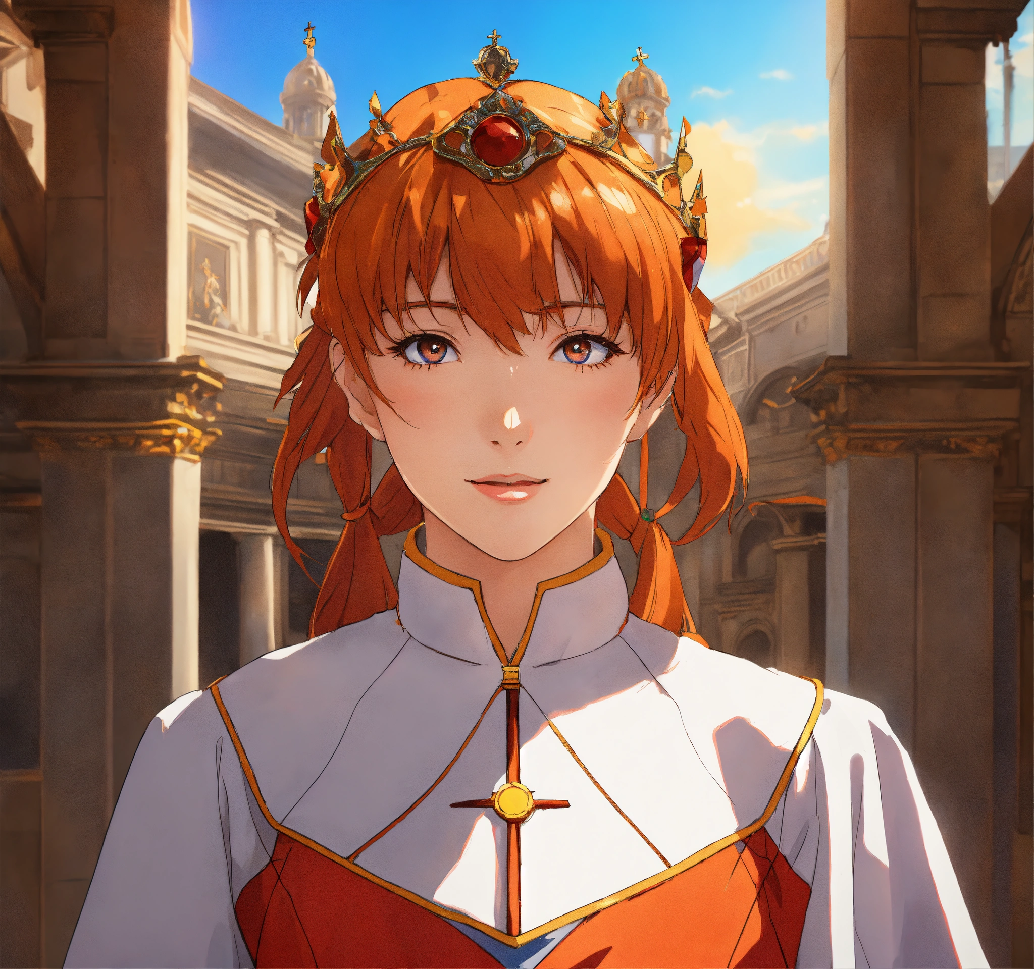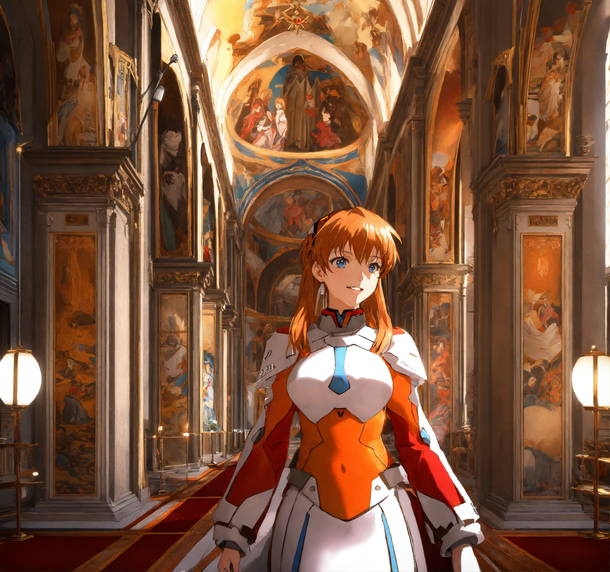 Anime art of asuka from neon genesis evangelion, pope, papal tiara, vatican, sistine chapel, young girl, beautiful girl, happy, stunning detail, detailed environment, trending on artstation, unreal engine render, ray-traced environment, vintage 80’s anime artwork