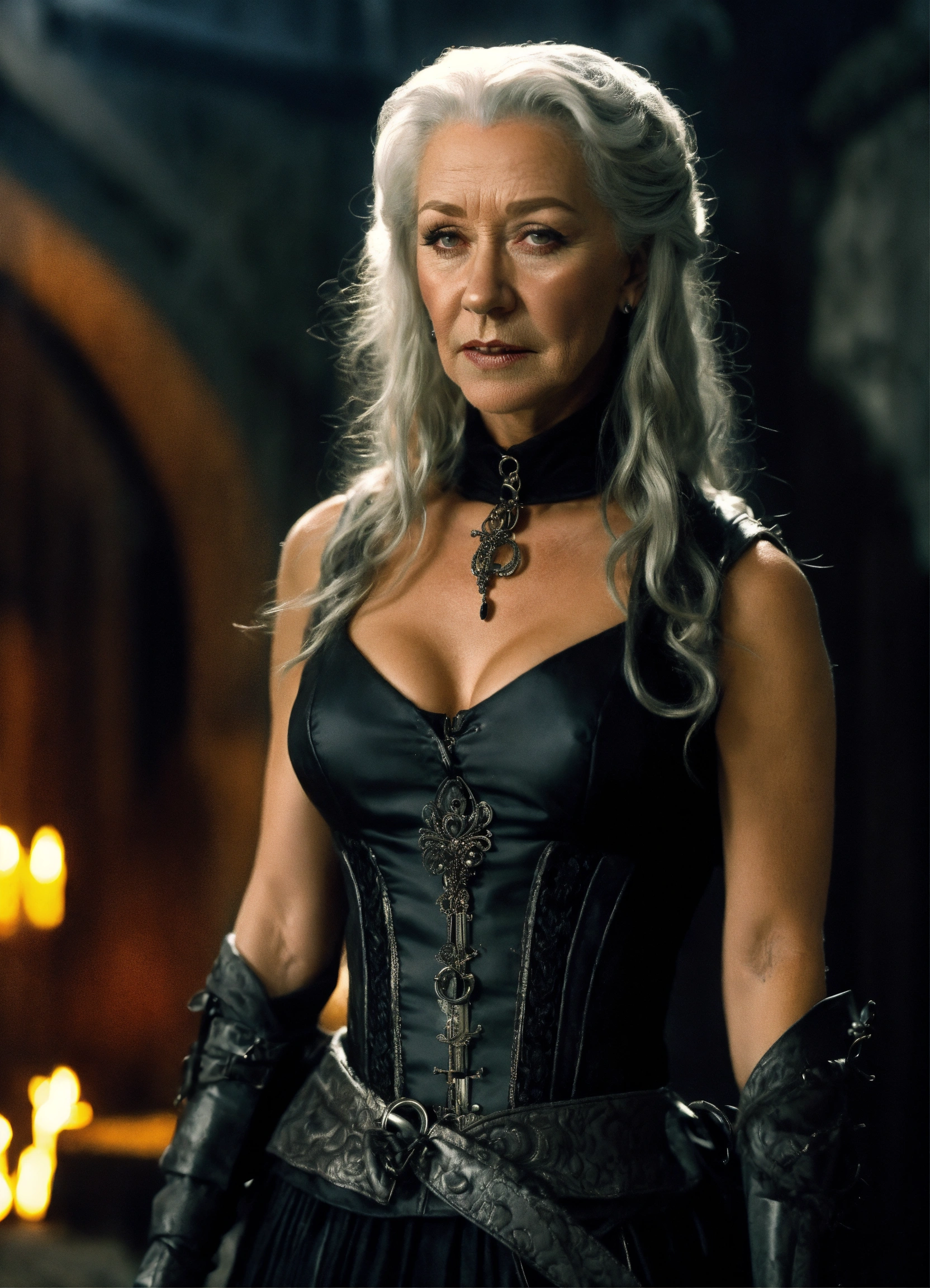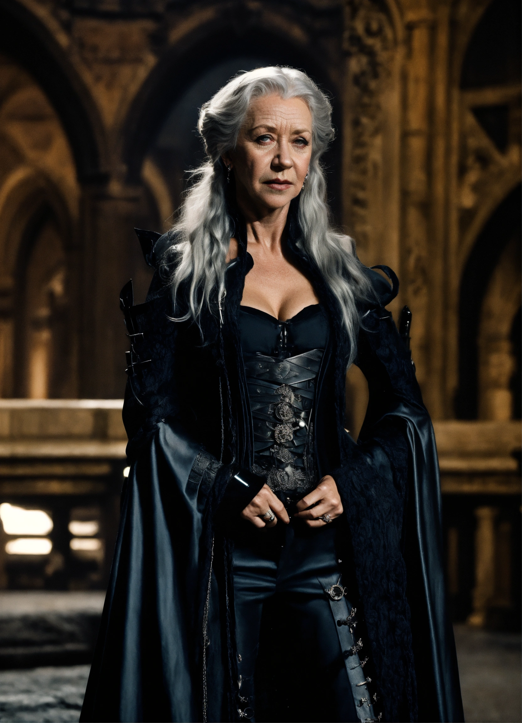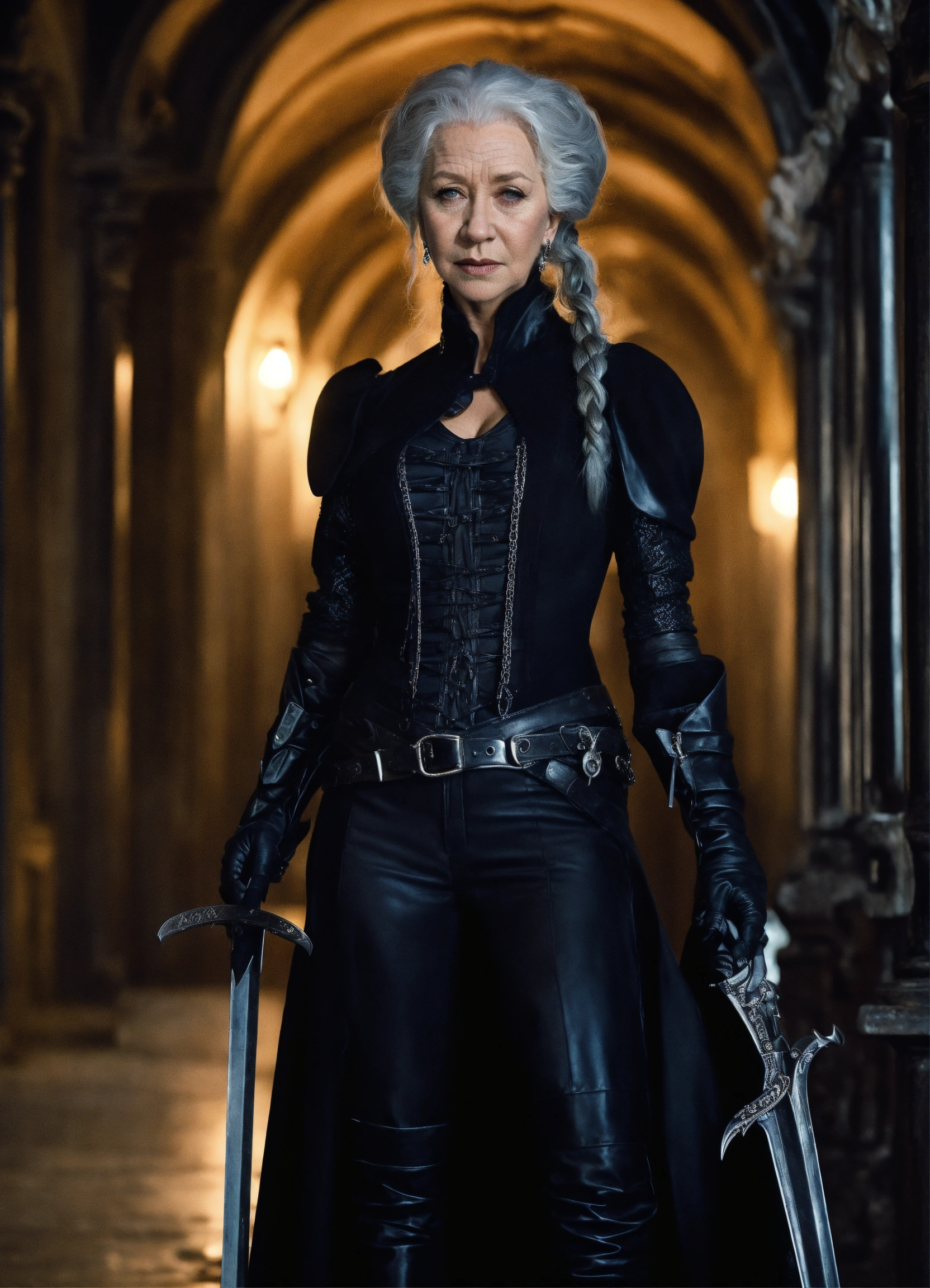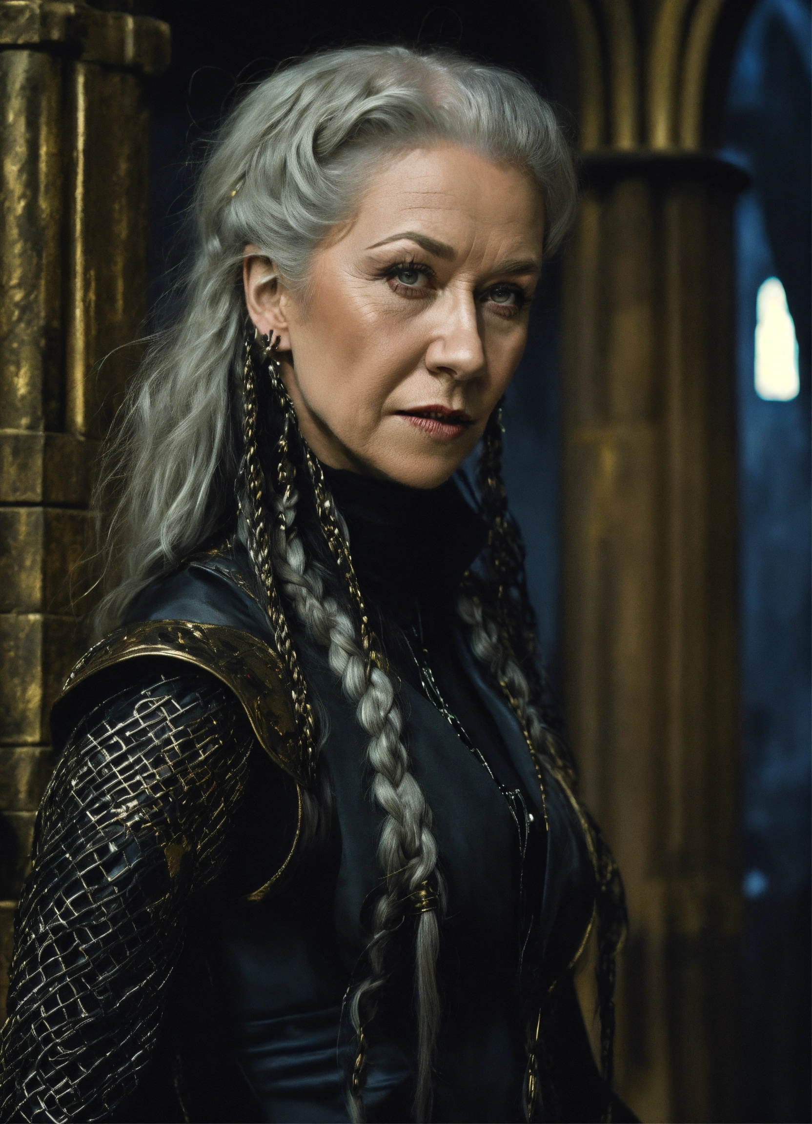 Futuristic vampire hunter, experienced female with black, silvery braided locks, gothic fortress, helen mirren, michelangelo, rosetti