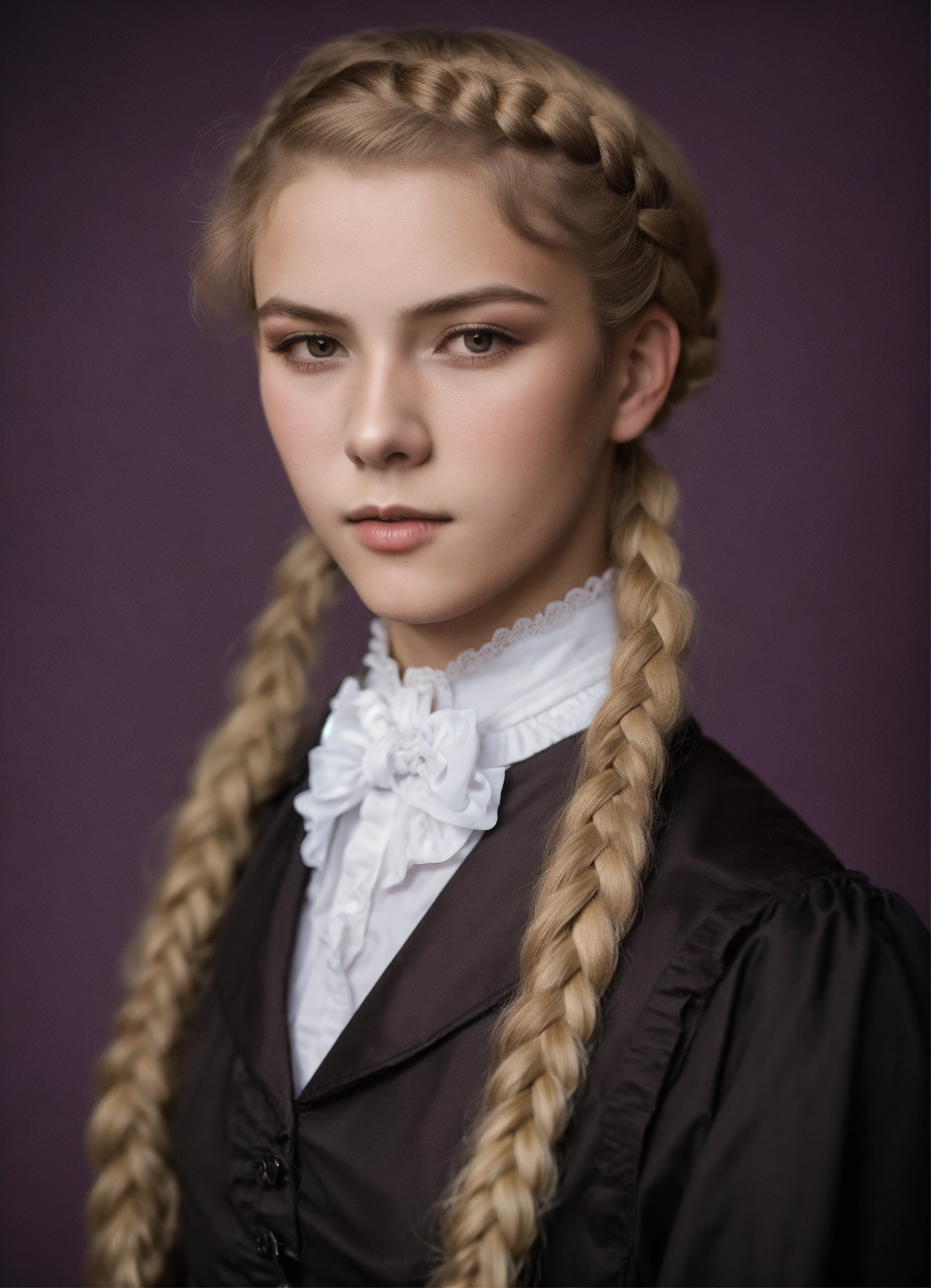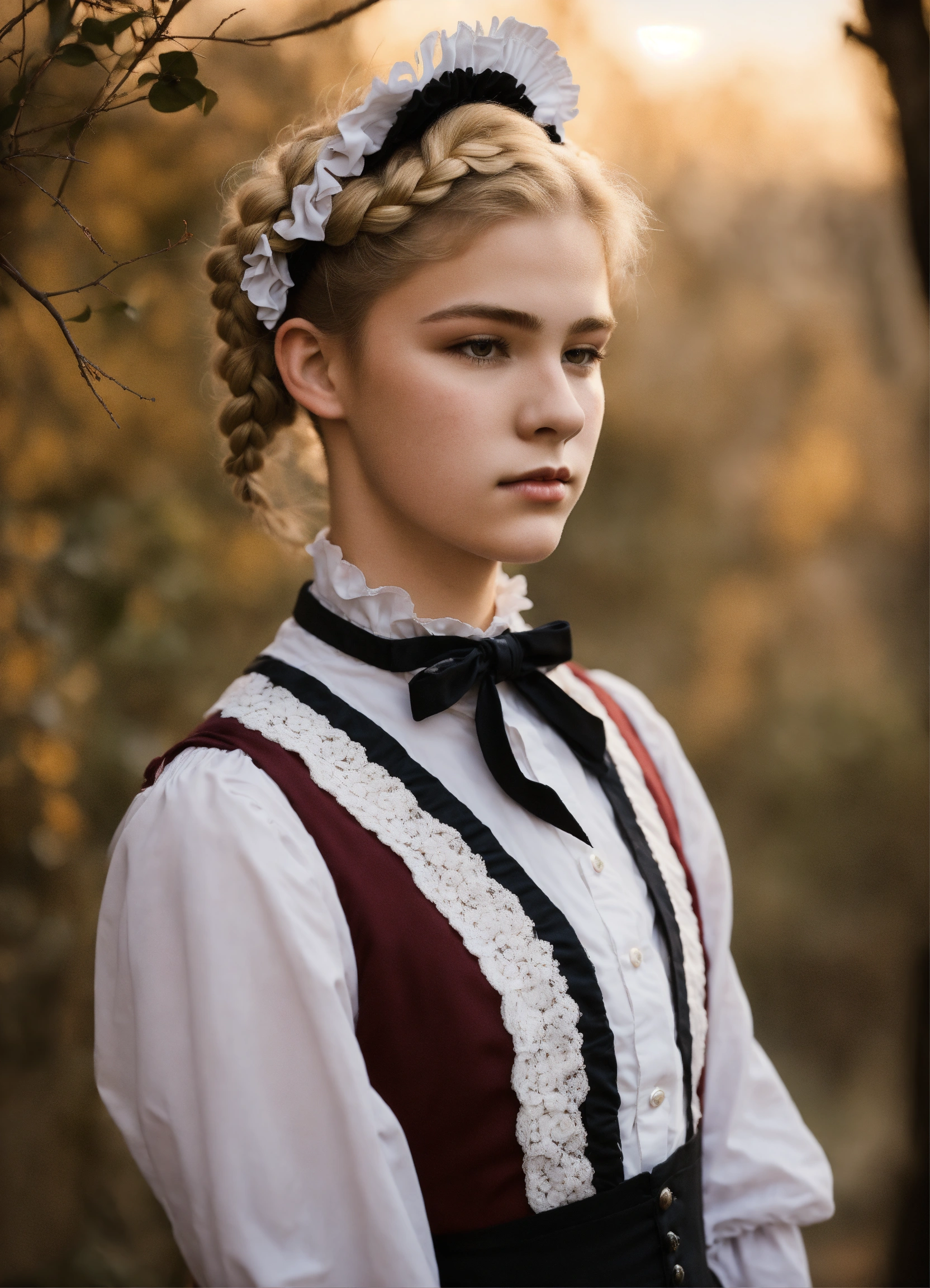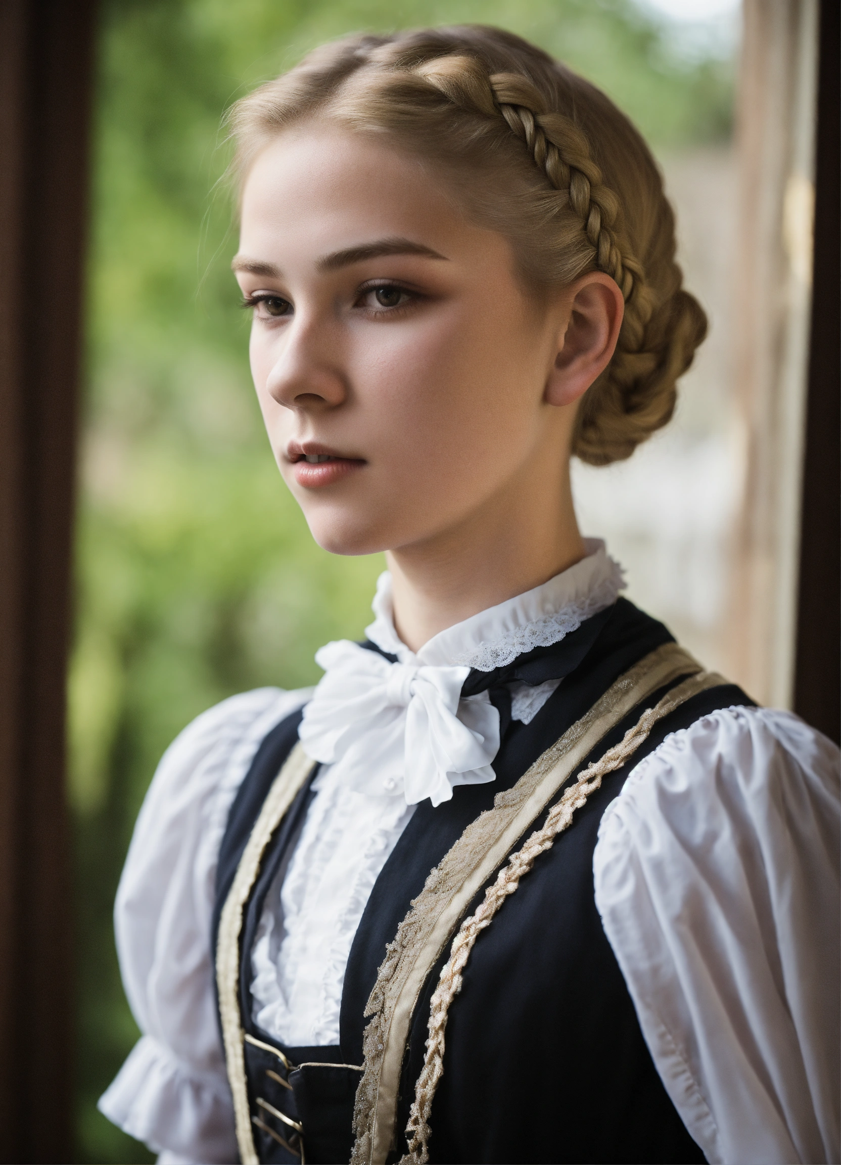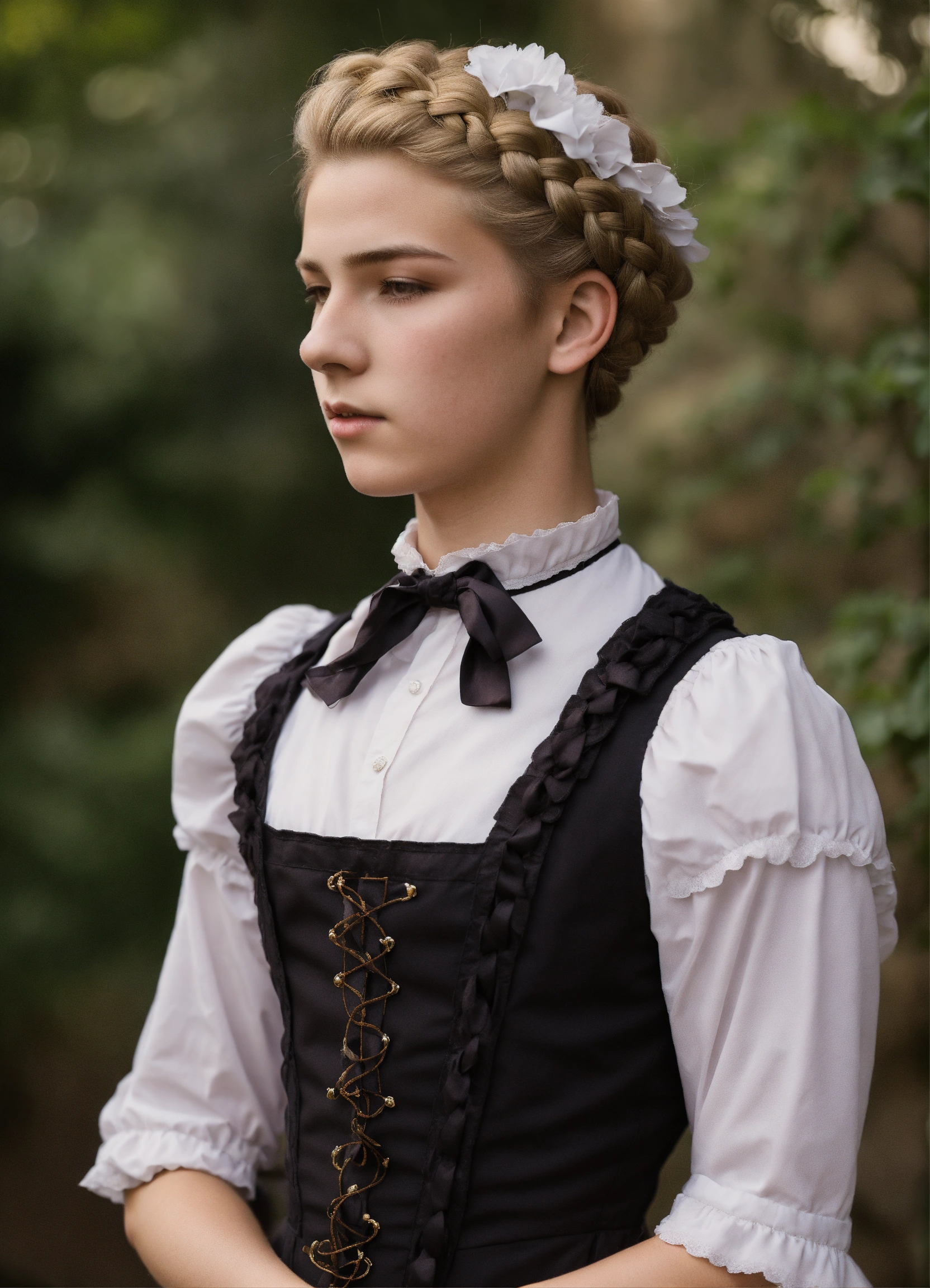 A slender genderqueer 15-year-old boy wearing a victorian maid outfit, feminine features, curvacious silhouette, graceful posture, makeup, braided blonde hair