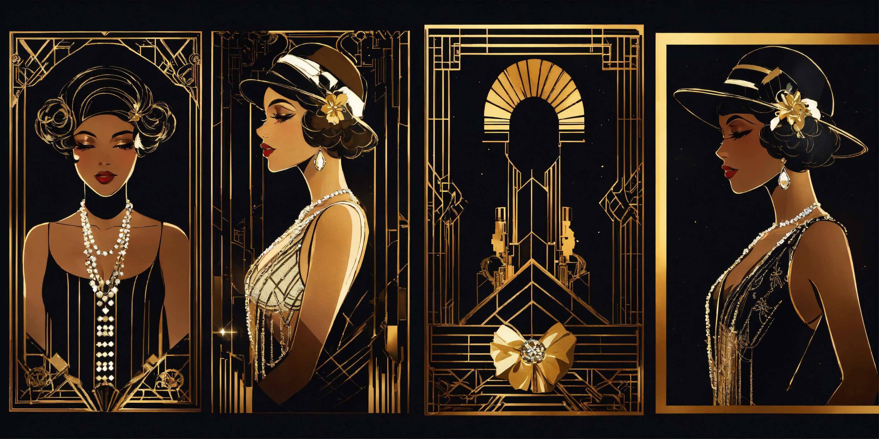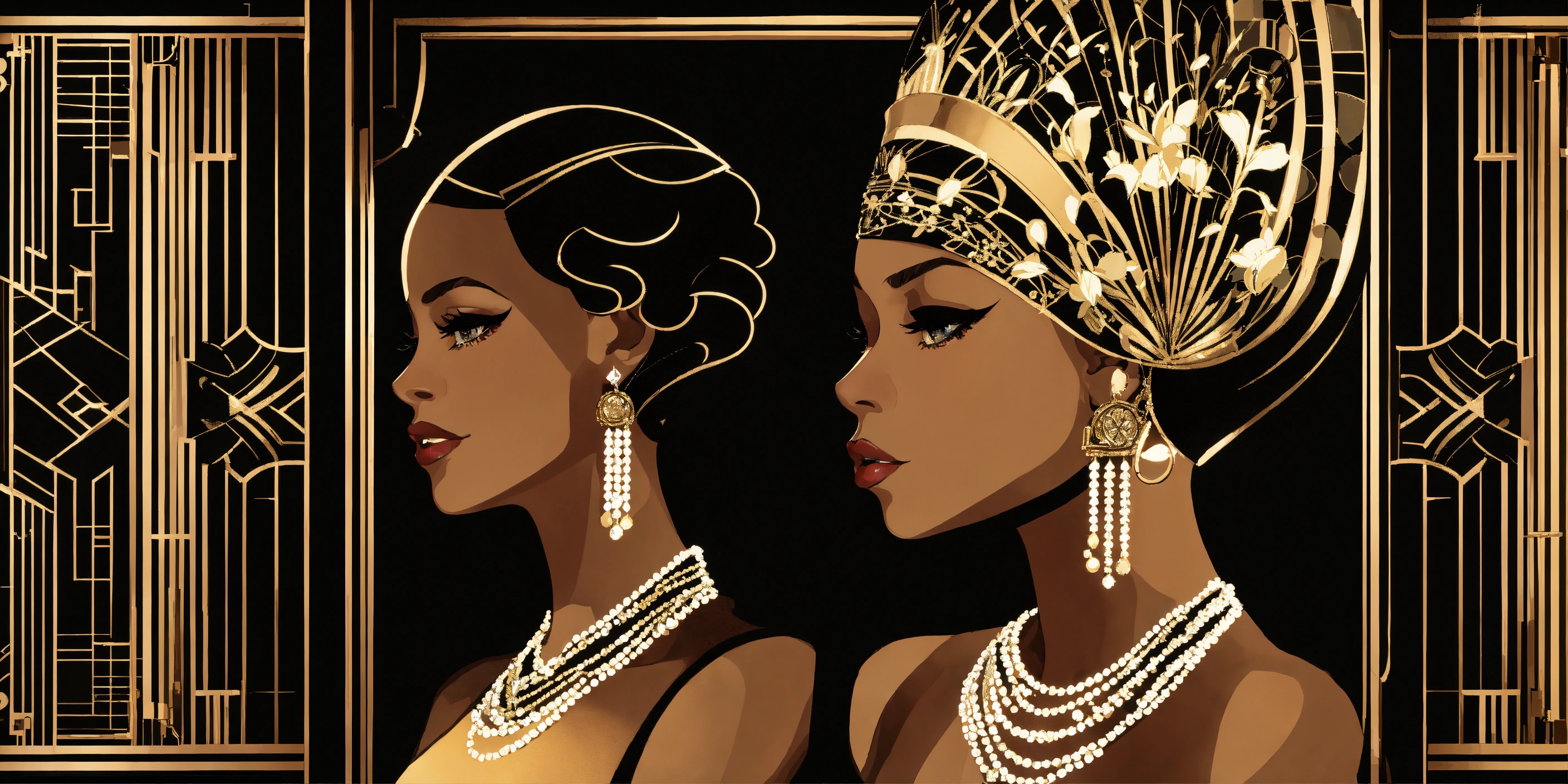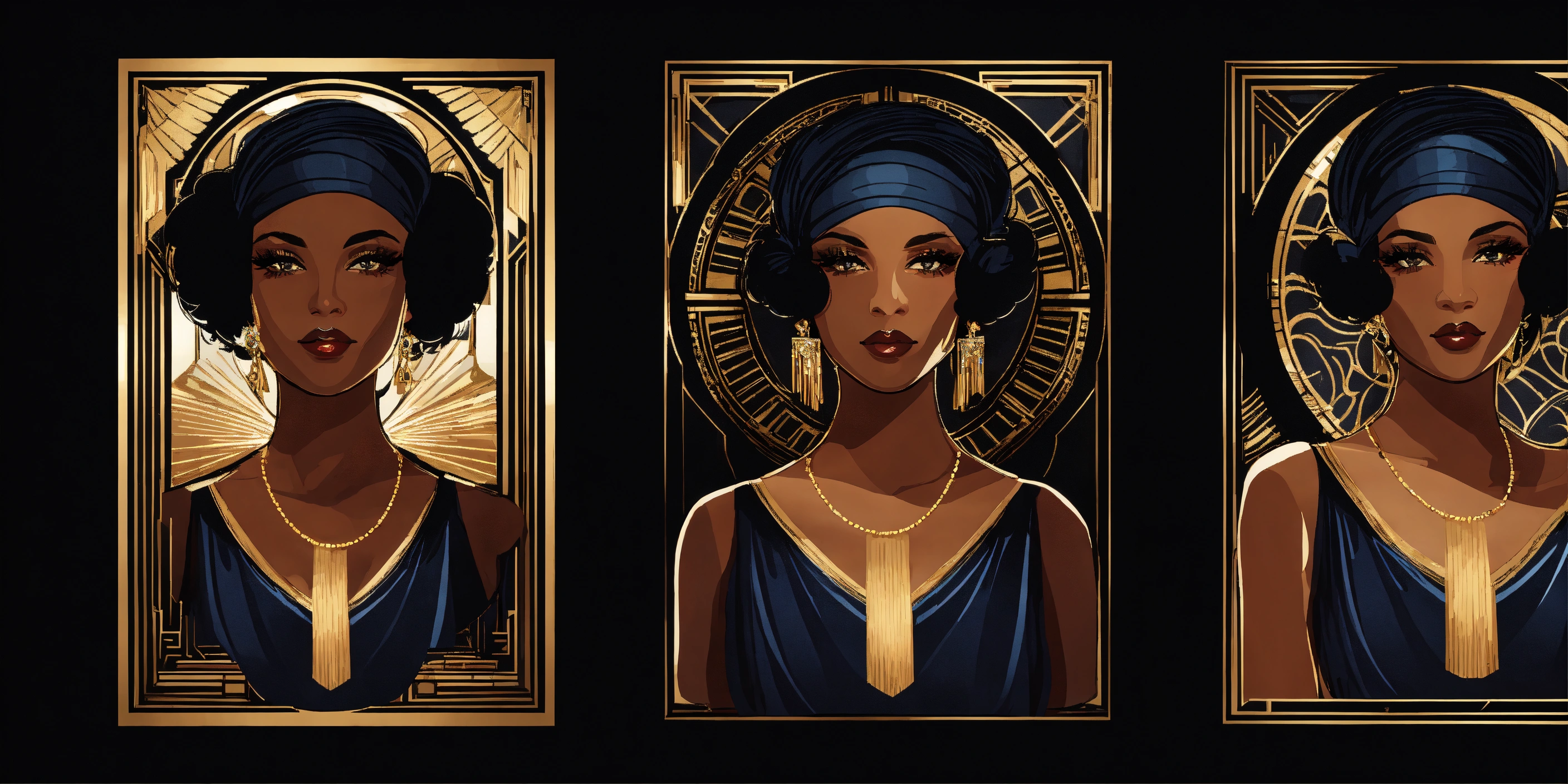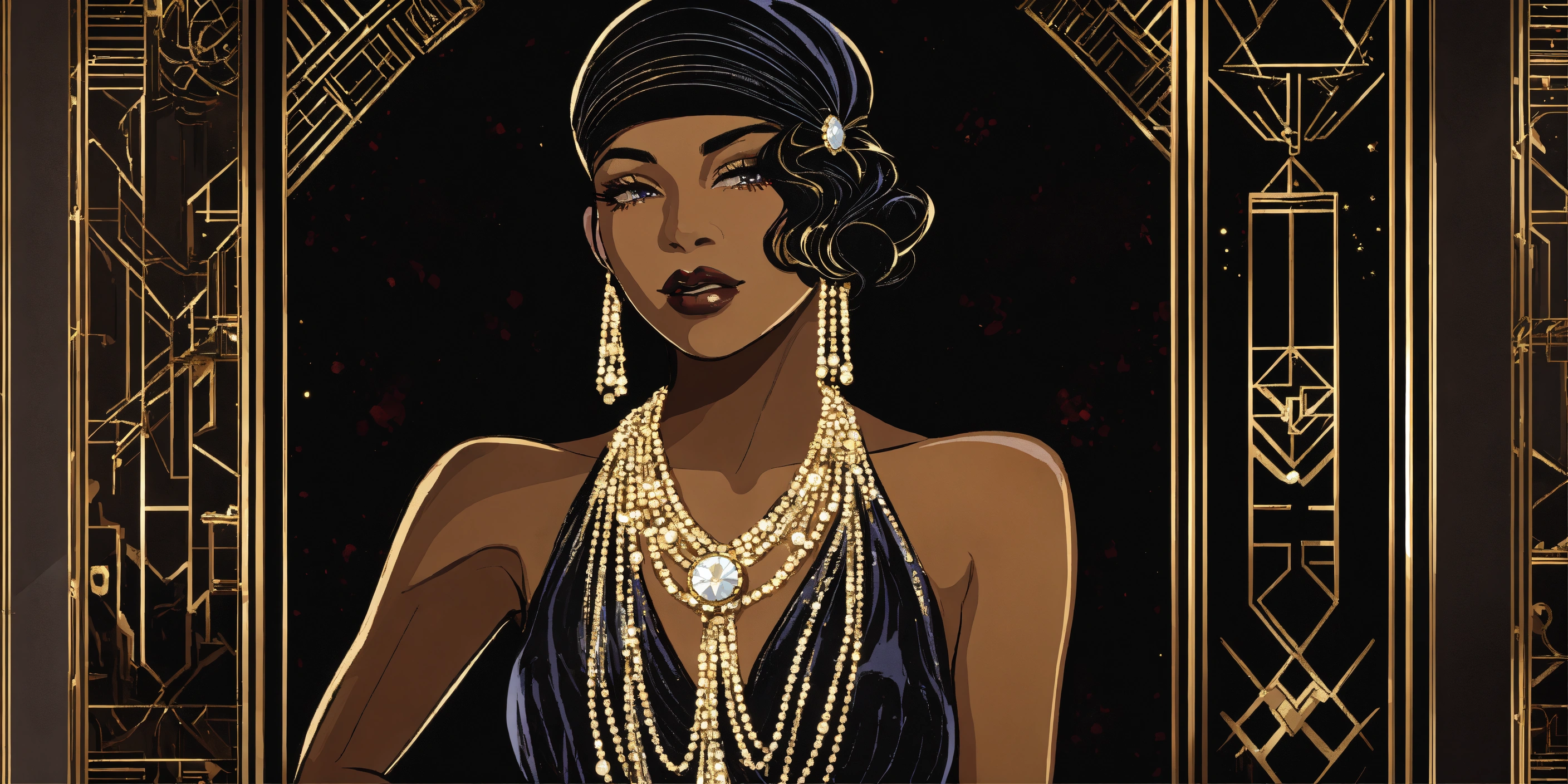 Art deco glamour black woman, vintage 1920s attire and accessories, luxurious and opulent, gatsby-inspired lighting — t-shirt design graphic, vector, contour, black background.