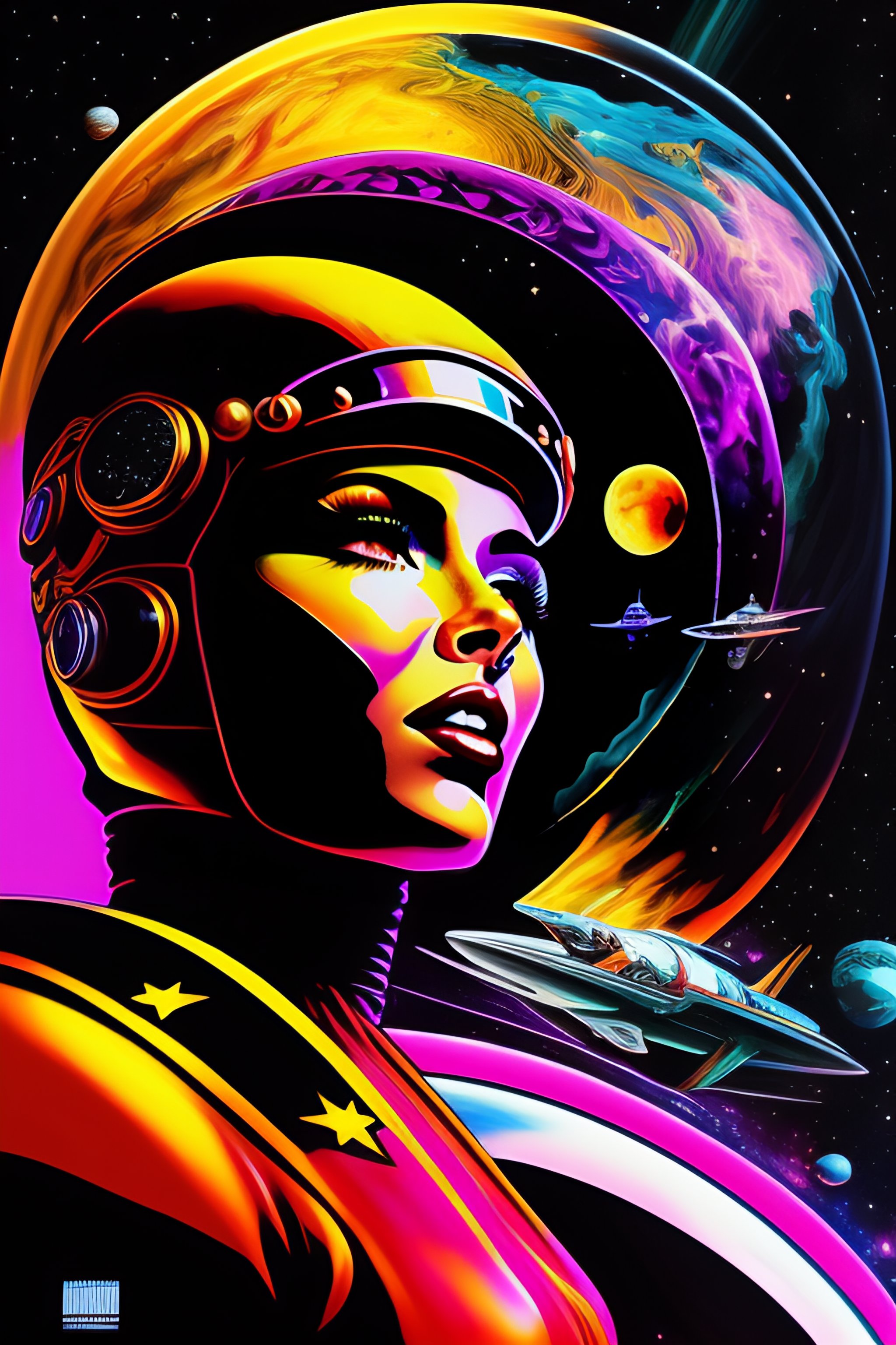 Retro space captain comic art, comic book cover art, photorealistic ink art, techno sci fi, maximalist surrealism