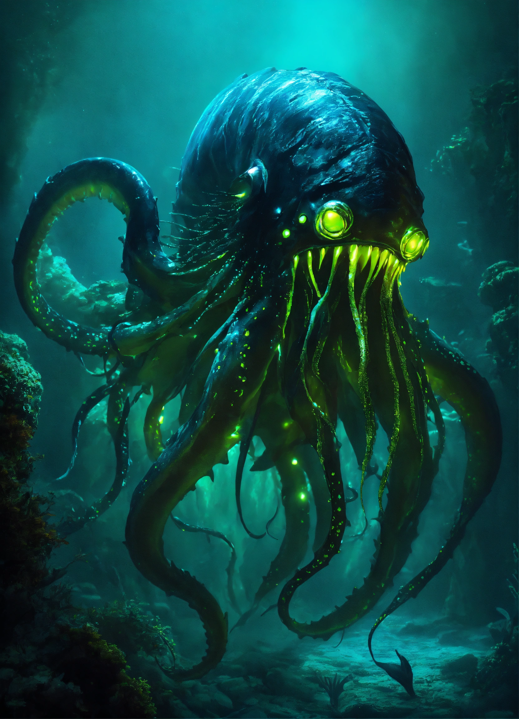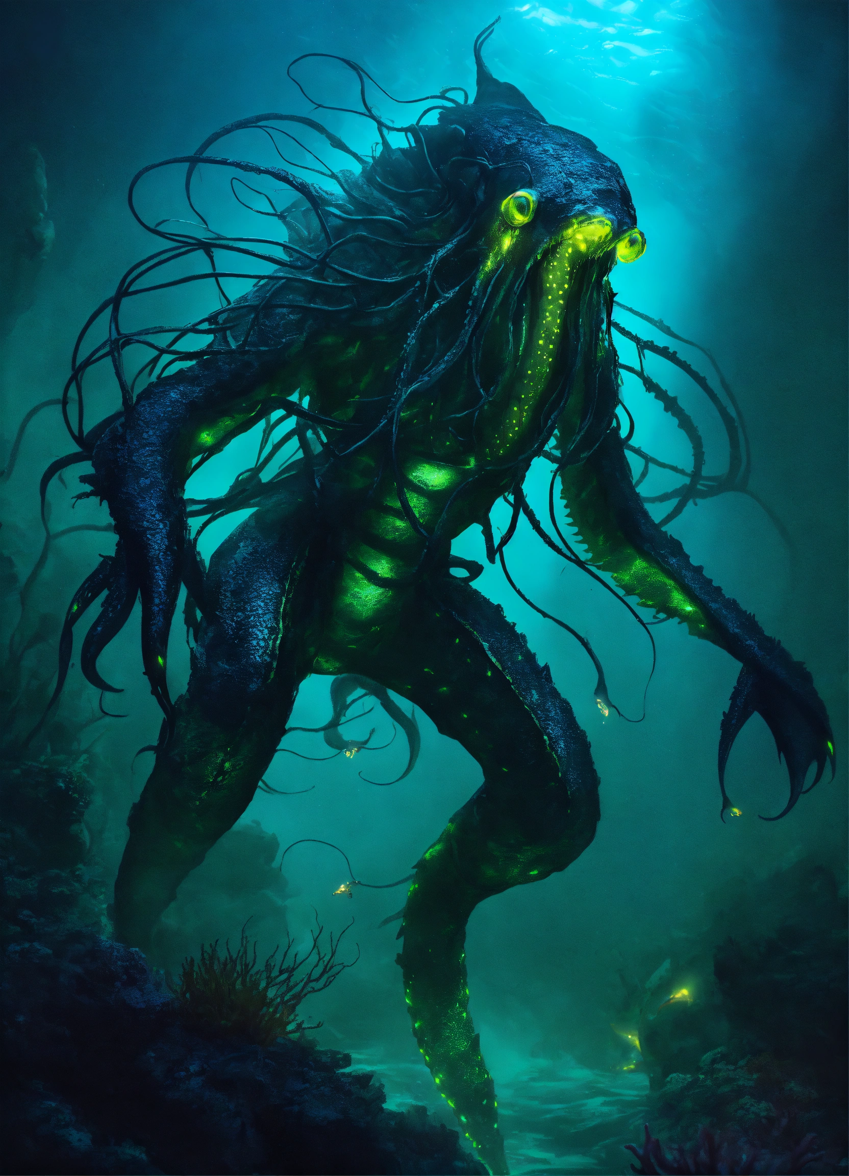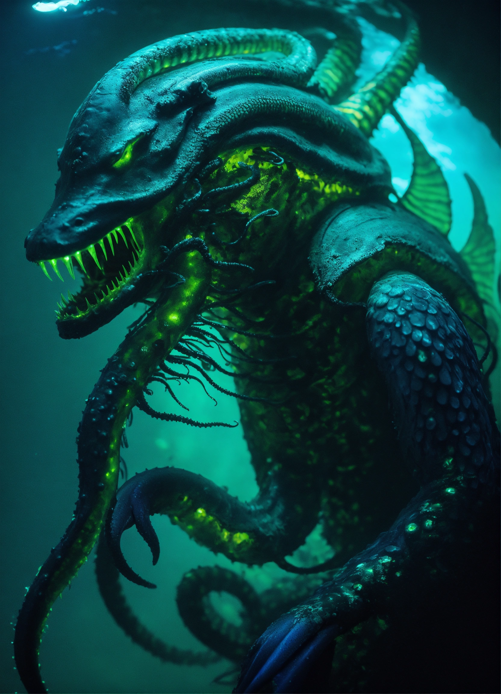 The abyssal dreadfiend is a massive, aquatic creature with dark, scaly skin resembling the depths of the ocean, the costume consists of a form-fitting, scaled bodysuit in dark, watery shades of deep blues, blacks, and greens, resembling the creature's aquatic environment, it has long, serpentine tentacles, each ending in sharp, bioluminescent claws, long, serpentine tentacle appendages extending from the back, shoulders, and arms, these tentacles are created from dark, flowing fabric with iridescent accents to mimic the bioluminescent quality of deep-sea creatures. the mask is reminiscent of a combination of anglerfish and deep-sea monster characteristics, replicate the eerie glow of deep-sea creatures, the costume incorporates bioluminescent elements that emit an otherworldly radiance, using its bioluminescence to lure prey, the abyssal dreadfiend lurks in the darkest, deepest parts of the ocean. --ar 73 --v5.1 --seed 777 --chaos