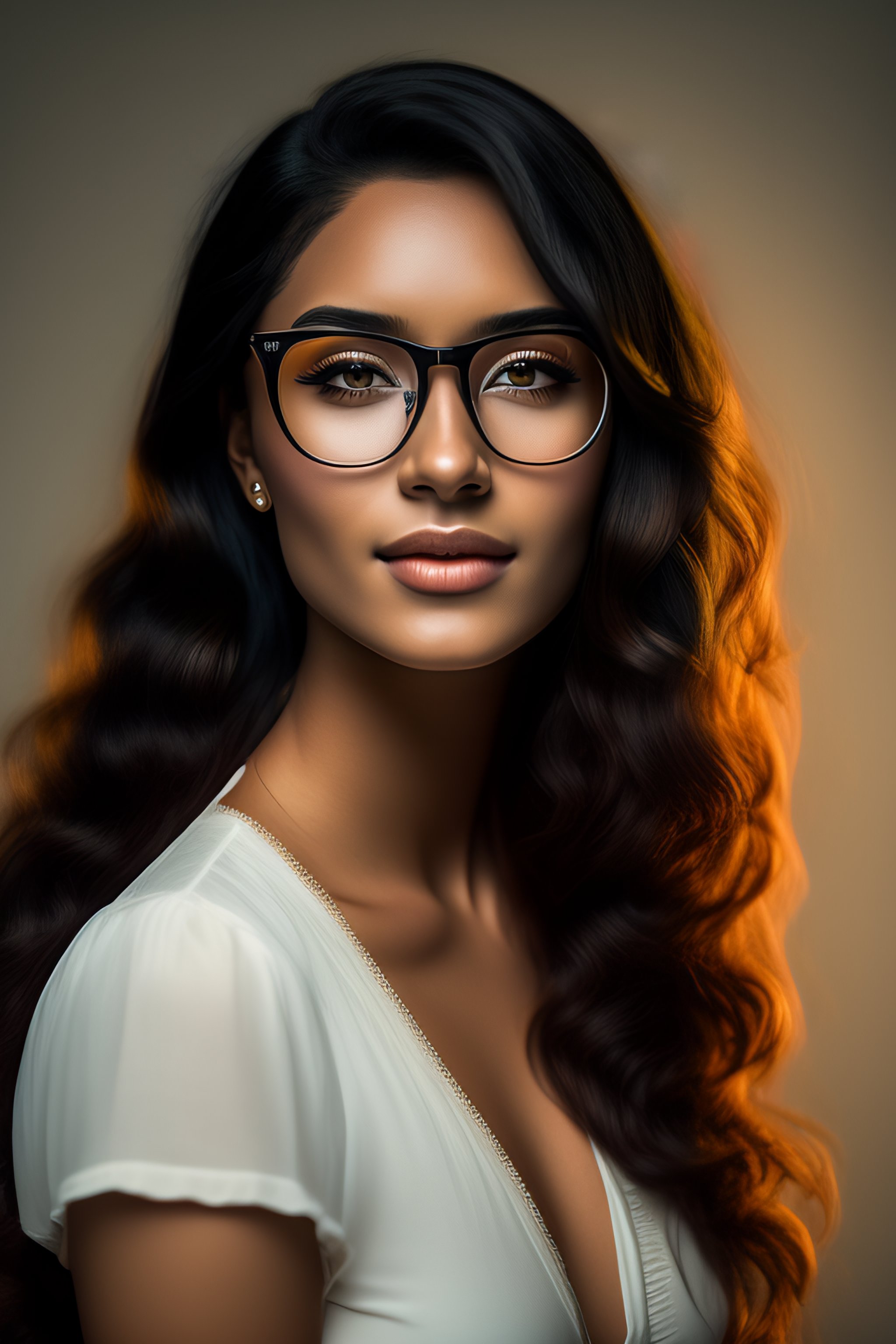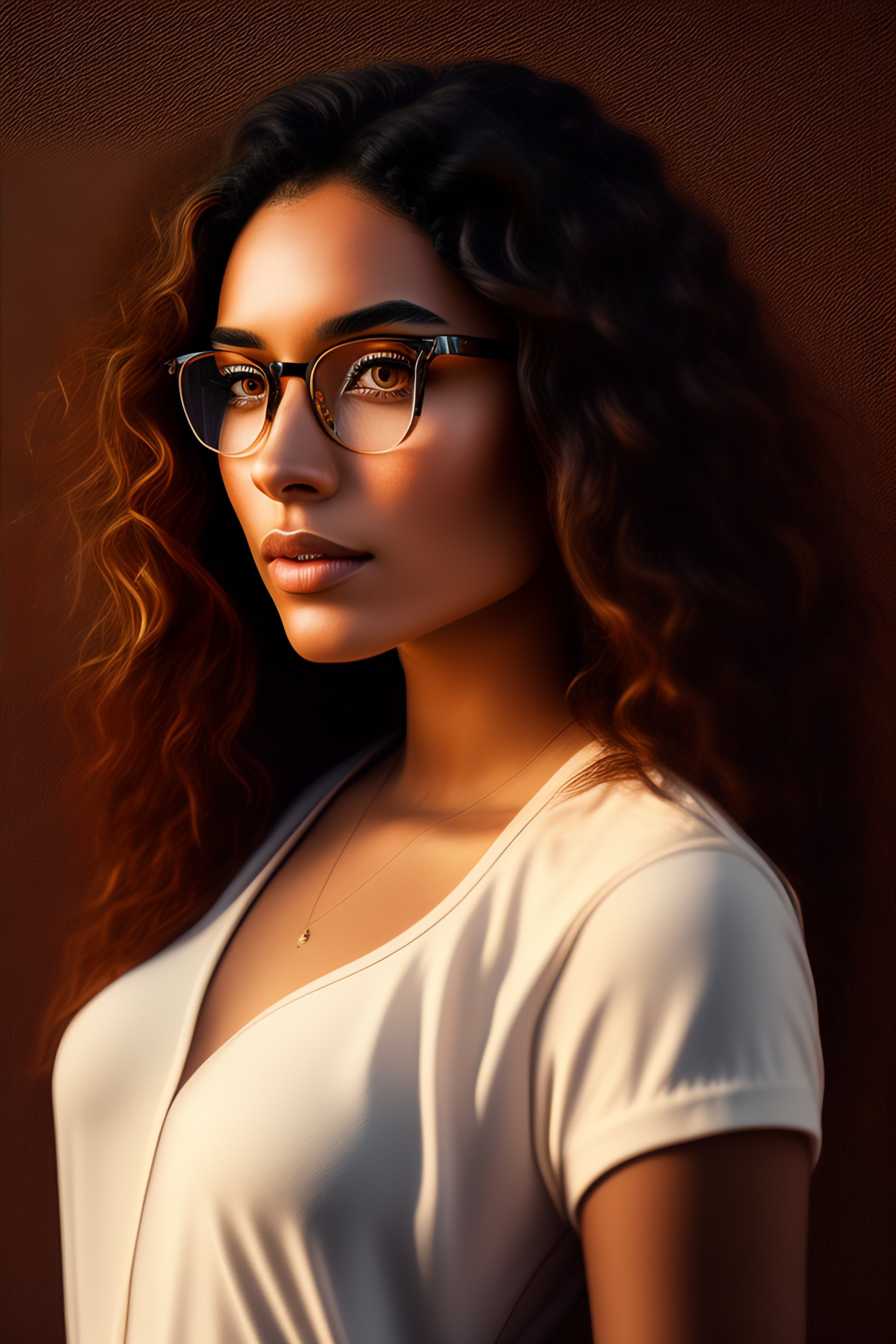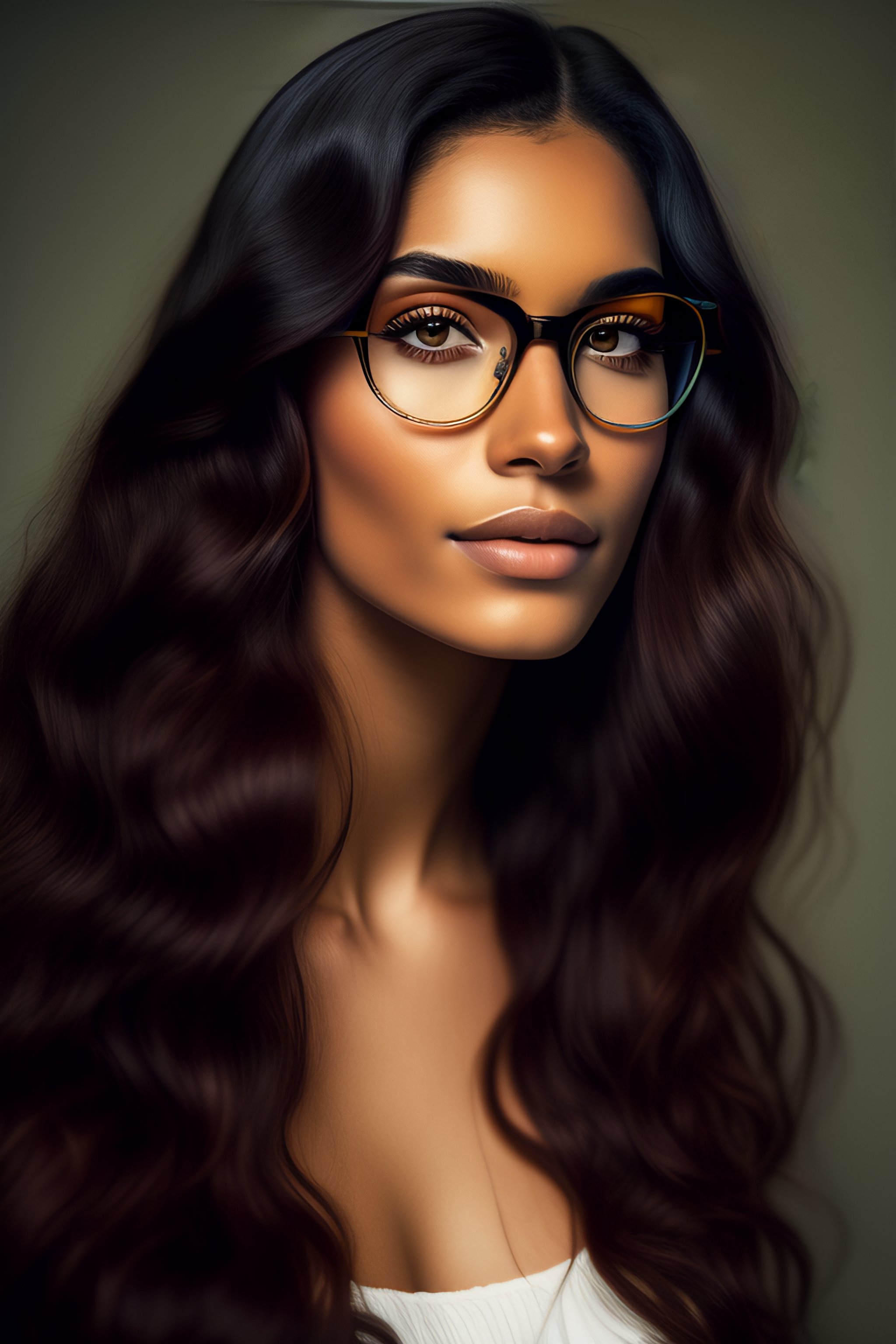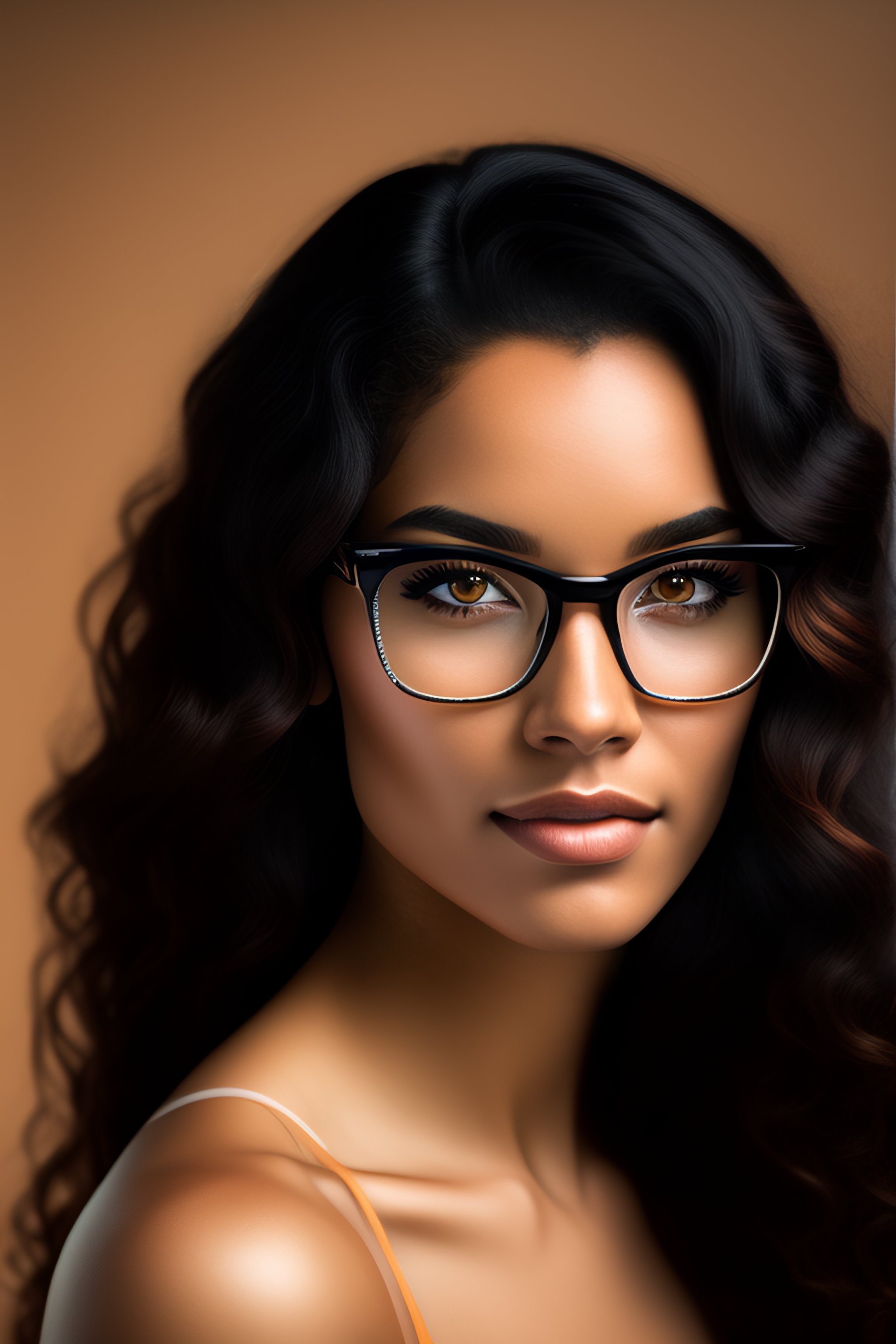 Portrait of a 22 year old young woman with long curly hair and black eyes, brown skin and black hair, glasses