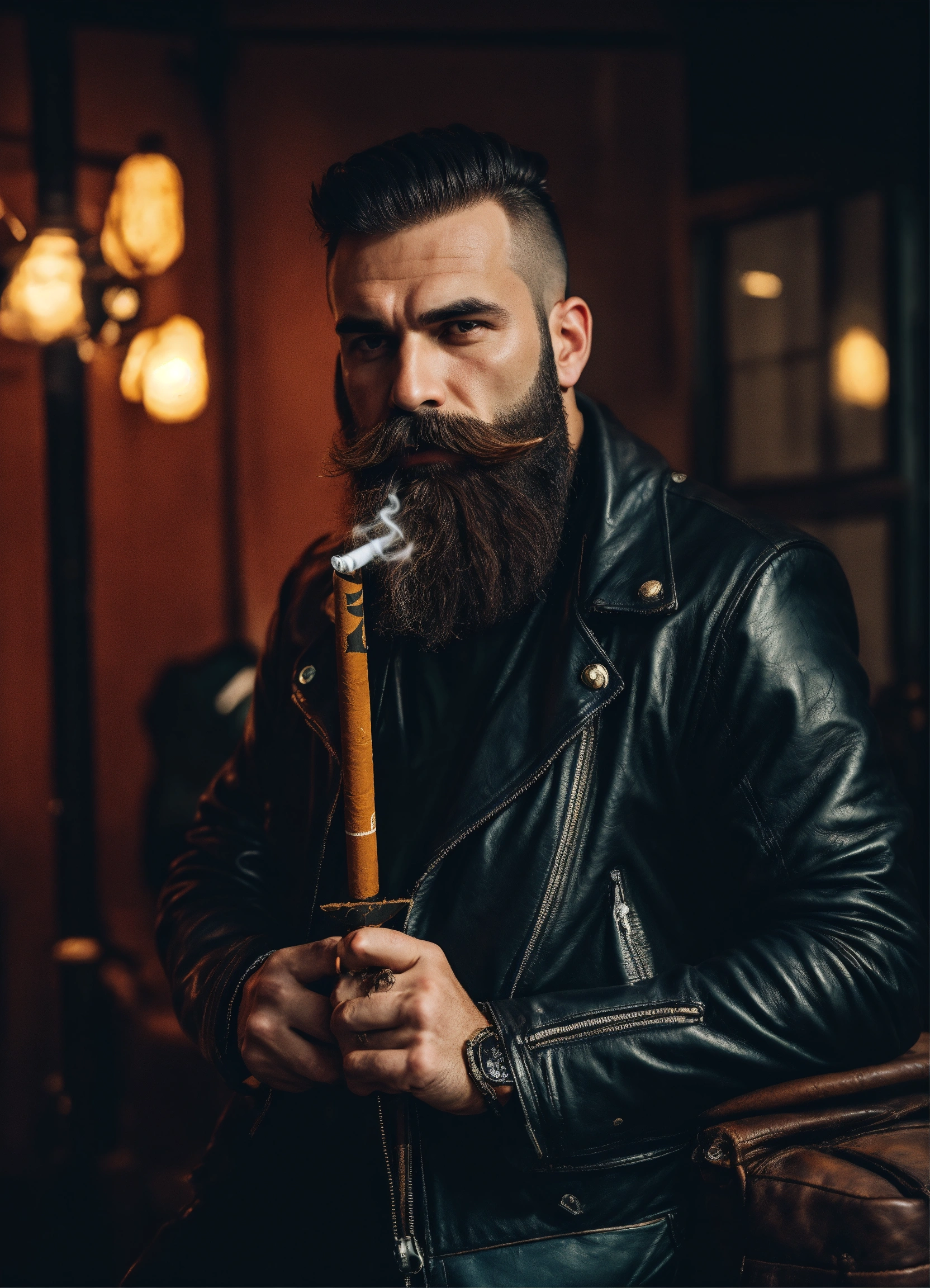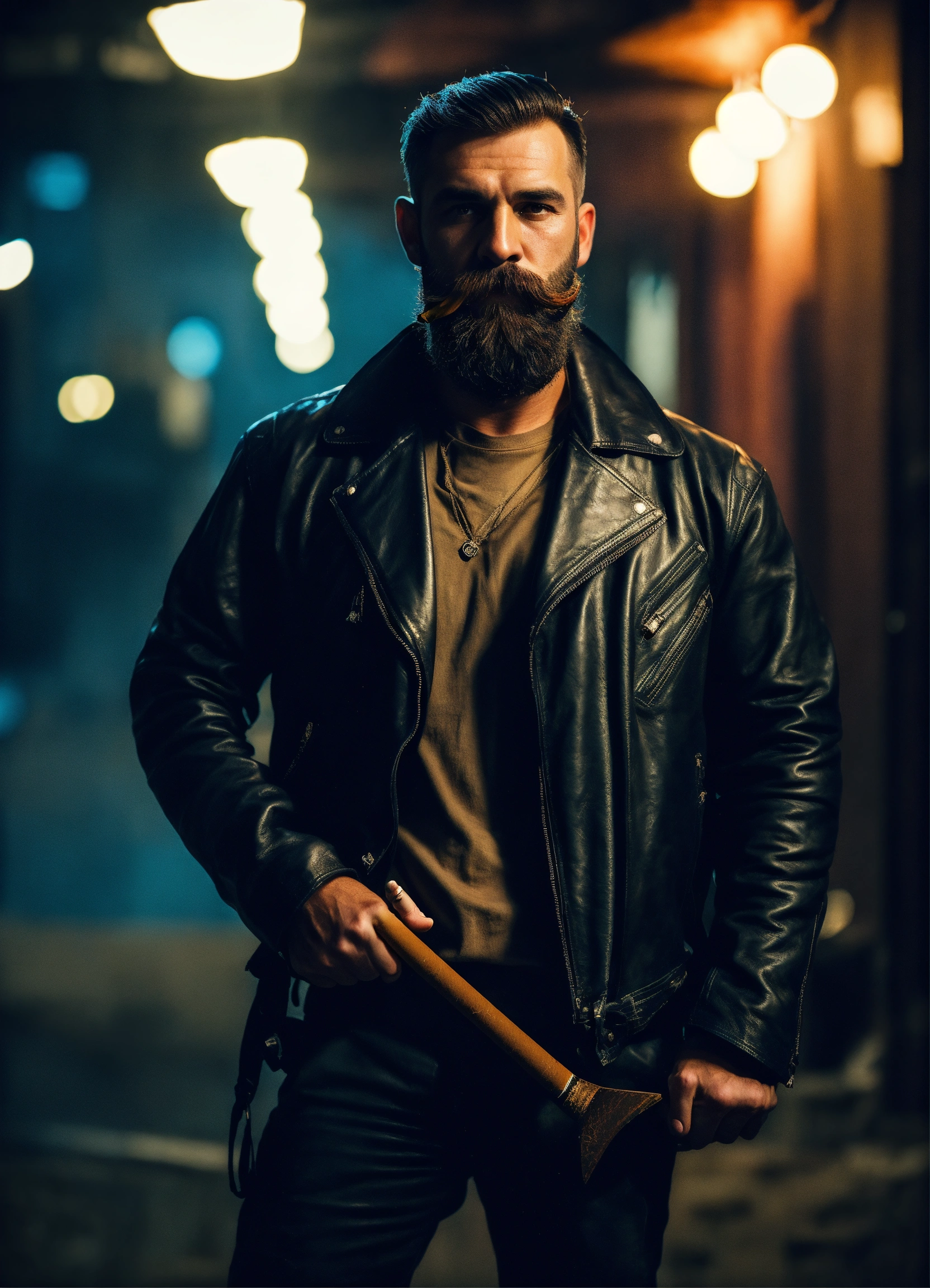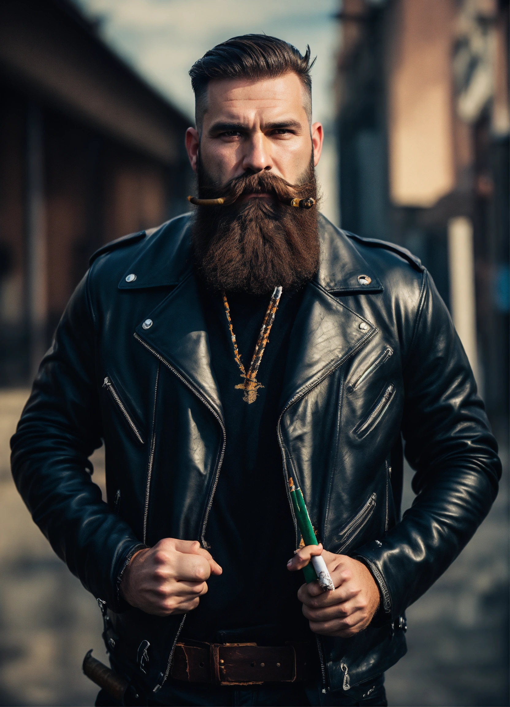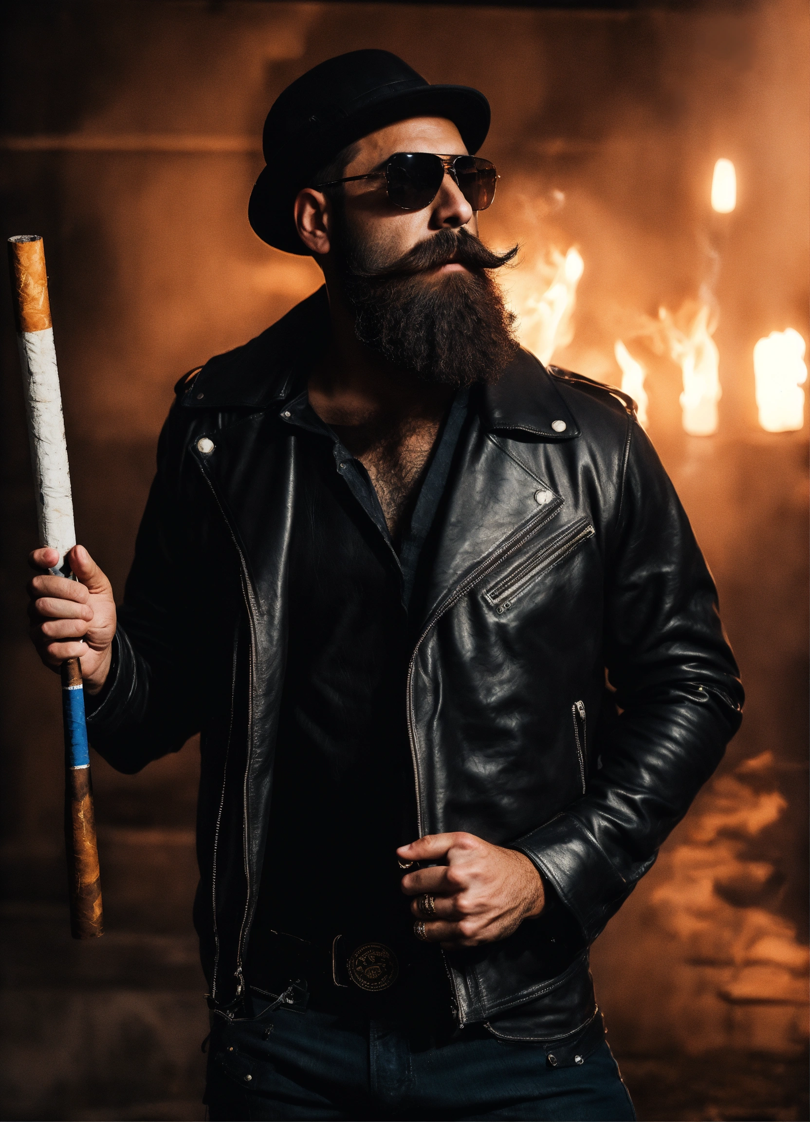 Brutal man in the leather jacket beard mustache with cigarette holding a bat