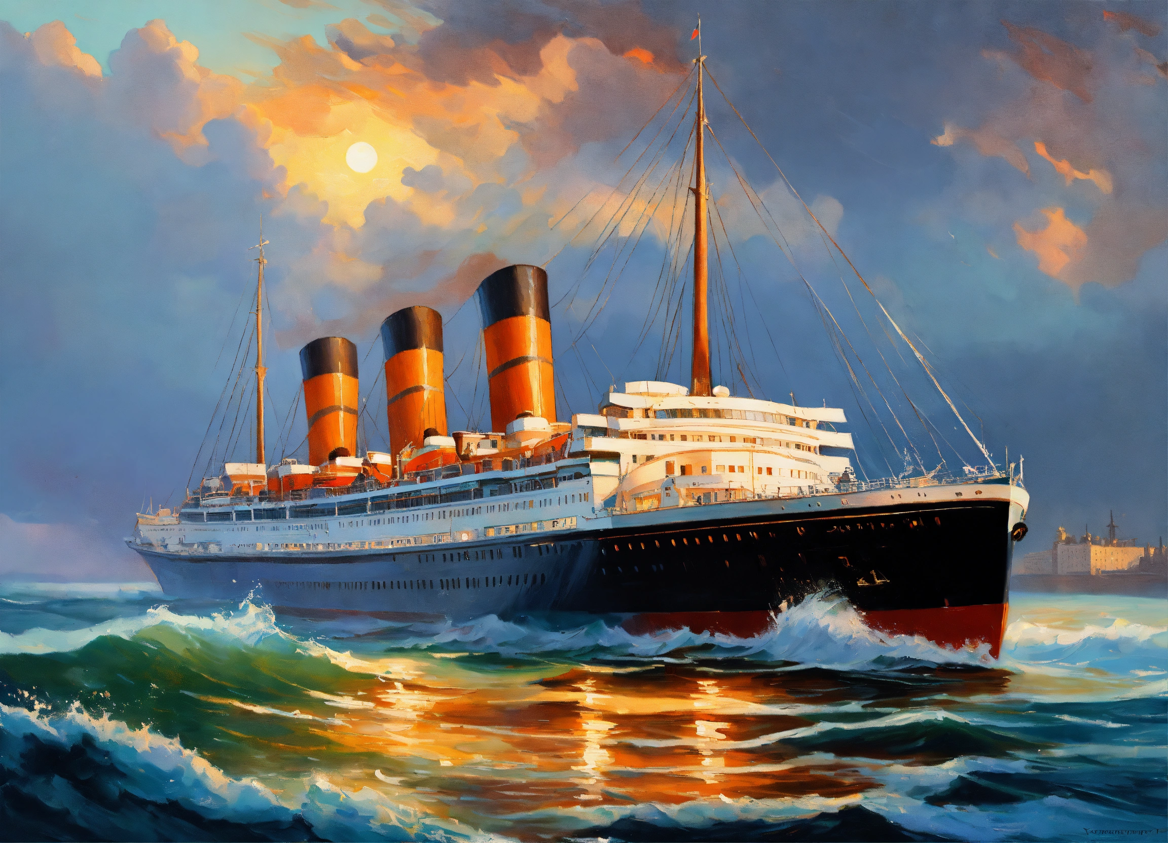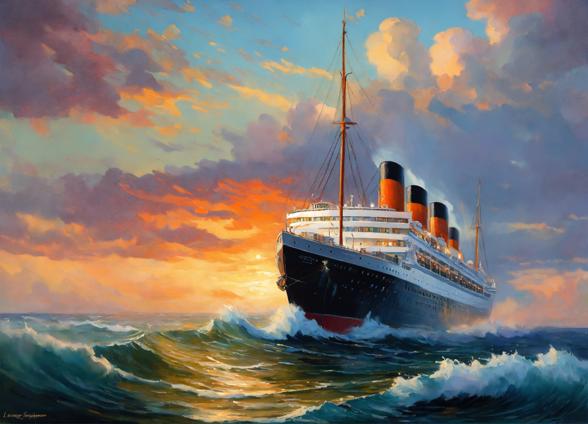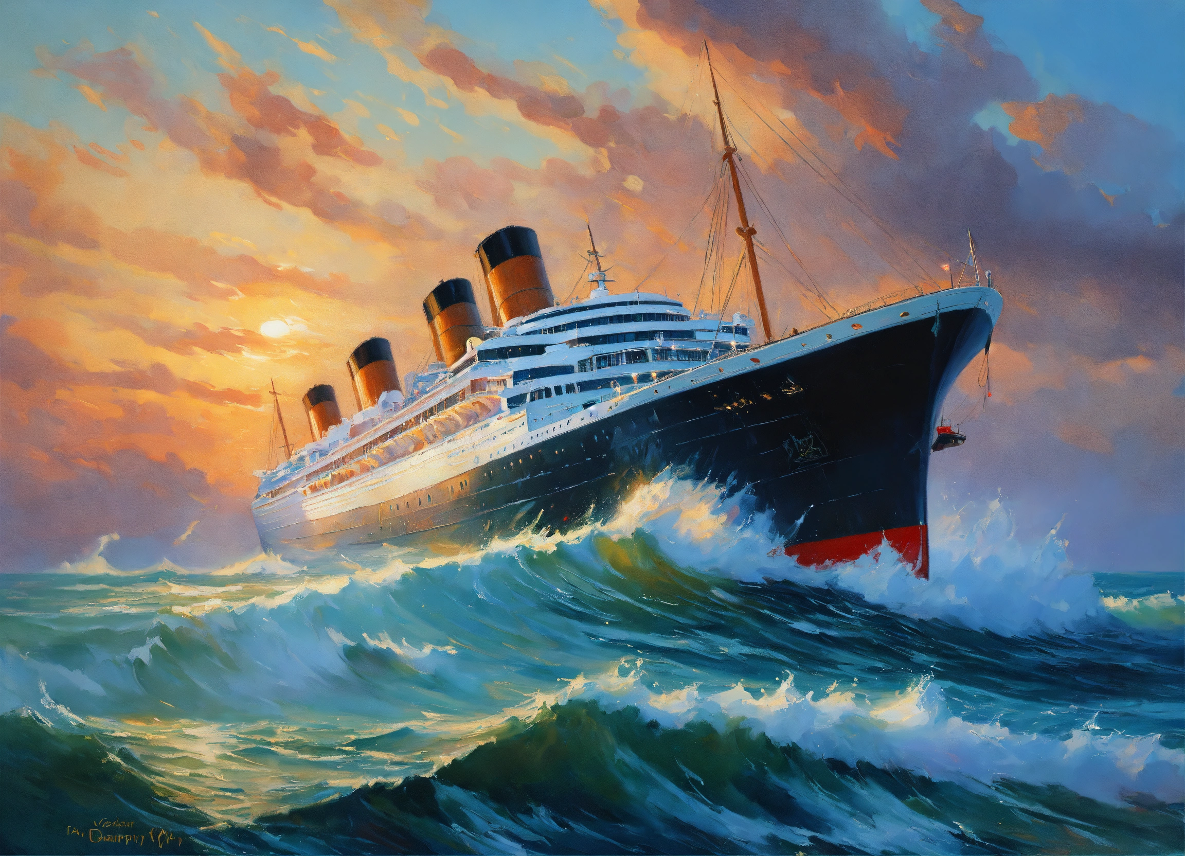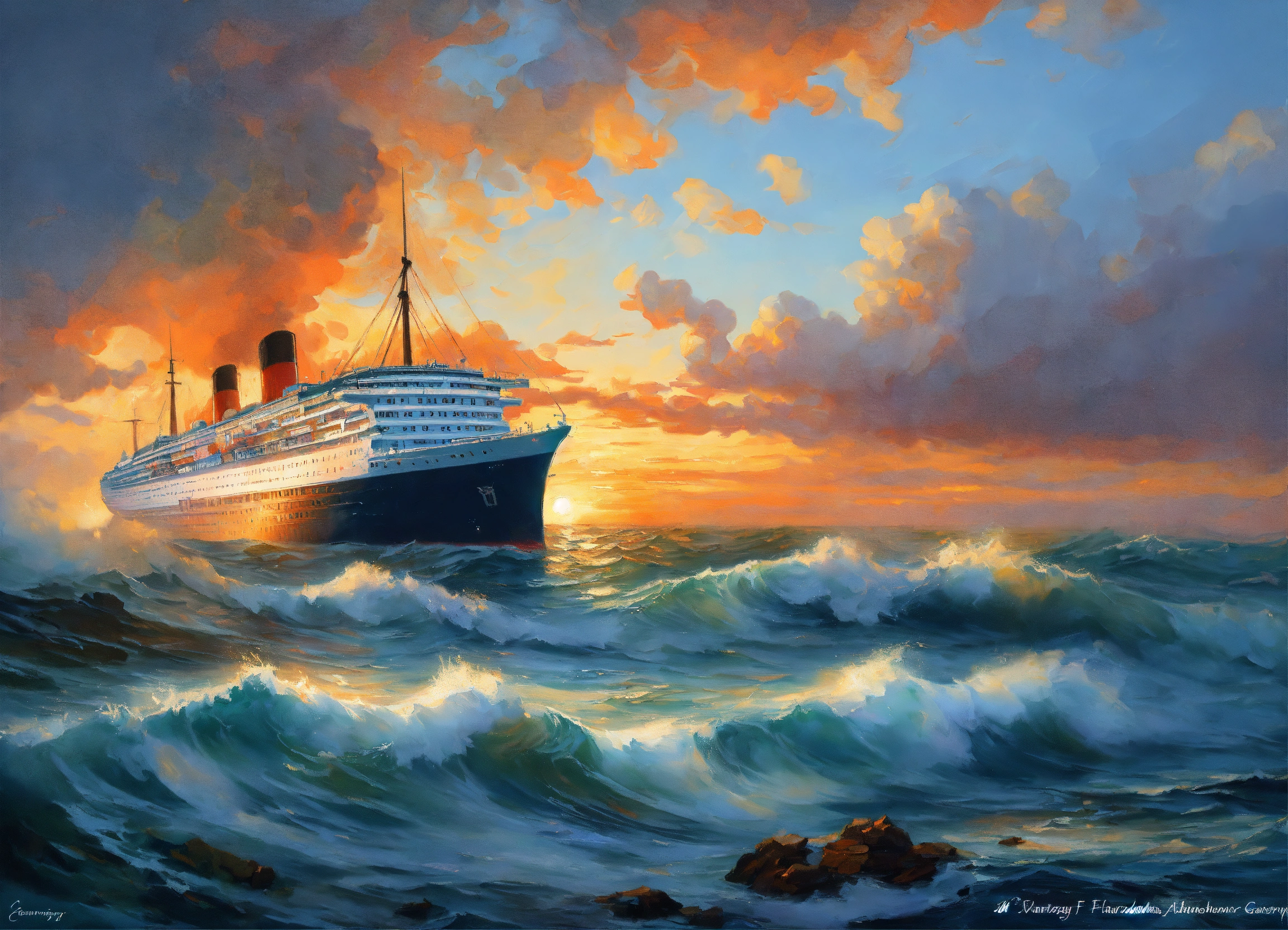 Create a painting of a ocean liner on the high seas, high waves, painting by evgeny lushpin and daniel f gerhartz and claude monet and leonid afremov
